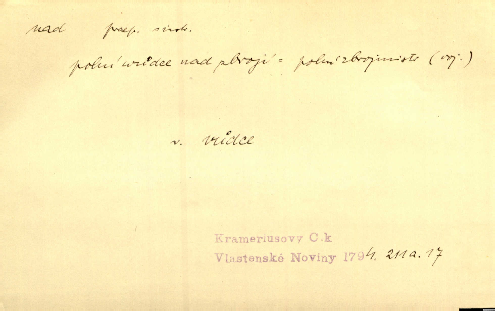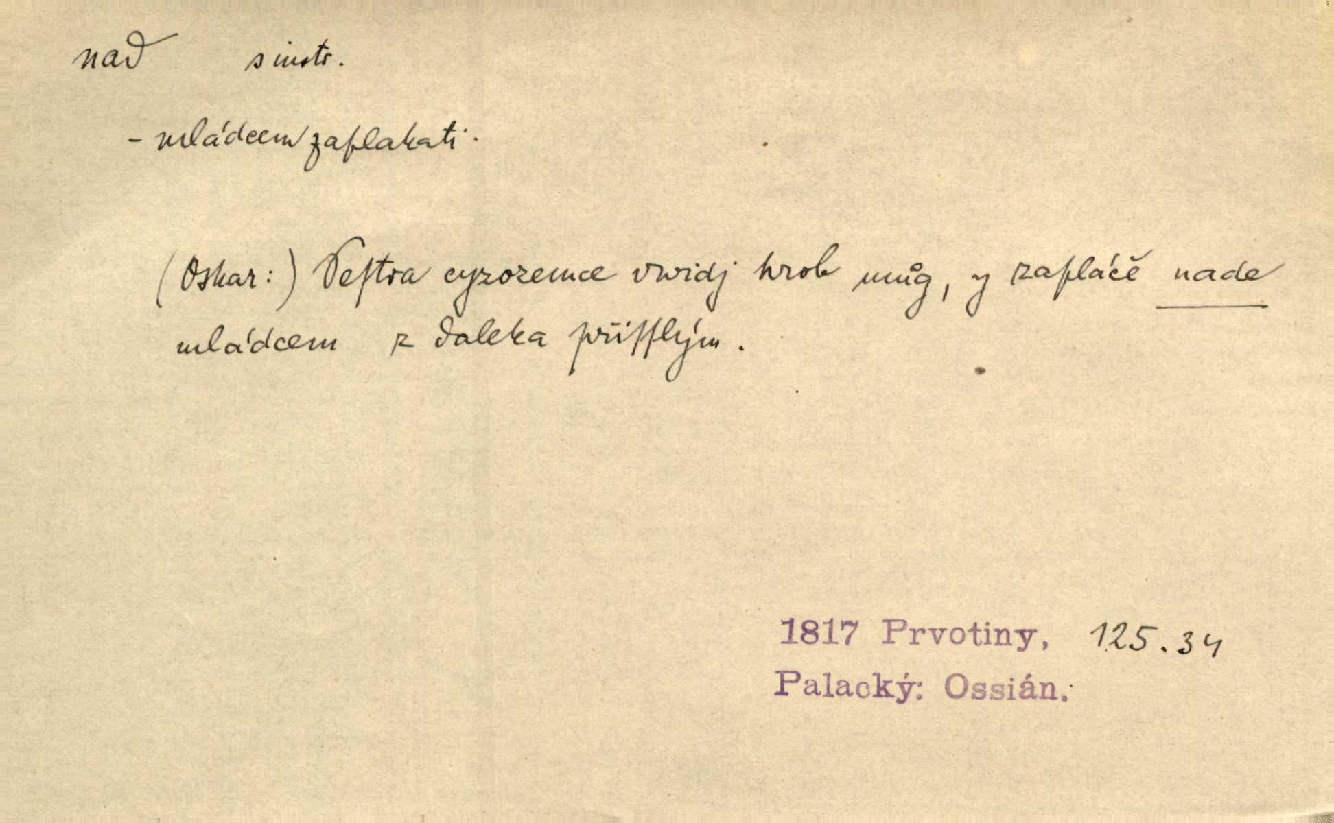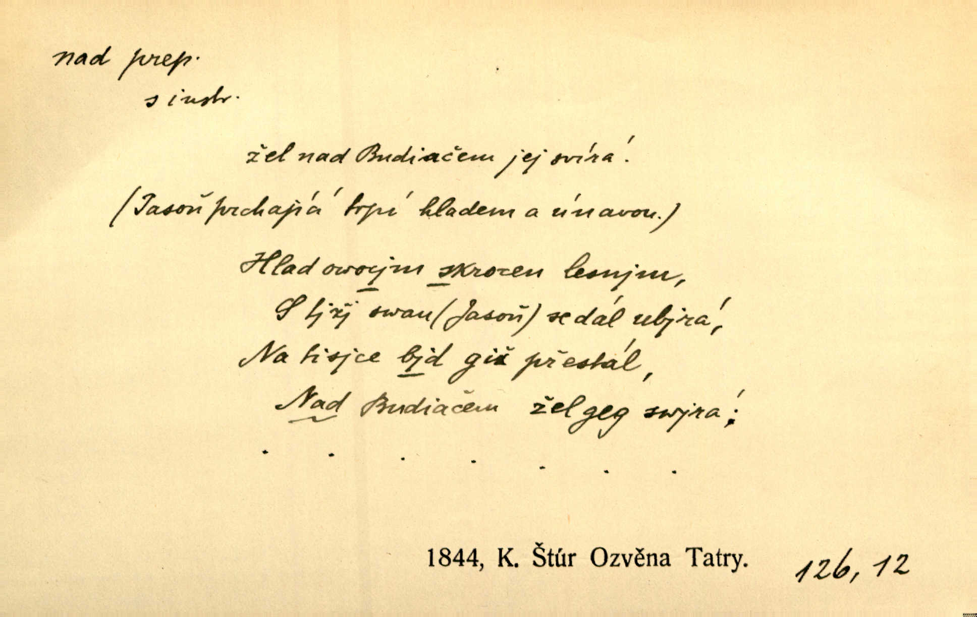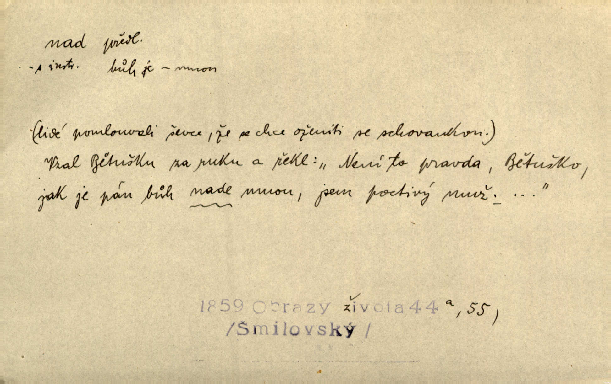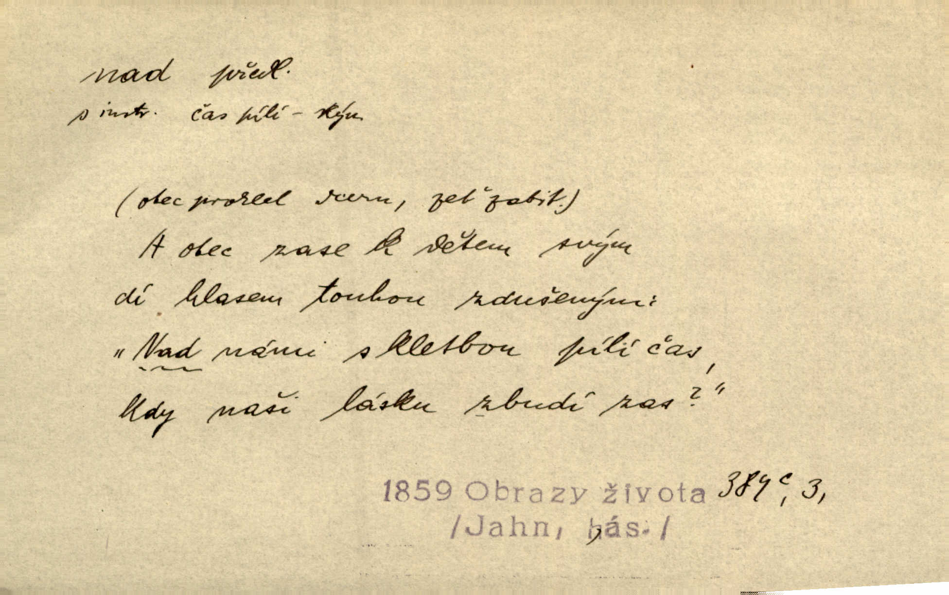 - nad předl. s akus. vyjadřuje místo položené výše než někdo n. něco, k němuž děj nějaký směřuje. Slunce vyšlo nad horu. Čel. Vynořila se nad houštinu hlava s mocnýma parohama. Jir. Jeho vysoká postava vyniká nad všechny ostatní. Něm. Nahnula se nad jeho obličej. Něm. Rybičky vyskakovaly nad vodu. Prav. Nad dědinu snášel se vlažný večer. Herb. Pod kolenama až nad lejtka leskly se mu bílé punčochy. Tyl. Venku je bláta nad kotníky! Rub. Ruce, až nad loket obnažené. Šim. Nenosil tak vysoké boty až nad kolena. Něm. Stárneme, děti nám rostou nad hlavu vymaňují se z našeho vlivu. Čap. Ch. Když ono, pane, je té práce u nás až nad hlavu přespříliš. Rais. D vyjadřuje to, co je n. není předstihováno, předstiženo, překonáno něčím jiným. Ujímati se vdov a sirotků — to je skutek nad všeliké dobré skutky. Baar. Dobrá rada nad zlato. Přísl. On je vám chytrý nad žida. Něm. Mijoval ji vášnivě, nad Márinku nebylo. Štol. Tvá žena že je nad mou, ty kluku? Kosm. Nad vás není, slečno Viki — v celé Praze by druhou takovou hospodyni nenašel. Šim. Básník byl v něm [Stendhalovi] nad psychologa. Šal. Říkávají, že nebývá nad lásku mateřskou a nad péči otcovskou! Třeb. Odvětila tónem, z něhož vyznívalo, že je daleko povýšena nad všechny narážky. Šim. Chleba tvrdší nad oblásky. Ner. Věci nad slunce jasnější nesměly být vyslovovány. Herb. Vám, dětí našich milé pěstitelky, dán úkol krásný a nad jiné velký. Ner. Není pod sluncem tvora podlejšího nad člověka. Bozd. Můj starý přítel, nade všechny milovaný. Us. Bývala [dcera] otci nade všecko drahá. Svět. [Domek] svým zevnějškem nad jiné vynikal. Jir. Nevypínali se jeden nad druhého. Prav. V trpělivosti předčí [lid český] i nad samy mravence. Šmil. Tvoje ústa malá voní nad jabloně květ. Čech. Křičel chraptivě nad síly svých hlasivek. R. Svob. Já musel pořád žít nad své poměry nákladněji, než postavení dovolovalo. Čap. Paní Johanka nad slušnosť a míru rozhazovala více, než se slušelo a patřilo. Šmil. Rány hojily se nad očekávání rychle nezvykle, neobyčejně. Jir. Nad pomyšlení rozveselen svolal všecku čeleď. Ehrenb. Ulice oživly již za té ranní doby nad obyčej neobyčejně. Jir. Že se řádně zmácháte, jest nade vši pochybnost nepochybné. Ehrenb. Častěji sem chodil a nad potřebu dlouho tu prodléval zbytečně. Vrba. D s opakovaným substantivem vyjadřuje zesilování, stupňování. Div nad div! Verunka pronesla jen několik slov, ale ta slova zaryla se mu do duše. Šmil. Zmatek nad zmatek vládne v jeho [lidstva] hlavách. Baar. Marnosť nad marnosť, všecko je marnosť. Vrch. No je to radost nad radost. Ner. Psávaly jsme nesmysly nad nesmysly. Krás. Jsem konečně i sobec nad sobce, který by rád se něčeho dobádal. Kos. D nad to připojuje (často s důrazem) k tomu, co již bylo řečeno, něco nového. Nestačil svou pravicí, aby odnesl těžkého muže ve zbroji a nad to bez vlády omdlelého. Jir. Vedl si vesele, miloval zábavy i společnost. Nad to byl postavy krásné. Jir. [Hoch] nemá schopností a je nad to ještě darebákem. Ner. D Dial. nad lidi mezi lidi, před lidmi. Všímám si jenom svého, nikam nad lidi nevyjdu. Rais. Nemusíme to snad o polednách nade všecky lidi odnášet, brousí to pak po člověku a pomlouvají. Rais. Já mu do ničeho mluvit nesmím, protože potom spustí nad lidi a je mi hanba. Rais. D předl. s instr. vyjadřuje místo položené směrem vzhůru od někoho n. od něčeho, na němž něco je n. se děje. A lampa ještě hořela, co nad klekadlem visela. Erb. Povstala, spráskla ruce nad hlavou. Čap. Ch. Konci prstů přejížděla po vlasech nad skráněmi. Šim. Mysli se nejvýš — a nad tebou hvězd jako vřesných zvonců. Ner. Obloha nad západem zeleněla. Mrš. Nad sněhem juž první skřivan zpíval. Vrch. Chef nad rozloženými plány vykládal o turbině. Čap. Ch. Protrhl se rybník, co byl výše nad vesnicí. Jir. Nad Otavou leží z větších měst také ještě Horažďovice, Sušice, Písek při Otavě. Šim. Geom. opsati kružnici nad průměrem tak ji nakresliti, že daná úsečka se stane průměrem kružnice. D vyjadřuje osobu n. věc podléhající vlivu, převaze, moci, právu někoho n. něčeho. Vždyť nemusí našinec nad sebou chefa trpěti. Krás. Klidně chci očekávat, jakkoli nebe nade mnou rozhodne. Zey. Odpoledne už zase stál nad lidmi v kamenných lomech dozíral. A. Mrš. Jak bůh nade mnou, čirou mluvím pravdu. Šmil. Vyniká [rek] nad ostatní silou. Durd. Ctibor silou svojí zvítězil nad jedním německým rytířem, nad kterým nikdo zvítězit nemohl. Něm. Nabyv ledové chladnosti, dovedl jí vládnouti nad jinými. Pfleg. Bystré oko lesníkovo nad lesy bdíti počalo. Lum. Nikdo nežárlil, že jemu nebylo svěřeno poručnictví nad Mařenkou. Podl. Nakupování, vaření, rozdělování — nad tím jsem já zas ministr to mám na péči, to mně přísluší. Šim. D s opakovaným substativem vyjadřuje zesilování, stupňování. Což dím, ó marnost nad marností! Jg. Máme místo konstituce zmatek nad zmatkem. Havl. D vyjadřuje příčinu duševního, zejm. citového rozpoložení. Radost nad shledáním dvou milých jí lidí popoháněla ji [babičku] tam. Něm. Otázal se hlasem, nad nímž jej sama zamrazilo. Čap. Ch. Utrápil se nad darebným synem. Ner. My nad ní [dcerou] starostí sešedivíme! R. Svob. Kdo se neslituje nad dítětem, není dětí hoden. Hál. Když je [lívanečky] přinášela, strnul jsem nad jejich množstvím. Šim. Obec se sama nad sebou zapomíná — a jako žebráci o almužnu se sváříte. Baar. Zadumal se nad tím slovem. Zey. Sám pánbůh blažen se nad námi usmíval. Ner.