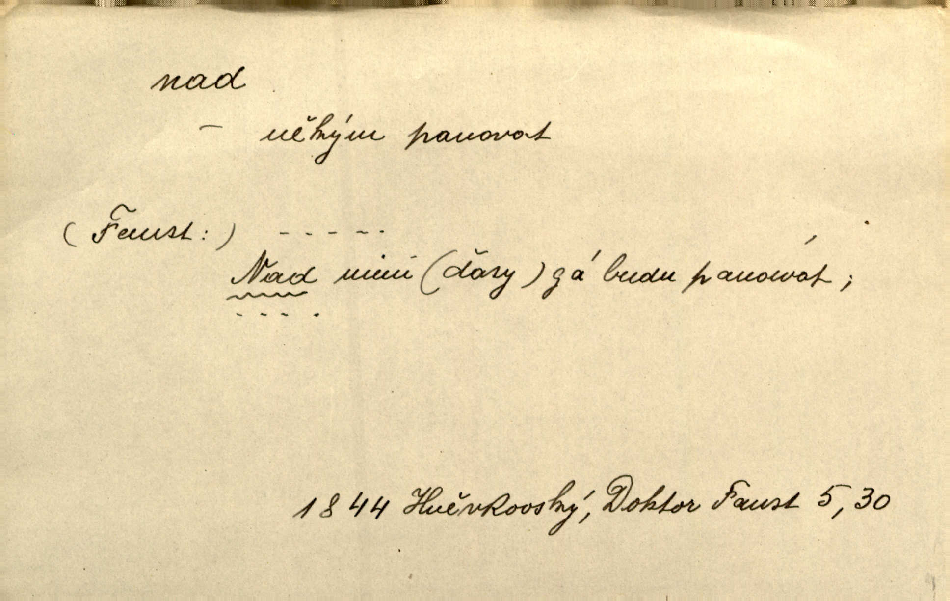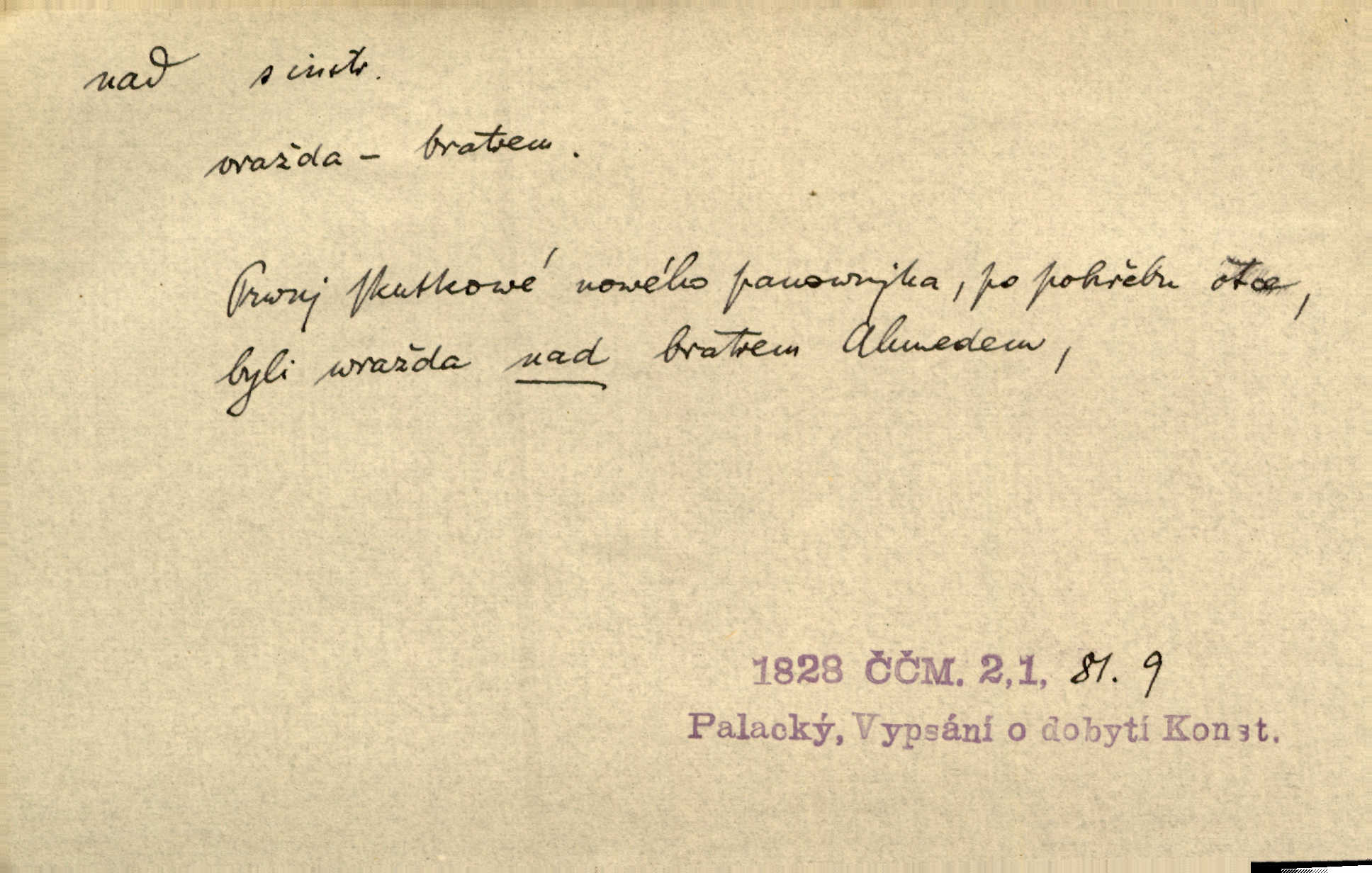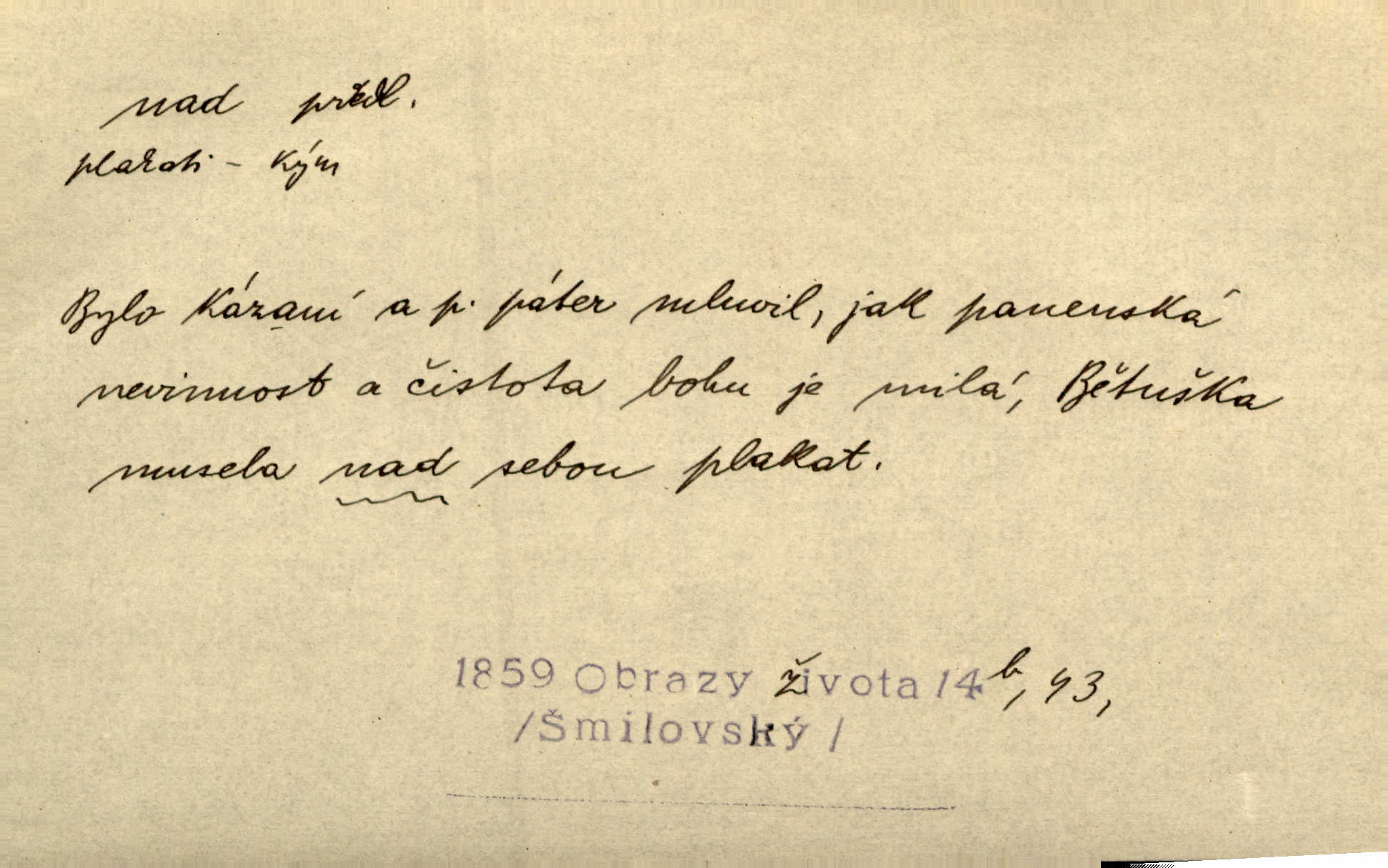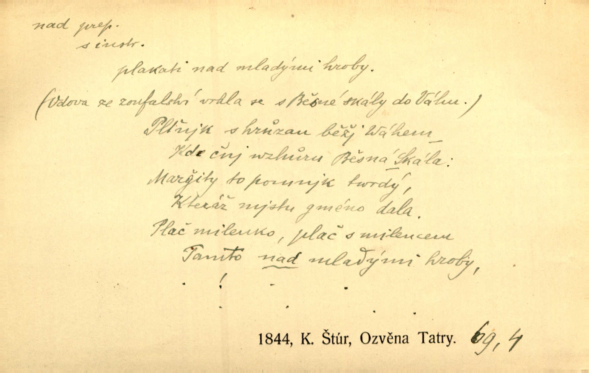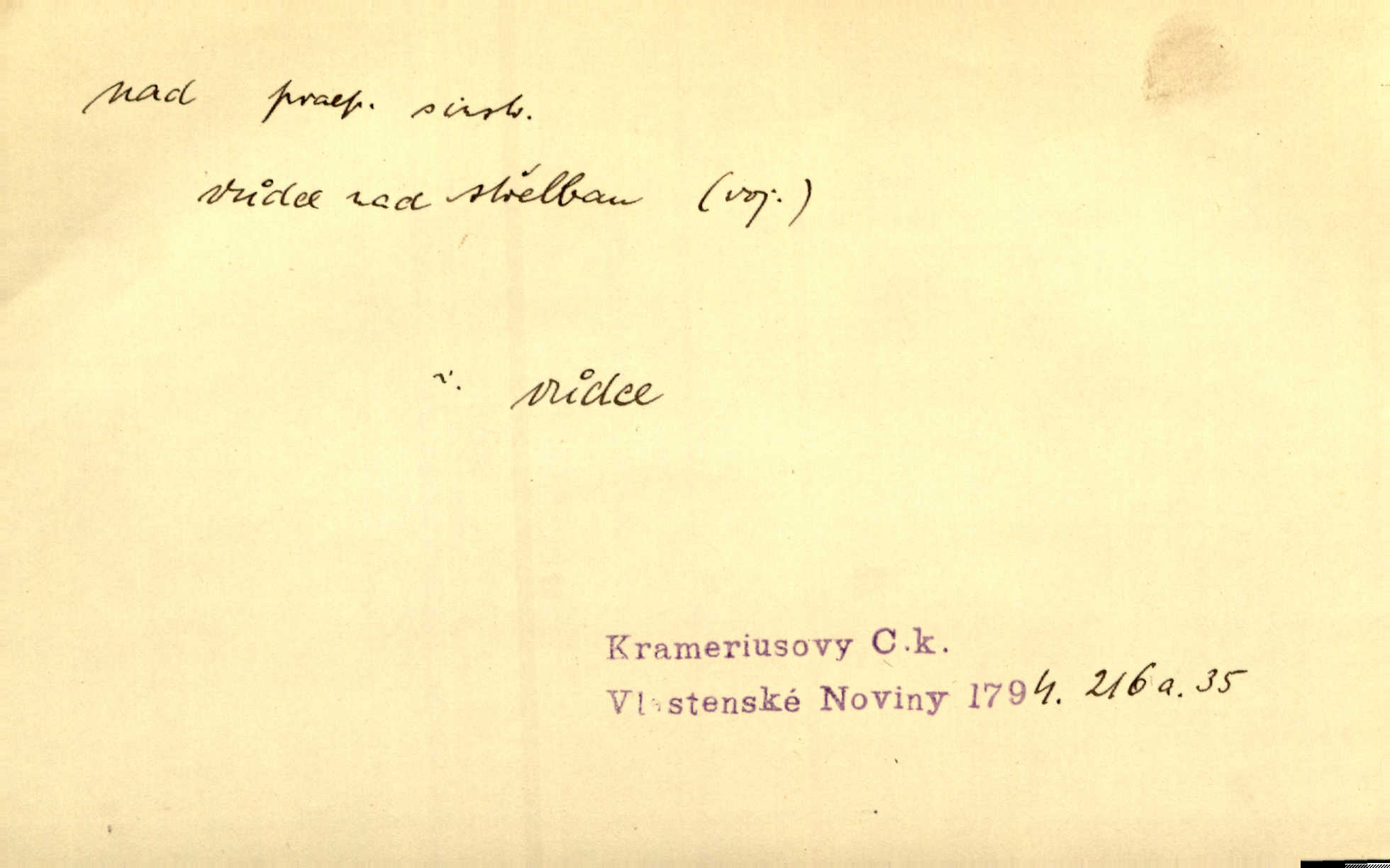- nad předl. s akus. vyjadřuje místo položené výše než někdo n. něco, k němuž děj nějaký směřuje. Slunce vyšlo nad horu. Čel. Vynořila se nad houštinu hlava s mocnýma parohama. Jir. Jeho vysoká postava vyniká nad všechny ostatní. Něm. Nahnula se nad jeho obličej. Něm. Rybičky vyskakovaly nad vodu. Prav. Nad dědinu snášel se vlažný večer. Herb. Pod kolenama až nad lejtka leskly se mu bílé punčochy. Tyl. Venku je bláta nad kotníky! Rub. Ruce, až nad loket obnažené. Šim. Nenosil tak vysoké boty až nad kolena. Něm. Stárneme, děti nám rostou nad hlavu vymaňují se z našeho vlivu. Čap. Ch. Když ono, pane, je té práce u nás až nad hlavu přespříliš. Rais. D vyjadřuje to, co je n. není předstihováno, předstiženo, překonáno něčím jiným. Ujímati se vdov a sirotků — to je skutek nad všeliké dobré skutky. Baar. Dobrá rada nad zlato. Přísl. On je vám chytrý nad žida. Něm. Mijoval ji vášnivě, nad Márinku nebylo. Štol. Tvá žena že je nad mou, ty kluku? Kosm. Nad vás není, slečno Viki — v celé Praze by druhou takovou hospodyni nenašel. Šim. Básník byl v něm [Stendhalovi] nad psychologa. Šal. Říkávají, že nebývá nad lásku mateřskou a nad péči otcovskou! Třeb. Odvětila tónem, z něhož vyznívalo, že je daleko povýšena nad všechny narážky. Šim. Chleba tvrdší nad oblásky. Ner. Věci nad slunce jasnější nesměly být vyslovovány. Herb. Vám, dětí našich milé pěstitelky, dán úkol krásný a nad jiné velký. Ner. Není pod sluncem tvora podlejšího nad člověka. Bozd. Můj starý přítel, nade všechny milovaný. Us. Bývala [dcera] otci nade všecko drahá. Svět. [Domek] svým zevnějškem nad jiné vynikal. Jir. Nevypínali se jeden nad druhého. Prav. V trpělivosti předčí [lid český] i nad samy mravence. Šmil. Tvoje ústa malá voní nad jabloně květ. Čech. Křičel chraptivě nad síly svých hlasivek. R. Svob. Já musel pořád žít nad své poměry nákladněji, než postavení dovolovalo. Čap. Paní Johanka nad slušnosť a míru rozhazovala více, než se slušelo a patřilo. Šmil. Rány hojily se nad očekávání rychle nezvykle, neobyčejně. Jir. Nad pomyšlení rozveselen svolal všecku čeleď. Ehrenb. Ulice oživly již za té ranní doby nad obyčej neobyčejně. Jir. Že se řádně zmácháte, jest nade vši pochybnost nepochybné. Ehrenb. Častěji sem chodil a nad potřebu dlouho tu prodléval zbytečně. Vrba. D s opakovaným substantivem vyjadřuje zesilování, stupňování. Div nad div! Verunka pronesla jen několik slov, ale ta slova zaryla se mu do duše. Šmil. Zmatek nad zmatek vládne v jeho [lidstva] hlavách. Baar. Marnosť nad marnosť, všecko je marnosť. Vrch. No je to radost nad radost. Ner. Psávaly jsme nesmysly nad nesmysly. Krás. Jsem konečně i sobec nad sobce, který by rád se něčeho dobádal. Kos. D nad to připojuje (často s důrazem) k tomu, co již bylo řečeno, něco nového. Nestačil svou pravicí, aby odnesl těžkého muže ve zbroji a nad to bez vlády omdlelého. Jir. Vedl si vesele, miloval zábavy i společnost. Nad to byl postavy krásné. Jir. [Hoch] nemá schopností a je nad to ještě darebákem. Ner. D Dial. nad lidi mezi lidi, před lidmi. Všímám si jenom svého, nikam nad lidi nevyjdu. Rais. Nemusíme to snad o polednách nade všecky lidi odnášet, brousí to pak po člověku a pomlouvají. Rais. Já mu do ničeho mluvit nesmím, protože potom spustí nad lidi a je mi hanba. Rais. D předl. s instr. vyjadřuje místo položené směrem vzhůru od někoho n. od něčeho, na němž něco je n. se děje. A lampa ještě hořela, co nad klekadlem visela. Erb. Povstala, spráskla ruce nad hlavou. Čap. Ch. Konci prstů přejížděla po vlasech nad skráněmi. Šim. Mysli se nejvýš — a nad tebou hvězd jako vřesných zvonců. Ner. Obloha nad západem zeleněla. Mrš. Nad sněhem juž první skřivan zpíval. Vrch. Chef nad rozloženými plány vykládal o turbině. Čap. Ch. Protrhl se rybník, co byl výše nad vesnicí. Jir. Nad Otavou leží z větších měst také ještě Horažďovice, Sušice, Písek při Otavě. Šim. Geom. opsati kružnici nad průměrem tak ji nakresliti, že daná úsečka se stane průměrem kružnice. D vyjadřuje osobu n. věc podléhající vlivu, převaze, moci, právu někoho n. něčeho. Vždyť nemusí našinec nad sebou chefa trpěti. Krás. Klidně chci očekávat, jakkoli nebe nade mnou rozhodne. Zey. Odpoledne už zase stál nad lidmi v kamenných lomech dozíral. A. Mrš. Jak bůh nade mnou, čirou mluvím pravdu. Šmil. Vyniká [rek] nad ostatní silou. Durd. Ctibor silou svojí zvítězil nad jedním německým rytířem, nad kterým nikdo zvítězit nemohl. Něm. Nabyv ledové chladnosti, dovedl jí vládnouti nad jinými. Pfleg. Bystré oko lesníkovo nad lesy bdíti počalo. Lum. Nikdo nežárlil, že jemu nebylo svěřeno poručnictví nad Mařenkou. Podl. Nakupování, vaření, rozdělování — nad tím jsem já zas ministr to mám na péči, to mně přísluší. Šim. D s opakovaným substativem vyjadřuje zesilování, stupňování. Což dím, ó marnost nad marností! Jg. Máme místo konstituce zmatek nad zmatkem. Havl. D vyjadřuje příčinu duševního, zejm. citového rozpoložení. Radost nad shledáním dvou milých jí lidí popoháněla ji [babičku] tam. Něm. Otázal se hlasem, nad nímž jej sama zamrazilo. Čap. Ch. Utrápil se nad darebným synem. Ner. My nad ní [dcerou] starostí sešedivíme! R. Svob. Kdo se neslituje nad dítětem, není dětí hoden. Hál. Když je [lívanečky] přinášela, strnul jsem nad jejich množstvím. Šim. Obec se sama nad sebou zapomíná — a jako žebráci o almužnu se sváříte. Baar. Zadumal se nad tím slovem. Zey. Sám pánbůh blažen se nad námi usmíval. Ner.