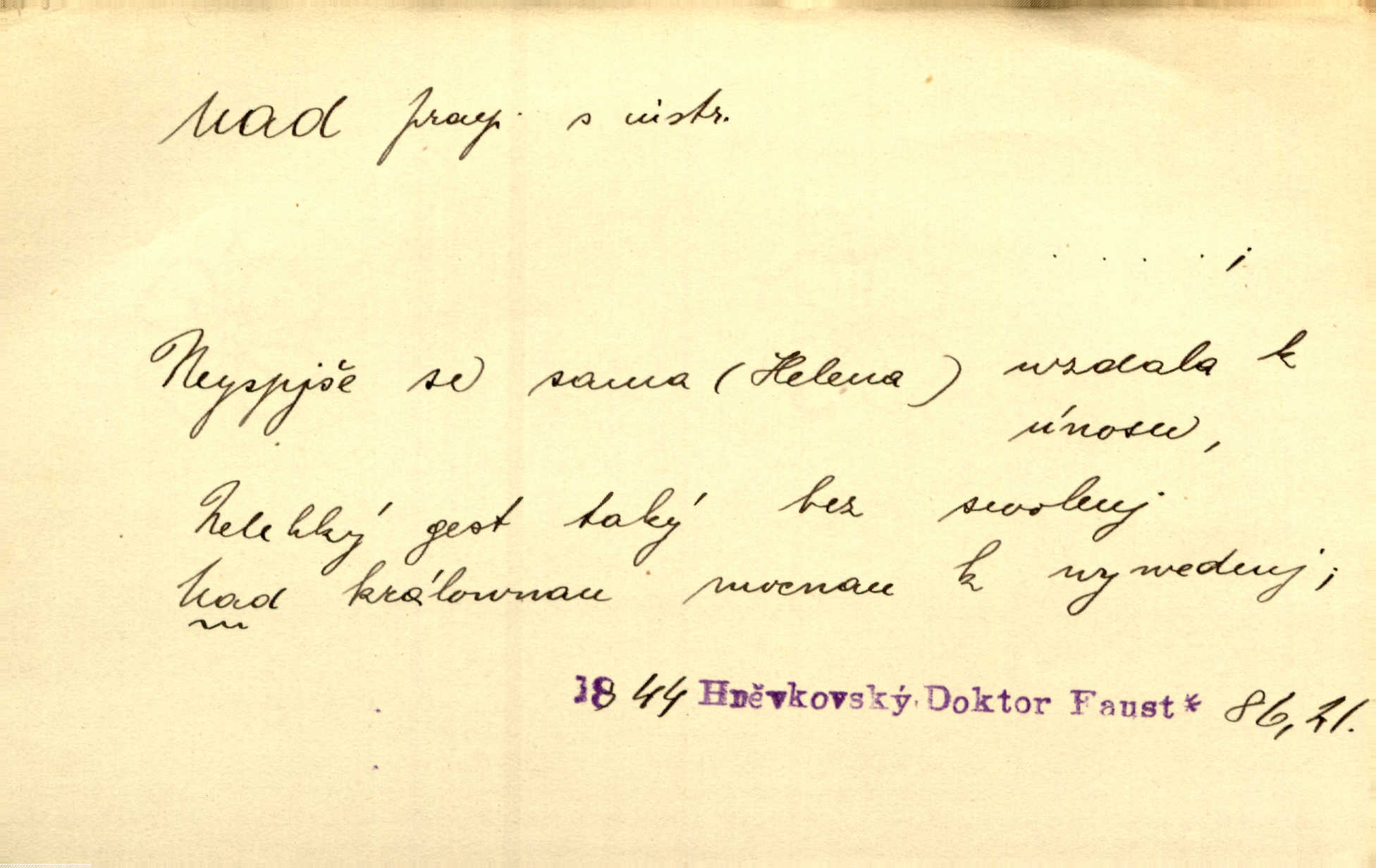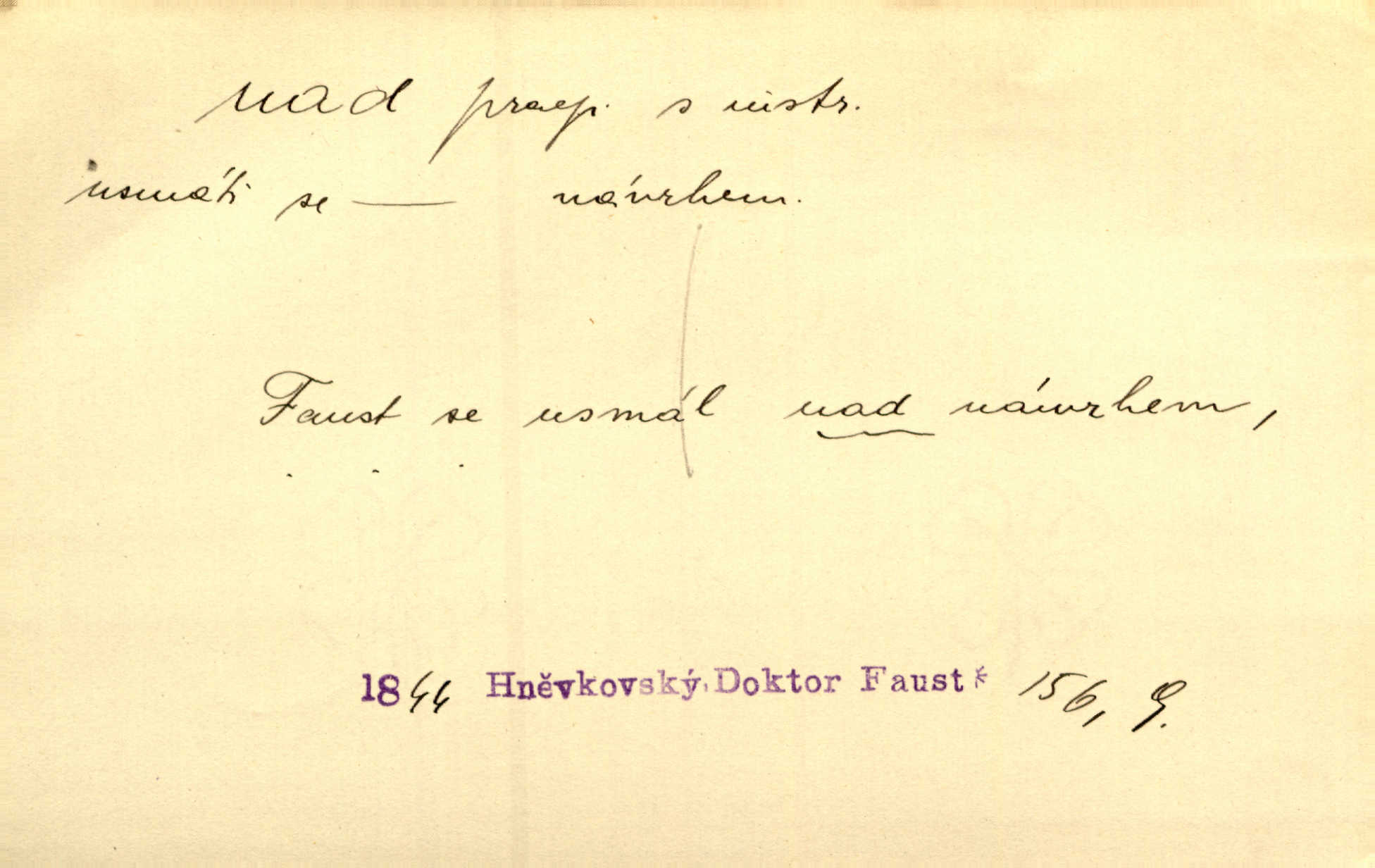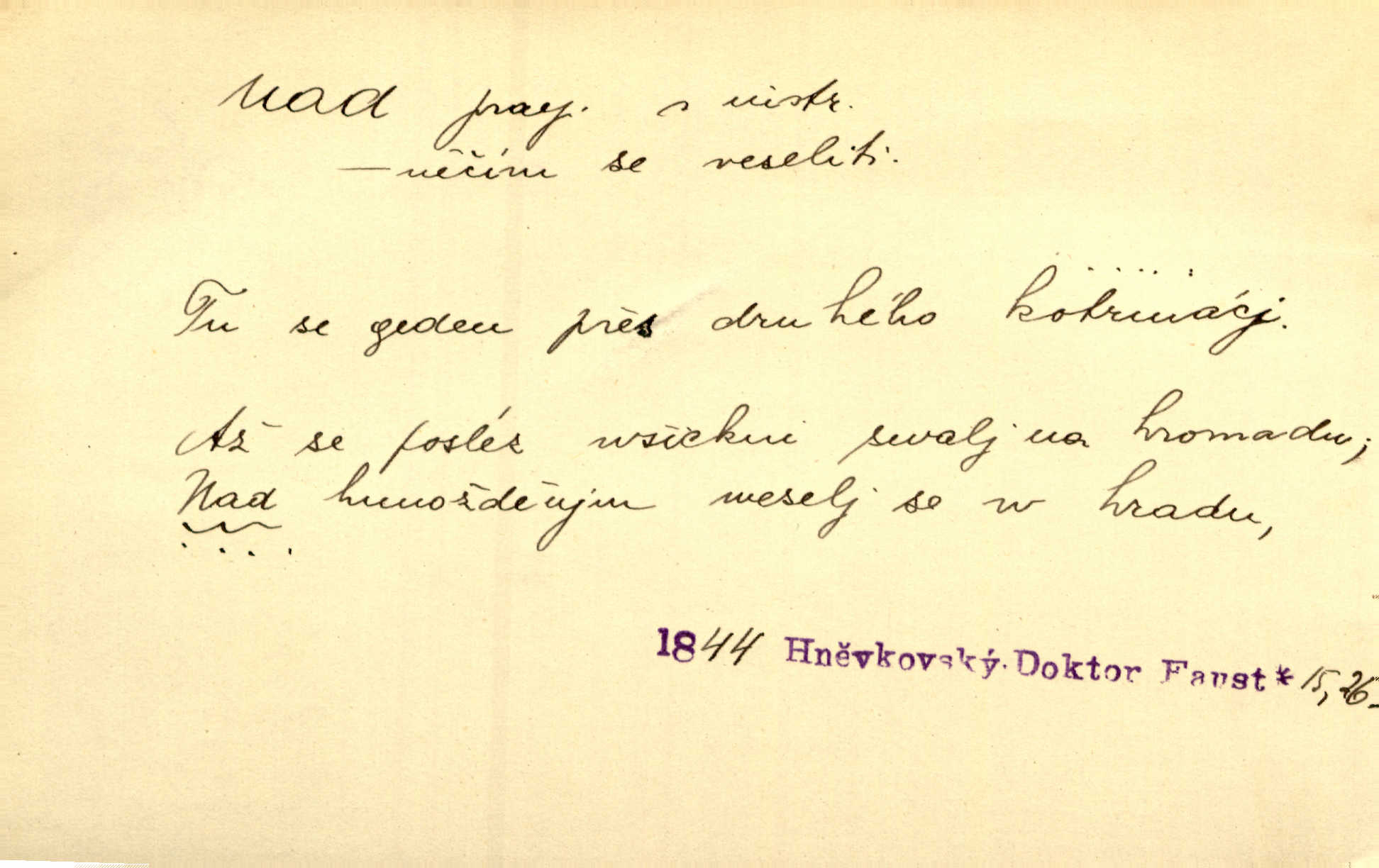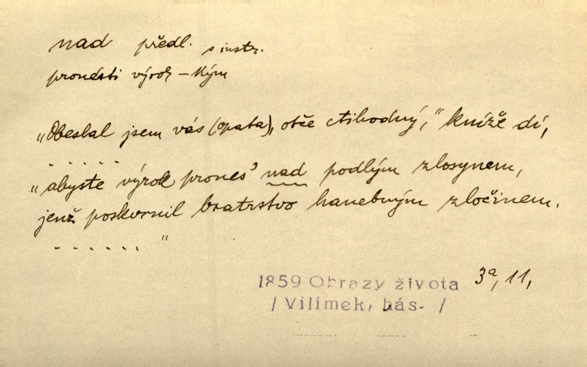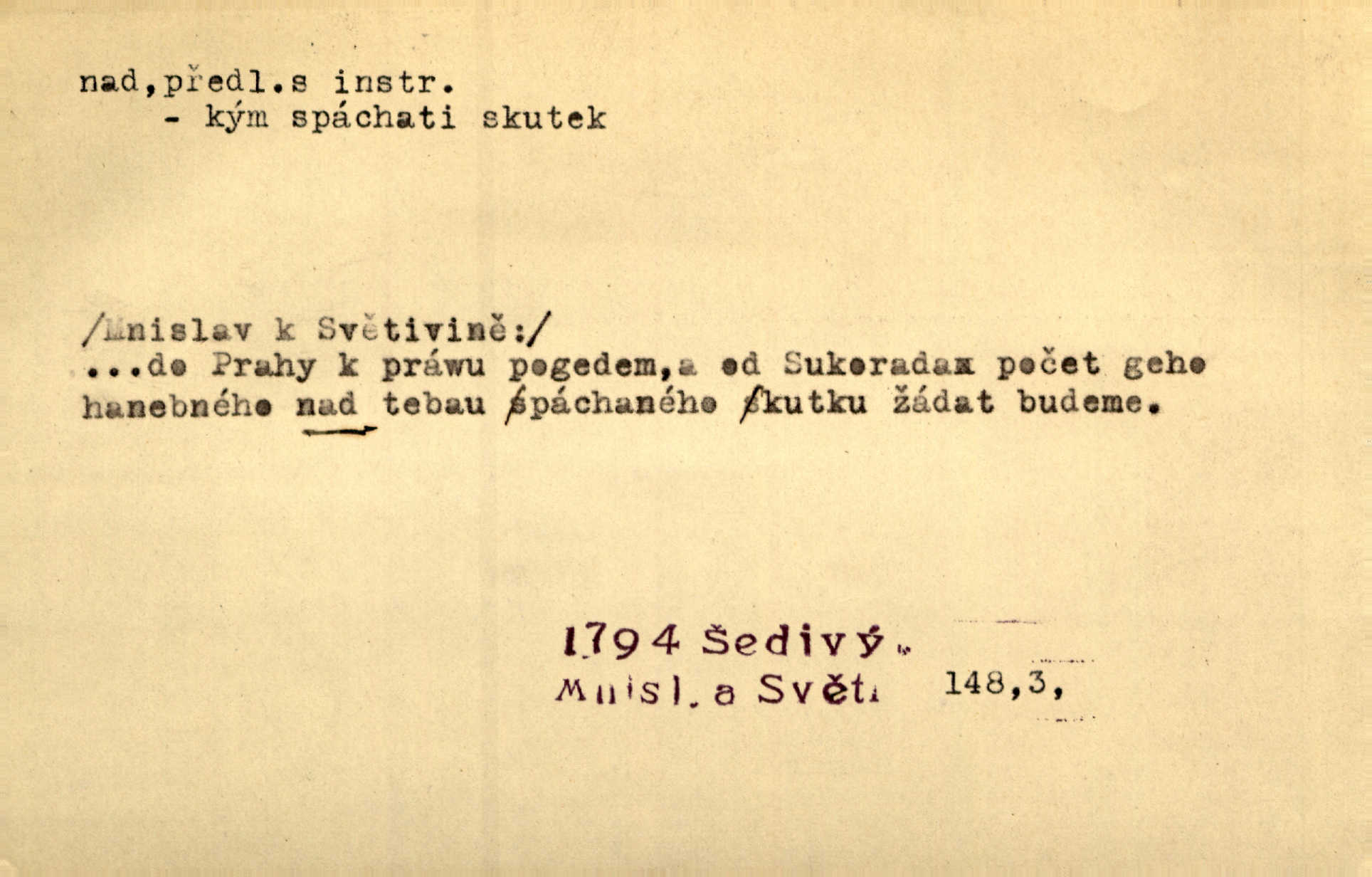 - nad předl. s akus. vyjadřuje místo položené výše než někdo n. něco, k němuž děj nějaký směřuje. Slunce vyšlo nad horu. Čel. Vynořila se nad houštinu hlava s mocnýma parohama. Jir. Jeho vysoká postava vyniká nad všechny ostatní. Něm. Nahnula se nad jeho obličej. Něm. Rybičky vyskakovaly nad vodu. Prav. Nad dědinu snášel se vlažný večer. Herb. Pod kolenama až nad lejtka leskly se mu bílé punčochy. Tyl. Venku je bláta nad kotníky! Rub. Ruce, až nad loket obnažené. Šim. Nenosil tak vysoké boty až nad kolena. Něm. Stárneme, děti nám rostou nad hlavu vymaňují se z našeho vlivu. Čap. Ch. Když ono, pane, je té práce u nás až nad hlavu přespříliš. Rais. D vyjadřuje to, co je n. není předstihováno, předstiženo, překonáno něčím jiným. Ujímati se vdov a sirotků — to je skutek nad všeliké dobré skutky. Baar. Dobrá rada nad zlato. Přísl. On je vám chytrý nad žida. Něm. Mijoval ji vášnivě, nad Márinku nebylo. Štol. Tvá žena že je nad mou, ty kluku? Kosm. Nad vás není, slečno Viki — v celé Praze by druhou takovou hospodyni nenašel. Šim. Básník byl v něm [Stendhalovi] nad psychologa. Šal. Říkávají, že nebývá nad lásku mateřskou a nad péči otcovskou! Třeb. Odvětila tónem, z něhož vyznívalo, že je daleko povýšena nad všechny narážky. Šim. Chleba tvrdší nad oblásky. Ner. Věci nad slunce jasnější nesměly být vyslovovány. Herb. Vám, dětí našich milé pěstitelky, dán úkol krásný a nad jiné velký. Ner. Není pod sluncem tvora podlejšího nad člověka. Bozd. Můj starý přítel, nade všechny milovaný. Us. Bývala [dcera] otci nade všecko drahá. Svět. [Domek] svým zevnějškem nad jiné vynikal. Jir. Nevypínali se jeden nad druhého. Prav. V trpělivosti předčí [lid český] i nad samy mravence. Šmil. Tvoje ústa malá voní nad jabloně květ. Čech. Křičel chraptivě nad síly svých hlasivek. R. Svob. Já musel pořád žít nad své poměry nákladněji, než postavení dovolovalo. Čap. Paní Johanka nad slušnosť a míru rozhazovala více, než se slušelo a patřilo. Šmil. Rány hojily se nad očekávání rychle nezvykle, neobyčejně. Jir. Nad pomyšlení rozveselen svolal všecku čeleď. Ehrenb. Ulice oživly již za té ranní doby nad obyčej neobyčejně. Jir. Že se řádně zmácháte, jest nade vši pochybnost nepochybné. Ehrenb. Častěji sem chodil a nad potřebu dlouho tu prodléval zbytečně. Vrba. D s opakovaným substantivem vyjadřuje zesilování, stupňování. Div nad div! Verunka pronesla jen několik slov, ale ta slova zaryla se mu do duše. Šmil. Zmatek nad zmatek vládne v jeho [lidstva] hlavách. Baar. Marnosť nad marnosť, všecko je marnosť. Vrch. No je to radost nad radost. Ner. Psávaly jsme nesmysly nad nesmysly. Krás. Jsem konečně i sobec nad sobce, který by rád se něčeho dobádal. Kos. D nad to připojuje (často s důrazem) k tomu, co již bylo řečeno, něco nového. Nestačil svou pravicí, aby odnesl těžkého muže ve zbroji a nad to bez vlády omdlelého. Jir. Vedl si vesele, miloval zábavy i společnost. Nad to byl postavy krásné. Jir. [Hoch] nemá schopností a je nad to ještě darebákem. Ner. D Dial. nad lidi mezi lidi, před lidmi. Všímám si jenom svého, nikam nad lidi nevyjdu. Rais. Nemusíme to snad o polednách nade všecky lidi odnášet, brousí to pak po člověku a pomlouvají. Rais. Já mu do ničeho mluvit nesmím, protože potom spustí nad lidi a je mi hanba. Rais. D předl. s instr. vyjadřuje místo položené směrem vzhůru od někoho n. od něčeho, na němž něco je n. se děje. A lampa ještě hořela, co nad klekadlem visela. Erb. Povstala, spráskla ruce nad hlavou. Čap. Ch. Konci prstů přejížděla po vlasech nad skráněmi. Šim. Mysli se nejvýš — a nad tebou hvězd jako vřesných zvonců. Ner. Obloha nad západem zeleněla. Mrš. Nad sněhem juž první skřivan zpíval. Vrch. Chef nad rozloženými plány vykládal o turbině. Čap. Ch. Protrhl se rybník, co byl výše nad vesnicí. Jir. Nad Otavou leží z větších měst také ještě Horažďovice, Sušice, Písek při Otavě. Šim. Geom. opsati kružnici nad průměrem tak ji nakresliti, že daná úsečka se stane průměrem kružnice. D vyjadřuje osobu n. věc podléhající vlivu, převaze, moci, právu někoho n. něčeho. Vždyť nemusí našinec nad sebou chefa trpěti. Krás. Klidně chci očekávat, jakkoli nebe nade mnou rozhodne. Zey. Odpoledne už zase stál nad lidmi v kamenných lomech dozíral. A. Mrš. Jak bůh nade mnou, čirou mluvím pravdu. Šmil. Vyniká [rek] nad ostatní silou. Durd. Ctibor silou svojí zvítězil nad jedním německým rytířem, nad kterým nikdo zvítězit nemohl. Něm. Nabyv ledové chladnosti, dovedl jí vládnouti nad jinými. Pfleg. Bystré oko lesníkovo nad lesy bdíti počalo. Lum. Nikdo nežárlil, že jemu nebylo svěřeno poručnictví nad Mařenkou. Podl. Nakupování, vaření, rozdělování — nad tím jsem já zas ministr to mám na péči, to mně přísluší. Šim. D s opakovaným substativem vyjadřuje zesilování, stupňování. Což dím, ó marnost nad marností! Jg. Máme místo konstituce zmatek nad zmatkem. Havl. D vyjadřuje příčinu duševního, zejm. citového rozpoložení. Radost nad shledáním dvou milých jí lidí popoháněla ji [babičku] tam. Něm. Otázal se hlasem, nad nímž jej sama zamrazilo. Čap. Ch. Utrápil se nad darebným synem. Ner. My nad ní [dcerou] starostí sešedivíme! R. Svob. Kdo se neslituje nad dítětem, není dětí hoden. Hál. Když je [lívanečky] přinášela, strnul jsem nad jejich množstvím. Šim. Obec se sama nad sebou zapomíná — a jako žebráci o almužnu se sváříte. Baar. Zadumal se nad tím slovem. Zey. Sám pánbůh blažen se nad námi usmíval. Ner.