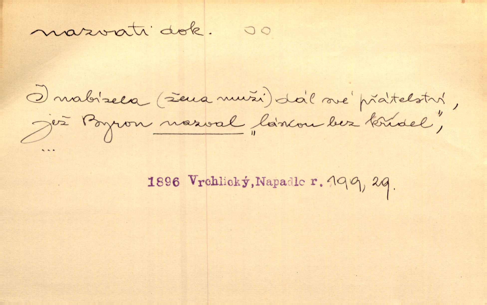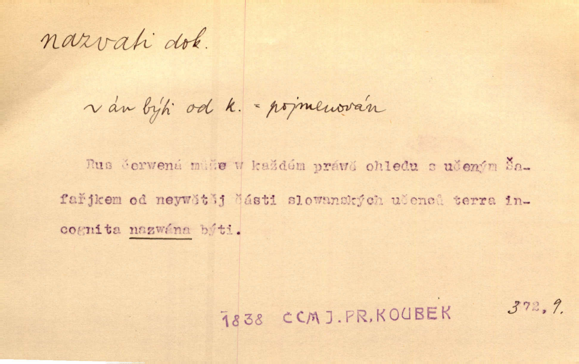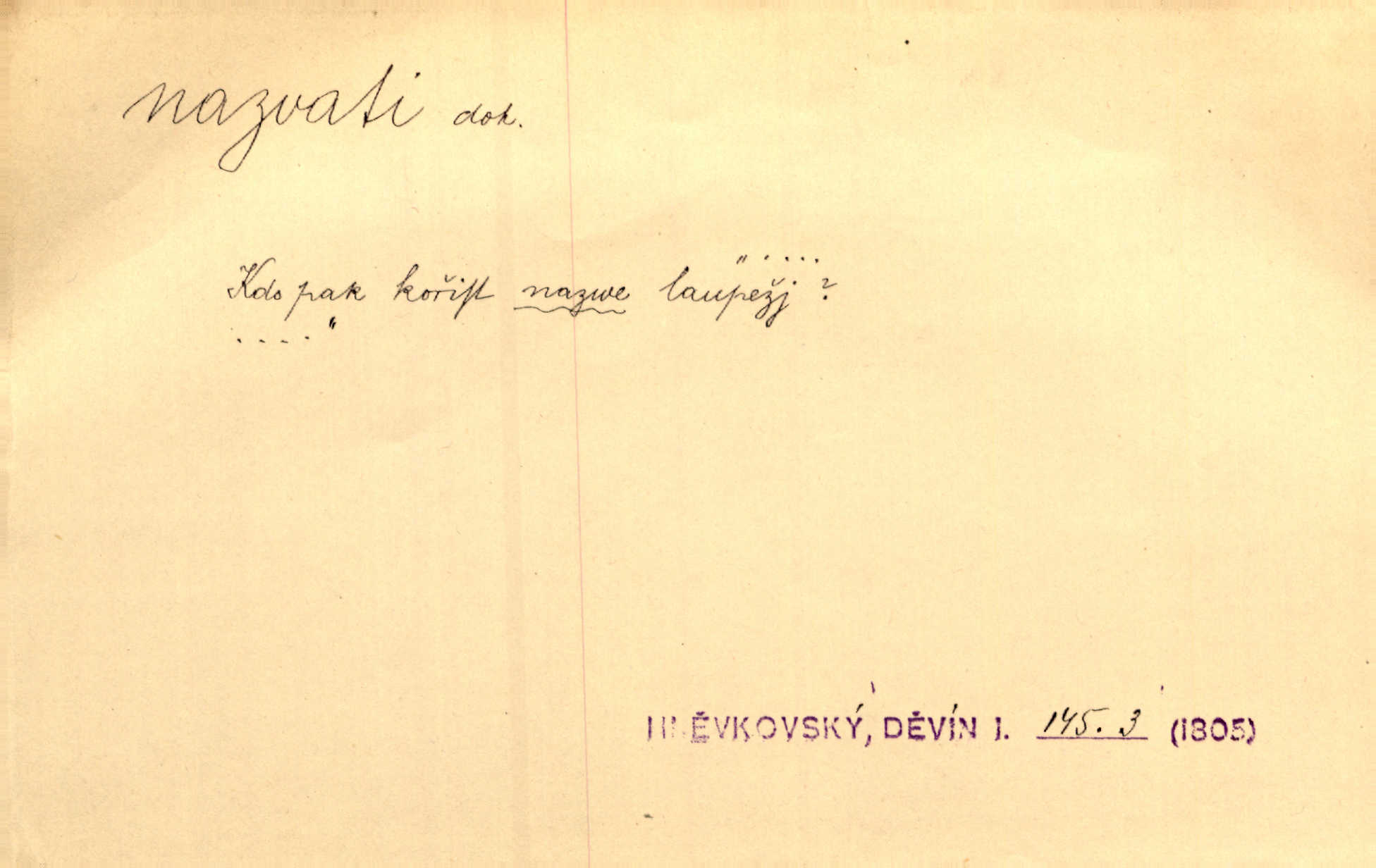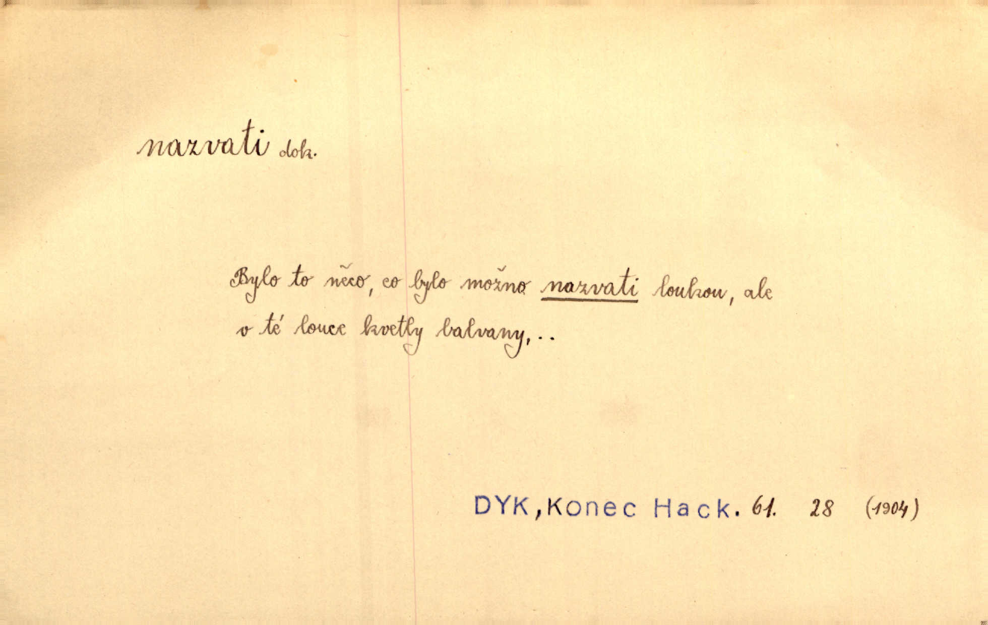 - nazvati dok. (koho, co jak) dáti někomu jméno, pojmenovati někoho. Bylo to něco, co bylo možno nazvati loukou, ale v té louce kvetly balvany. Dyk. „Polosvětem“ nazval mladší Dumas jistou část ženského obyvatelstva pařížského. Ner. Nazval dítě to Ibrahim. Rieg. Letopiscové dávají zprávu o jistém usmrcujícím stroji, železná panna nazvaném. Erb. Není žádné čepobití nebo tak nazvaný Zapfenstreich. Rub. D prohlásiti někoho za nějakého, učiniti nějakým. Nazve v brzce Anéžku chotí svou. Choch. Snažení mé nezná jiného cíle, nežli nazvati Lidmilu svou. Tyl. Chtěla byste, abych oplakávati musil ztrátu vaši, sotva že jsem vás nazvati směl svou? Pfleg. D (kam) větší počet osob pozvati. Králův syn nazval si druhův. Něm. Nazvala si hodně svatebčanů. Nov. Nazval si hosti do svého revíru. Herb. D nazvati se nakonati se mnoho zvaní. Vždyť si můžete myslit, co jsme se ho za ta léta nazvali k nám. Šim. Už ke mně běží [hostinský] a co se mne nazve. V. Mrš.