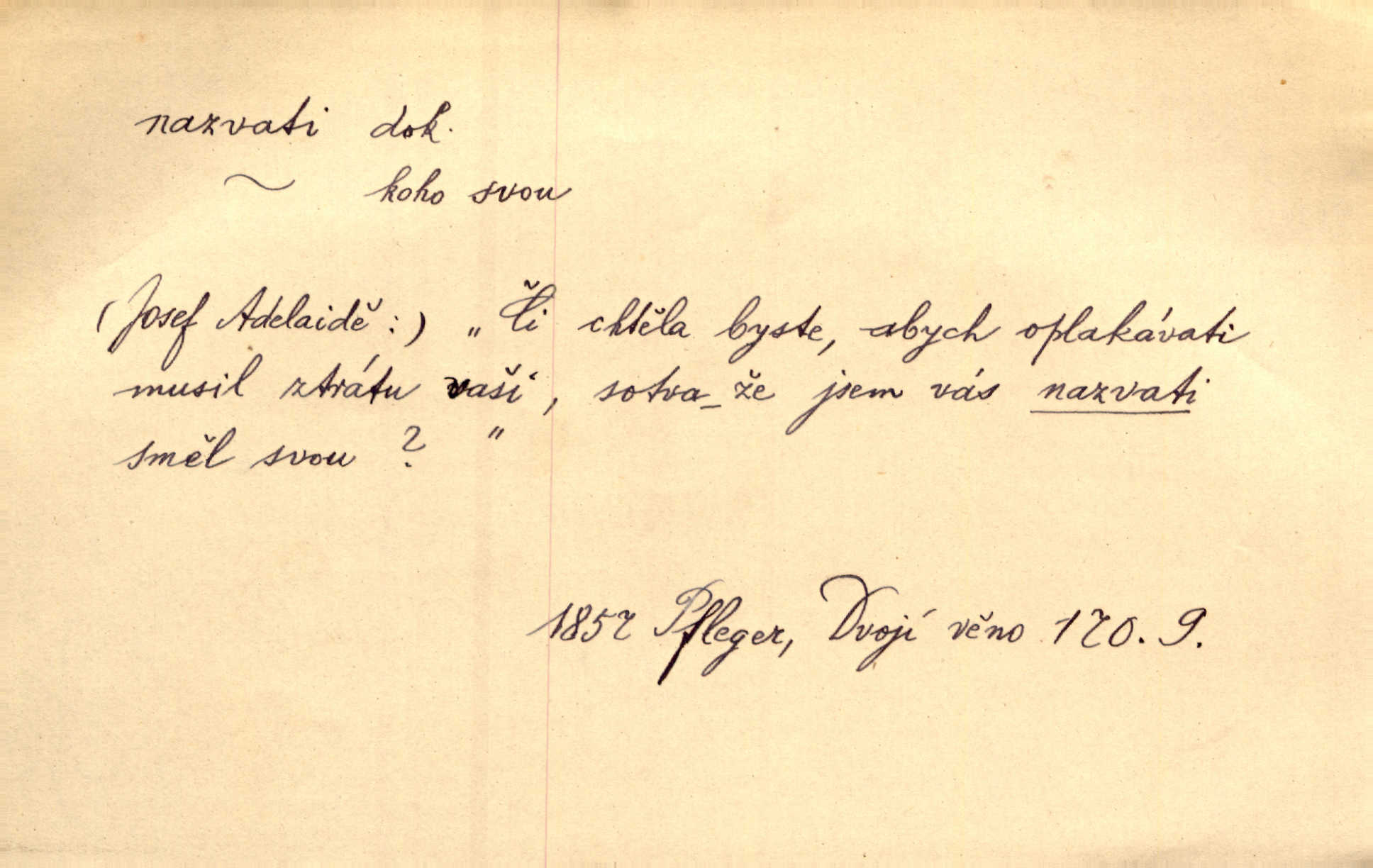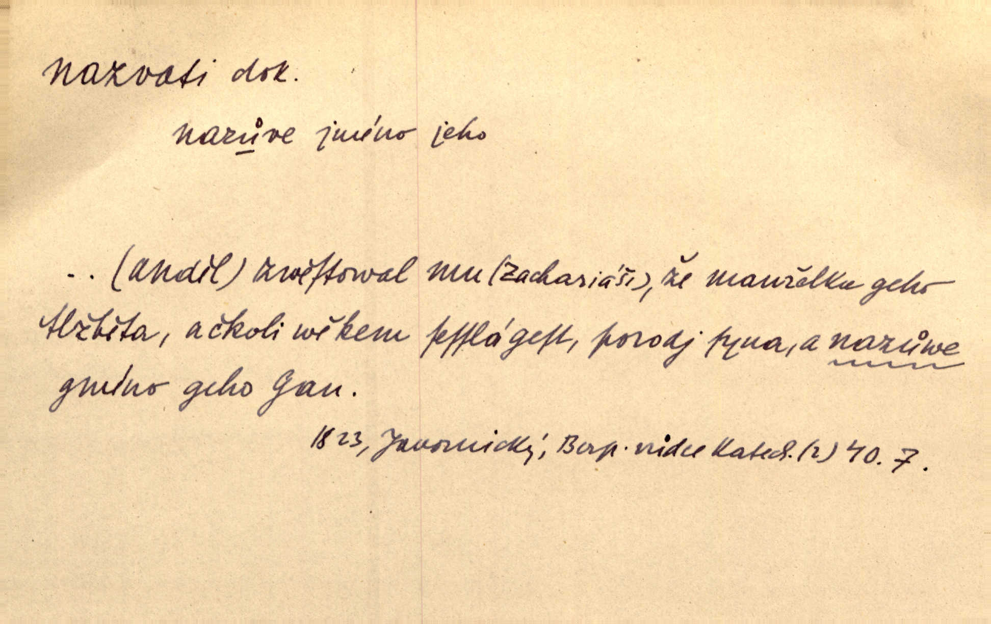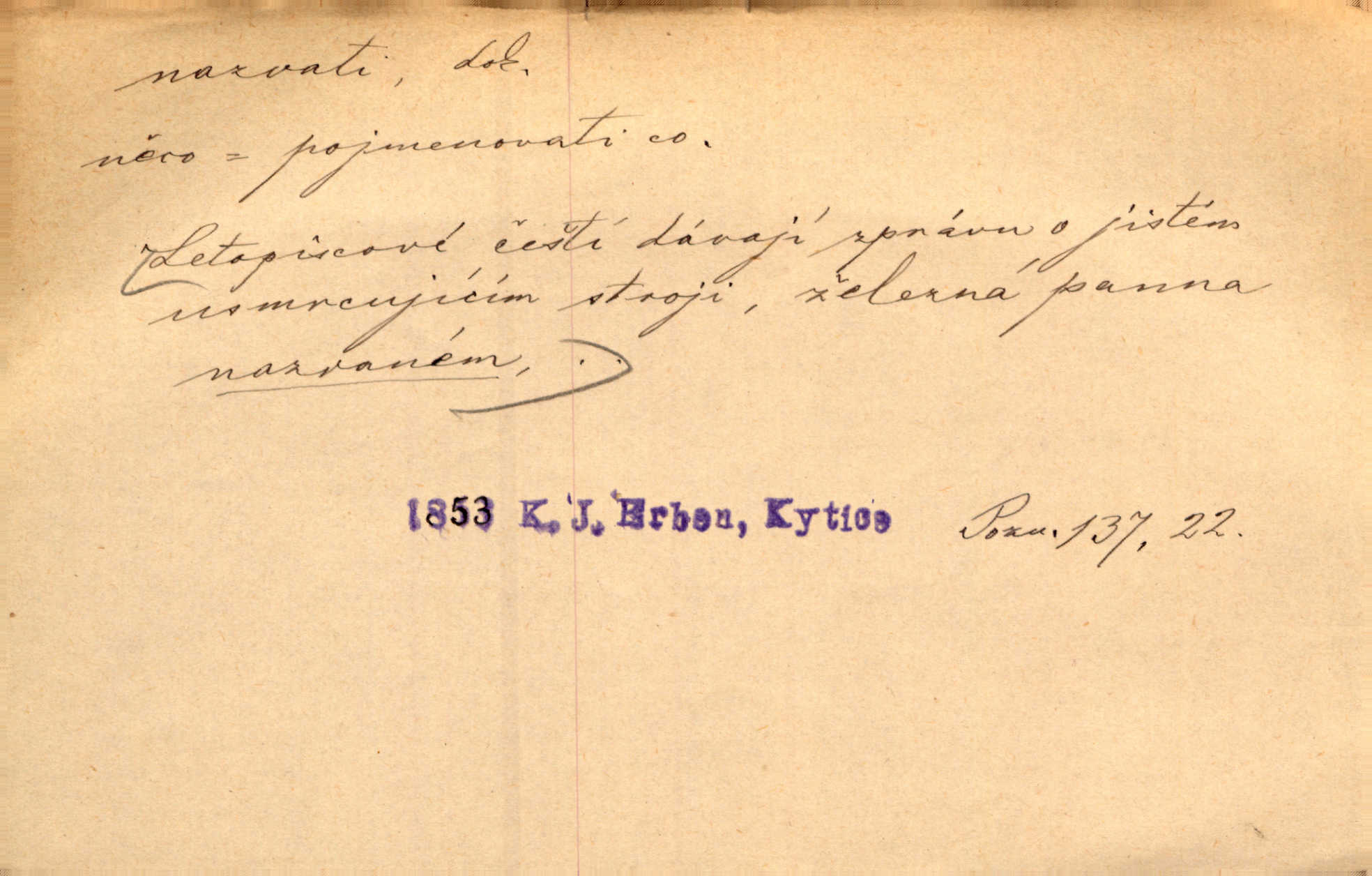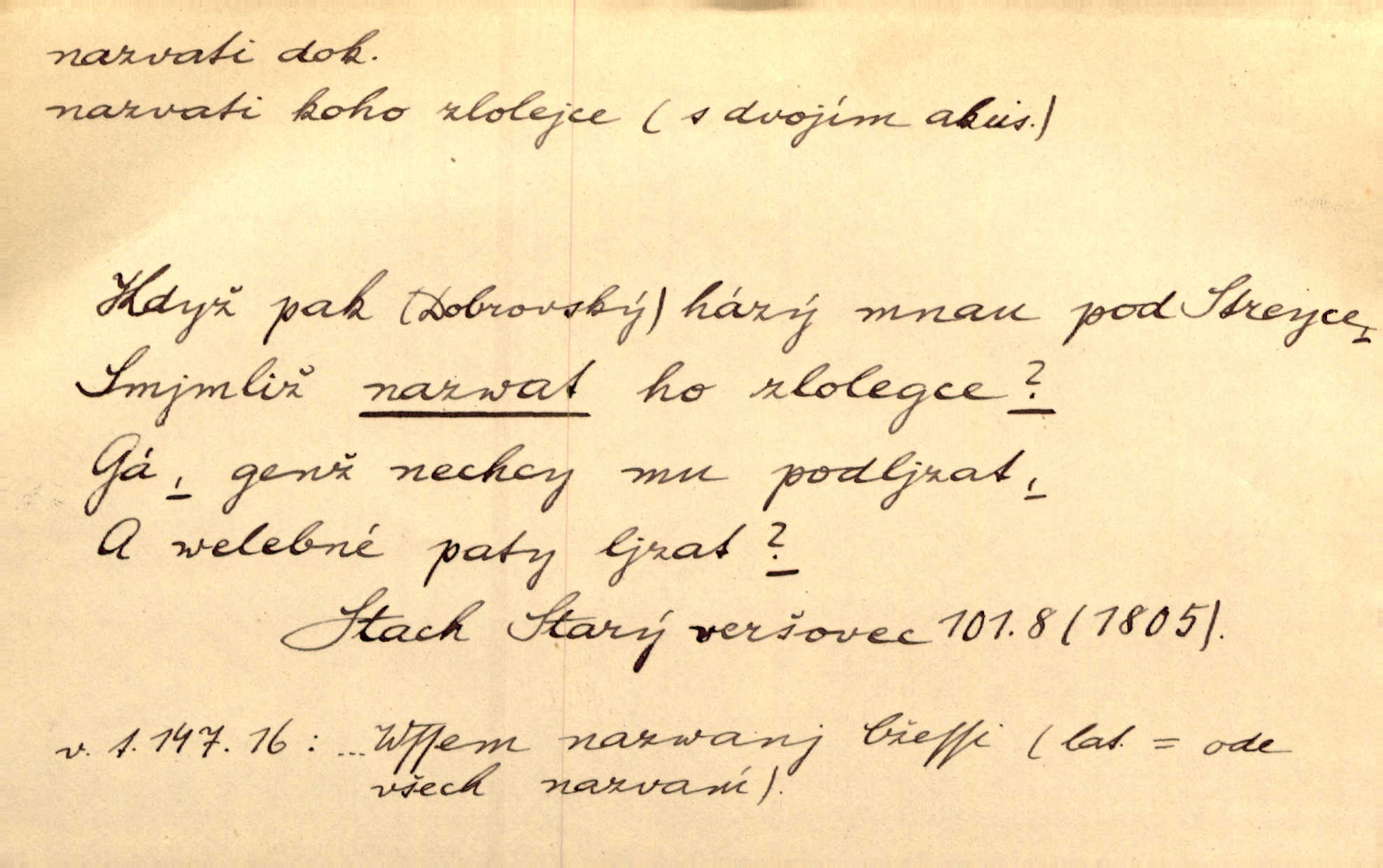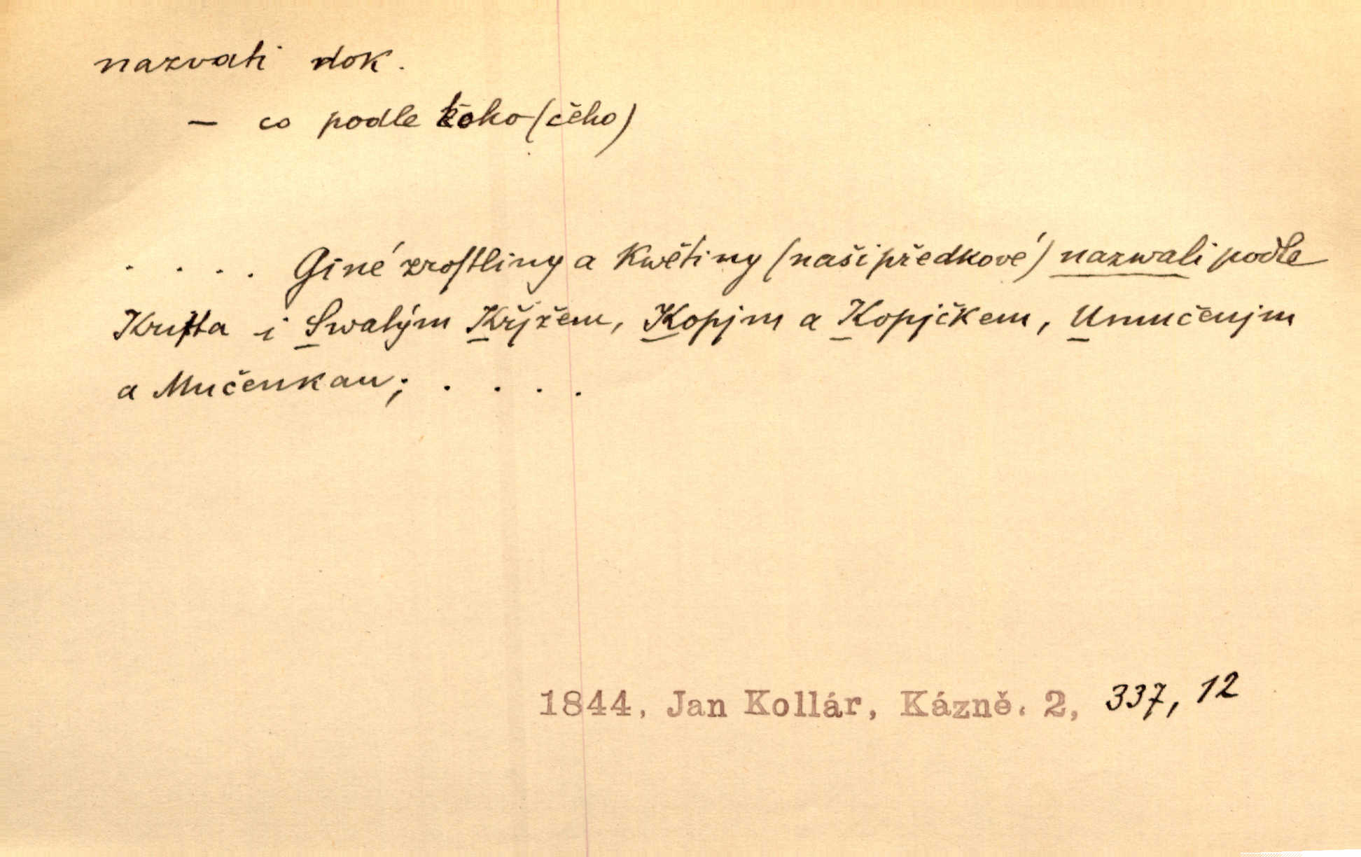 - nazvati dok. (koho, co jak) dáti někomu jméno, pojmenovati někoho. Bylo to něco, co bylo možno nazvati loukou, ale v té louce kvetly balvany. Dyk. „Polosvětem“ nazval mladší Dumas jistou část ženského obyvatelstva pařížského. Ner. Nazval dítě to Ibrahim. Rieg. Letopiscové dávají zprávu o jistém usmrcujícím stroji, železná panna nazvaném. Erb. Není žádné čepobití nebo tak nazvaný Zapfenstreich. Rub. D prohlásiti někoho za nějakého, učiniti nějakým. Nazve v brzce Anéžku chotí svou. Choch. Snažení mé nezná jiného cíle, nežli nazvati Lidmilu svou. Tyl. Chtěla byste, abych oplakávati musil ztrátu vaši, sotva že jsem vás nazvati směl svou? Pfleg. D (kam) větší počet osob pozvati. Králův syn nazval si druhův. Něm. Nazvala si hodně svatebčanů. Nov. Nazval si hosti do svého revíru. Herb. D nazvati se nakonati se mnoho zvaní. Vždyť si můžete myslit, co jsme se ho za ta léta nazvali k nám. Šim. Už ke mně běží [hostinský] a co se mne nazve. V. Mrš.