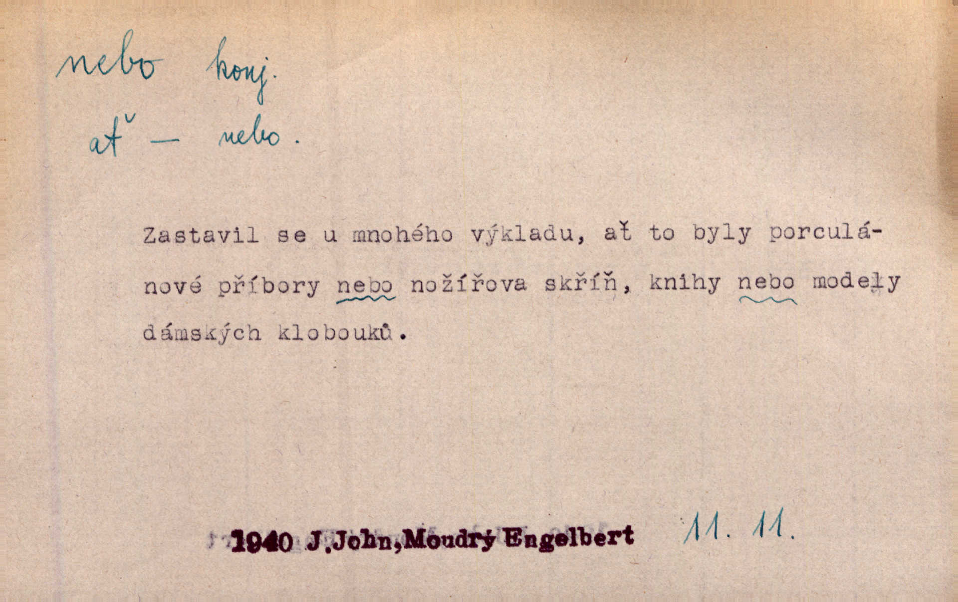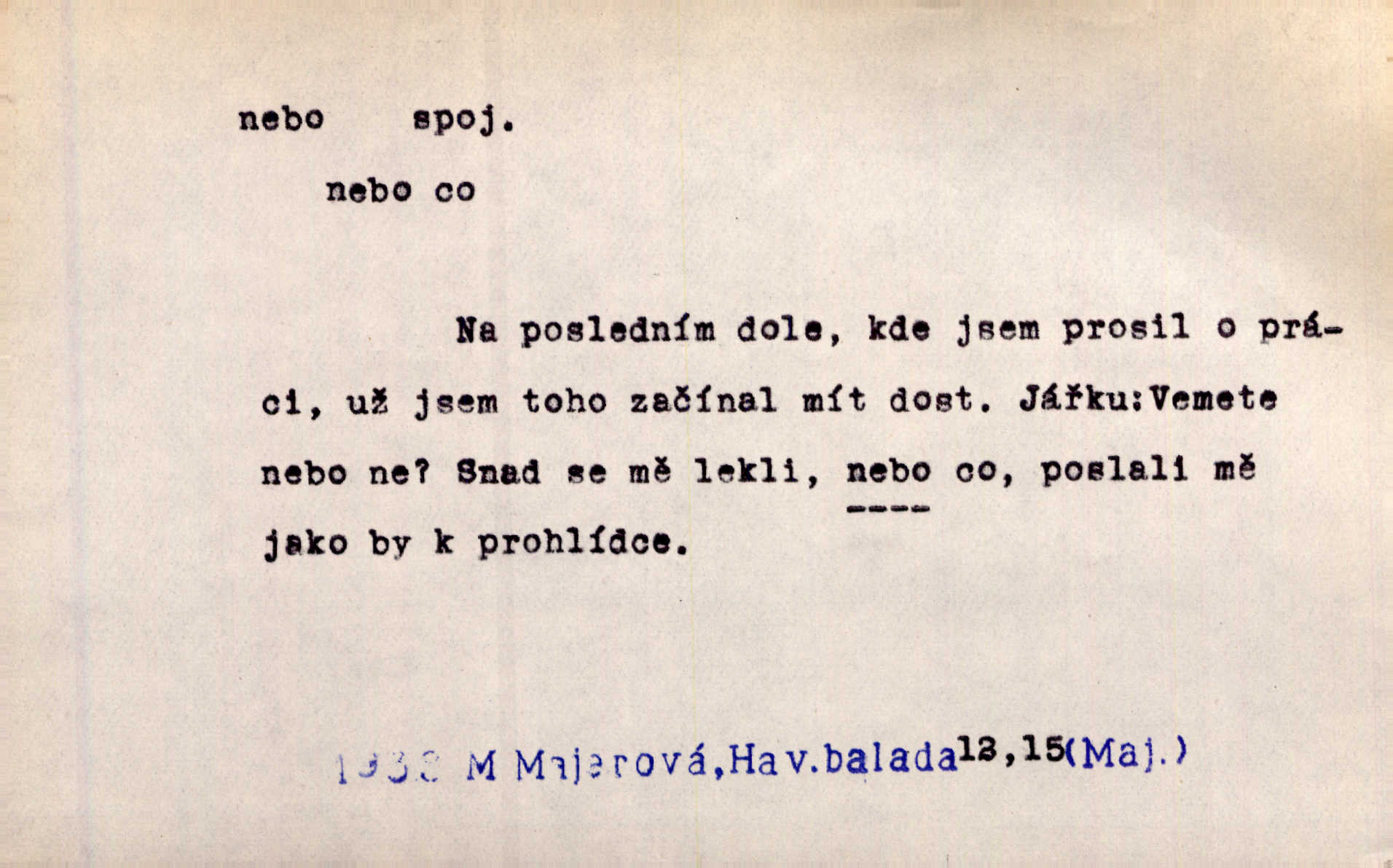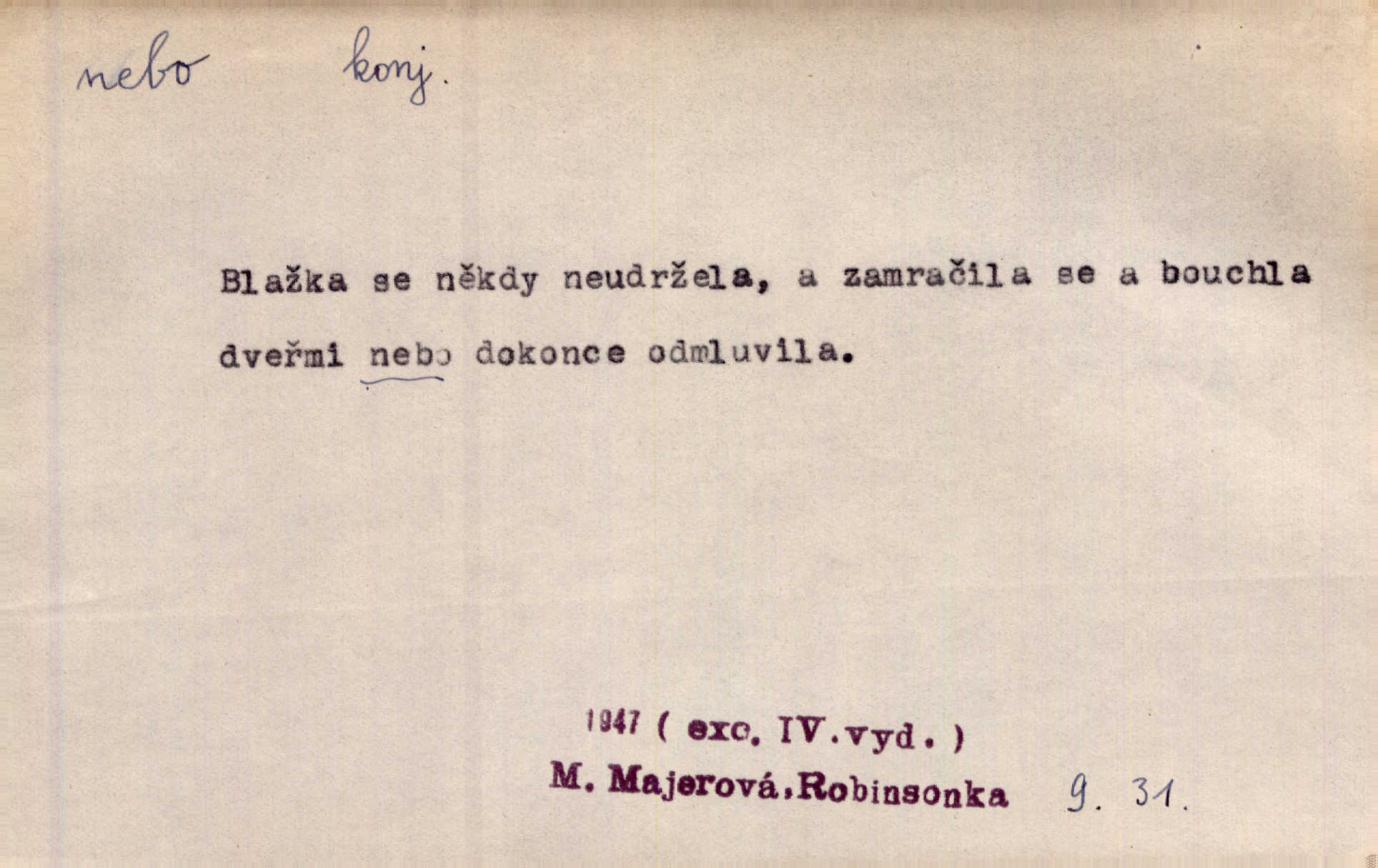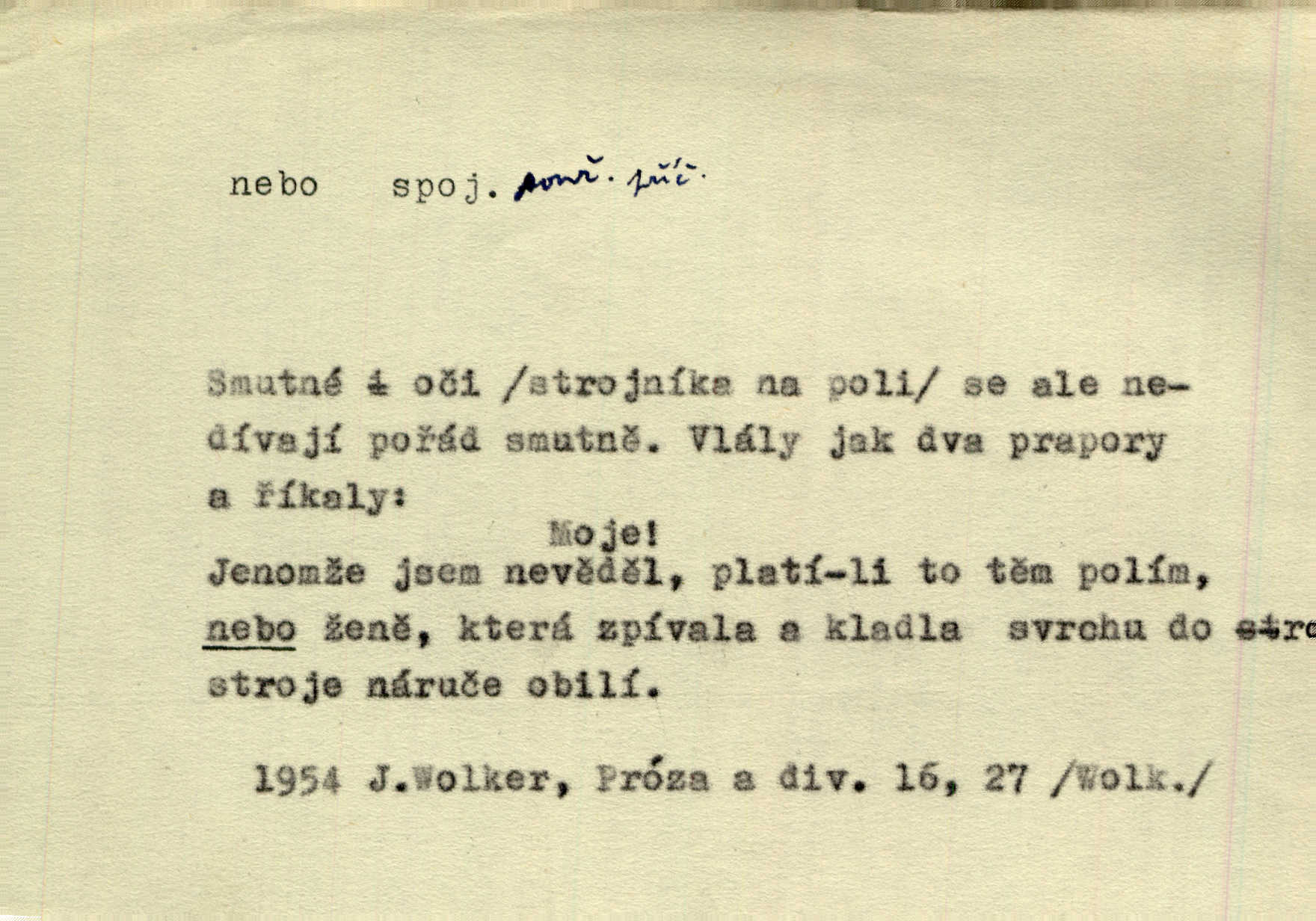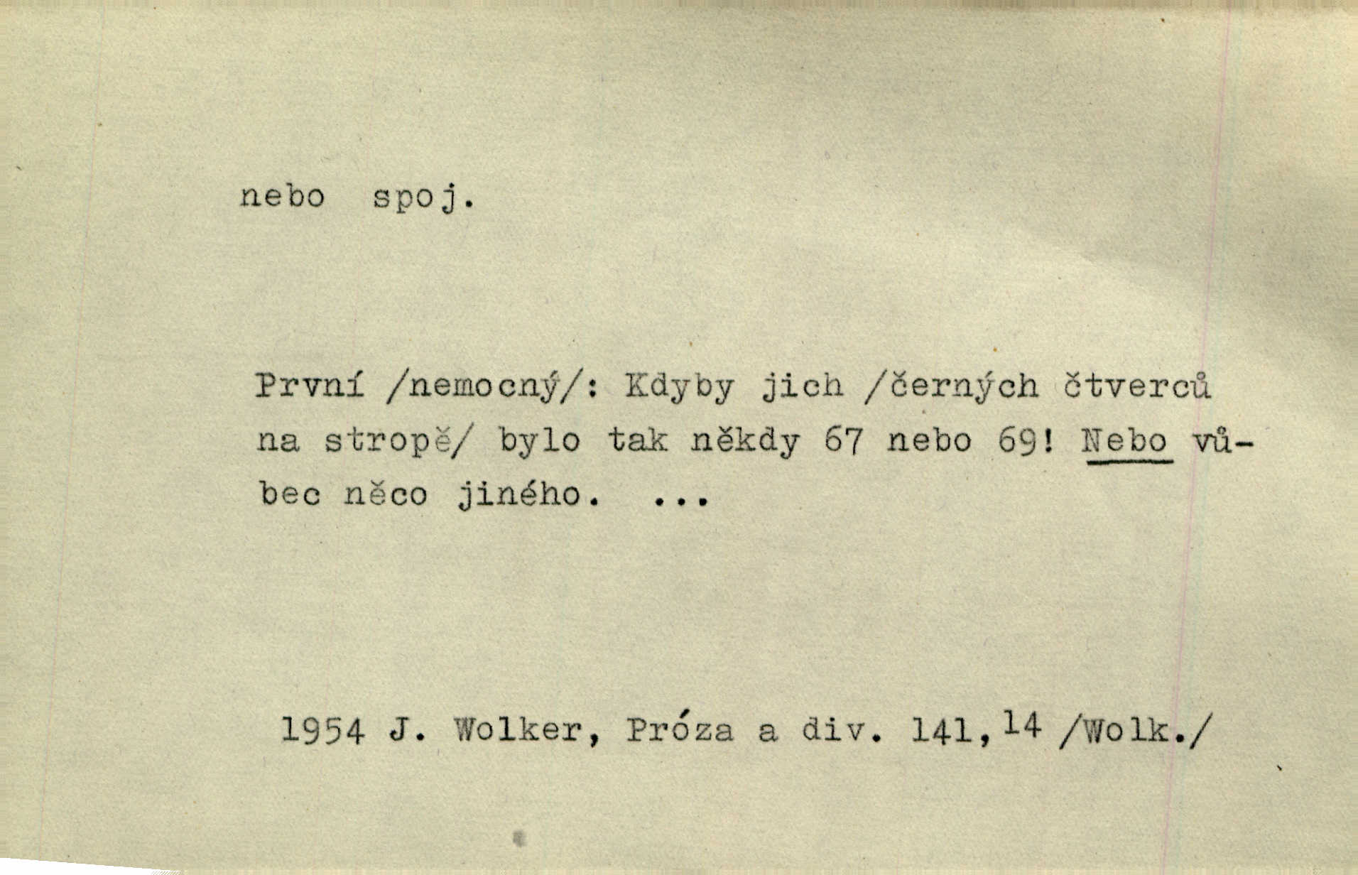 - nebo sp. vyjadřující rozmanitou míru rozlučovací (od libovolnosti do neslučitelnosti) druhé části rozšířeného členu větného n. druhé věty (též ve dvoučlenné otázce n. ve dvoučlenném přípustkovém spojení), neb, anebo. Tu tam v brambořišti nebo v řepě bělal se šátek nebo jupka. Rais. Padni oko nebo zub, já od tebe neupustím. Šmil. Myslí si, jak sama dřív nebo později bude taky tátu vypravovat. Rais. Začasté chodila babička s dětmi na delší procházky, třebas do myslivny, nebo do mlýna, nebo si zašly do lesa. Něm. Spíš, má panenko, nebo bdíš? či. Erb. Proč nechává mne tu sedět samotného? Anebo něco píše? Nebo snad mne nerad vidí? Šim. Nerozeznával, je-li to hrubiánství nebo žert. R. Svob. Ďas ví, jak se stalo, zdali vlastní nemotorností nebo zlomyslností nějakého tanečníka, Doubenus se svalil. Jir. Kdykoli přišel dědek s kolovrátkem, Matěj musil do kola, ať to bylo v stodole, nebo ve světnici. Prav. Oddával se obžerství i chlastu, ať bylo v noci nebo ve dne. Herrm. Ráno král Václav, nebo jak jej Pražané jmenují, lenivý Václav odsoudí, kdo se mu vinným býti třeba jen zdá neboli. Mácha. Ten člověk buď nás má za hotové blázny, nebo sám je blázen. Svět. Arch. Namluvil Benedu, aby se do Míšně obrátil, očekávaje, až ho nebo on, nebo Vratislav sám zavolá. Tyl. Nuž, Strakoši, koníku můj hbitý, nebo nyní, koni, aneb nikdy! Hol. D jinak, v opačném případě, v obráceném případě. Utíkej, nebo ti jich několik vlepím. Tyl. Jenom teď Pánbíček nedej zlé deště, nebo nám brambory začnou černat. Rais. Dejte mně dva loty [kávy] — ale dobré, nebo jsem tu posledně. Herrm. Nešahej na mě, nebo! — Já půjdu sám! Jir. D sp. dův. neboť. Tkanička více slyšel nežli viděl, nebo mu již přecházel zrak. Jir. Šenkýři ho [harfenistu] viděli velmi rádi, nebo, kdekoliv se usadil, přišlo za ním vždy dosti lidí. Ner. V tom vkročil mladý pán do dveří; nebo tenkráte nebyly ještě žádné závory a zámky. Něm.