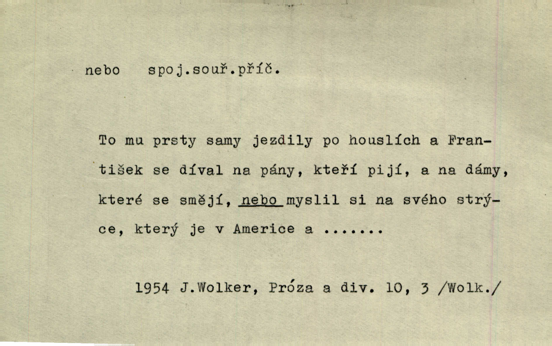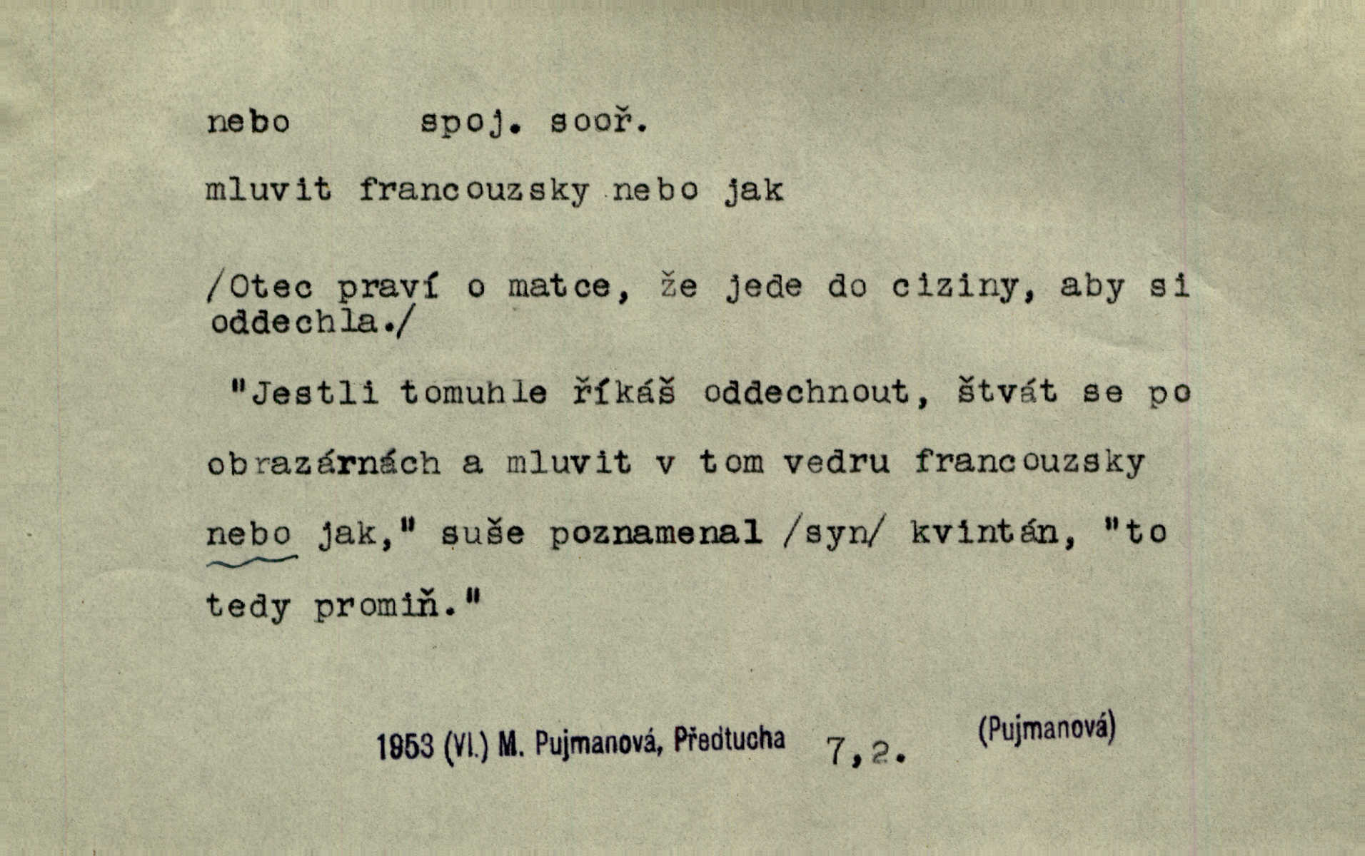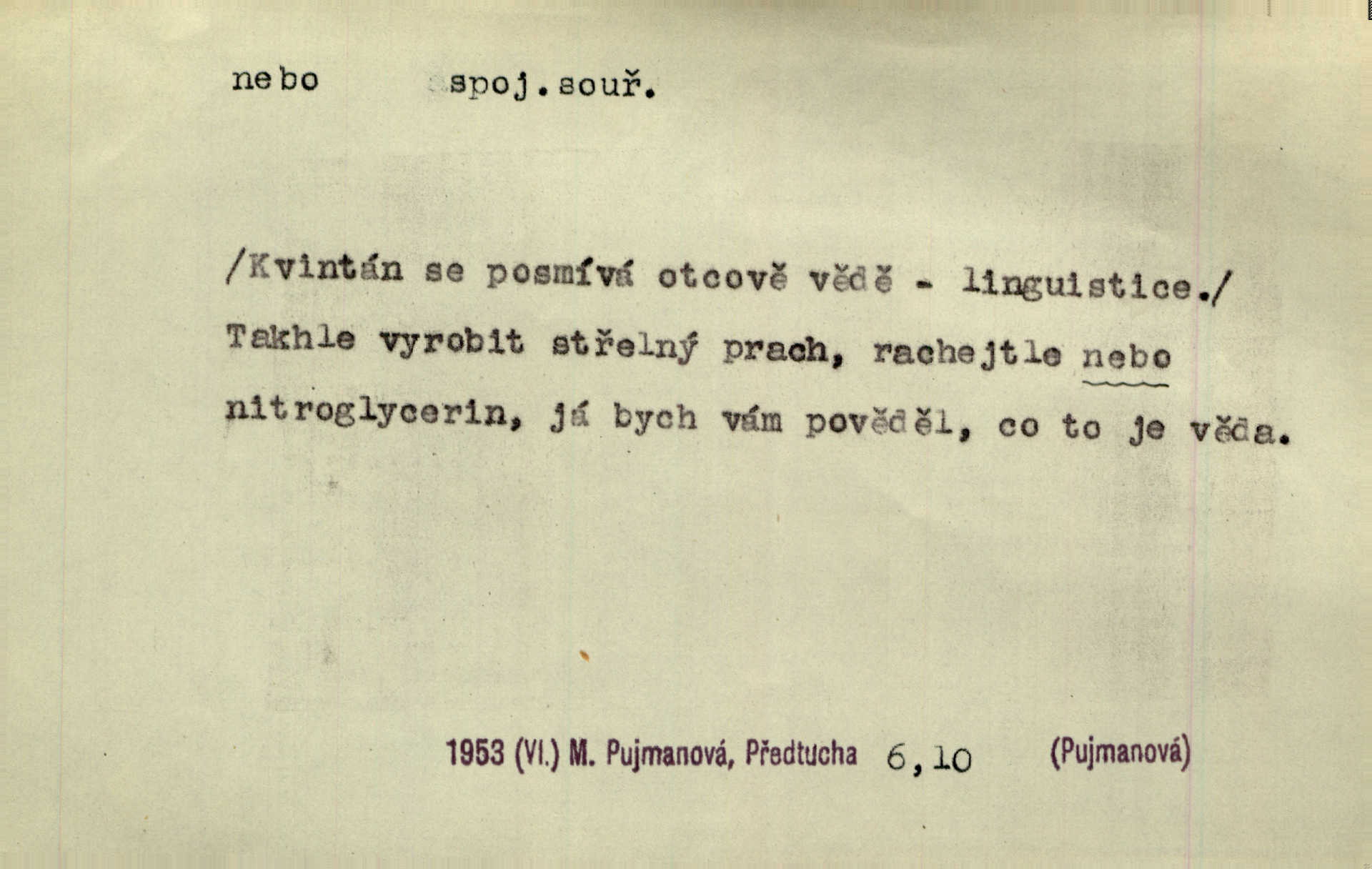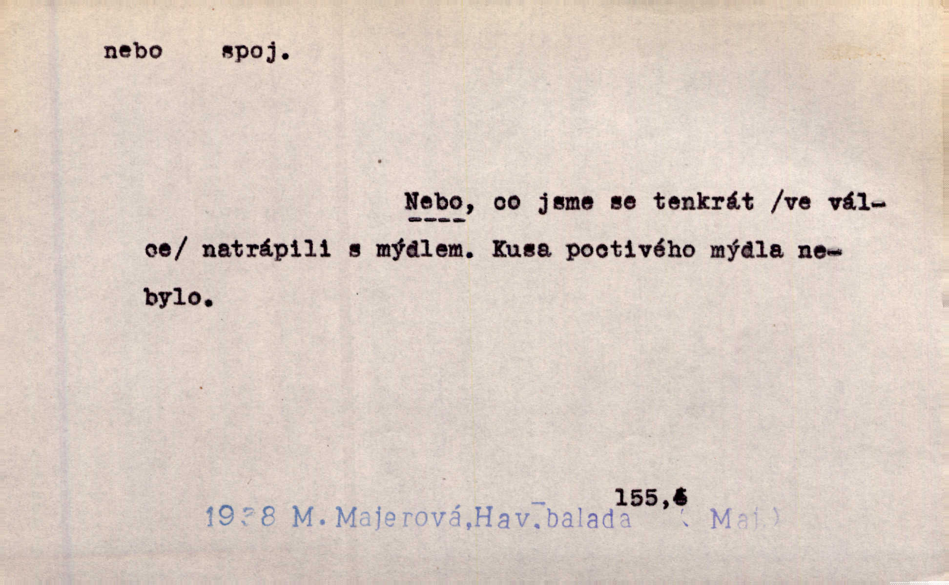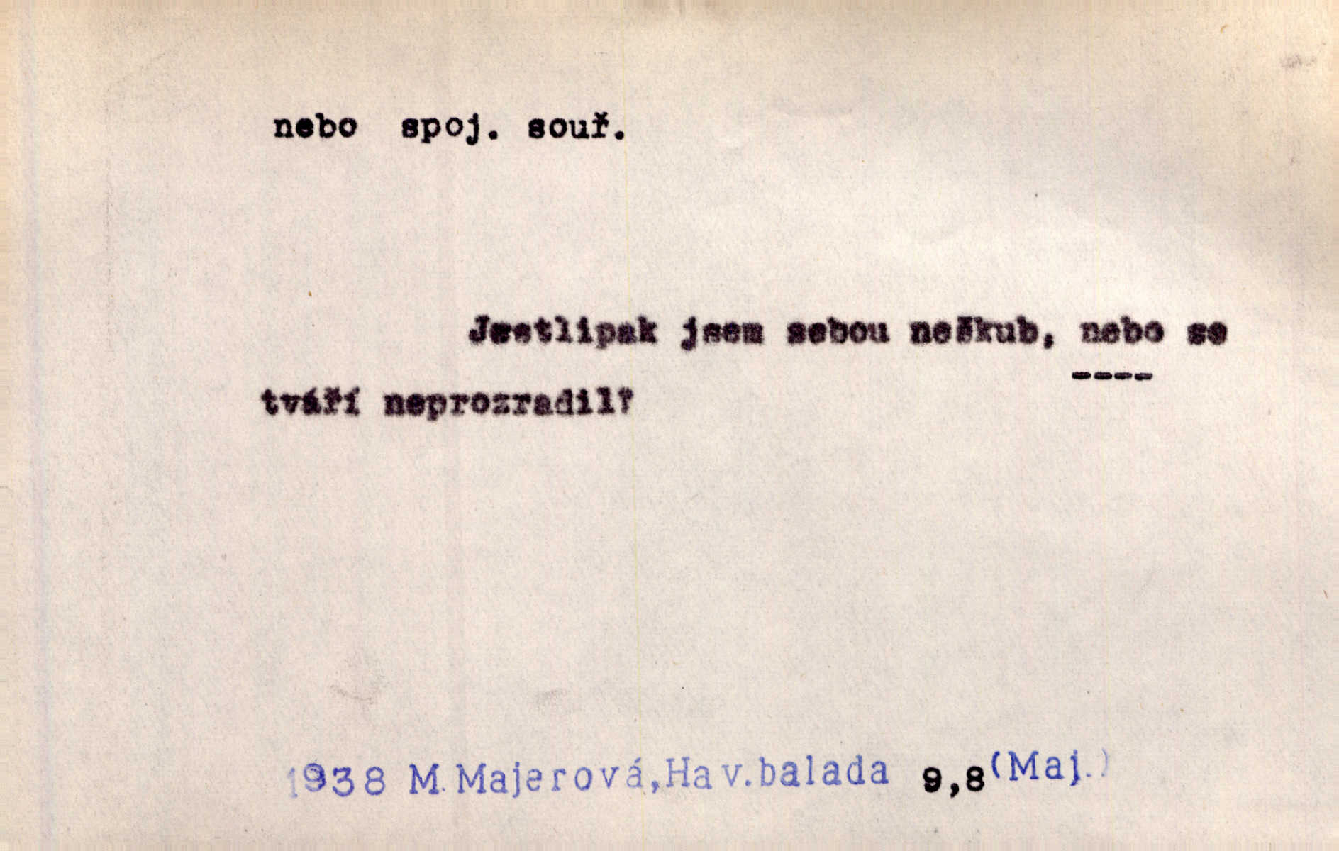 - nebo sp. vyjadřující rozmanitou míru rozlučovací (od libovolnosti do neslučitelnosti) druhé části rozšířeného členu větného n. druhé věty (též ve dvoučlenné otázce n. ve dvoučlenném přípustkovém spojení), neb, anebo. Tu tam v brambořišti nebo v řepě bělal se šátek nebo jupka. Rais. Padni oko nebo zub, já od tebe neupustím. Šmil. Myslí si, jak sama dřív nebo později bude taky tátu vypravovat. Rais. Začasté chodila babička s dětmi na delší procházky, třebas do myslivny, nebo do mlýna, nebo si zašly do lesa. Něm. Spíš, má panenko, nebo bdíš? či. Erb. Proč nechává mne tu sedět samotného? Anebo něco píše? Nebo snad mne nerad vidí? Šim. Nerozeznával, je-li to hrubiánství nebo žert. R. Svob. Ďas ví, jak se stalo, zdali vlastní nemotorností nebo zlomyslností nějakého tanečníka, Doubenus se svalil. Jir. Kdykoli přišel dědek s kolovrátkem, Matěj musil do kola, ať to bylo v stodole, nebo ve světnici. Prav. Oddával se obžerství i chlastu, ať bylo v noci nebo ve dne. Herrm. Ráno král Václav, nebo jak jej Pražané jmenují, lenivý Václav odsoudí, kdo se mu vinným býti třeba jen zdá neboli. Mácha. Ten člověk buď nás má za hotové blázny, nebo sám je blázen. Svět. Arch. Namluvil Benedu, aby se do Míšně obrátil, očekávaje, až ho nebo on, nebo Vratislav sám zavolá. Tyl. Nuž, Strakoši, koníku můj hbitý, nebo nyní, koni, aneb nikdy! Hol. D jinak, v opačném případě, v obráceném případě. Utíkej, nebo ti jich několik vlepím. Tyl. Jenom teď Pánbíček nedej zlé deště, nebo nám brambory začnou černat. Rais. Dejte mně dva loty [kávy] — ale dobré, nebo jsem tu posledně. Herrm. Nešahej na mě, nebo! — Já půjdu sám! Jir. D sp. dův. neboť. Tkanička více slyšel nežli viděl, nebo mu již přecházel zrak. Jir. Šenkýři ho [harfenistu] viděli velmi rádi, nebo, kdekoliv se usadil, přišlo za ním vždy dosti lidí. Ner. V tom vkročil mladý pán do dveří; nebo tenkráte nebyly ještě žádné závory a zámky. Něm.