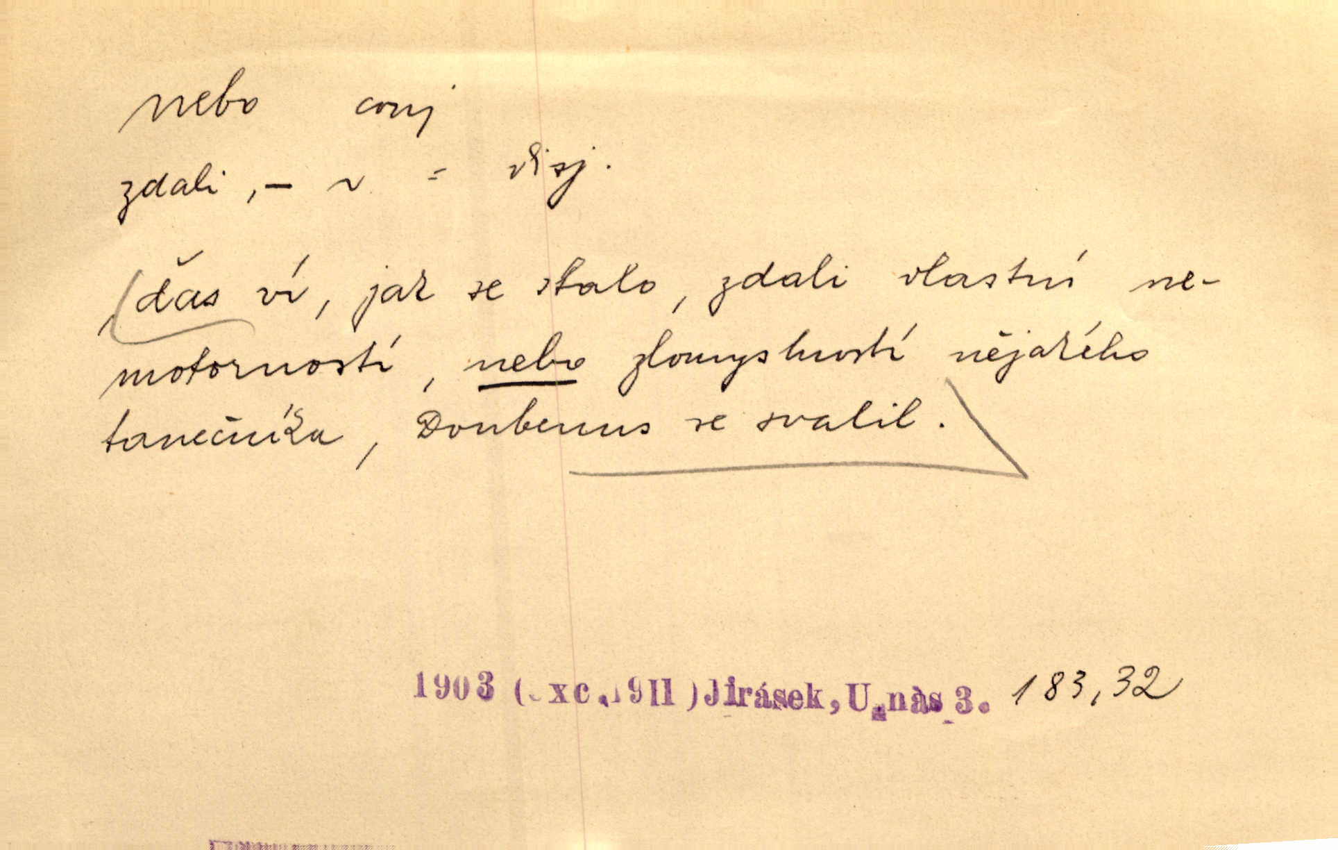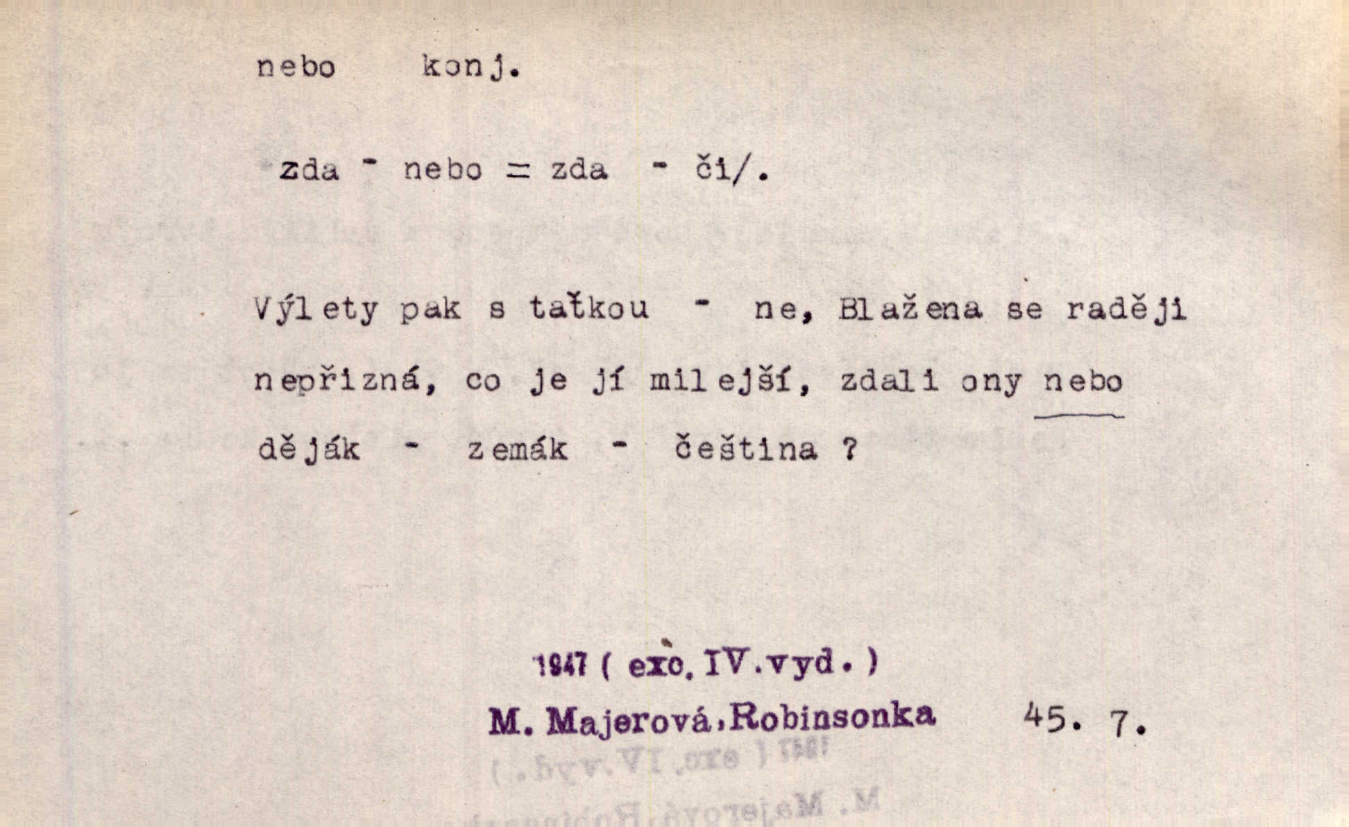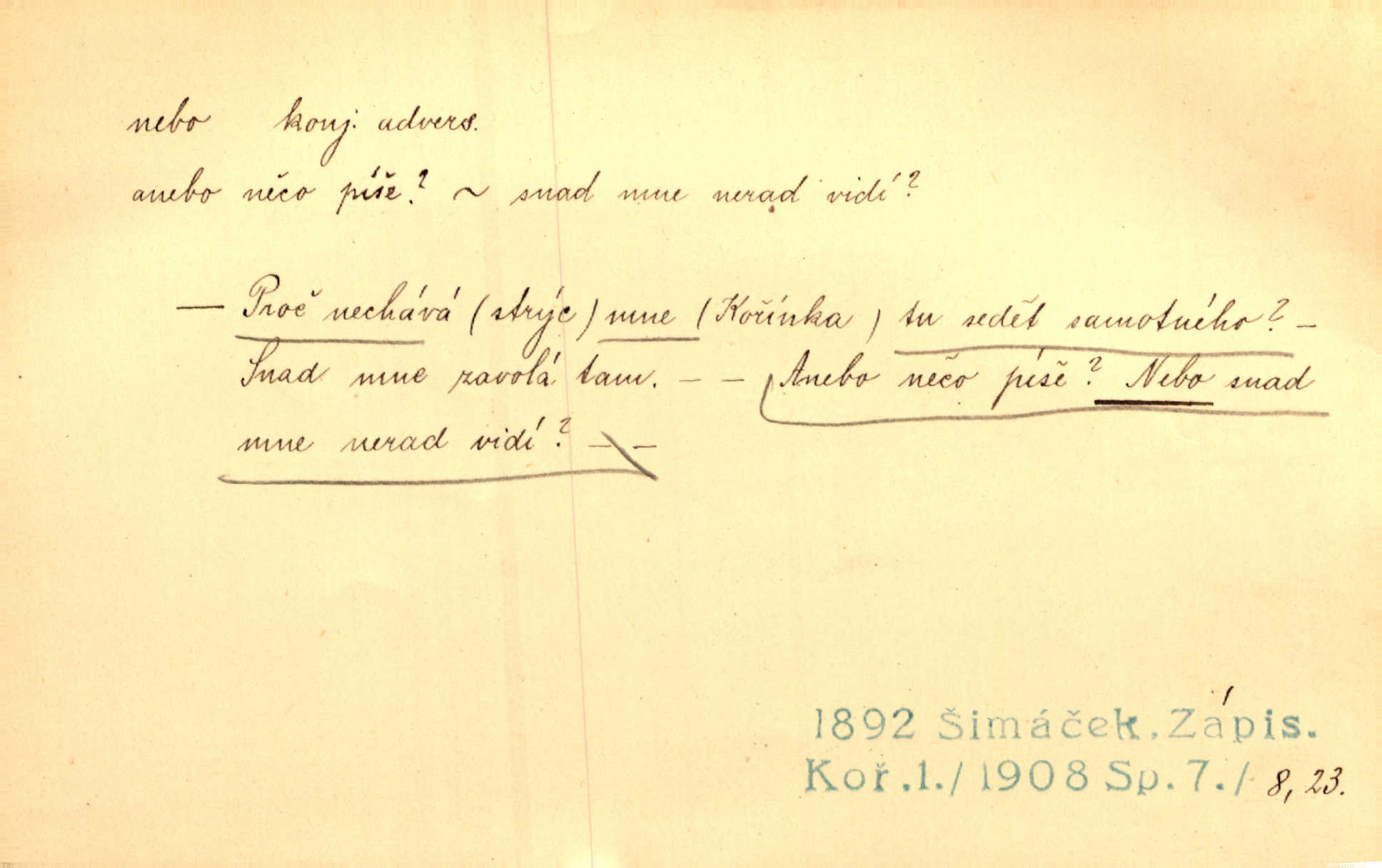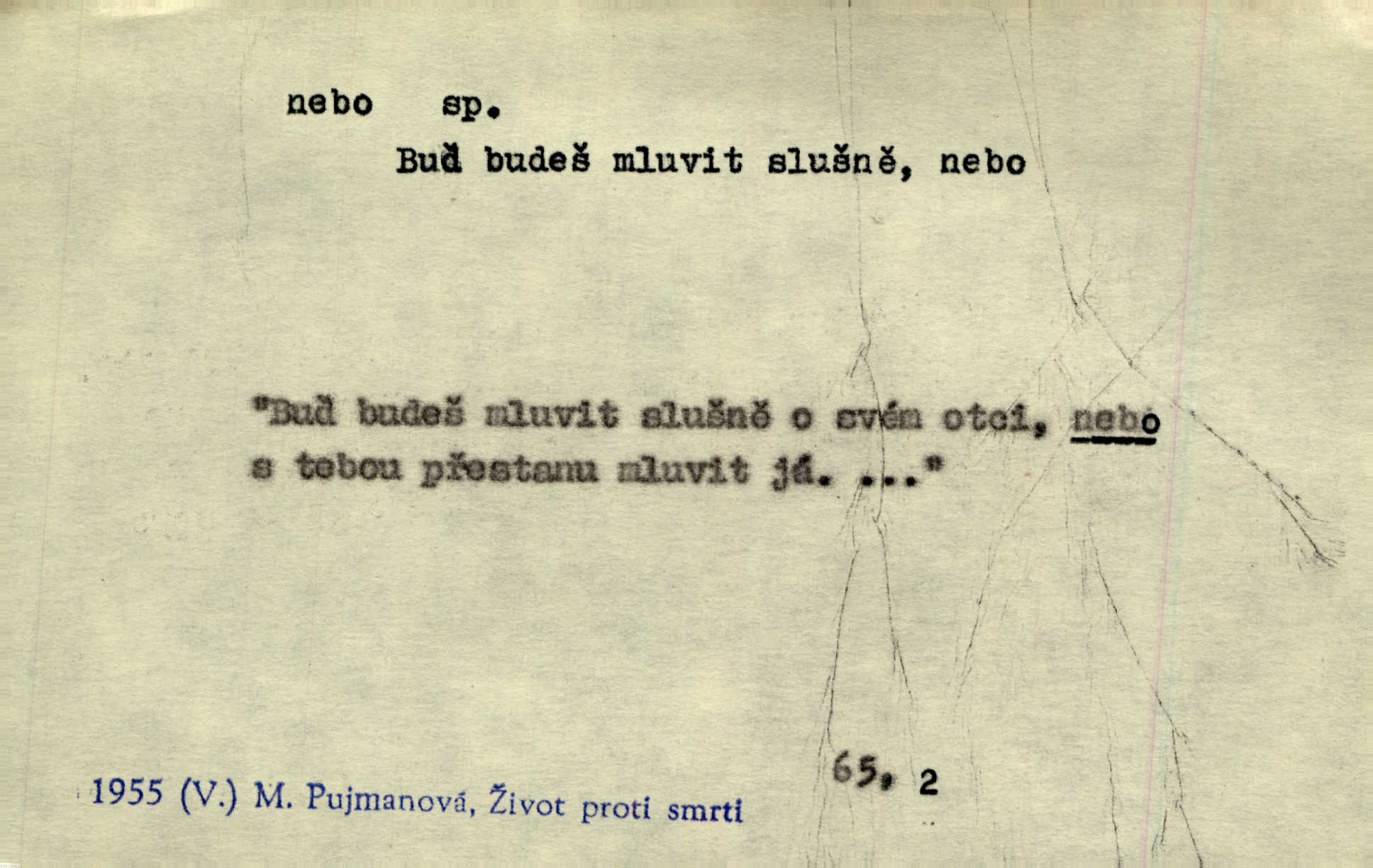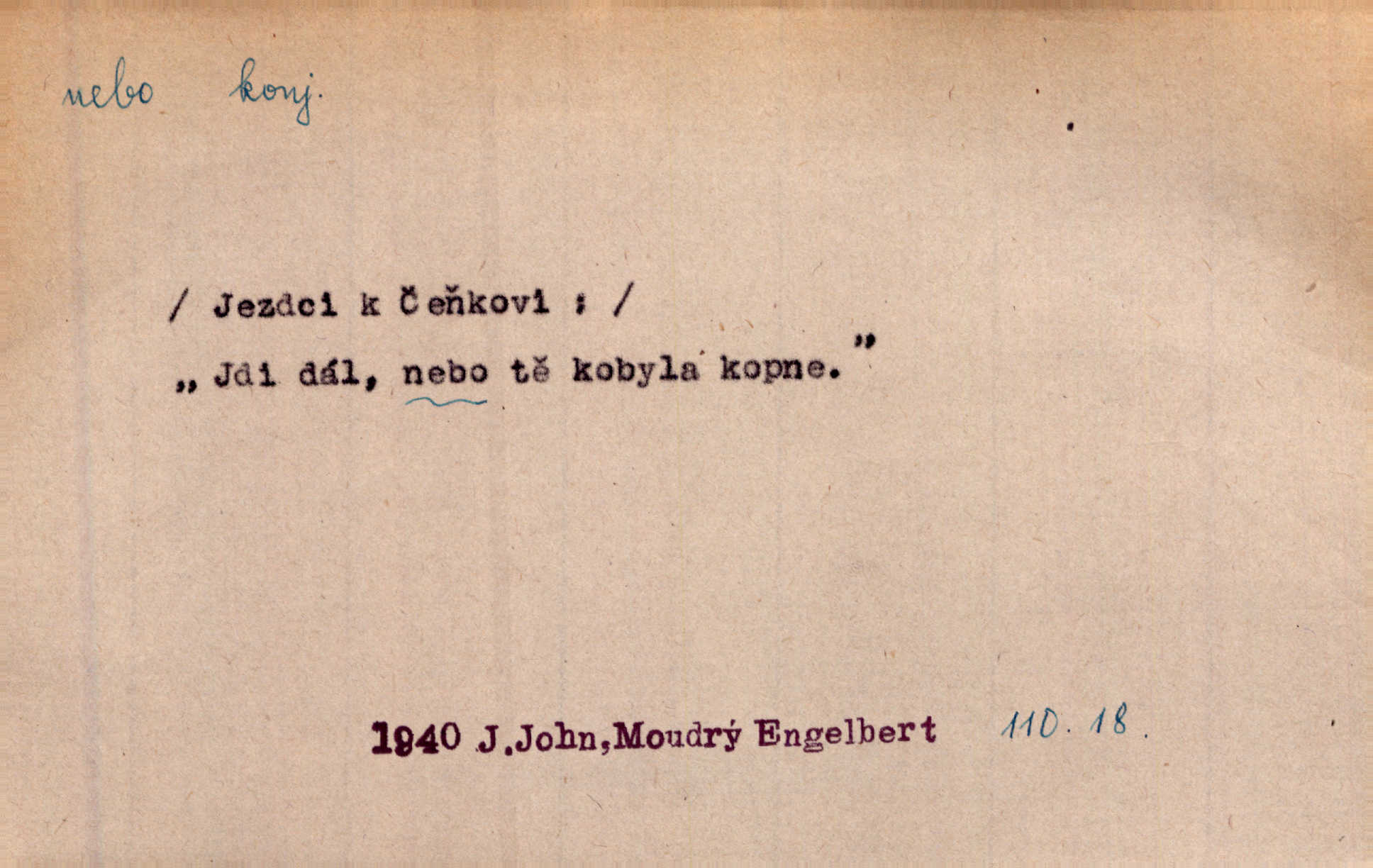 - nebo sp. vyjadřující rozmanitou míru rozlučovací (od libovolnosti do neslučitelnosti) druhé části rozšířeného členu větného n. druhé věty (též ve dvoučlenné otázce n. ve dvoučlenném přípustkovém spojení), neb, anebo. Tu tam v brambořišti nebo v řepě bělal se šátek nebo jupka. Rais. Padni oko nebo zub, já od tebe neupustím. Šmil. Myslí si, jak sama dřív nebo později bude taky tátu vypravovat. Rais. Začasté chodila babička s dětmi na delší procházky, třebas do myslivny, nebo do mlýna, nebo si zašly do lesa. Něm. Spíš, má panenko, nebo bdíš? či. Erb. Proč nechává mne tu sedět samotného? Anebo něco píše? Nebo snad mne nerad vidí? Šim. Nerozeznával, je-li to hrubiánství nebo žert. R. Svob. Ďas ví, jak se stalo, zdali vlastní nemotorností nebo zlomyslností nějakého tanečníka, Doubenus se svalil. Jir. Kdykoli přišel dědek s kolovrátkem, Matěj musil do kola, ať to bylo v stodole, nebo ve světnici. Prav. Oddával se obžerství i chlastu, ať bylo v noci nebo ve dne. Herrm. Ráno král Václav, nebo jak jej Pražané jmenují, lenivý Václav odsoudí, kdo se mu vinným býti třeba jen zdá neboli. Mácha. Ten člověk buď nás má za hotové blázny, nebo sám je blázen. Svět. Arch. Namluvil Benedu, aby se do Míšně obrátil, očekávaje, až ho nebo on, nebo Vratislav sám zavolá. Tyl. Nuž, Strakoši, koníku můj hbitý, nebo nyní, koni, aneb nikdy! Hol. D jinak, v opačném případě, v obráceném případě. Utíkej, nebo ti jich několik vlepím. Tyl. Jenom teď Pánbíček nedej zlé deště, nebo nám brambory začnou černat. Rais. Dejte mně dva loty [kávy] — ale dobré, nebo jsem tu posledně. Herrm. Nešahej na mě, nebo! — Já půjdu sám! Jir. D sp. dův. neboť. Tkanička více slyšel nežli viděl, nebo mu již přecházel zrak. Jir. Šenkýři ho [harfenistu] viděli velmi rádi, nebo, kdekoliv se usadil, přišlo za ním vždy dosti lidí. Ner. V tom vkročil mladý pán do dveří; nebo tenkráte nebyly ještě žádné závory a zámky. Něm.