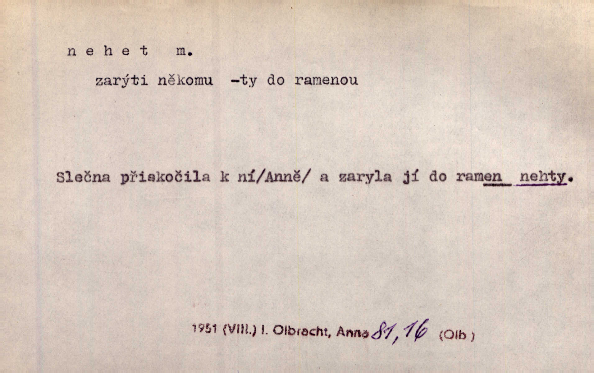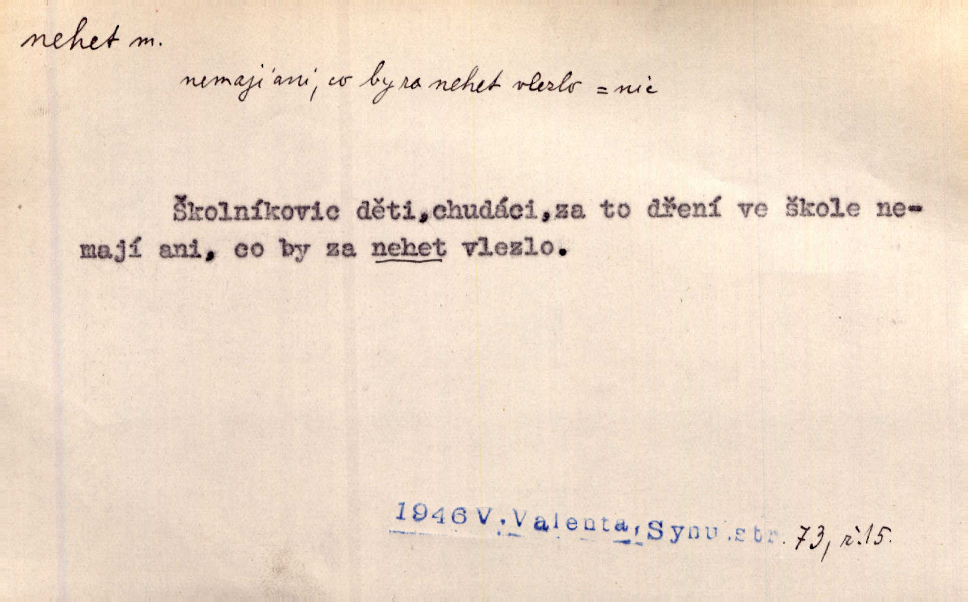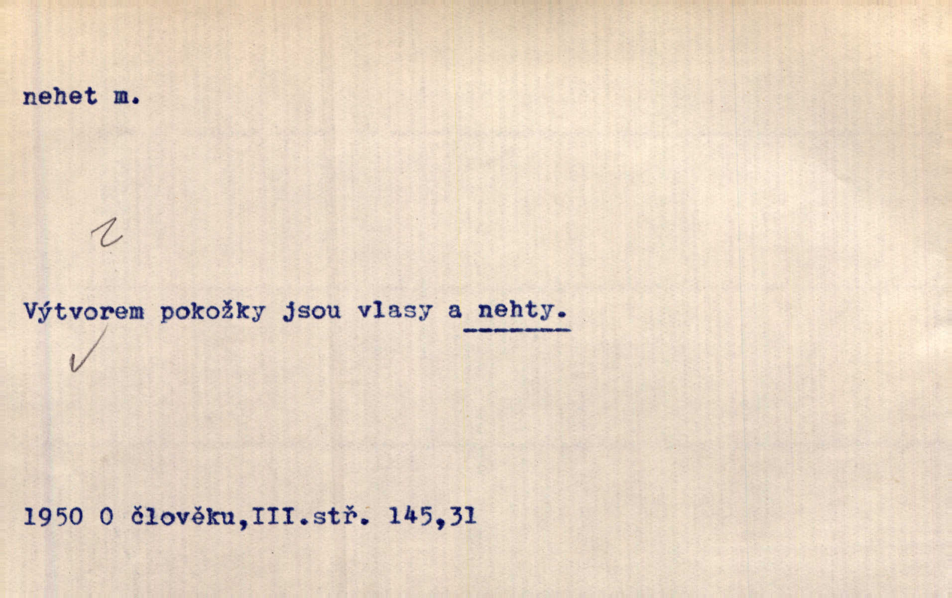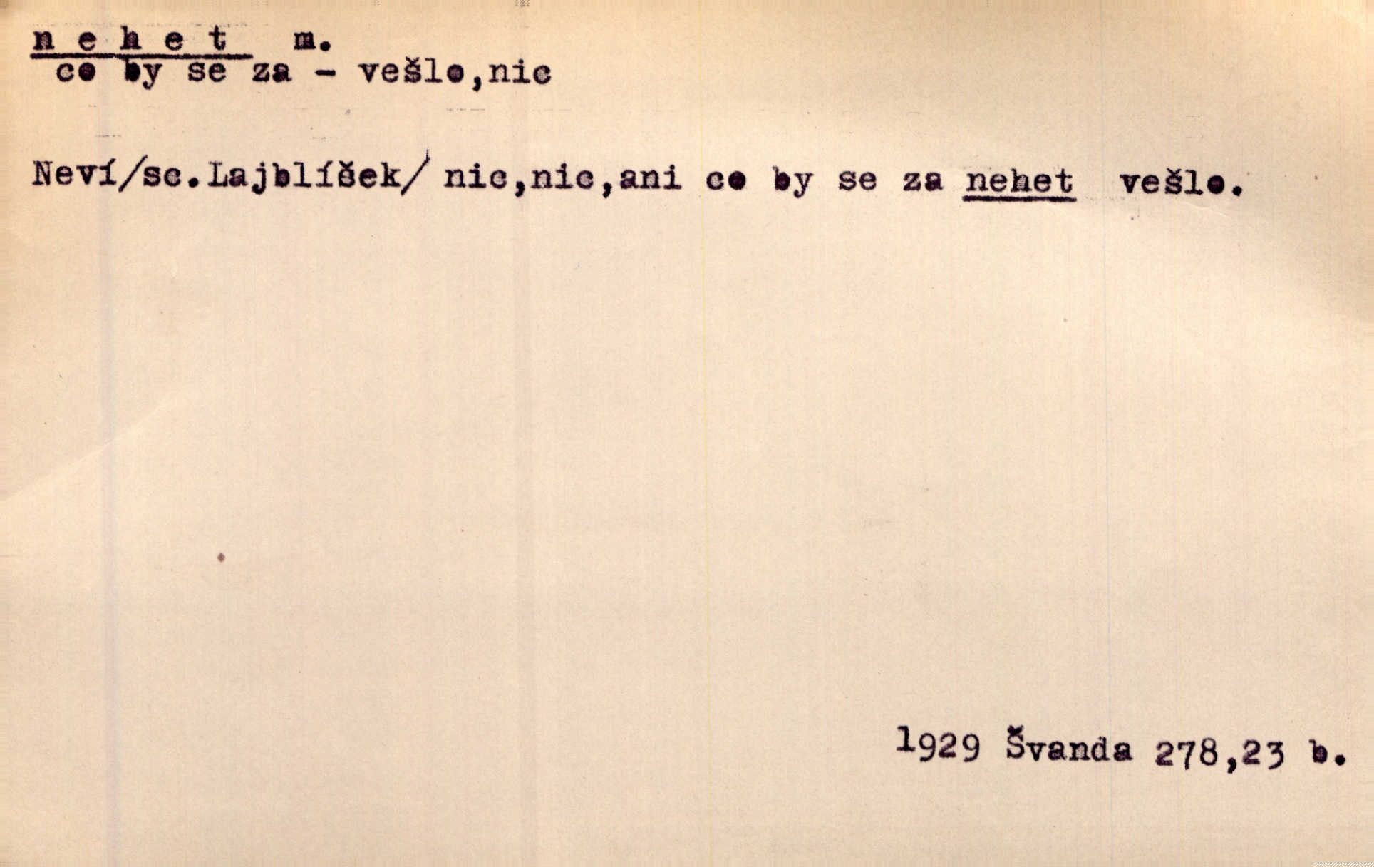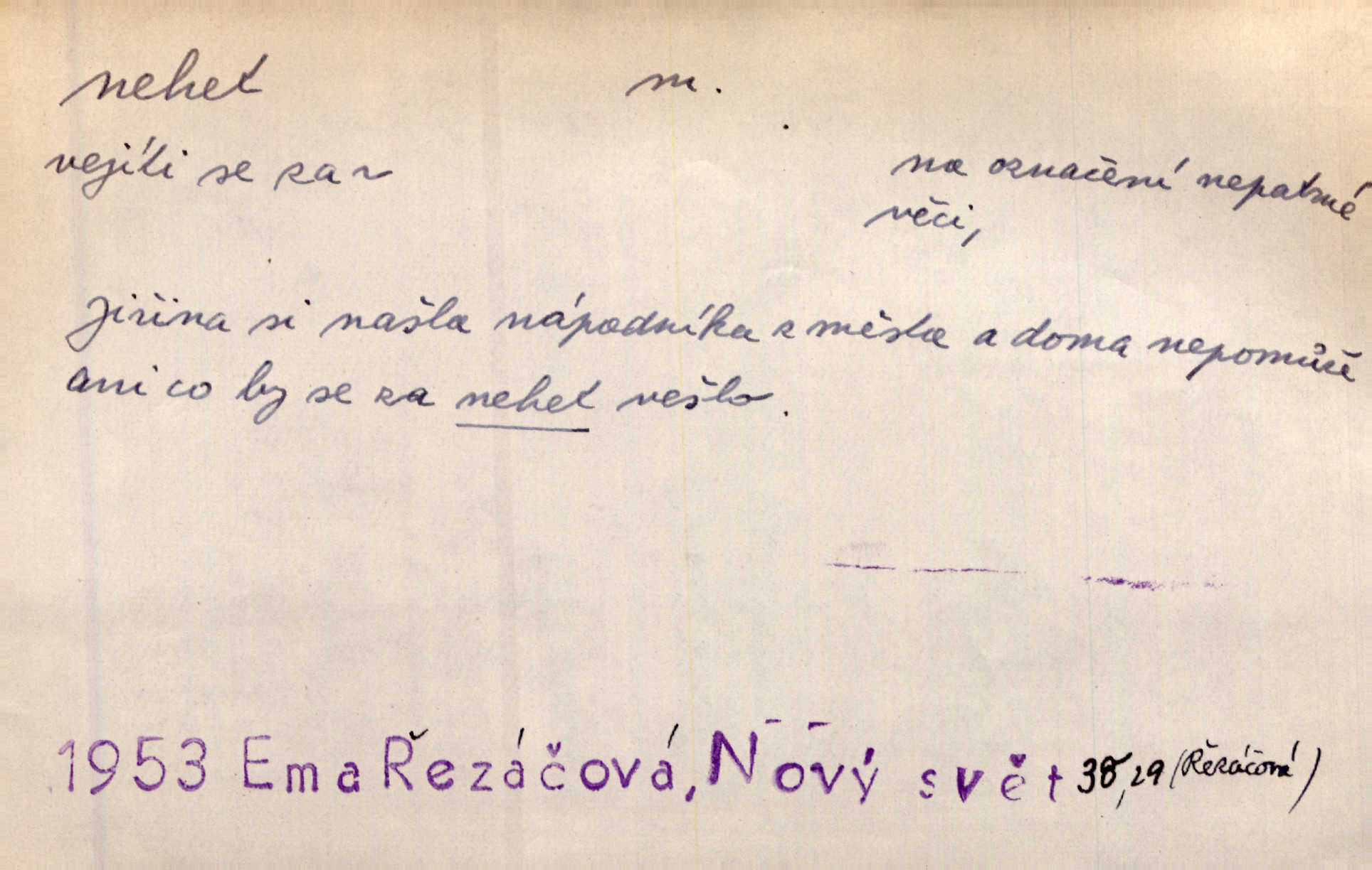 - nehet, -htu m. zrohovatělá ploténka pokožky na konečných článcích prstů. Piloval i soustruhoval nehty. Herrm. Růžový nehet krásně opalisuje v lesku slunce. Mach. Zbaven [vězeň] denní záře, rve si šedé vlasy, nehtem ryje tváře. Čech. Ustál. sp. Na těch cestách [do školy v zimě] mráz pálíval, zalézalo za nehty. Rais. [Úkol kritikův v novinách je] nepříjemná historie, která tě znepřáteluje kde s kým a zadírá se ti zatrachtile za nehty působí nesnáze, nepříjemnosti. Šal. „Kronika z konce tisíciletí“ je několik smyslných erotických avantýr mladého Alberta, z nichž teprve poslední, Bertina, jde mu hlouběji za nehty působí silněji. Šal. Je to [na panském] jako při císařské službě: každému zůstane něco za nehty, za velkými mnoho, za malými málo každý si něco nechá, zpronevěří, ukradne. Hol. Máš ty dlúhé nehty, dyž se ti za něma třicet rynských zadrhne ukradneš je. Herb. Byli obžalováni, že za války za nehty si nechali několik set zlatých zpronevěřili, ukradli. Hol. Vy [sedláci] budete míti taková práva jako před 200 lety a musíte se jich držeti zuby nehty vší mocí, všemožně. Herb. Měl pověst člověka tvrdošijného, jenž zuby nehty drží se toho, co si jednou usmyslil úporně, svéhlavě. Čech. [Purkmistr] byl muž plný síly a při tom do nehtu prolinulý důvěrou v tajemníka docela. Štech. Vzal jsem já vám někdy, co by za nehet vlezlo? třeba jen nějakou maličkost, vůbec něco. Herb. Nese [chuďas v chumelenici] otýpku klestí. Patrně nasadil život, aby si vypůjčil za nehet tepla trošku. Lier. Česká hospodyně může bědovat, že nemá doma „ani náprstek vody“ a „ani za nehet mouky“ vůbec žádnou mouku. Ner. Na tom [klepu] není pravdy, ani co by se za nehet vešlo vůbec žádná pravda. Stank. Nemohla míti za nehet pochybnosti o jejím původu. Herrm. D Slang. štítek čepice. Měl čepici placatou, s obrovským nehtem a s kostkou. Přít. Muž v čepici s „nehtem“. Maj. Kameník popotáhl nehet čepice na stranu. Nový. A nyní ještě štítek, chránící oči před sluncem a ve vojenské hantýrce nehet zvaný, se k čapce našije. Kop. D Zool. rohovitá šupina na zobáku. Bot. dolejší vzpřímená a zúžená část korunního plátku. D Dial. dobytčí nemoc projevující se na sliznici jazyka. Má-li nehet která kráva, ať se jí blínové semeno dává. Hol.
