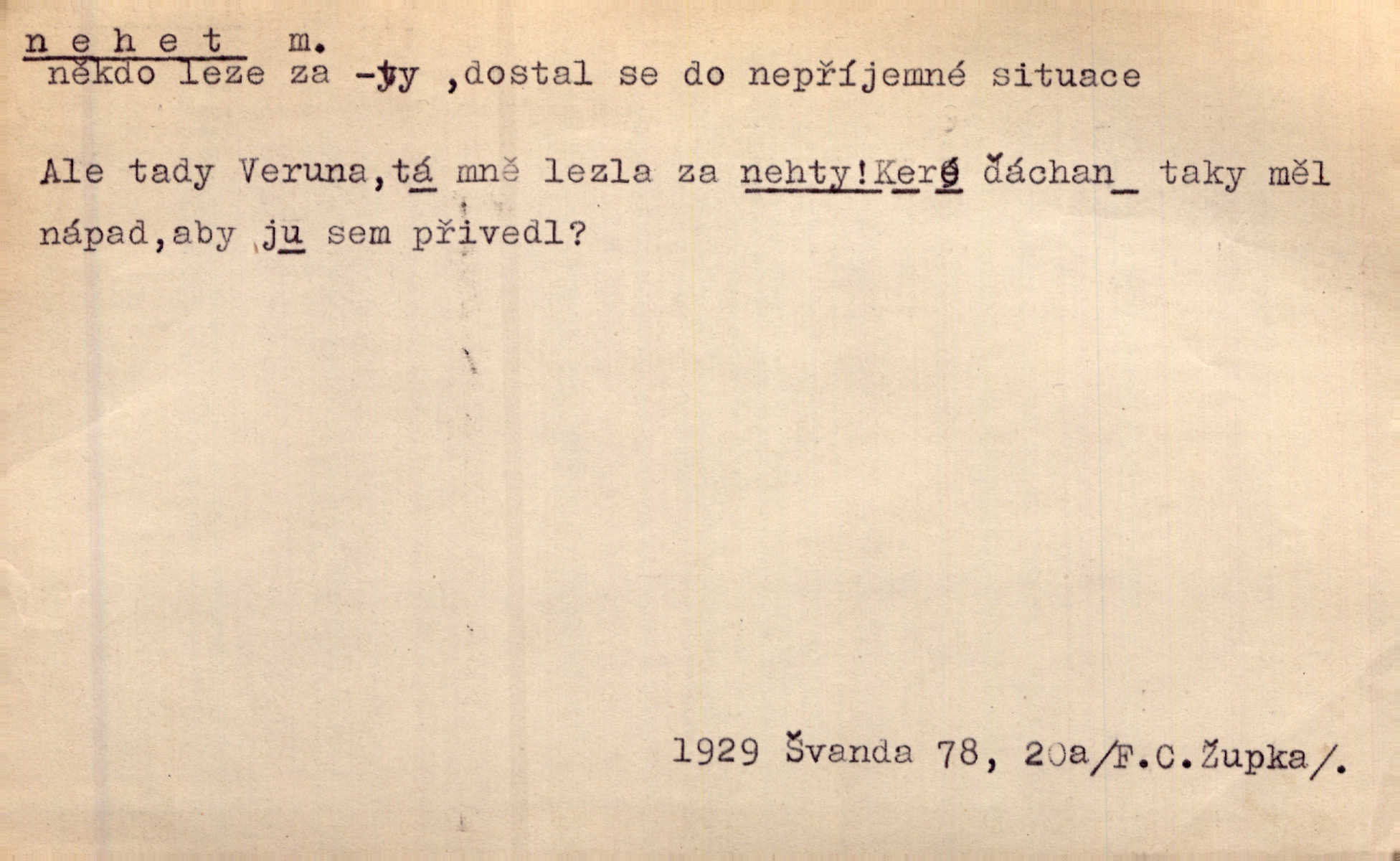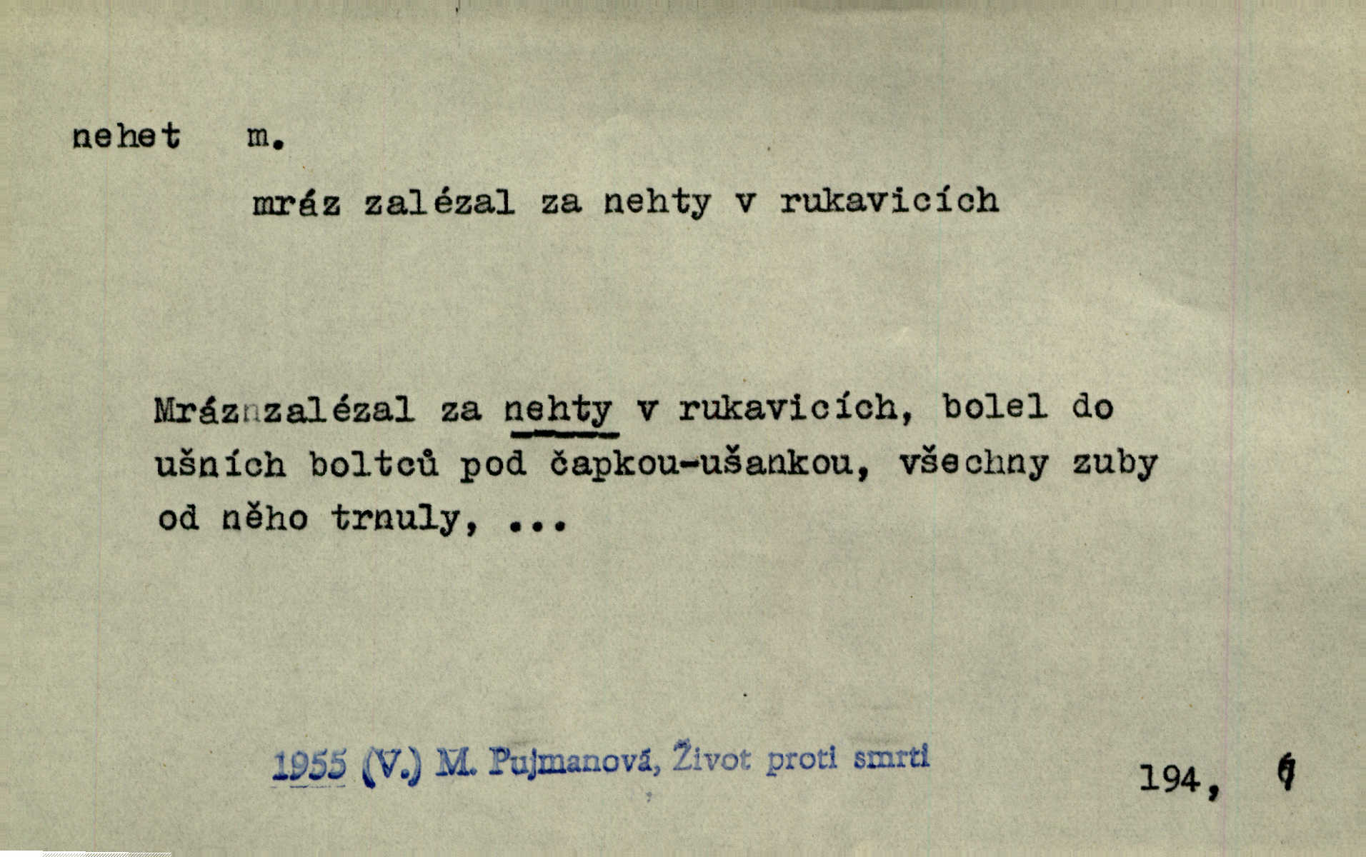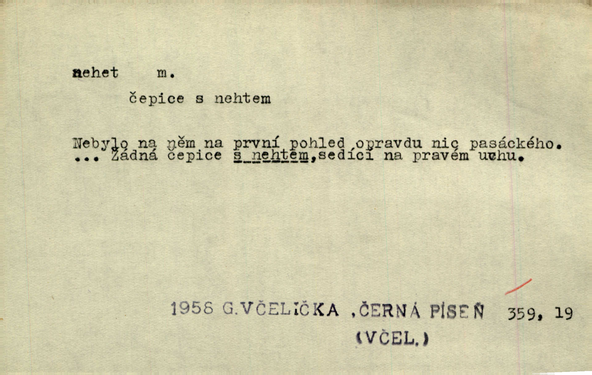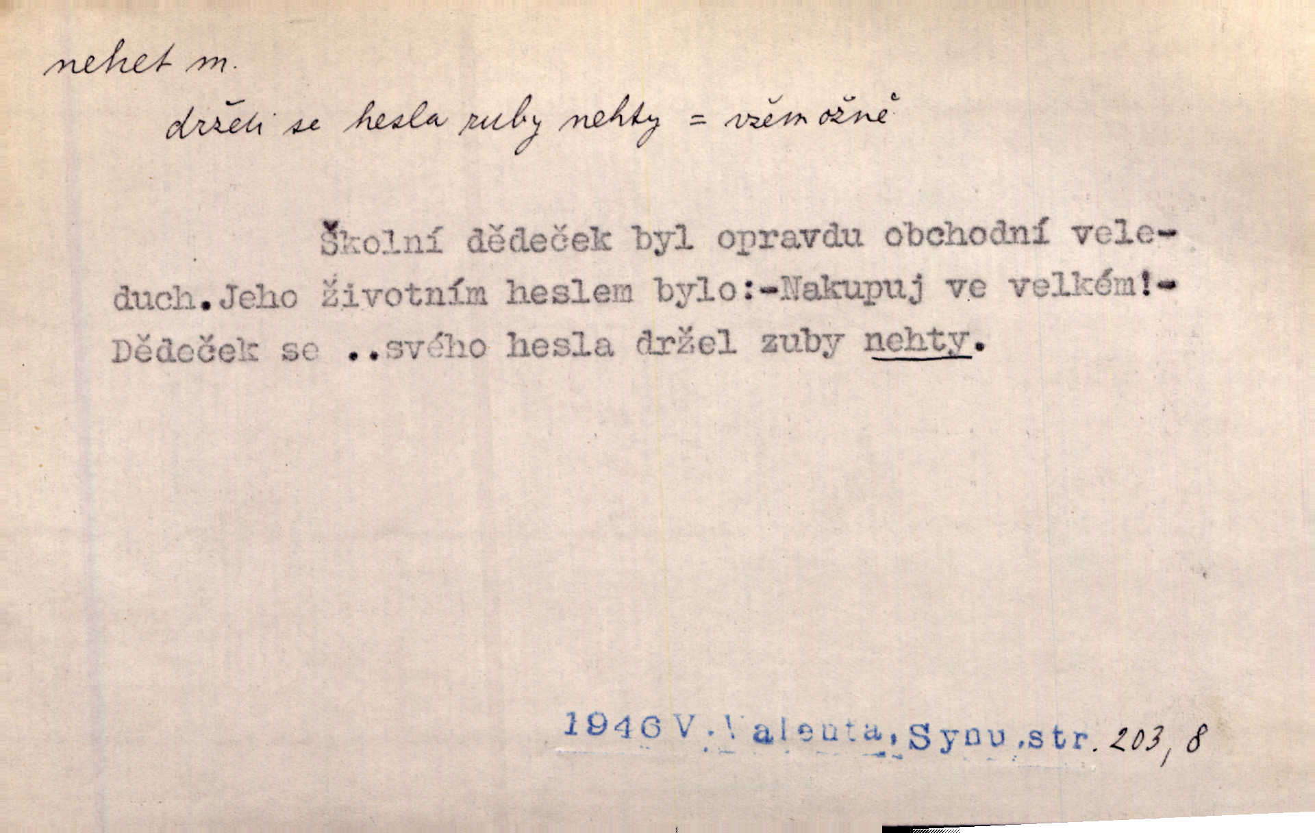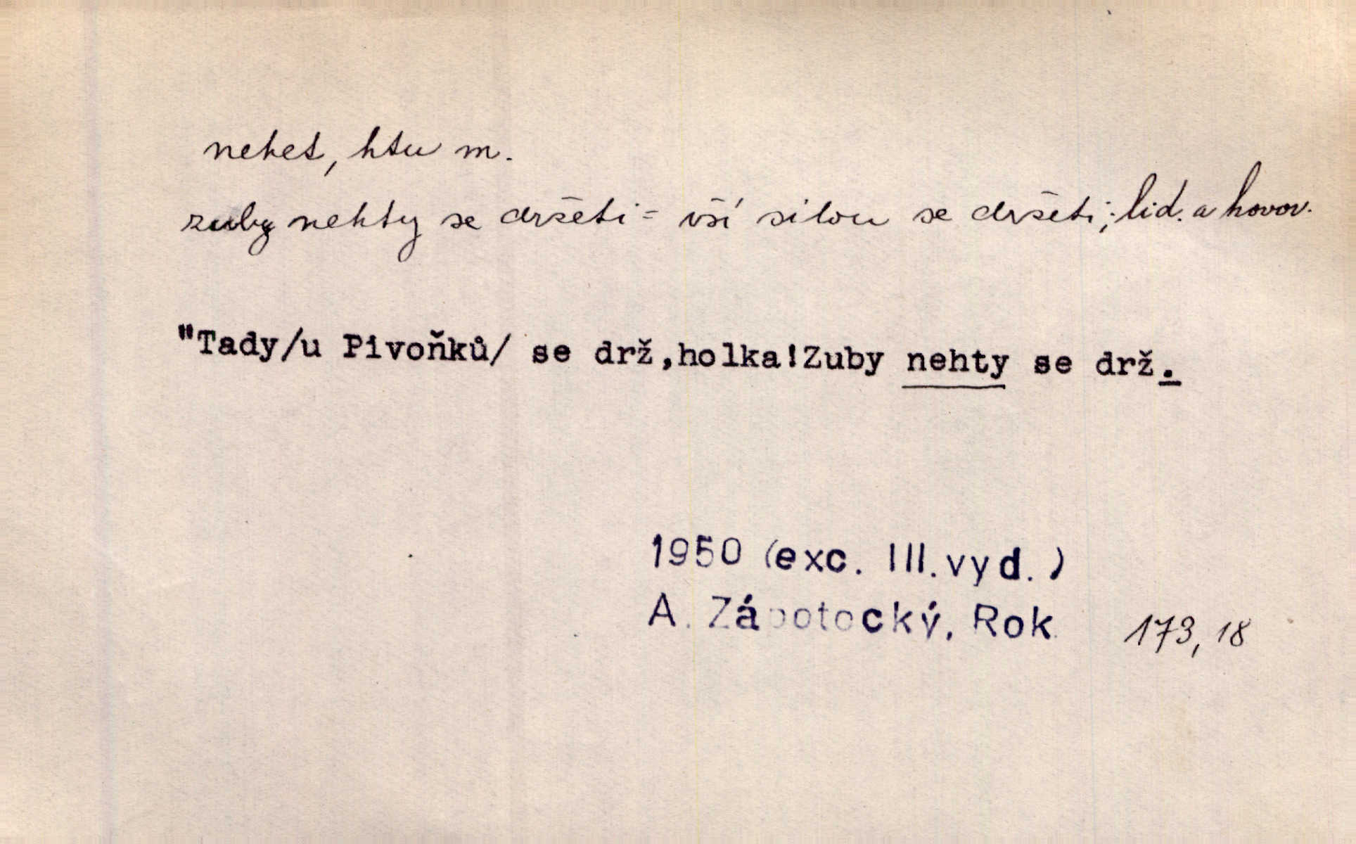 - nehet, -htu m. zrohovatělá ploténka pokožky na konečných článcích prstů. Piloval i soustruhoval nehty. Herrm. Růžový nehet krásně opalisuje v lesku slunce. Mach. Zbaven [vězeň] denní záře, rve si šedé vlasy, nehtem ryje tváře. Čech. Ustál. sp. Na těch cestách [do školy v zimě] mráz pálíval, zalézalo za nehty. Rais. [Úkol kritikův v novinách je] nepříjemná historie, která tě znepřáteluje kde s kým a zadírá se ti zatrachtile za nehty působí nesnáze, nepříjemnosti. Šal. „Kronika z konce tisíciletí“ je několik smyslných erotických avantýr mladého Alberta, z nichž teprve poslední, Bertina, jde mu hlouběji za nehty působí silněji. Šal. Je to [na panském] jako při císařské službě: každému zůstane něco za nehty, za velkými mnoho, za malými málo každý si něco nechá, zpronevěří, ukradne. Hol. Máš ty dlúhé nehty, dyž se ti za něma třicet rynských zadrhne ukradneš je. Herb. Byli obžalováni, že za války za nehty si nechali několik set zlatých zpronevěřili, ukradli. Hol. Vy [sedláci] budete míti taková práva jako před 200 lety a musíte se jich držeti zuby nehty vší mocí, všemožně. Herb. Měl pověst člověka tvrdošijného, jenž zuby nehty drží se toho, co si jednou usmyslil úporně, svéhlavě. Čech. [Purkmistr] byl muž plný síly a při tom do nehtu prolinulý důvěrou v tajemníka docela. Štech. Vzal jsem já vám někdy, co by za nehet vlezlo? třeba jen nějakou maličkost, vůbec něco. Herb. Nese [chuďas v chumelenici] otýpku klestí. Patrně nasadil život, aby si vypůjčil za nehet tepla trošku. Lier. Česká hospodyně může bědovat, že nemá doma „ani náprstek vody“ a „ani za nehet mouky“ vůbec žádnou mouku. Ner. Na tom [klepu] není pravdy, ani co by se za nehet vešlo vůbec žádná pravda. Stank. Nemohla míti za nehet pochybnosti o jejím původu. Herrm. D Slang. štítek čepice. Měl čepici placatou, s obrovským nehtem a s kostkou. Přít. Muž v čepici s „nehtem“. Maj. Kameník popotáhl nehet čepice na stranu. Nový. A nyní ještě štítek, chránící oči před sluncem a ve vojenské hantýrce nehet zvaný, se k čapce našije. Kop. D Zool. rohovitá šupina na zobáku. Bot. dolejší vzpřímená a zúžená část korunního plátku. D Dial. dobytčí nemoc projevující se na sliznici jazyka. Má-li nehet která kráva, ať se jí blínové semeno dává. Hol.