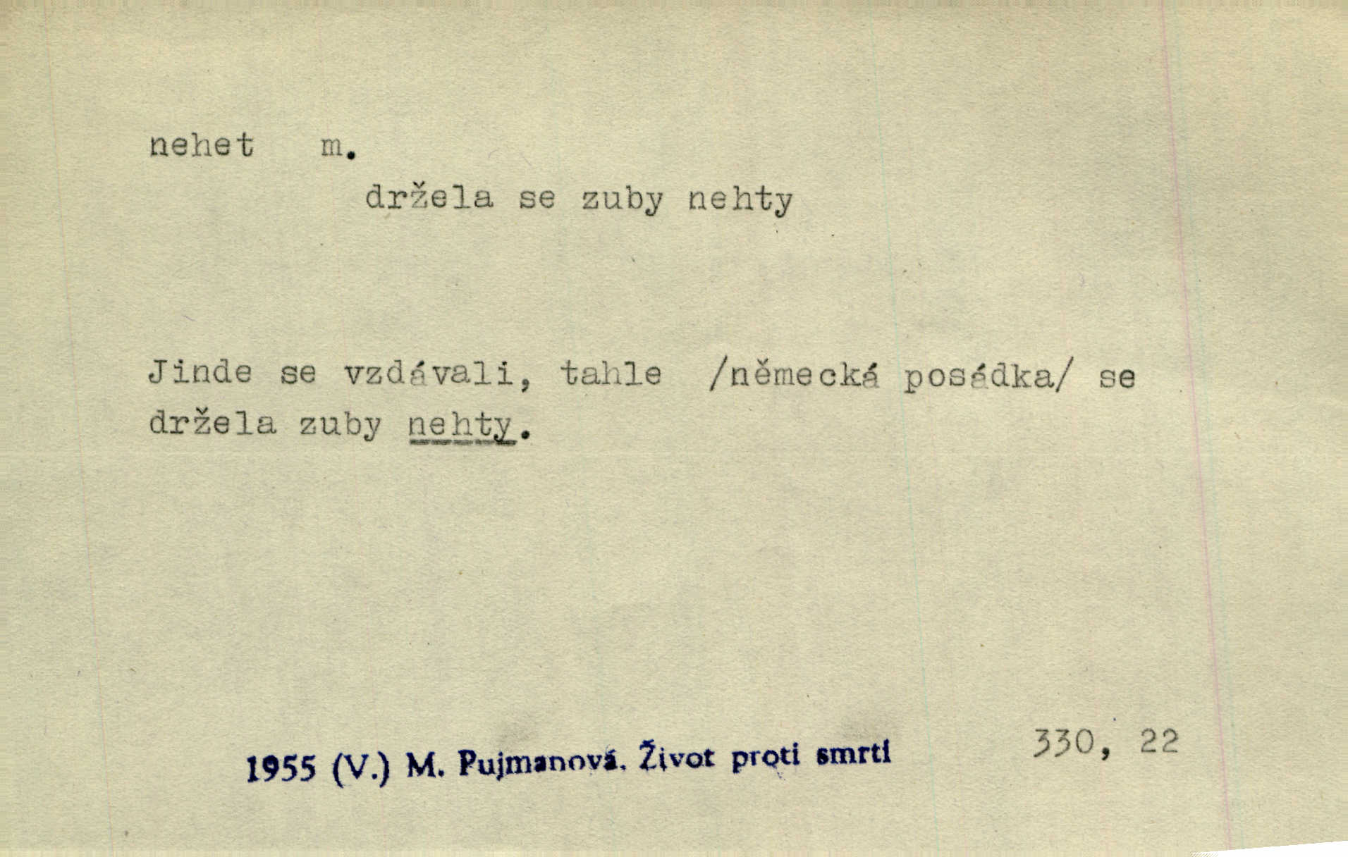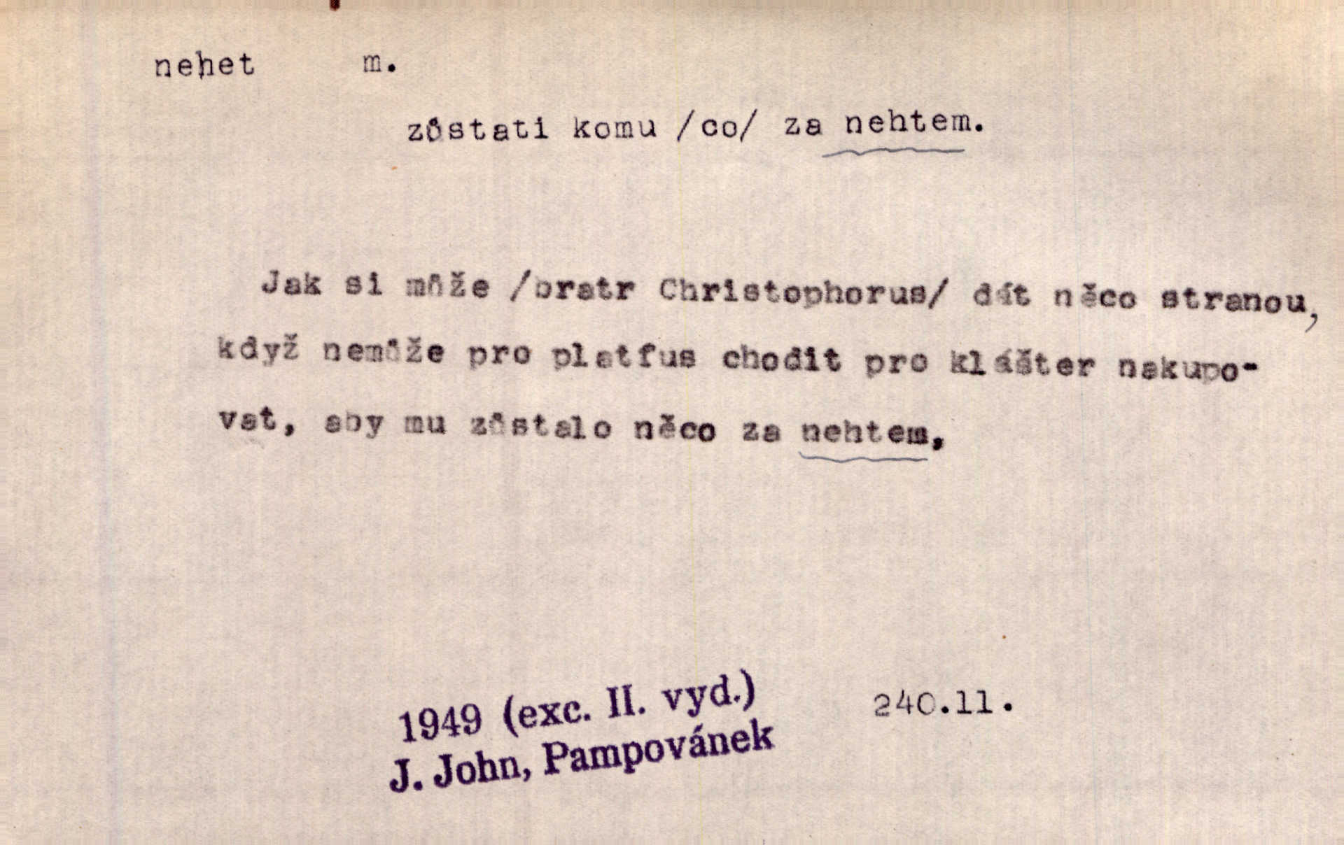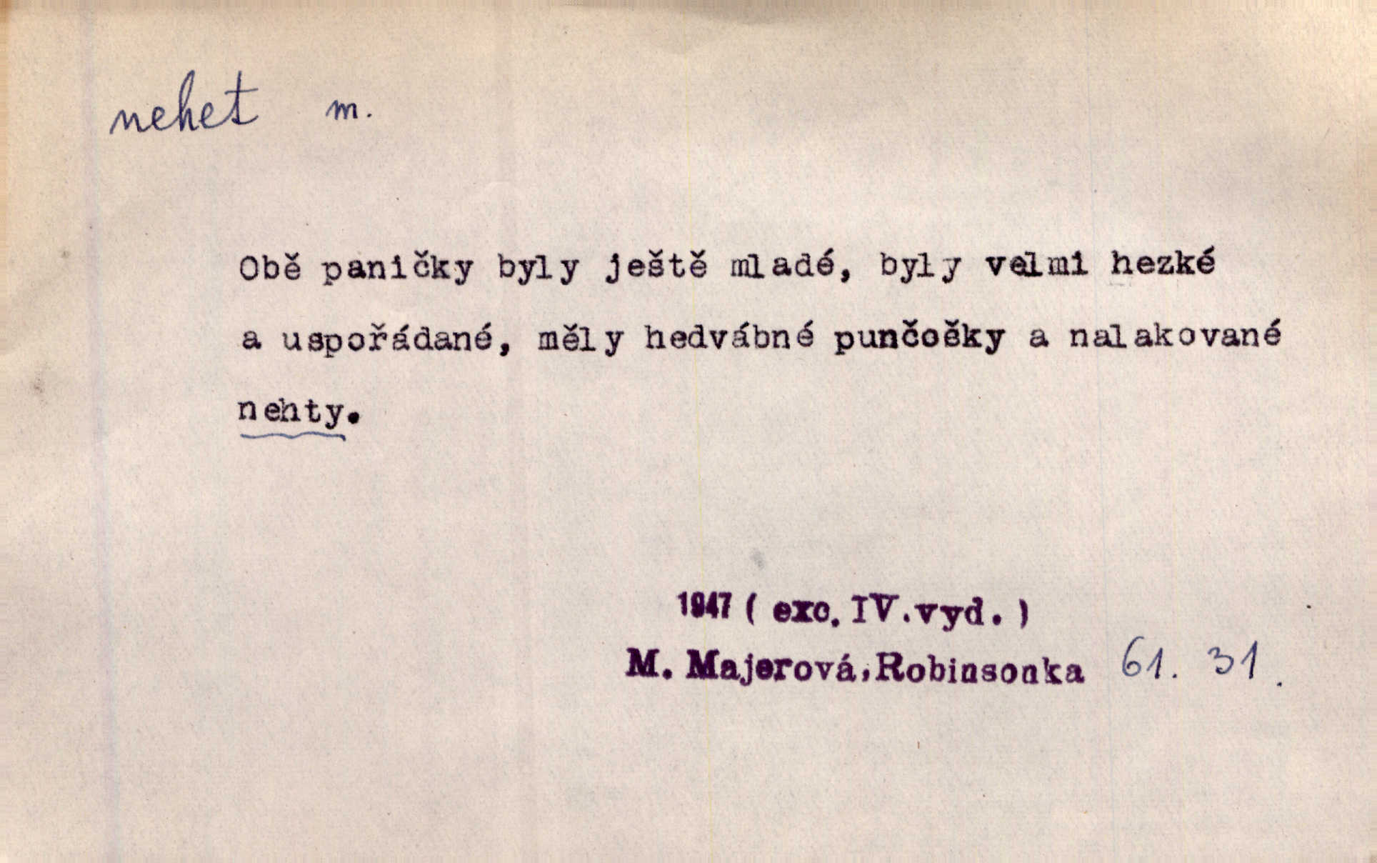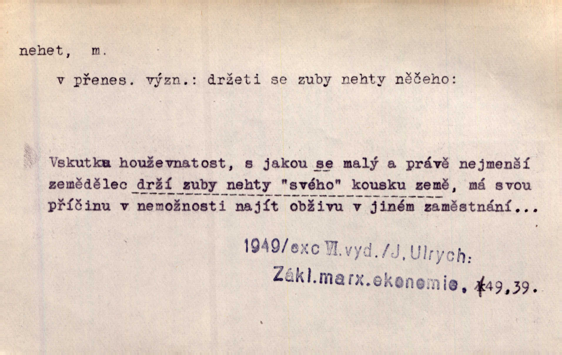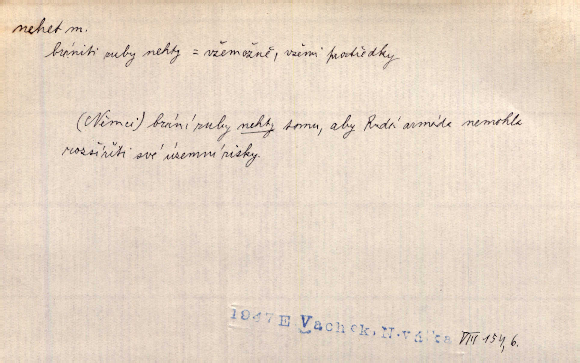 - nehet, -htu m. zrohovatělá ploténka pokožky na konečných článcích prstů. Piloval i soustruhoval nehty. Herrm. Růžový nehet krásně opalisuje v lesku slunce. Mach. Zbaven [vězeň] denní záře, rve si šedé vlasy, nehtem ryje tváře. Čech. Ustál. sp. Na těch cestách [do školy v zimě] mráz pálíval, zalézalo za nehty. Rais. [Úkol kritikův v novinách je] nepříjemná historie, která tě znepřáteluje kde s kým a zadírá se ti zatrachtile za nehty působí nesnáze, nepříjemnosti. Šal. „Kronika z konce tisíciletí“ je několik smyslných erotických avantýr mladého Alberta, z nichž teprve poslední, Bertina, jde mu hlouběji za nehty působí silněji. Šal. Je to [na panském] jako při císařské službě: každému zůstane něco za nehty, za velkými mnoho, za malými málo každý si něco nechá, zpronevěří, ukradne. Hol. Máš ty dlúhé nehty, dyž se ti za něma třicet rynských zadrhne ukradneš je. Herb. Byli obžalováni, že za války za nehty si nechali několik set zlatých zpronevěřili, ukradli. Hol. Vy [sedláci] budete míti taková práva jako před 200 lety a musíte se jich držeti zuby nehty vší mocí, všemožně. Herb. Měl pověst člověka tvrdošijného, jenž zuby nehty drží se toho, co si jednou usmyslil úporně, svéhlavě. Čech. [Purkmistr] byl muž plný síly a při tom do nehtu prolinulý důvěrou v tajemníka docela. Štech. Vzal jsem já vám někdy, co by za nehet vlezlo? třeba jen nějakou maličkost, vůbec něco. Herb. Nese [chuďas v chumelenici] otýpku klestí. Patrně nasadil život, aby si vypůjčil za nehet tepla trošku. Lier. Česká hospodyně může bědovat, že nemá doma „ani náprstek vody“ a „ani za nehet mouky“ vůbec žádnou mouku. Ner. Na tom [klepu] není pravdy, ani co by se za nehet vešlo vůbec žádná pravda. Stank. Nemohla míti za nehet pochybnosti o jejím původu. Herrm. D Slang. štítek čepice. Měl čepici placatou, s obrovským nehtem a s kostkou. Přít. Muž v čepici s „nehtem“. Maj. Kameník popotáhl nehet čepice na stranu. Nový. A nyní ještě štítek, chránící oči před sluncem a ve vojenské hantýrce nehet zvaný, se k čapce našije. Kop. D Zool. rohovitá šupina na zobáku. Bot. dolejší vzpřímená a zúžená část korunního plátku. D Dial. dobytčí nemoc projevující se na sliznici jazyka. Má-li nehet která kráva, ať se jí blínové semeno dává. Hol.
