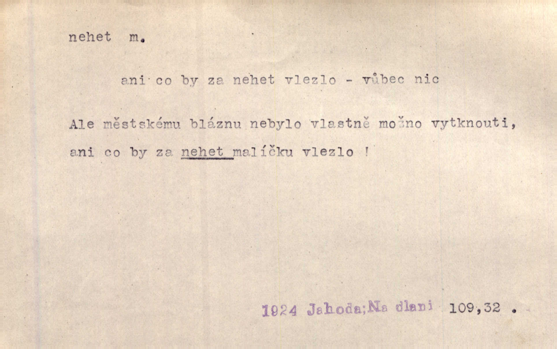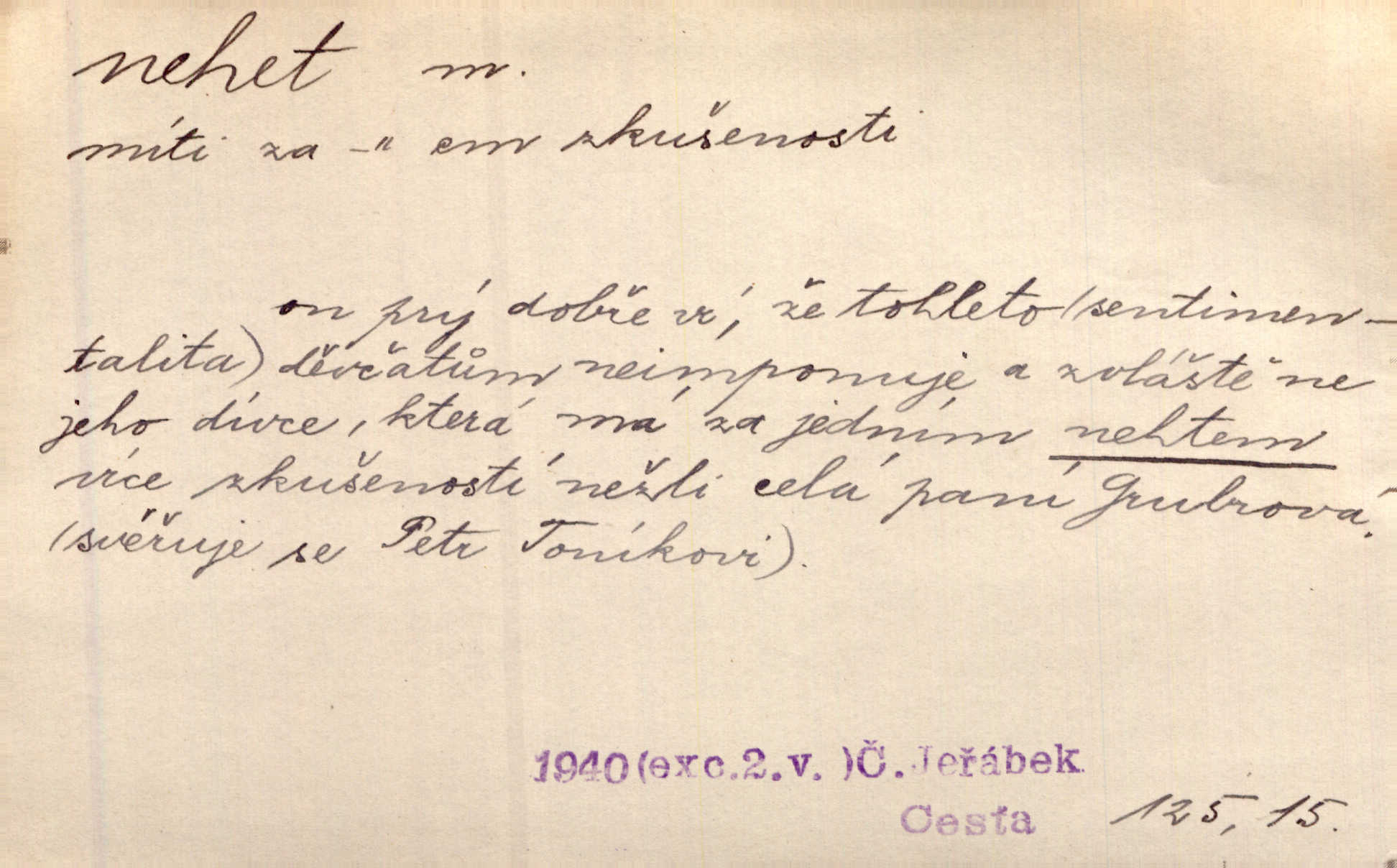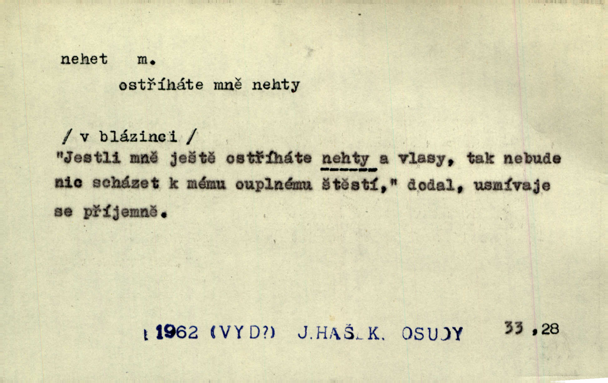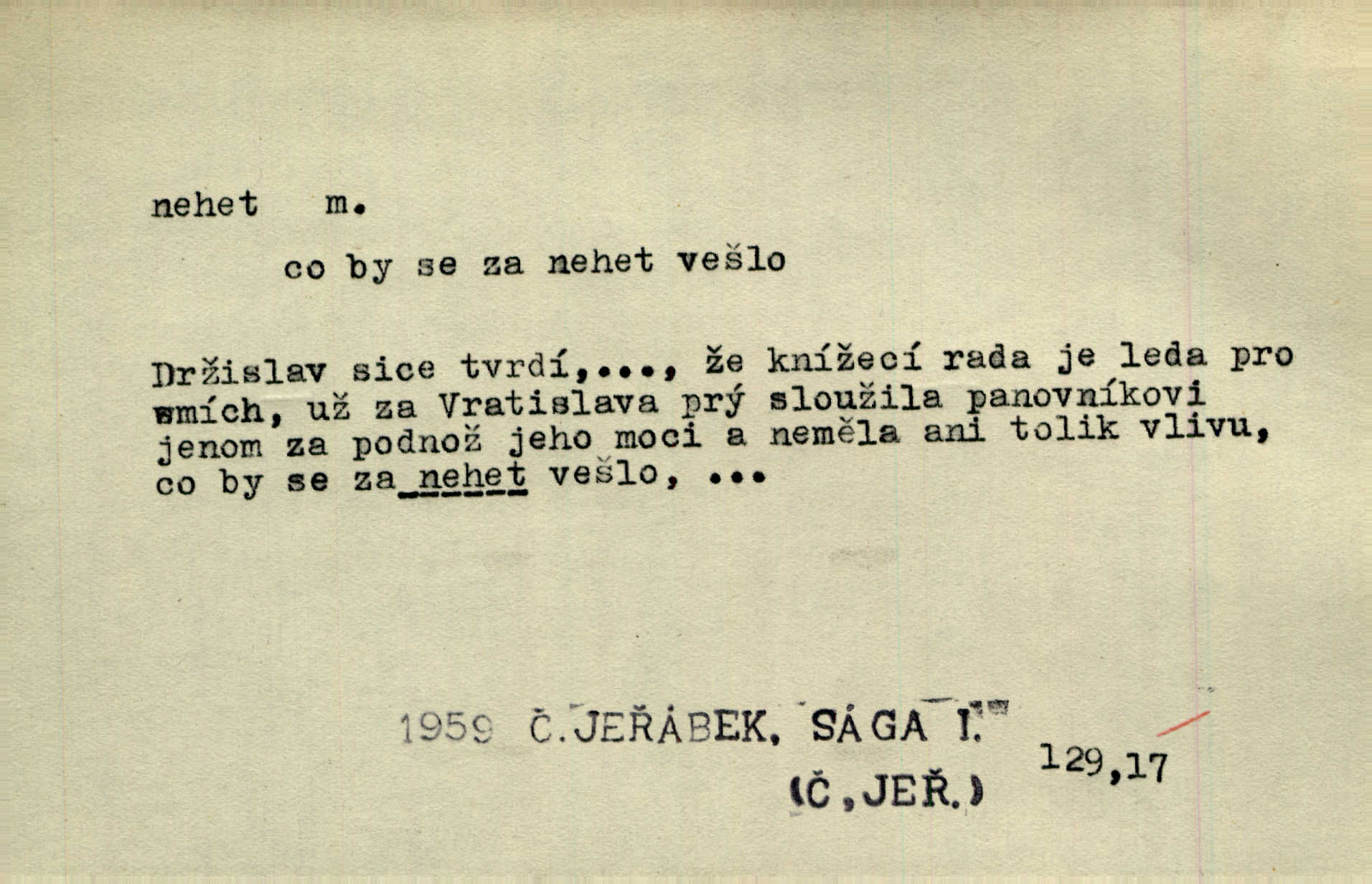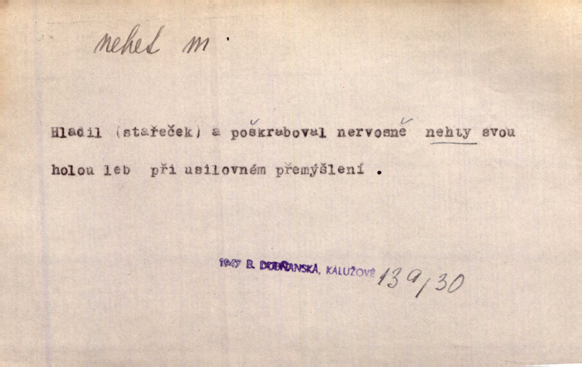 - nehet, -htu m. zrohovatělá ploténka pokožky na konečných článcích prstů. Piloval i soustruhoval nehty. Herrm. Růžový nehet krásně opalisuje v lesku slunce. Mach. Zbaven [vězeň] denní záře, rve si šedé vlasy, nehtem ryje tváře. Čech. Ustál. sp. Na těch cestách [do školy v zimě] mráz pálíval, zalézalo za nehty. Rais. [Úkol kritikův v novinách je] nepříjemná historie, která tě znepřáteluje kde s kým a zadírá se ti zatrachtile za nehty působí nesnáze, nepříjemnosti. Šal. „Kronika z konce tisíciletí“ je několik smyslných erotických avantýr mladého Alberta, z nichž teprve poslední, Bertina, jde mu hlouběji za nehty působí silněji. Šal. Je to [na panském] jako při císařské službě: každému zůstane něco za nehty, za velkými mnoho, za malými málo každý si něco nechá, zpronevěří, ukradne. Hol. Máš ty dlúhé nehty, dyž se ti za něma třicet rynských zadrhne ukradneš je. Herb. Byli obžalováni, že za války za nehty si nechali několik set zlatých zpronevěřili, ukradli. Hol. Vy [sedláci] budete míti taková práva jako před 200 lety a musíte se jich držeti zuby nehty vší mocí, všemožně. Herb. Měl pověst člověka tvrdošijného, jenž zuby nehty drží se toho, co si jednou usmyslil úporně, svéhlavě. Čech. [Purkmistr] byl muž plný síly a při tom do nehtu prolinulý důvěrou v tajemníka docela. Štech. Vzal jsem já vám někdy, co by za nehet vlezlo? třeba jen nějakou maličkost, vůbec něco. Herb. Nese [chuďas v chumelenici] otýpku klestí. Patrně nasadil život, aby si vypůjčil za nehet tepla trošku. Lier. Česká hospodyně může bědovat, že nemá doma „ani náprstek vody“ a „ani za nehet mouky“ vůbec žádnou mouku. Ner. Na tom [klepu] není pravdy, ani co by se za nehet vešlo vůbec žádná pravda. Stank. Nemohla míti za nehet pochybnosti o jejím původu. Herrm. D Slang. štítek čepice. Měl čepici placatou, s obrovským nehtem a s kostkou. Přít. Muž v čepici s „nehtem“. Maj. Kameník popotáhl nehet čepice na stranu. Nový. A nyní ještě štítek, chránící oči před sluncem a ve vojenské hantýrce nehet zvaný, se k čapce našije. Kop. D Zool. rohovitá šupina na zobáku. Bot. dolejší vzpřímená a zúžená část korunního plátku. D Dial. dobytčí nemoc projevující se na sliznici jazyka. Má-li nehet která kráva, ať se jí blínové semeno dává. Hol.