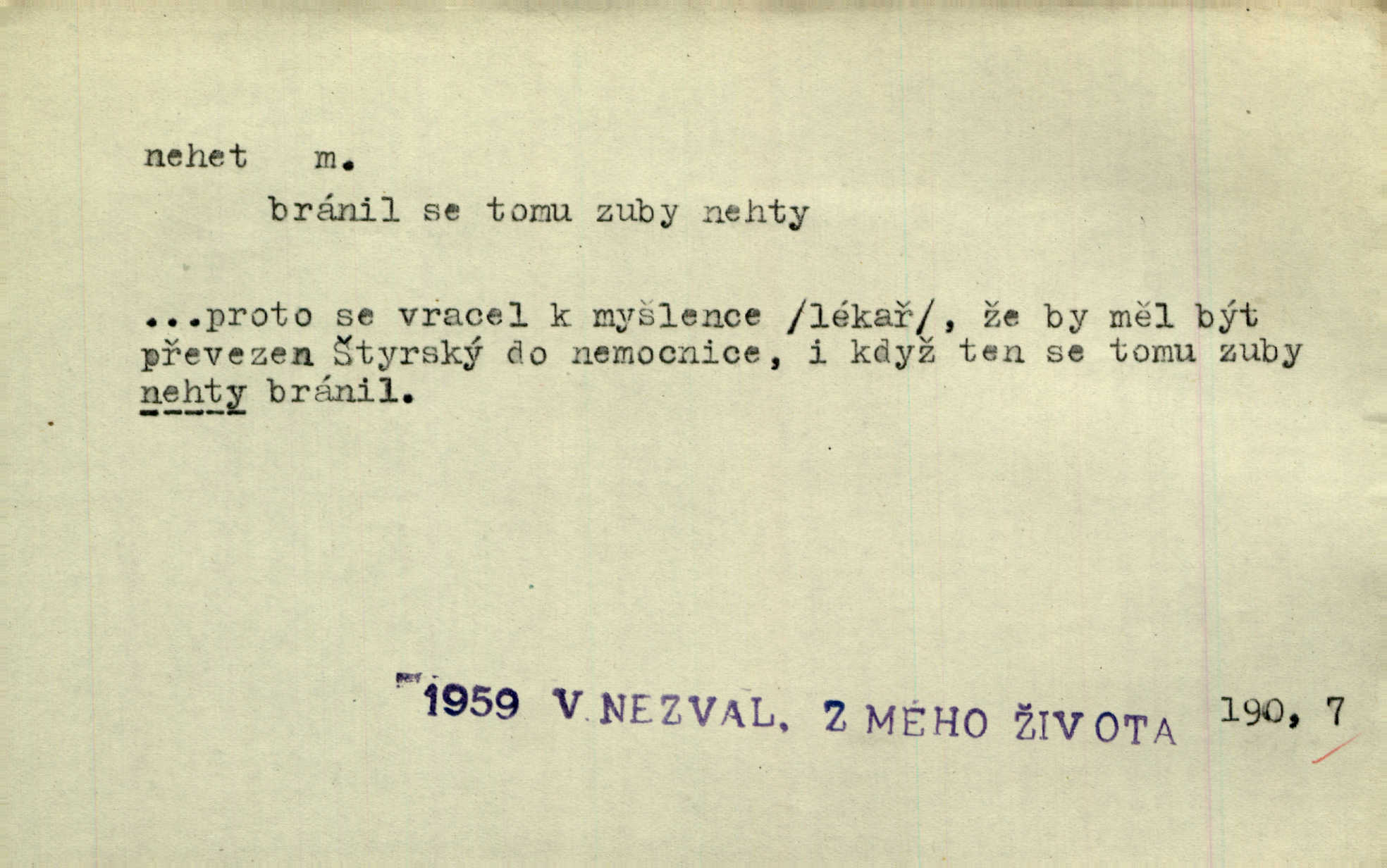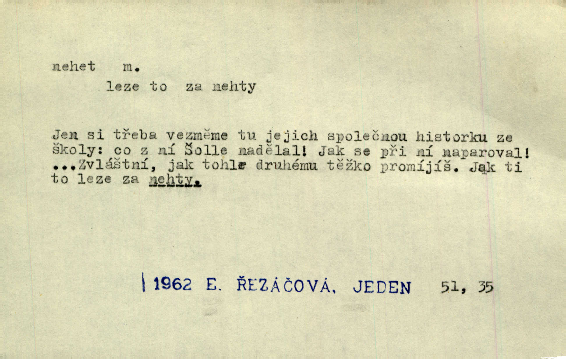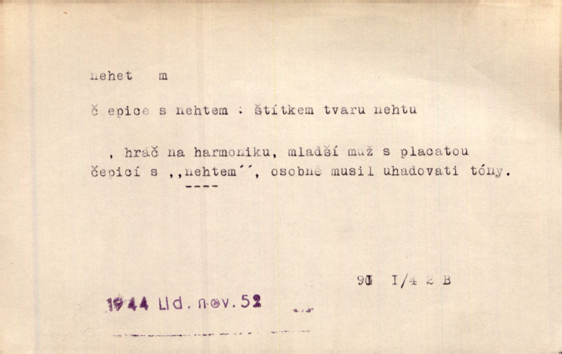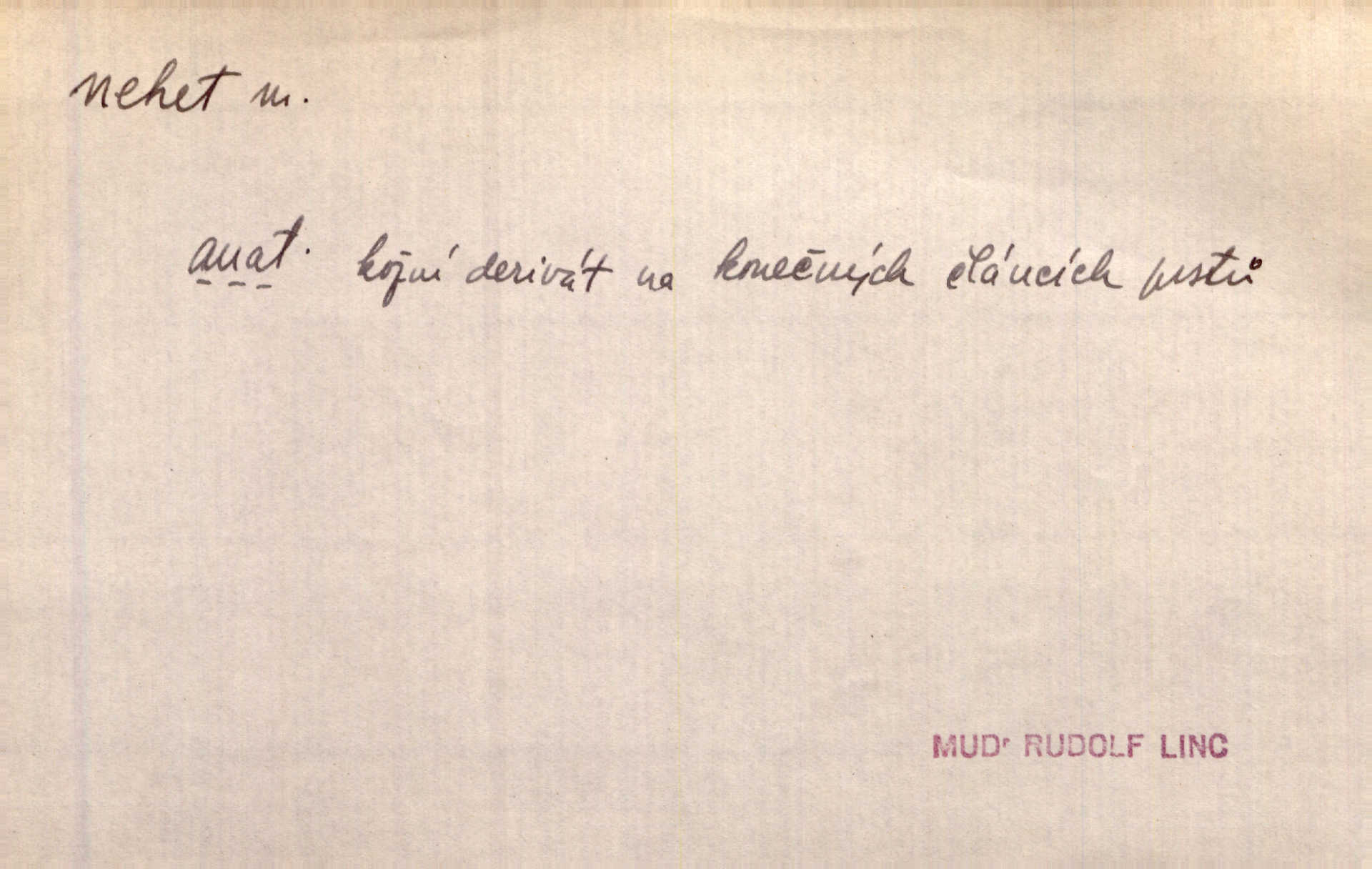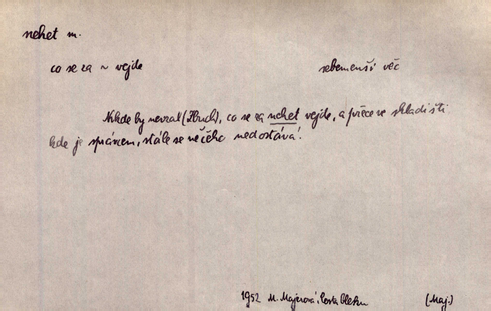 - nehet, -htu m. zrohovatělá ploténka pokožky na konečných článcích prstů. Piloval i soustruhoval nehty. Herrm. Růžový nehet krásně opalisuje v lesku slunce. Mach. Zbaven [vězeň] denní záře, rve si šedé vlasy, nehtem ryje tváře. Čech. Ustál. sp. Na těch cestách [do školy v zimě] mráz pálíval, zalézalo za nehty. Rais. [Úkol kritikův v novinách je] nepříjemná historie, která tě znepřáteluje kde s kým a zadírá se ti zatrachtile za nehty působí nesnáze, nepříjemnosti. Šal. „Kronika z konce tisíciletí“ je několik smyslných erotických avantýr mladého Alberta, z nichž teprve poslední, Bertina, jde mu hlouběji za nehty působí silněji. Šal. Je to [na panském] jako při císařské službě: každému zůstane něco za nehty, za velkými mnoho, za malými málo každý si něco nechá, zpronevěří, ukradne. Hol. Máš ty dlúhé nehty, dyž se ti za něma třicet rynských zadrhne ukradneš je. Herb. Byli obžalováni, že za války za nehty si nechali několik set zlatých zpronevěřili, ukradli. Hol. Vy [sedláci] budete míti taková práva jako před 200 lety a musíte se jich držeti zuby nehty vší mocí, všemožně. Herb. Měl pověst člověka tvrdošijného, jenž zuby nehty drží se toho, co si jednou usmyslil úporně, svéhlavě. Čech. [Purkmistr] byl muž plný síly a při tom do nehtu prolinulý důvěrou v tajemníka docela. Štech. Vzal jsem já vám někdy, co by za nehet vlezlo? třeba jen nějakou maličkost, vůbec něco. Herb. Nese [chuďas v chumelenici] otýpku klestí. Patrně nasadil život, aby si vypůjčil za nehet tepla trošku. Lier. Česká hospodyně může bědovat, že nemá doma „ani náprstek vody“ a „ani za nehet mouky“ vůbec žádnou mouku. Ner. Na tom [klepu] není pravdy, ani co by se za nehet vešlo vůbec žádná pravda. Stank. Nemohla míti za nehet pochybnosti o jejím původu. Herrm. D Slang. štítek čepice. Měl čepici placatou, s obrovským nehtem a s kostkou. Přít. Muž v čepici s „nehtem“. Maj. Kameník popotáhl nehet čepice na stranu. Nový. A nyní ještě štítek, chránící oči před sluncem a ve vojenské hantýrce nehet zvaný, se k čapce našije. Kop. D Zool. rohovitá šupina na zobáku. Bot. dolejší vzpřímená a zúžená část korunního plátku. D Dial. dobytčí nemoc projevující se na sliznici jazyka. Má-li nehet která kráva, ať se jí blínové semeno dává. Hol.