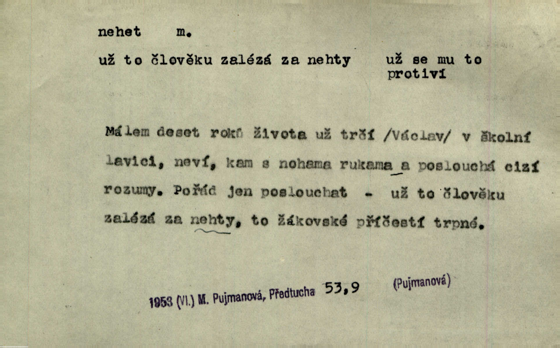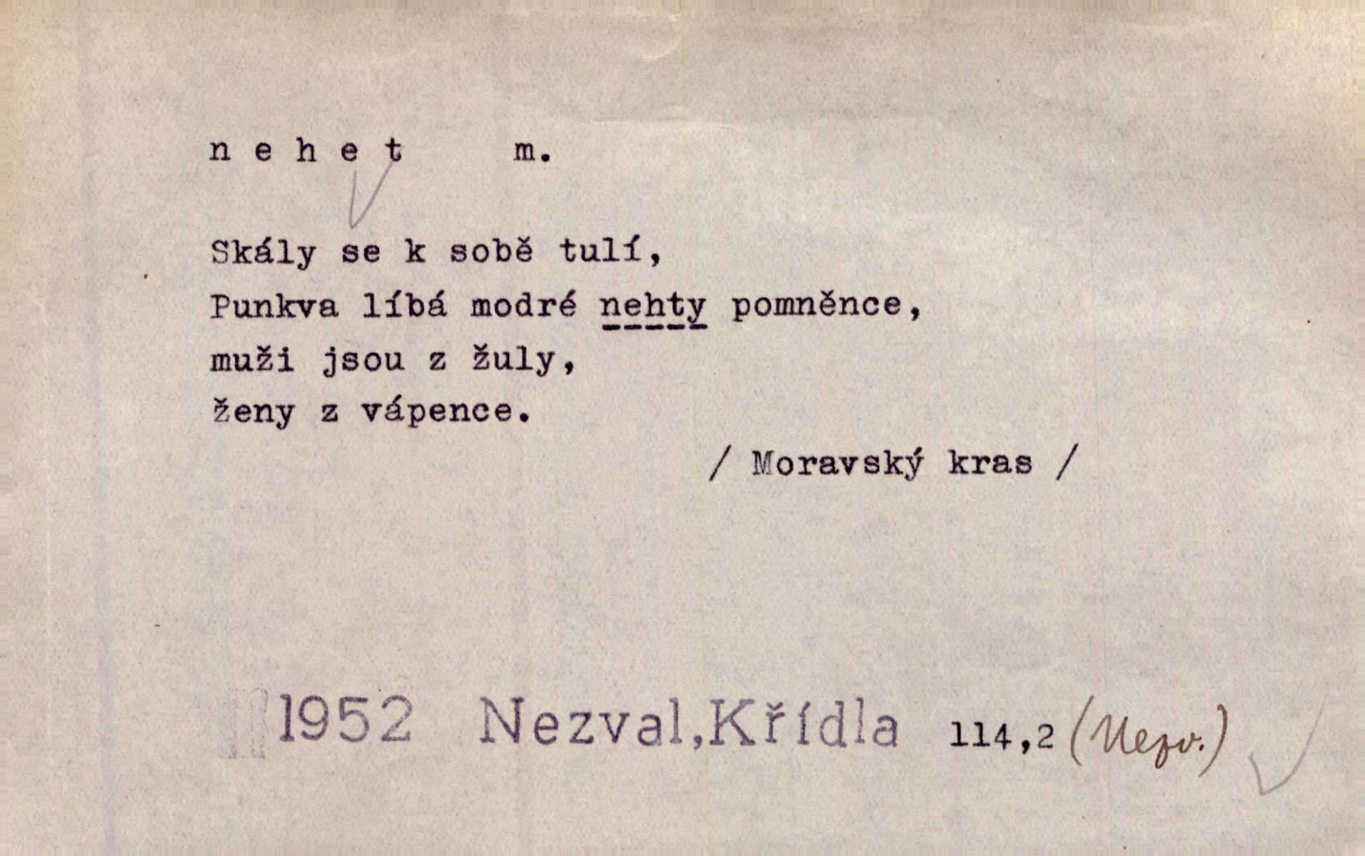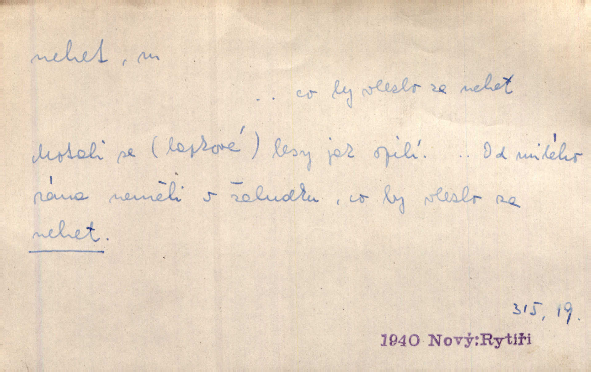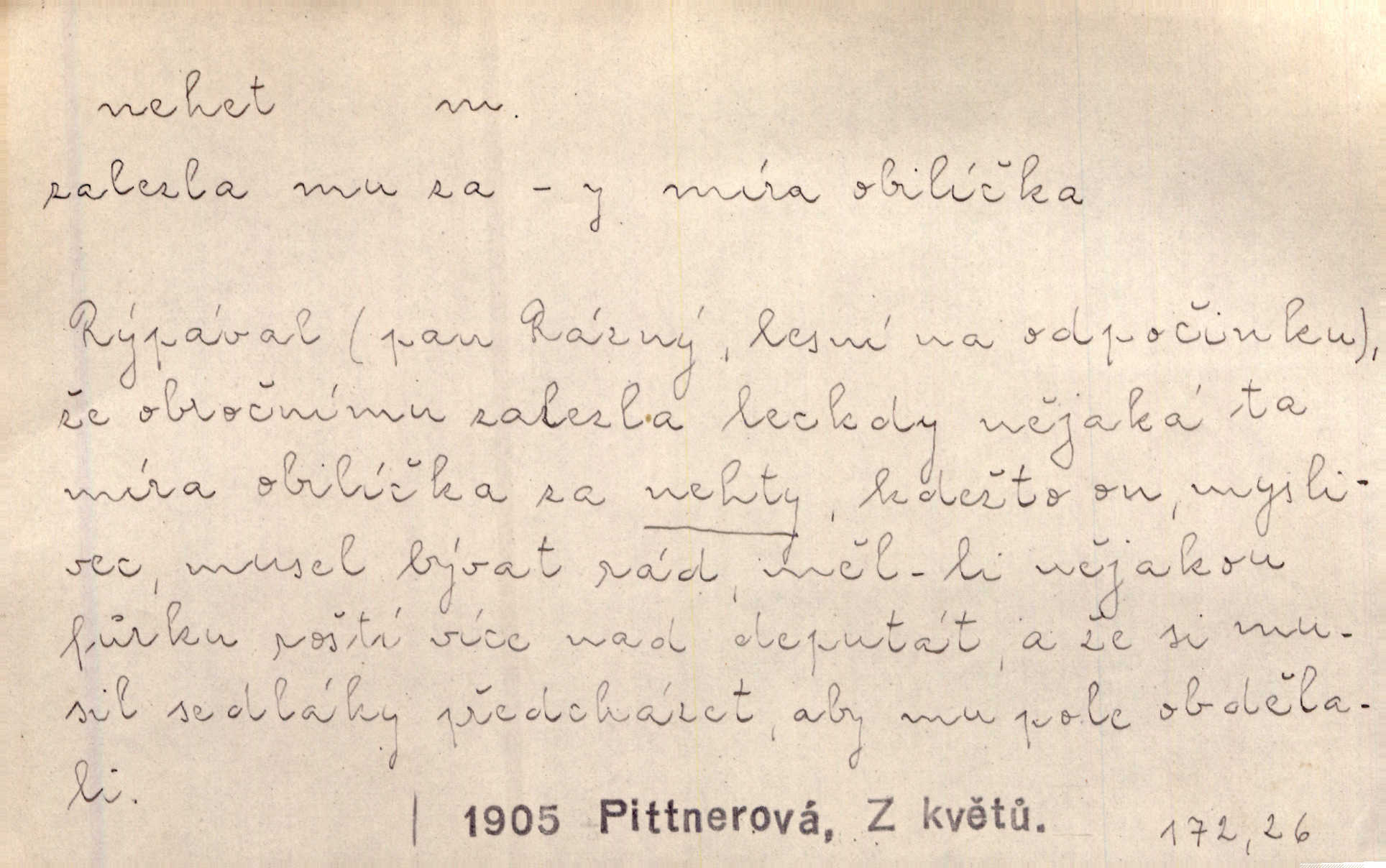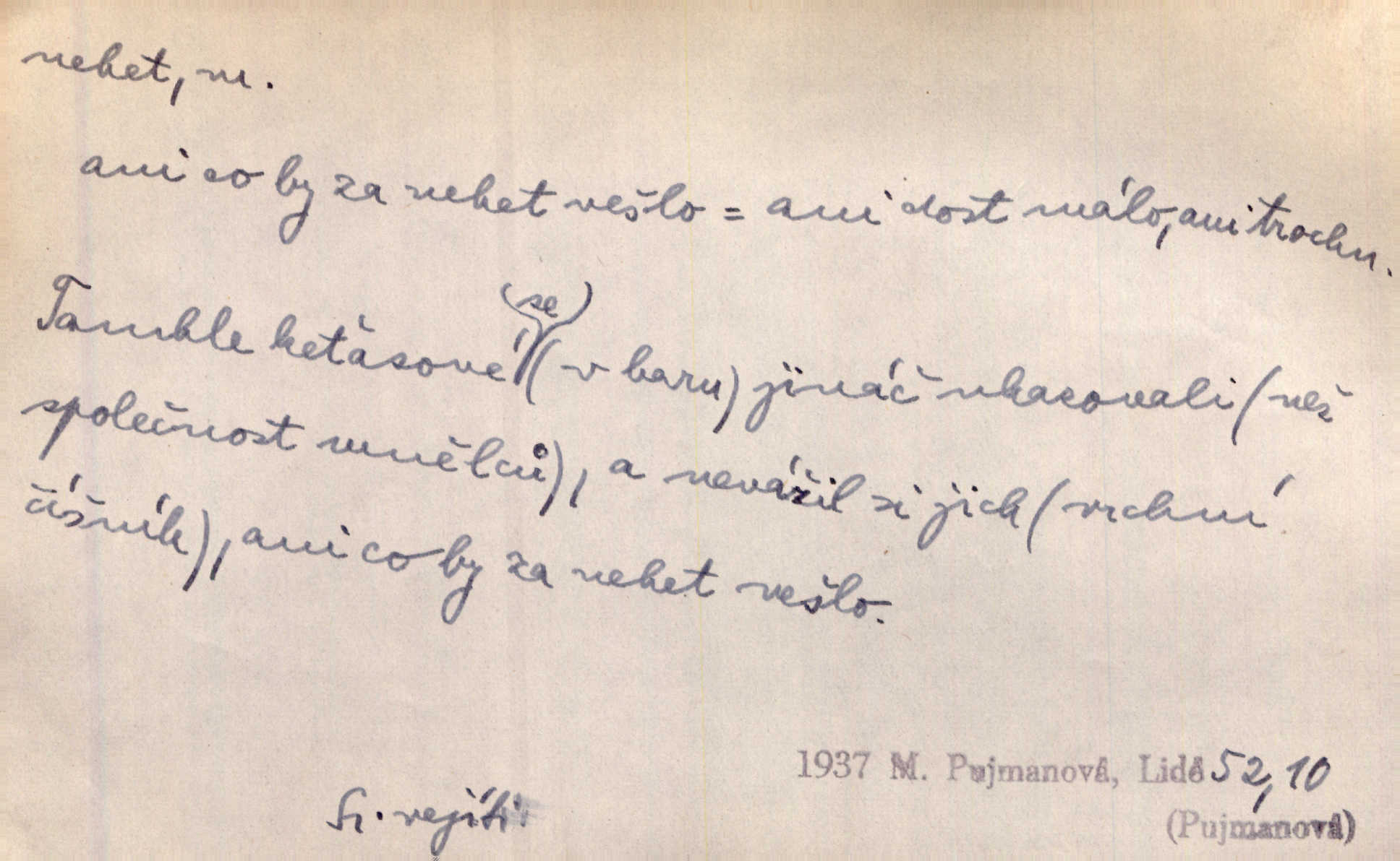 - nehet, -htu m. zrohovatělá ploténka pokožky na konečných článcích prstů. Piloval i soustruhoval nehty. Herrm. Růžový nehet krásně opalisuje v lesku slunce. Mach. Zbaven [vězeň] denní záře, rve si šedé vlasy, nehtem ryje tváře. Čech. Ustál. sp. Na těch cestách [do školy v zimě] mráz pálíval, zalézalo za nehty. Rais. [Úkol kritikův v novinách je] nepříjemná historie, která tě znepřáteluje kde s kým a zadírá se ti zatrachtile za nehty působí nesnáze, nepříjemnosti. Šal. „Kronika z konce tisíciletí“ je několik smyslných erotických avantýr mladého Alberta, z nichž teprve poslední, Bertina, jde mu hlouběji za nehty působí silněji. Šal. Je to [na panském] jako při císařské službě: každému zůstane něco za nehty, za velkými mnoho, za malými málo každý si něco nechá, zpronevěří, ukradne. Hol. Máš ty dlúhé nehty, dyž se ti za něma třicet rynských zadrhne ukradneš je. Herb. Byli obžalováni, že za války za nehty si nechali několik set zlatých zpronevěřili, ukradli. Hol. Vy [sedláci] budete míti taková práva jako před 200 lety a musíte se jich držeti zuby nehty vší mocí, všemožně. Herb. Měl pověst člověka tvrdošijného, jenž zuby nehty drží se toho, co si jednou usmyslil úporně, svéhlavě. Čech. [Purkmistr] byl muž plný síly a při tom do nehtu prolinulý důvěrou v tajemníka docela. Štech. Vzal jsem já vám někdy, co by za nehet vlezlo? třeba jen nějakou maličkost, vůbec něco. Herb. Nese [chuďas v chumelenici] otýpku klestí. Patrně nasadil život, aby si vypůjčil za nehet tepla trošku. Lier. Česká hospodyně může bědovat, že nemá doma „ani náprstek vody“ a „ani za nehet mouky“ vůbec žádnou mouku. Ner. Na tom [klepu] není pravdy, ani co by se za nehet vešlo vůbec žádná pravda. Stank. Nemohla míti za nehet pochybnosti o jejím původu. Herrm. D Slang. štítek čepice. Měl čepici placatou, s obrovským nehtem a s kostkou. Přít. Muž v čepici s „nehtem“. Maj. Kameník popotáhl nehet čepice na stranu. Nový. A nyní ještě štítek, chránící oči před sluncem a ve vojenské hantýrce nehet zvaný, se k čapce našije. Kop. D Zool. rohovitá šupina na zobáku. Bot. dolejší vzpřímená a zúžená část korunního plátku. D Dial. dobytčí nemoc projevující se na sliznici jazyka. Má-li nehet která kráva, ať se jí blínové semeno dává. Hol.