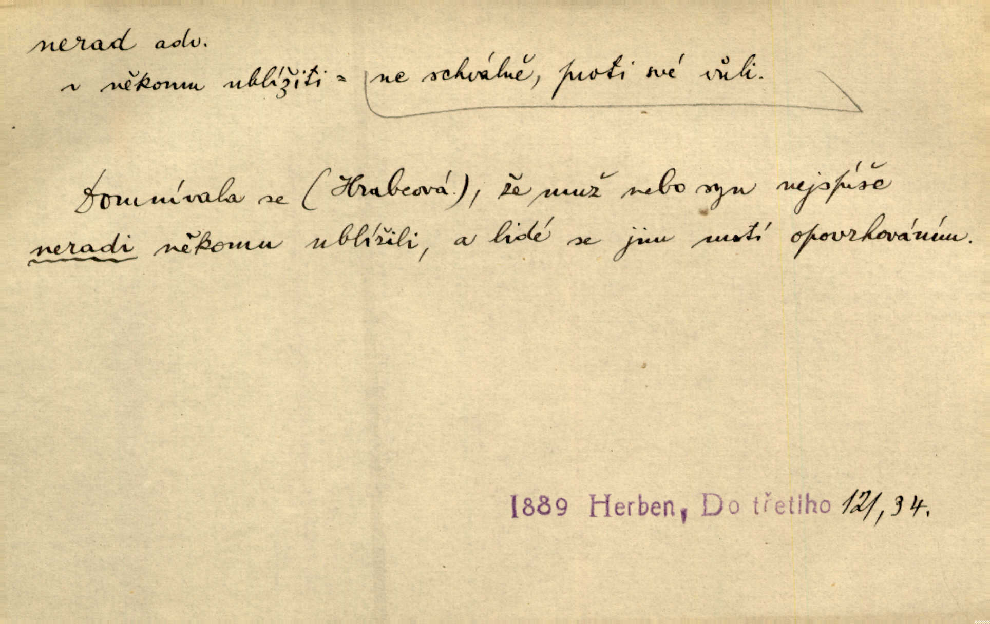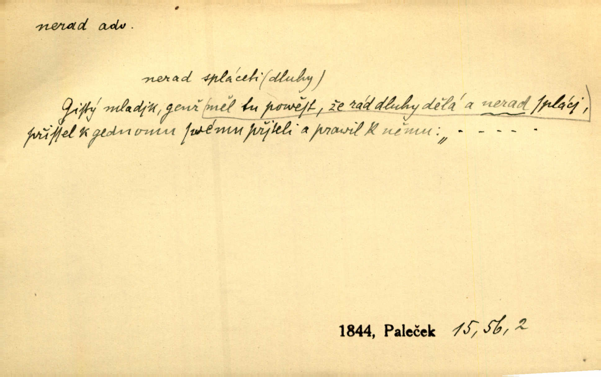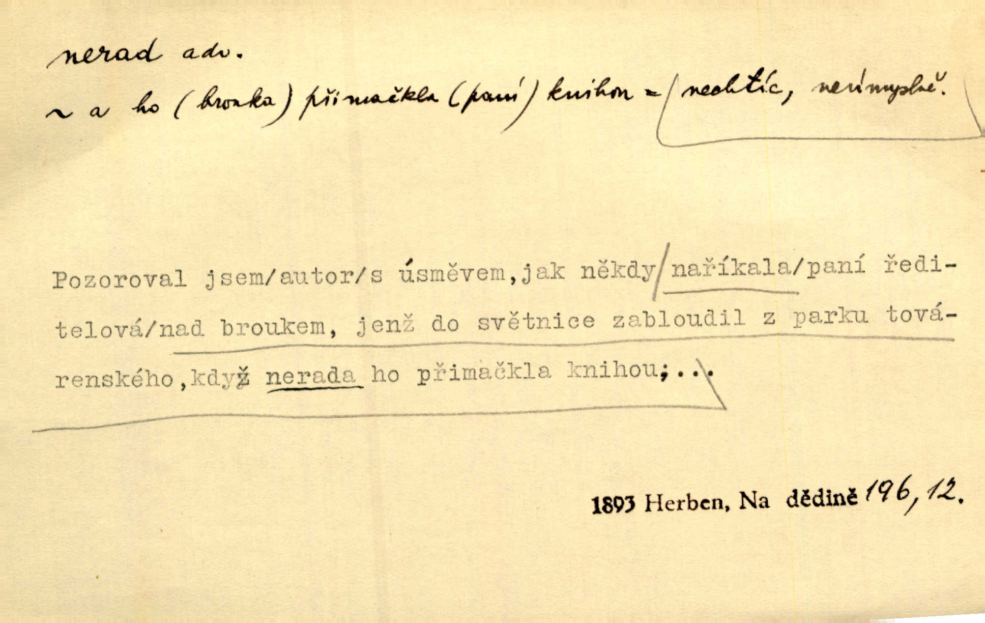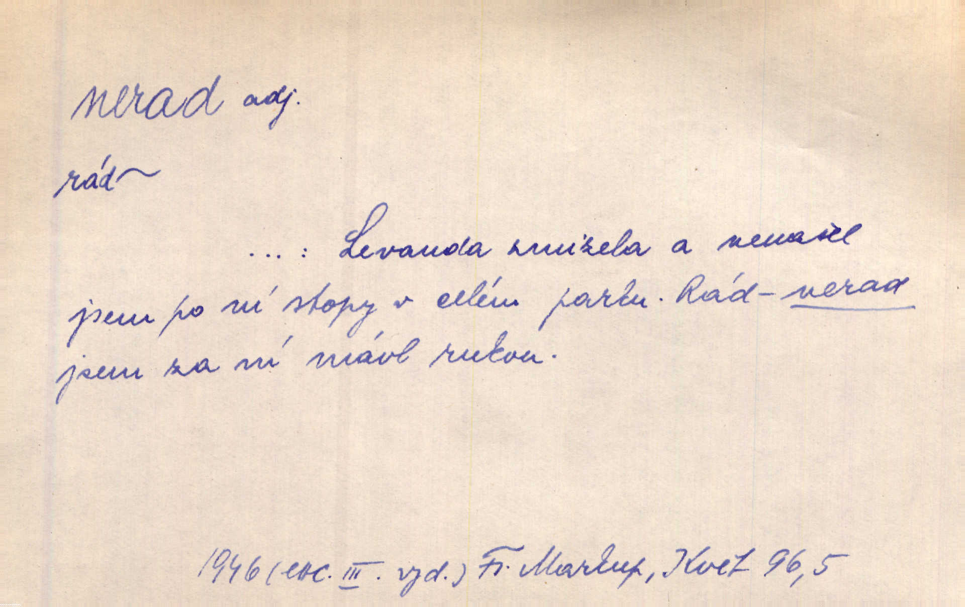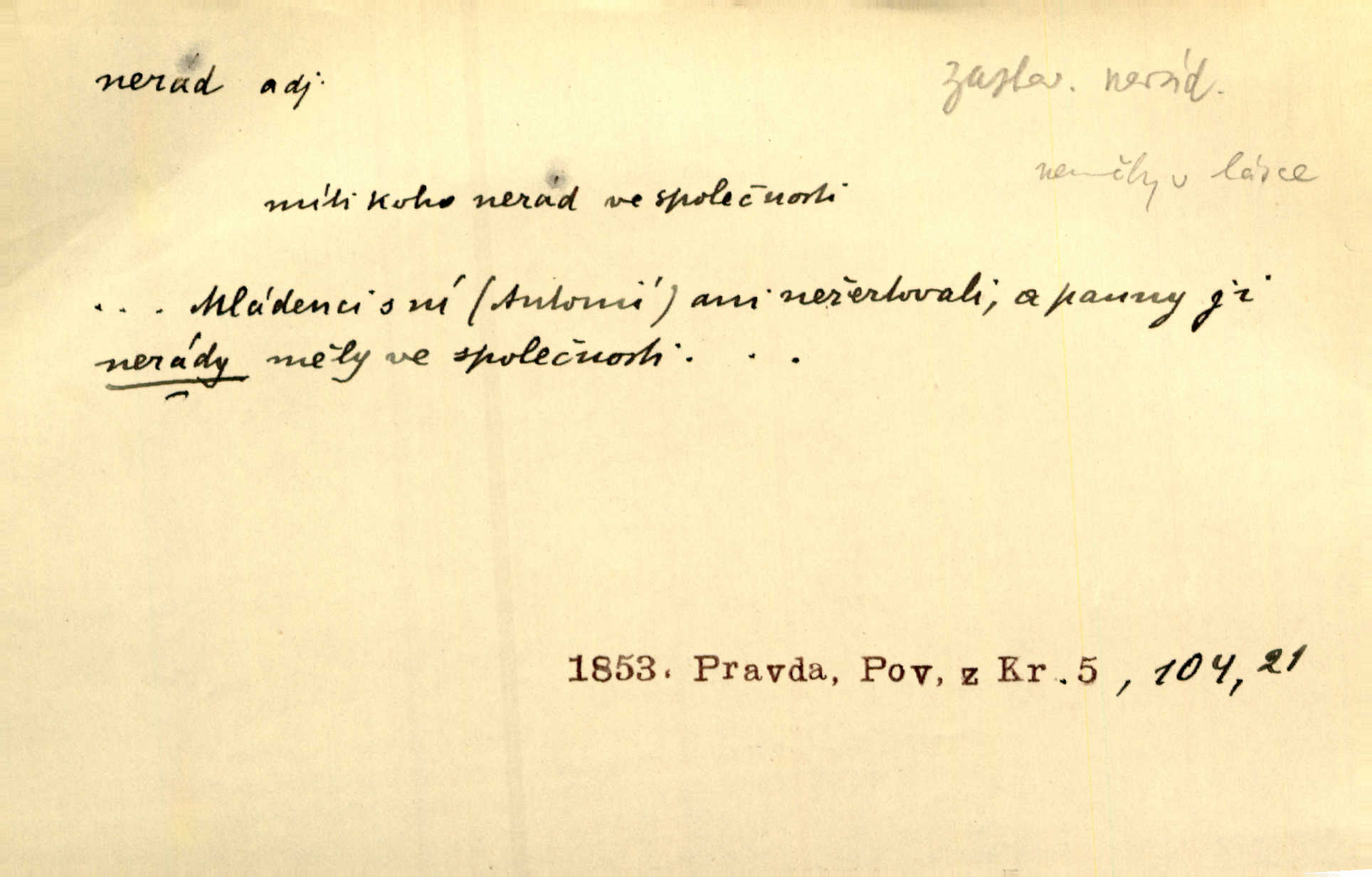 - nerad (arch. nerád) adj. (jen v nom. sg. a pl. všech tři rodů v tvaru neurčitém, zř. komp. adv. neraději) s nelibostí, s nechutí, s neochotou. Pozoroval již dávno, že si [princezna] ženicha nerada bere. Něm. Vy se mnou pořád tak nerad mluvíte! Rais. Matku svoji milovala paní Prošková velmi a nerada byla by ji od sebe pustila. Něm. Já myslím, že Lída s někým utekla; vy to nerad slyšíte, ale nemohu na nic jiného přijit. K. Čap. Neráda přijímám do své knihovny každou knihu. Schulz. Kněz biskup hrách asi nerad nechutná mu. Jir. [Hošík] líbal všeckny, nevšímaje si nic, je-li tomu host rád nebo nerad je-li mu vhod nebo nevhod. Havl. Nerad bych, aby vzalo za své, co více než sto let v rodině mé se udrželo bylo by mi nemilé. Svět. Královic byl rád, že získal zlatovlasou pannu, ale zas nerad, že ji má králi stříbrného zámku dát za koně Zlatohřiváka. Erb. Mládenci s ní ani nežertovali, a panny ji nerády měly ve společnosti neměly v lásce. Prav. Nerado se vstávalo — věru. Preis. Závadou srdečných pacientů jest odklad a co nejneraději opouštějí lůžko, kde je jim nejlépe. Čap. Ch. Matka čím dál, tím neraději viděla Petra na dvoře. Herb. D neúmyslně, nechtíc, proti své vůli. Když se oba kočáry k sobě přiblížily, švihl Kos po koních a jako by nerad zasáhl Kahla v druhém kočáře. Paleč. Třetí [ze zatčených] se přiznal, že on to byl, kdo mladého pána ťukl hákem, ale nerad. Čap. Ch. Naříkala nad broukem, jenž do světnice zabloudil, když nerada ho přimačkla knihou. Herb. Domnívala se, že muž nebo syn nejspíše neradi někomu ublížili, a lidé se jim mstí opovrhováním. Herb. D stěží, sotva, nesnadno. Který kůň jest slabého těla, tak že mu nazad odvisne, ten nerád tlustne. Lék. koň. Co jsme vssáli s mateřským mlékem, to nás po pětatřidceti letech nerádo opouští. Tyl. To už tak bývá, že to, na co nejvíce se těšíváme, nejneraději se vyplnívá. Svět.