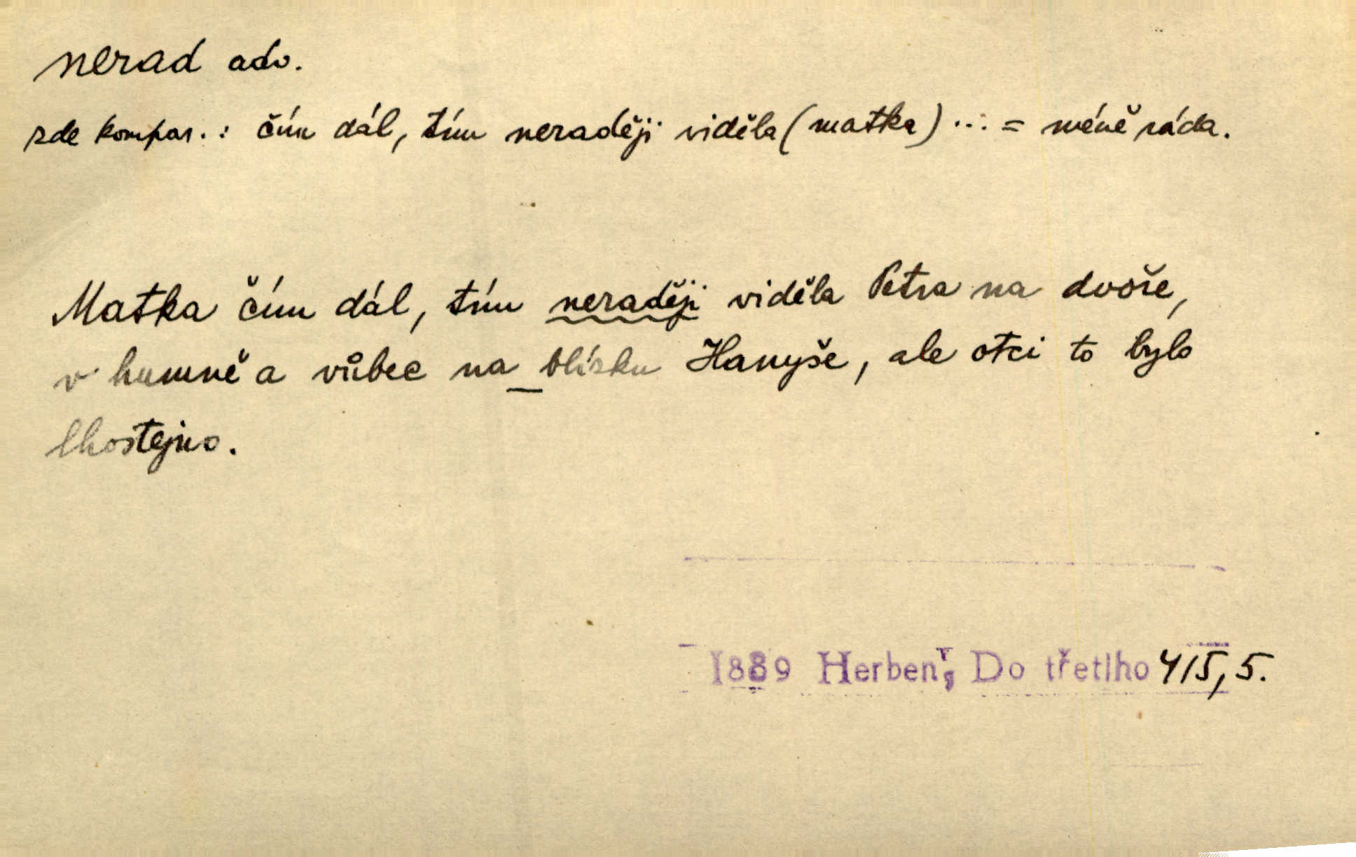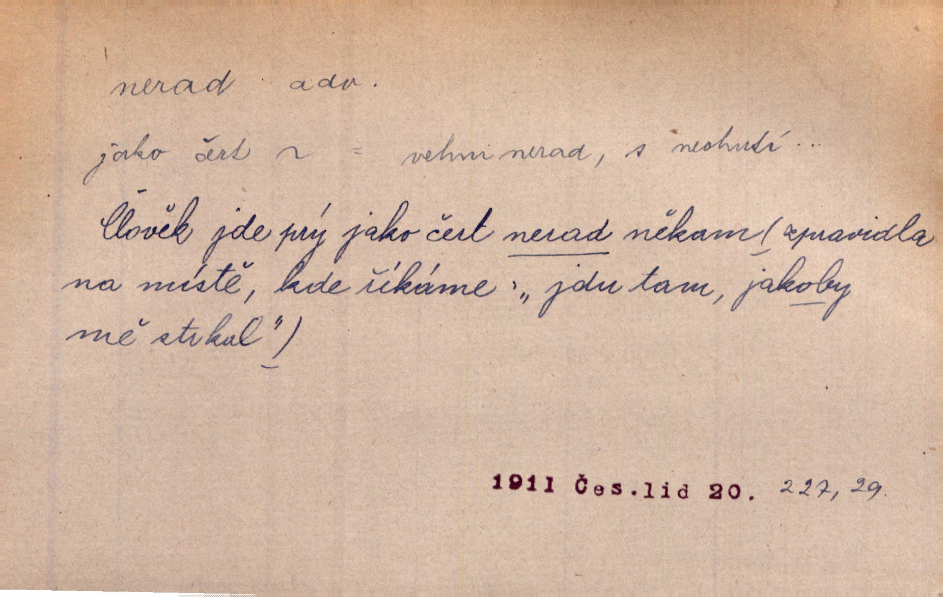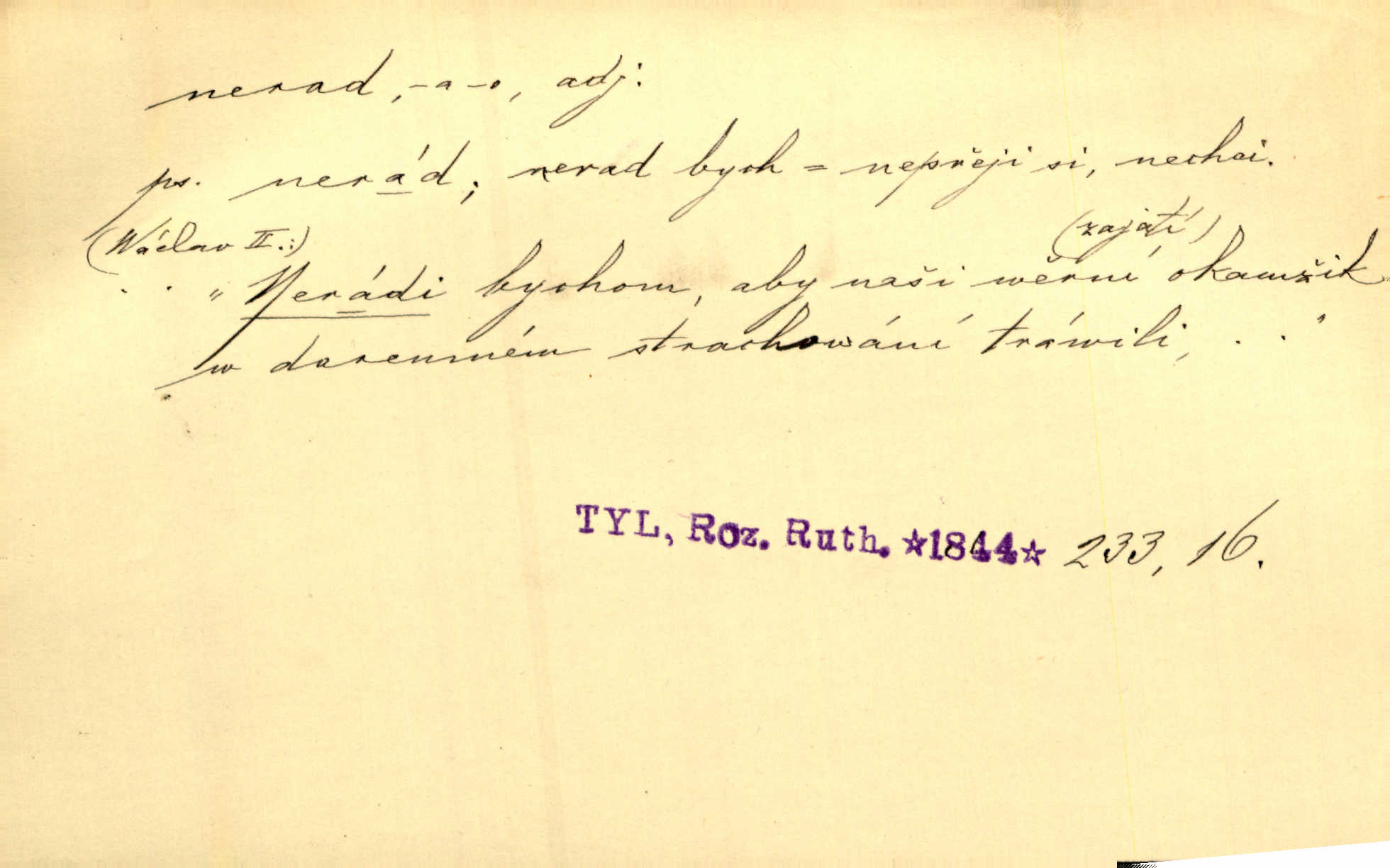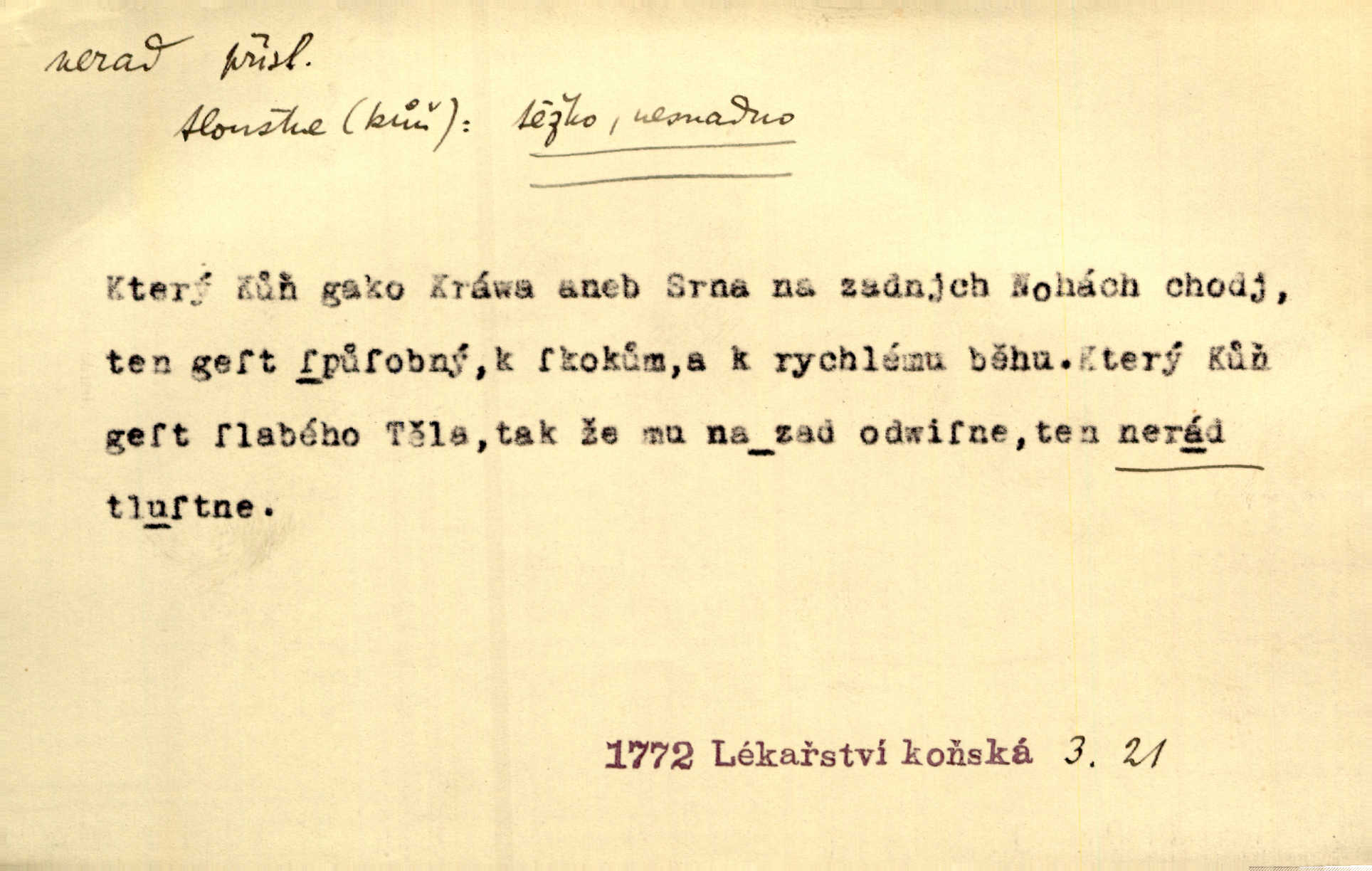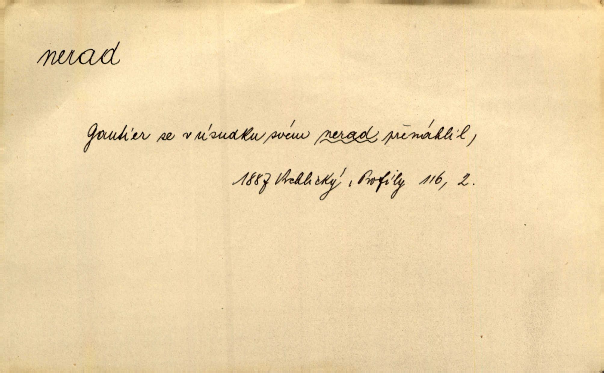 - nerad (arch. nerád) adj. (jen v nom. sg. a pl. všech tři rodů v tvaru neurčitém, zř. komp. adv. neraději) s nelibostí, s nechutí, s neochotou. Pozoroval již dávno, že si [princezna] ženicha nerada bere. Něm. Vy se mnou pořád tak nerad mluvíte! Rais. Matku svoji milovala paní Prošková velmi a nerada byla by ji od sebe pustila. Něm. Já myslím, že Lída s někým utekla; vy to nerad slyšíte, ale nemohu na nic jiného přijit. K. Čap. Neráda přijímám do své knihovny každou knihu. Schulz. Kněz biskup hrách asi nerad nechutná mu. Jir. [Hošík] líbal všeckny, nevšímaje si nic, je-li tomu host rád nebo nerad je-li mu vhod nebo nevhod. Havl. Nerad bych, aby vzalo za své, co více než sto let v rodině mé se udrželo bylo by mi nemilé. Svět. Královic byl rád, že získal zlatovlasou pannu, ale zas nerad, že ji má králi stříbrného zámku dát za koně Zlatohřiváka. Erb. Mládenci s ní ani nežertovali, a panny ji nerády měly ve společnosti neměly v lásce. Prav. Nerado se vstávalo — věru. Preis. Závadou srdečných pacientů jest odklad a co nejneraději opouštějí lůžko, kde je jim nejlépe. Čap. Ch. Matka čím dál, tím neraději viděla Petra na dvoře. Herb. D neúmyslně, nechtíc, proti své vůli. Když se oba kočáry k sobě přiblížily, švihl Kos po koních a jako by nerad zasáhl Kahla v druhém kočáře. Paleč. Třetí [ze zatčených] se přiznal, že on to byl, kdo mladého pána ťukl hákem, ale nerad. Čap. Ch. Naříkala nad broukem, jenž do světnice zabloudil, když nerada ho přimačkla knihou. Herb. Domnívala se, že muž nebo syn nejspíše neradi někomu ublížili, a lidé se jim mstí opovrhováním. Herb. D stěží, sotva, nesnadno. Který kůň jest slabého těla, tak že mu nazad odvisne, ten nerád tlustne. Lék. koň. Co jsme vssáli s mateřským mlékem, to nás po pětatřidceti letech nerádo opouští. Tyl. To už tak bývá, že to, na co nejvíce se těšíváme, nejneraději se vyplnívá. Svět.