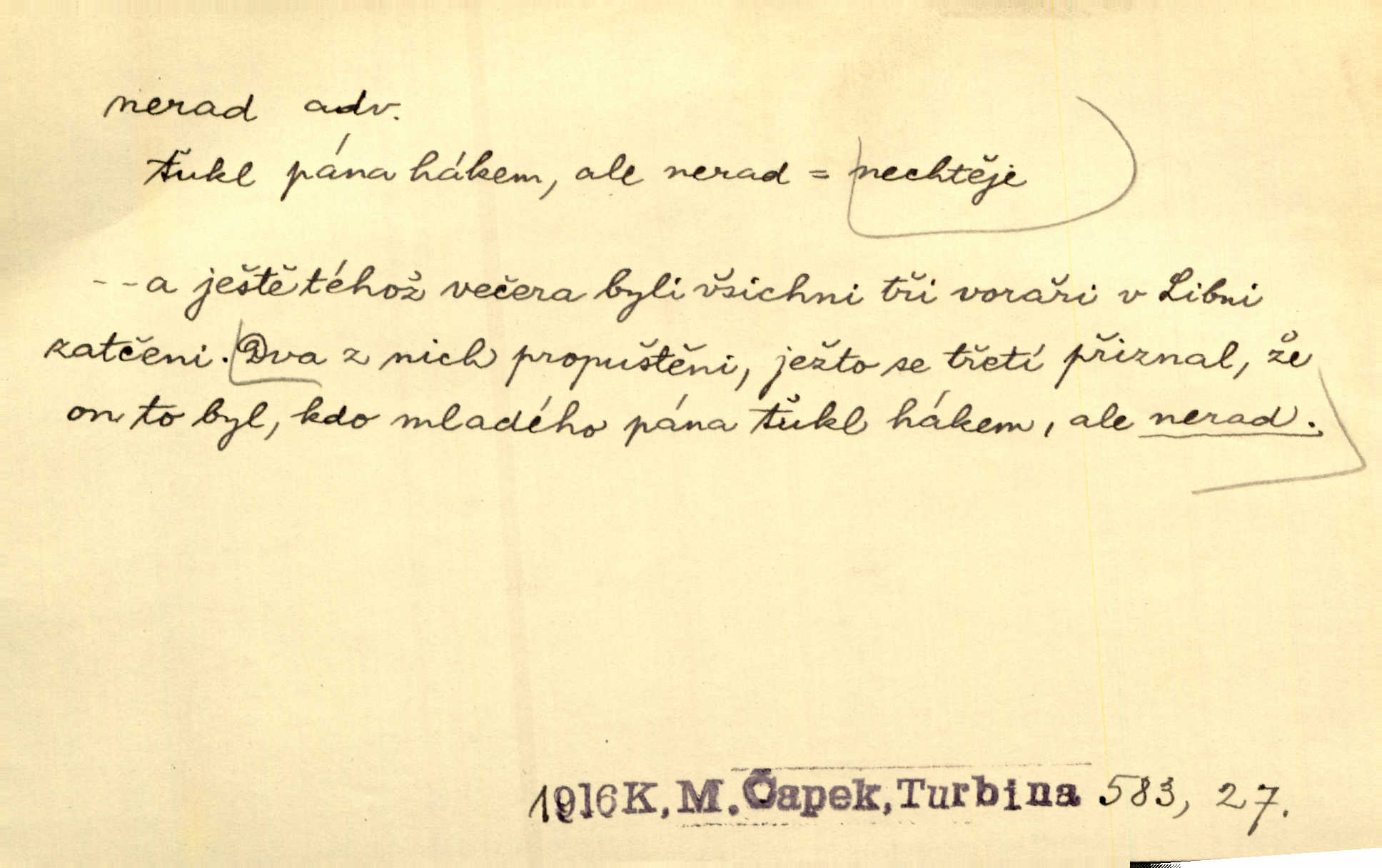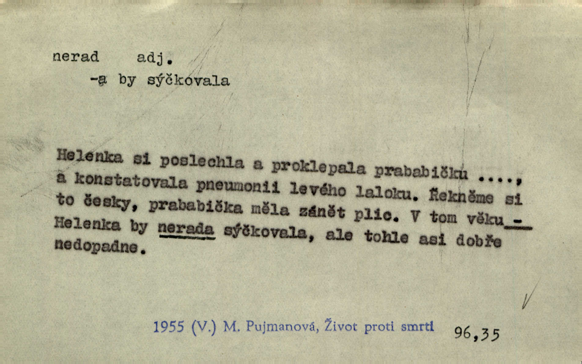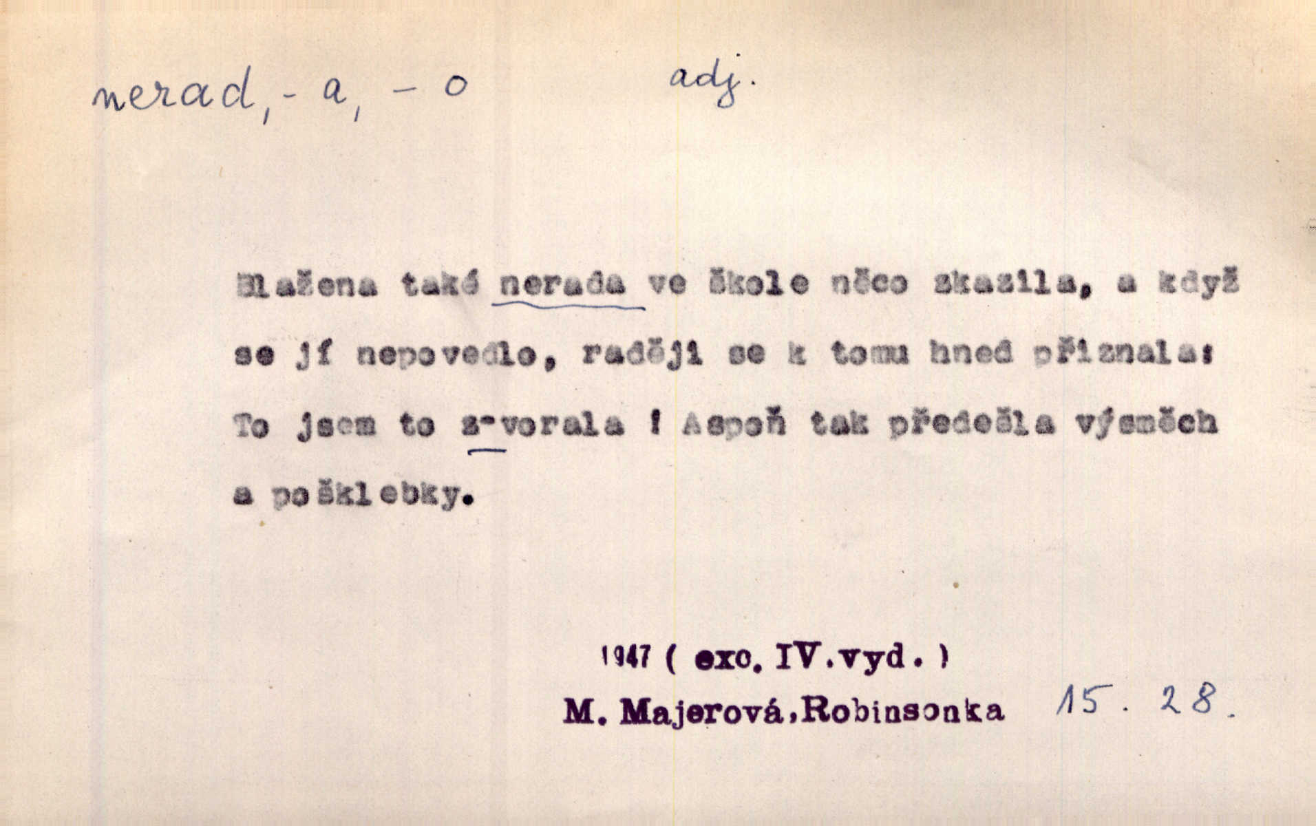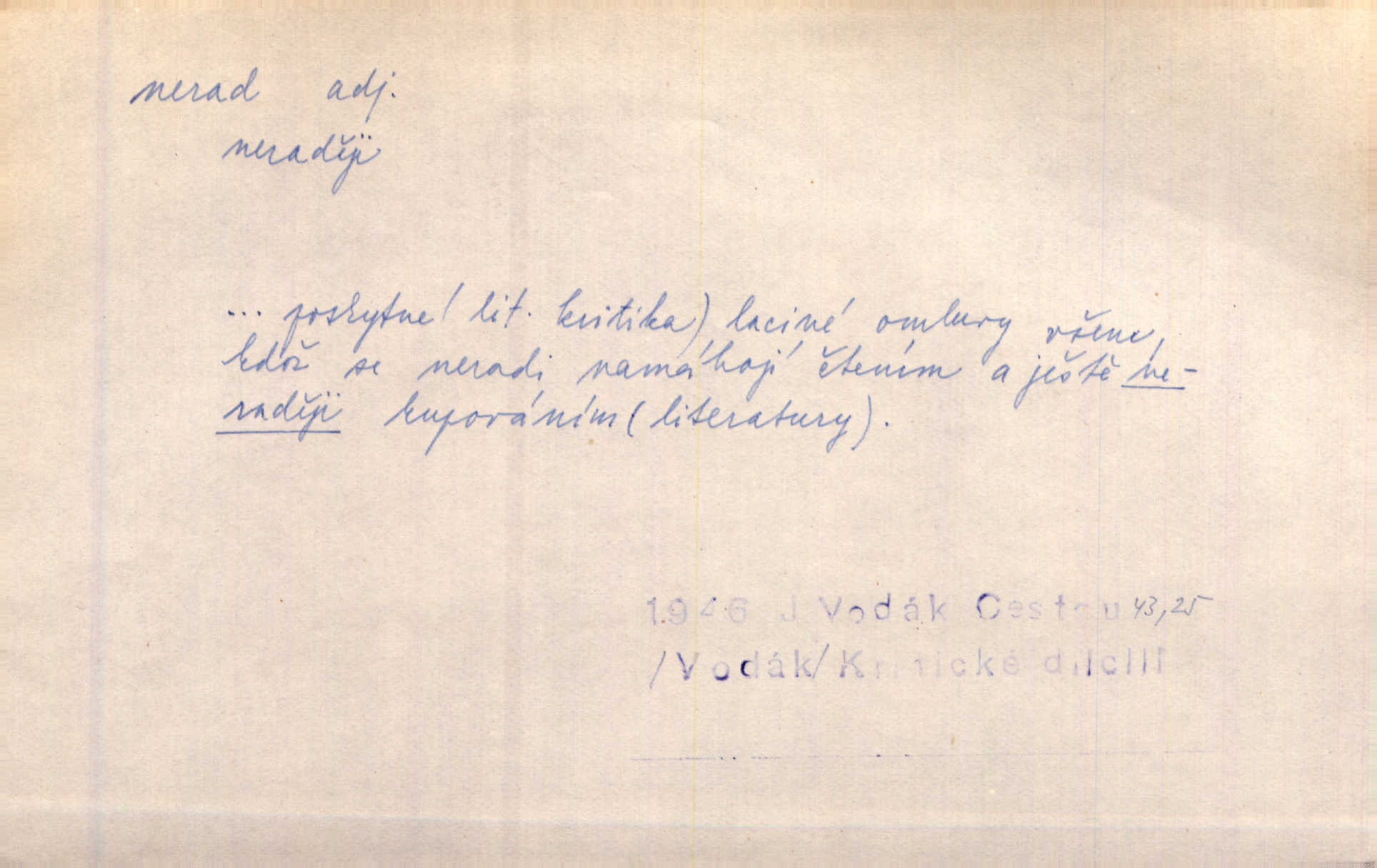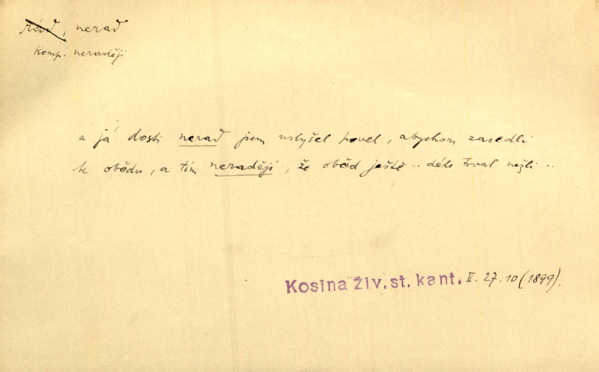 - nerad (arch. nerád) adj. (jen v nom. sg. a pl. všech tři rodů v tvaru neurčitém, zř. komp. adv. neraději) s nelibostí, s nechutí, s neochotou. Pozoroval již dávno, že si [princezna] ženicha nerada bere. Něm. Vy se mnou pořád tak nerad mluvíte! Rais. Matku svoji milovala paní Prošková velmi a nerada byla by ji od sebe pustila. Něm. Já myslím, že Lída s někým utekla; vy to nerad slyšíte, ale nemohu na nic jiného přijit. K. Čap. Neráda přijímám do své knihovny každou knihu. Schulz. Kněz biskup hrách asi nerad nechutná mu. Jir. [Hošík] líbal všeckny, nevšímaje si nic, je-li tomu host rád nebo nerad je-li mu vhod nebo nevhod. Havl. Nerad bych, aby vzalo za své, co více než sto let v rodině mé se udrželo bylo by mi nemilé. Svět. Královic byl rád, že získal zlatovlasou pannu, ale zas nerad, že ji má králi stříbrného zámku dát za koně Zlatohřiváka. Erb. Mládenci s ní ani nežertovali, a panny ji nerády měly ve společnosti neměly v lásce. Prav. Nerado se vstávalo — věru. Preis. Závadou srdečných pacientů jest odklad a co nejneraději opouštějí lůžko, kde je jim nejlépe. Čap. Ch. Matka čím dál, tím neraději viděla Petra na dvoře. Herb. D neúmyslně, nechtíc, proti své vůli. Když se oba kočáry k sobě přiblížily, švihl Kos po koních a jako by nerad zasáhl Kahla v druhém kočáře. Paleč. Třetí [ze zatčených] se přiznal, že on to byl, kdo mladého pána ťukl hákem, ale nerad. Čap. Ch. Naříkala nad broukem, jenž do světnice zabloudil, když nerada ho přimačkla knihou. Herb. Domnívala se, že muž nebo syn nejspíše neradi někomu ublížili, a lidé se jim mstí opovrhováním. Herb. D stěží, sotva, nesnadno. Který kůň jest slabého těla, tak že mu nazad odvisne, ten nerád tlustne. Lék. koň. Co jsme vssáli s mateřským mlékem, to nás po pětatřidceti letech nerádo opouští. Tyl. To už tak bývá, že to, na co nejvíce se těšíváme, nejneraději se vyplnívá. Svět.