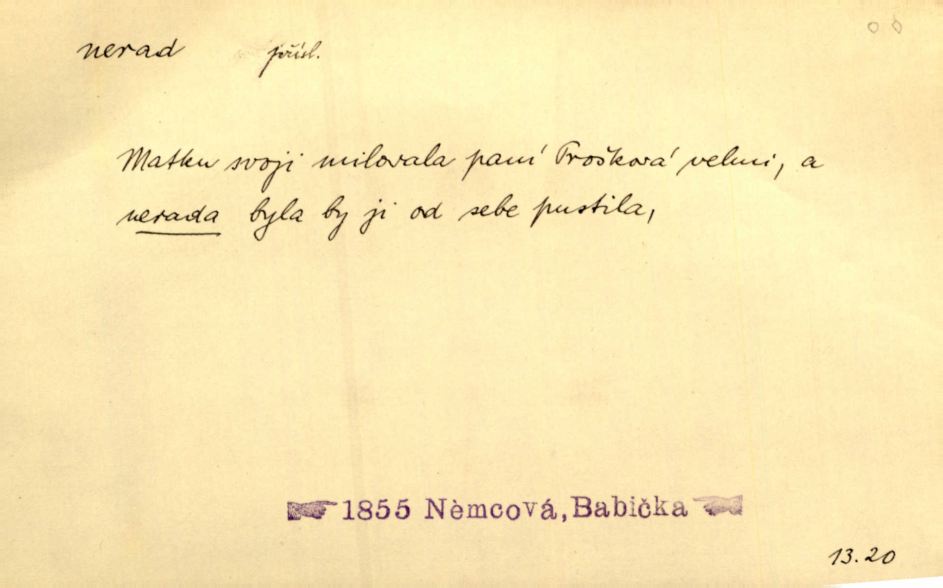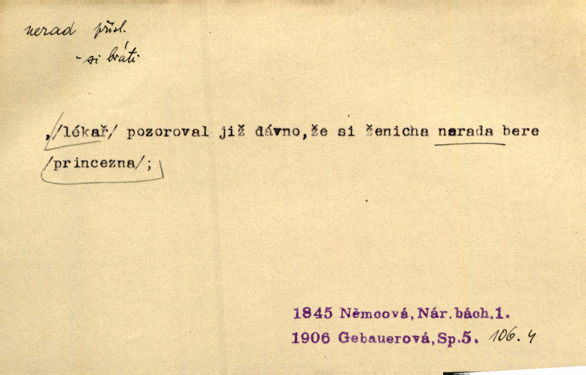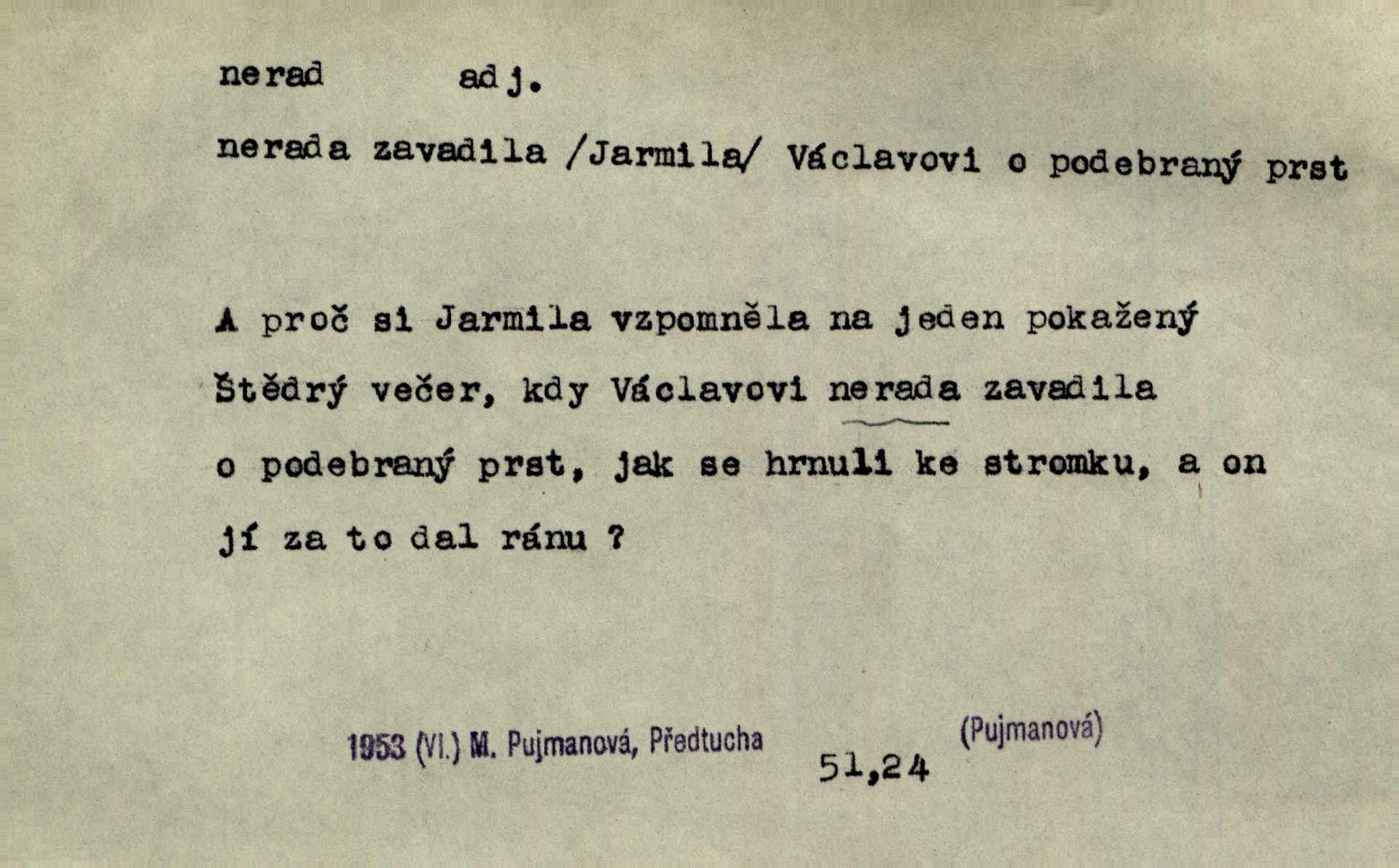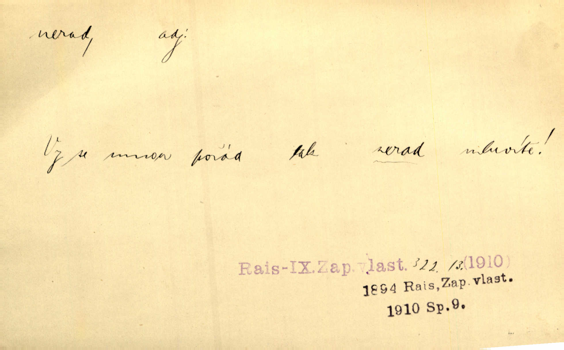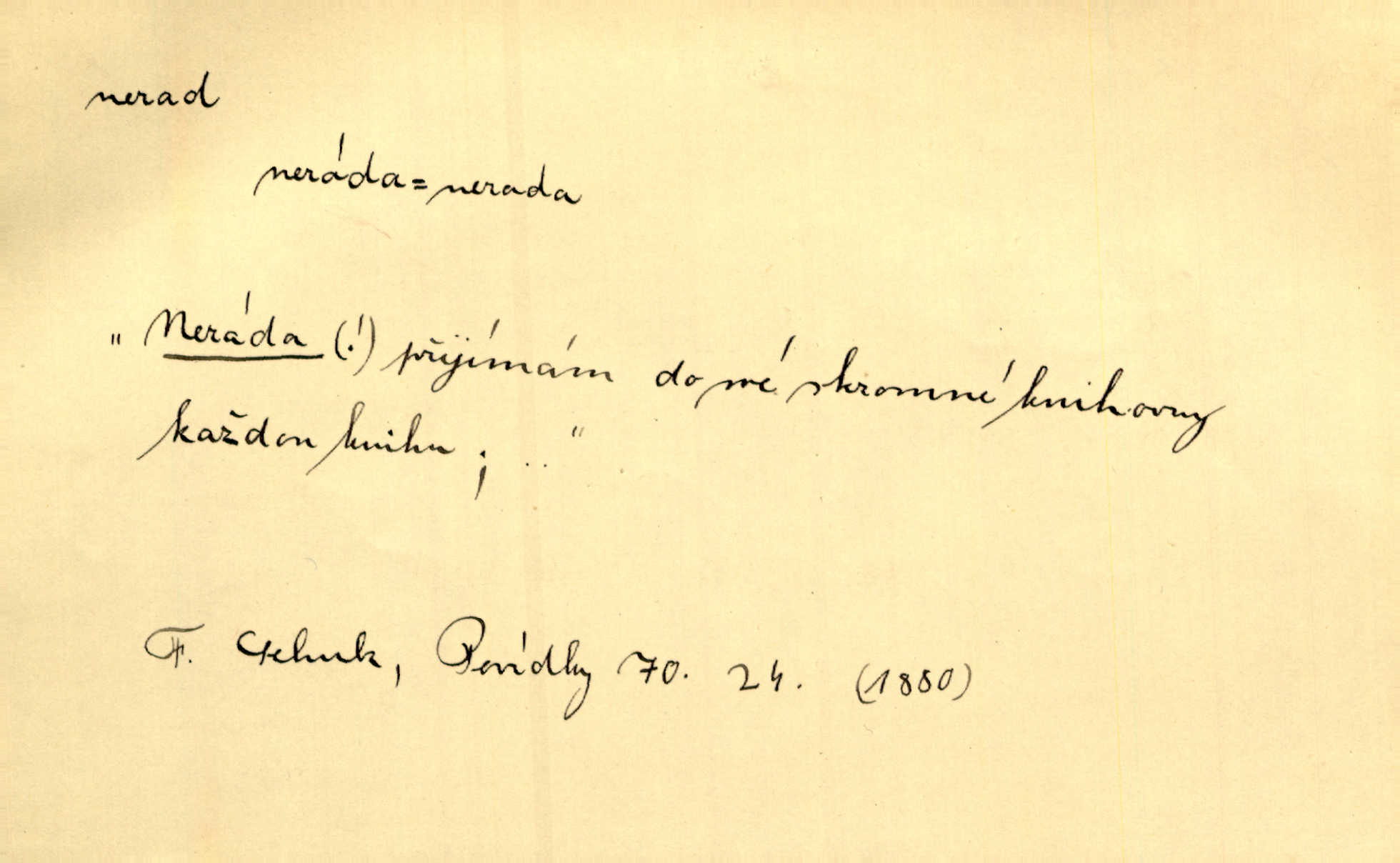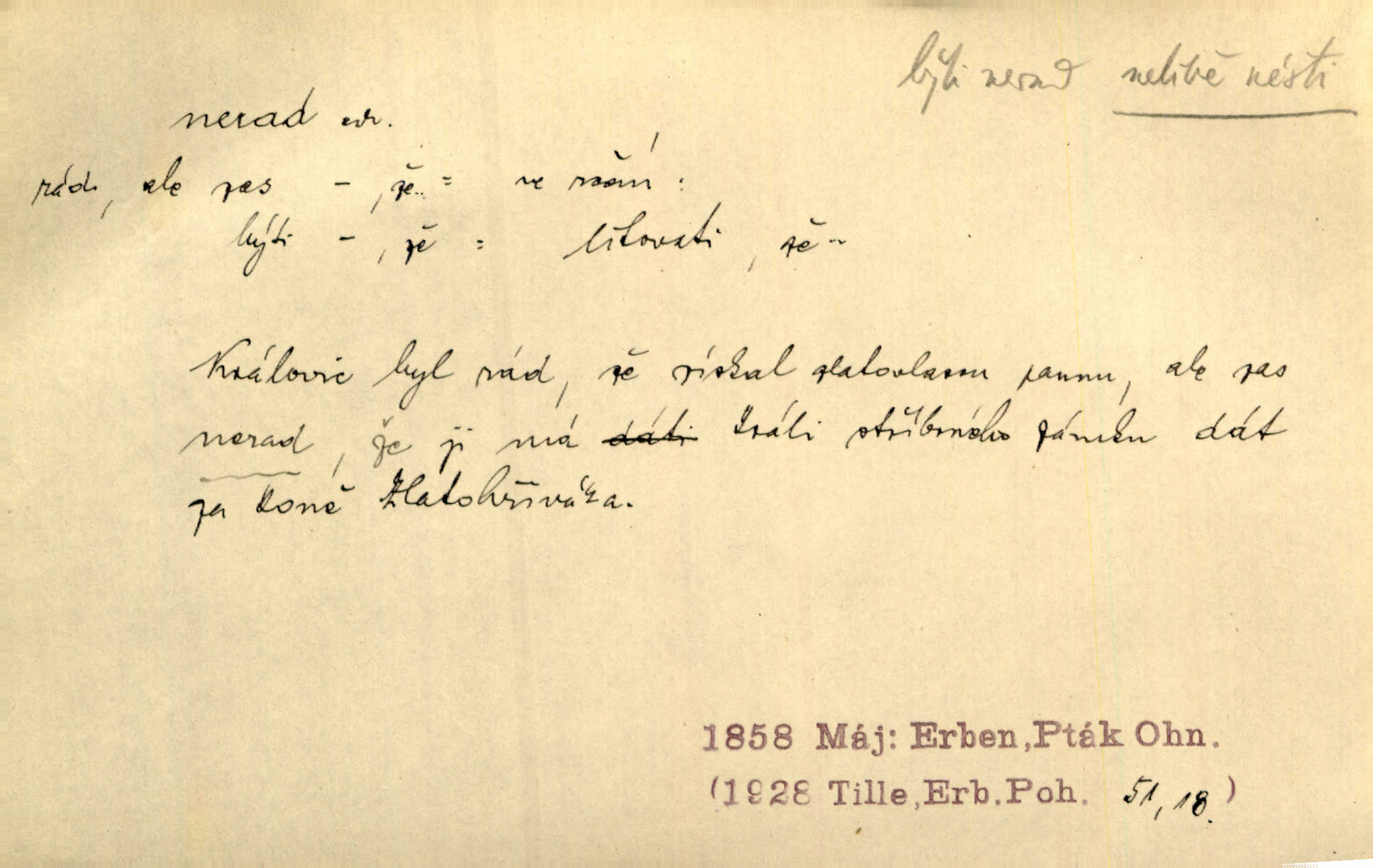 - nerad (arch. nerád) adj. (jen v nom. sg. a pl. všech tři rodů v tvaru neurčitém, zř. komp. adv. neraději) s nelibostí, s nechutí, s neochotou. Pozoroval již dávno, že si [princezna] ženicha nerada bere. Něm. Vy se mnou pořád tak nerad mluvíte! Rais. Matku svoji milovala paní Prošková velmi a nerada byla by ji od sebe pustila. Něm. Já myslím, že Lída s někým utekla; vy to nerad slyšíte, ale nemohu na nic jiného přijit. K. Čap. Neráda přijímám do své knihovny každou knihu. Schulz. Kněz biskup hrách asi nerad nechutná mu. Jir. [Hošík] líbal všeckny, nevšímaje si nic, je-li tomu host rád nebo nerad je-li mu vhod nebo nevhod. Havl. Nerad bych, aby vzalo za své, co více než sto let v rodině mé se udrželo bylo by mi nemilé. Svět. Královic byl rád, že získal zlatovlasou pannu, ale zas nerad, že ji má králi stříbrného zámku dát za koně Zlatohřiváka. Erb. Mládenci s ní ani nežertovali, a panny ji nerády měly ve společnosti neměly v lásce. Prav. Nerado se vstávalo — věru. Preis. Závadou srdečných pacientů jest odklad a co nejneraději opouštějí lůžko, kde je jim nejlépe. Čap. Ch. Matka čím dál, tím neraději viděla Petra na dvoře. Herb. D neúmyslně, nechtíc, proti své vůli. Když se oba kočáry k sobě přiblížily, švihl Kos po koních a jako by nerad zasáhl Kahla v druhém kočáře. Paleč. Třetí [ze zatčených] se přiznal, že on to byl, kdo mladého pána ťukl hákem, ale nerad. Čap. Ch. Naříkala nad broukem, jenž do světnice zabloudil, když nerada ho přimačkla knihou. Herb. Domnívala se, že muž nebo syn nejspíše neradi někomu ublížili, a lidé se jim mstí opovrhováním. Herb. D stěží, sotva, nesnadno. Který kůň jest slabého těla, tak že mu nazad odvisne, ten nerád tlustne. Lék. koň. Co jsme vssáli s mateřským mlékem, to nás po pětatřidceti letech nerádo opouští. Tyl. To už tak bývá, že to, na co nejvíce se těšíváme, nejneraději se vyplnívá. Svět.