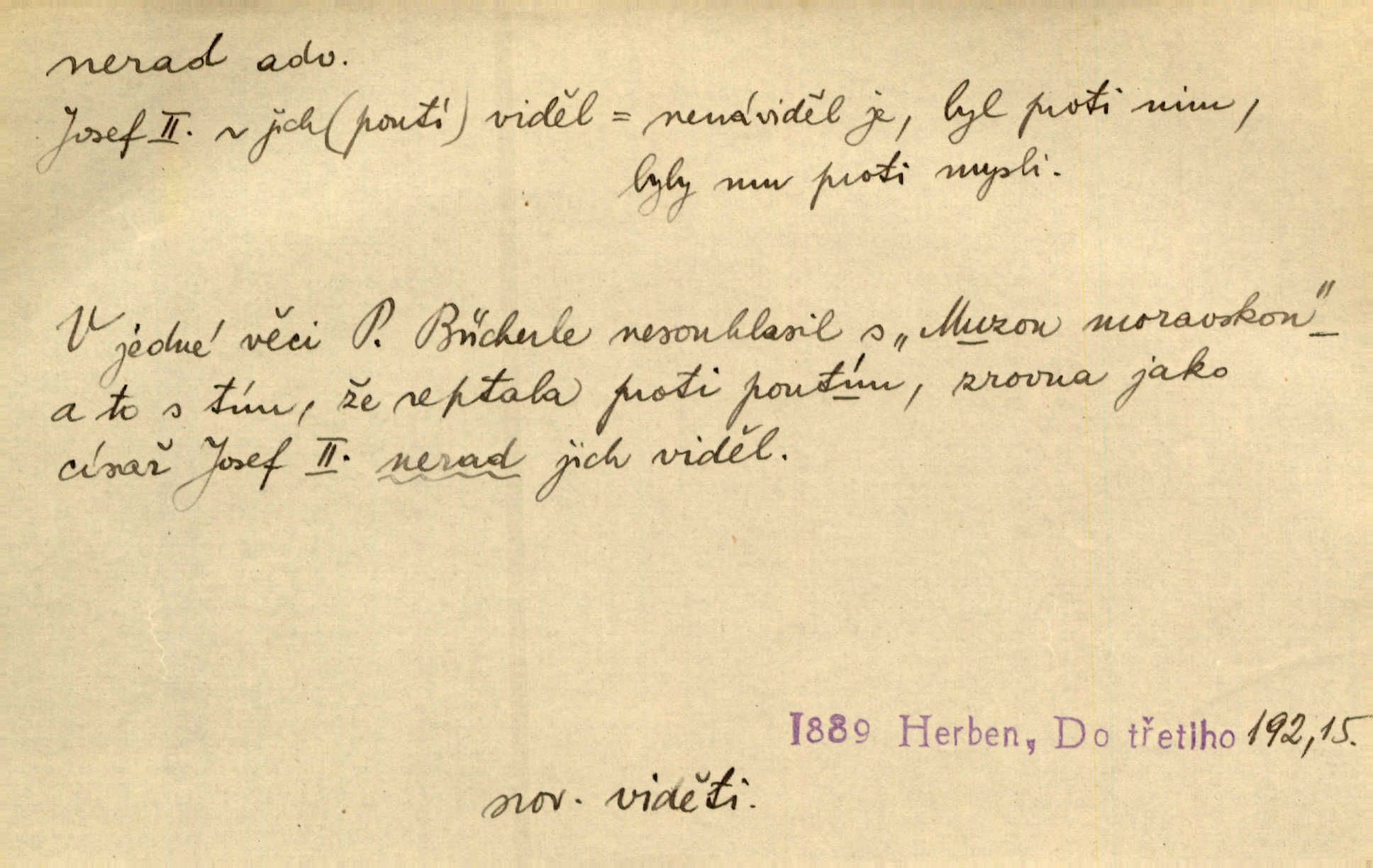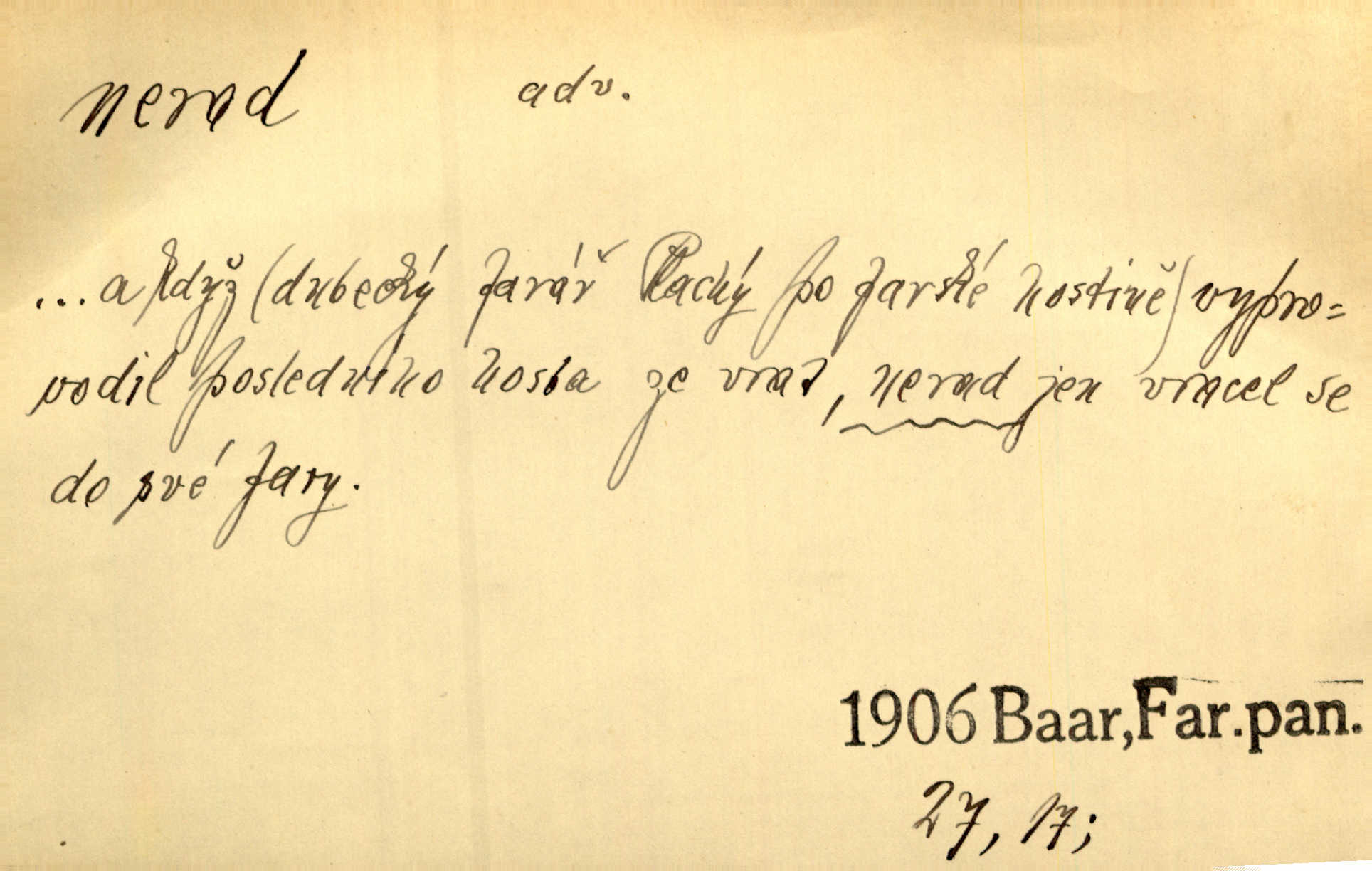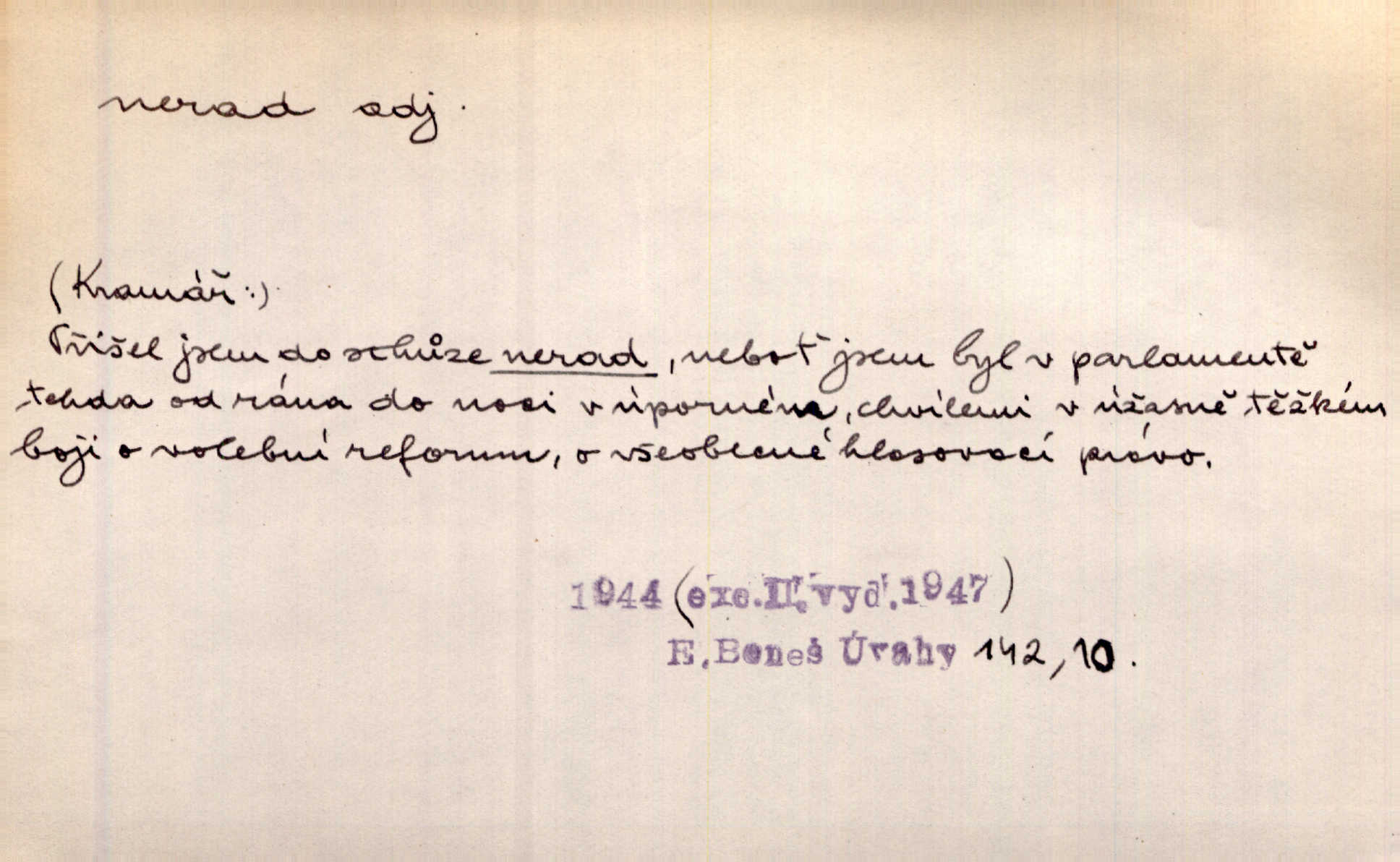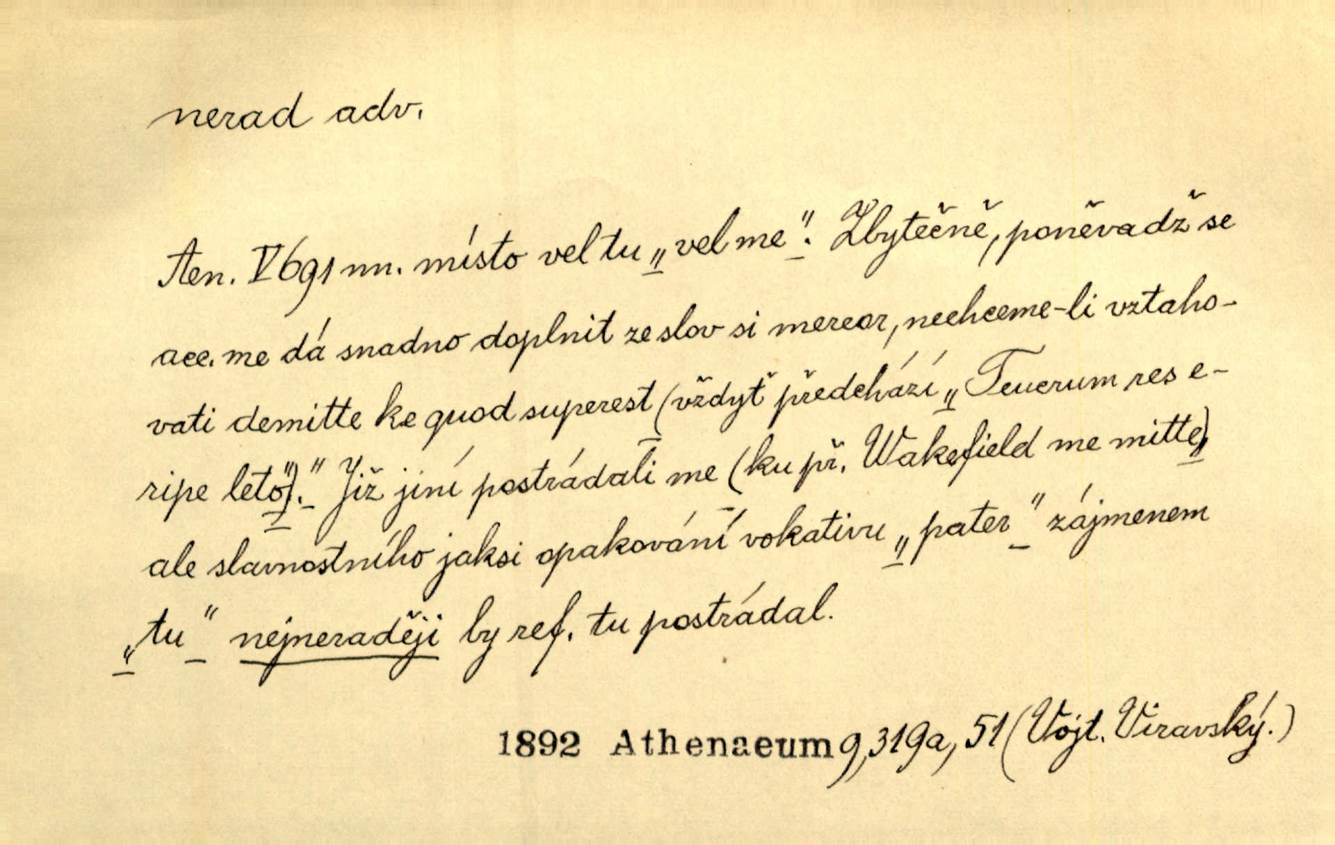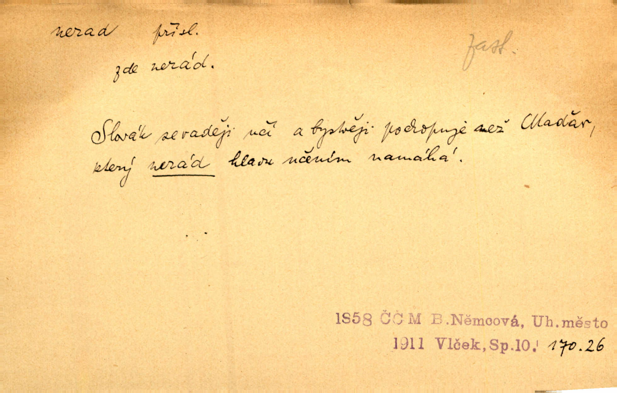 - nerad (arch. nerád) adj. (jen v nom. sg. a pl. všech tři rodů v tvaru neurčitém, zř. komp. adv. neraději) s nelibostí, s nechutí, s neochotou. Pozoroval již dávno, že si [princezna] ženicha nerada bere. Něm. Vy se mnou pořád tak nerad mluvíte! Rais. Matku svoji milovala paní Prošková velmi a nerada byla by ji od sebe pustila. Něm. Já myslím, že Lída s někým utekla; vy to nerad slyšíte, ale nemohu na nic jiného přijit. K. Čap. Neráda přijímám do své knihovny každou knihu. Schulz. Kněz biskup hrách asi nerad nechutná mu. Jir. [Hošík] líbal všeckny, nevšímaje si nic, je-li tomu host rád nebo nerad je-li mu vhod nebo nevhod. Havl. Nerad bych, aby vzalo za své, co více než sto let v rodině mé se udrželo bylo by mi nemilé. Svět. Královic byl rád, že získal zlatovlasou pannu, ale zas nerad, že ji má králi stříbrného zámku dát za koně Zlatohřiváka. Erb. Mládenci s ní ani nežertovali, a panny ji nerády měly ve společnosti neměly v lásce. Prav. Nerado se vstávalo — věru. Preis. Závadou srdečných pacientů jest odklad a co nejneraději opouštějí lůžko, kde je jim nejlépe. Čap. Ch. Matka čím dál, tím neraději viděla Petra na dvoře. Herb. D neúmyslně, nechtíc, proti své vůli. Když se oba kočáry k sobě přiblížily, švihl Kos po koních a jako by nerad zasáhl Kahla v druhém kočáře. Paleč. Třetí [ze zatčených] se přiznal, že on to byl, kdo mladého pána ťukl hákem, ale nerad. Čap. Ch. Naříkala nad broukem, jenž do světnice zabloudil, když nerada ho přimačkla knihou. Herb. Domnívala se, že muž nebo syn nejspíše neradi někomu ublížili, a lidé se jim mstí opovrhováním. Herb. D stěží, sotva, nesnadno. Který kůň jest slabého těla, tak že mu nazad odvisne, ten nerád tlustne. Lék. koň. Co jsme vssáli s mateřským mlékem, to nás po pětatřidceti letech nerádo opouští. Tyl. To už tak bývá, že to, na co nejvíce se těšíváme, nejneraději se vyplnívá. Svět.