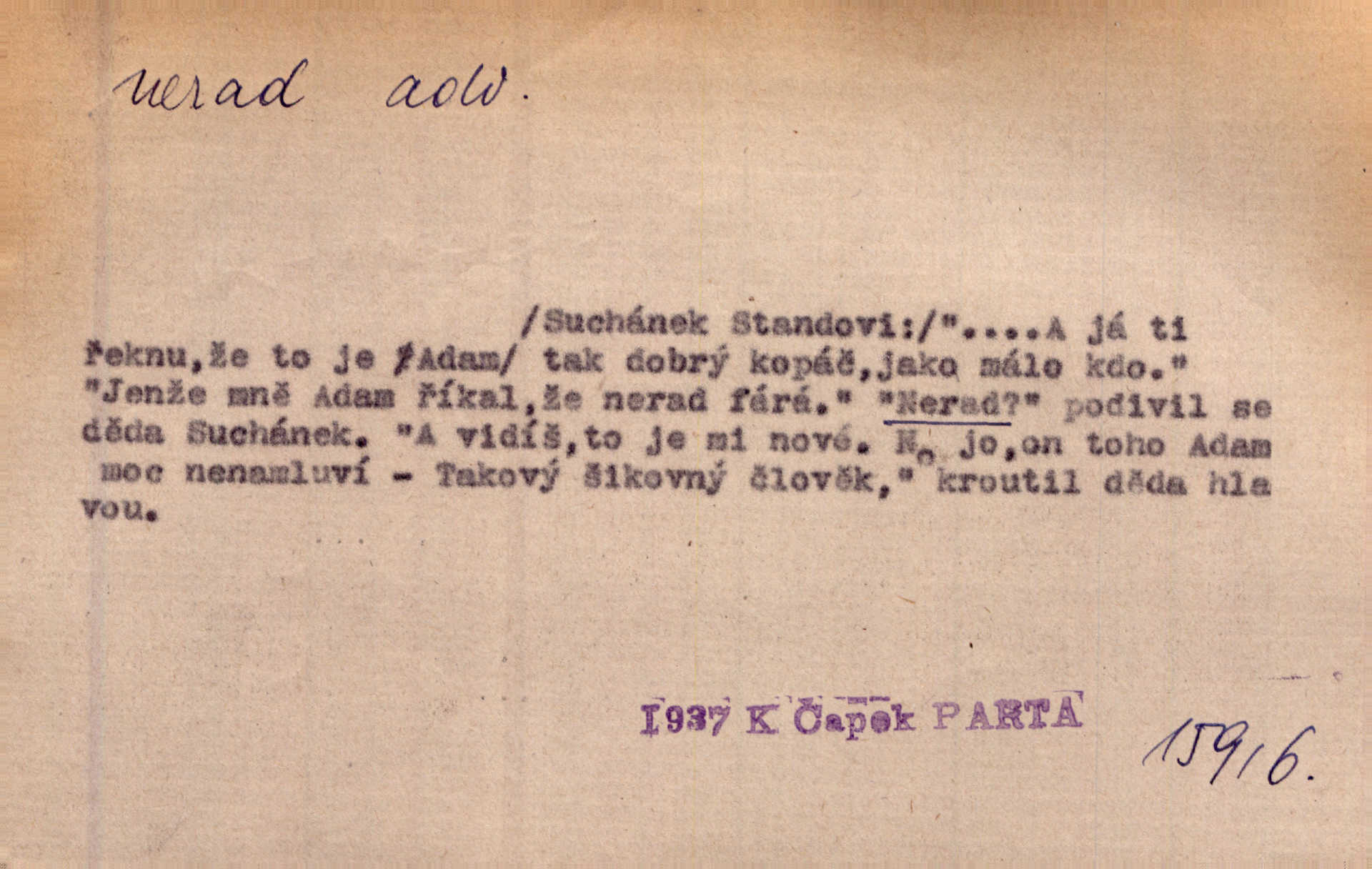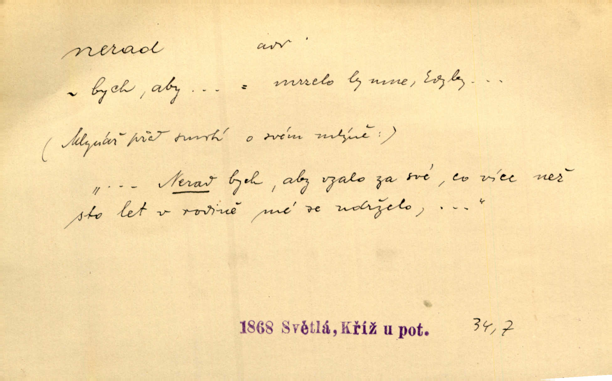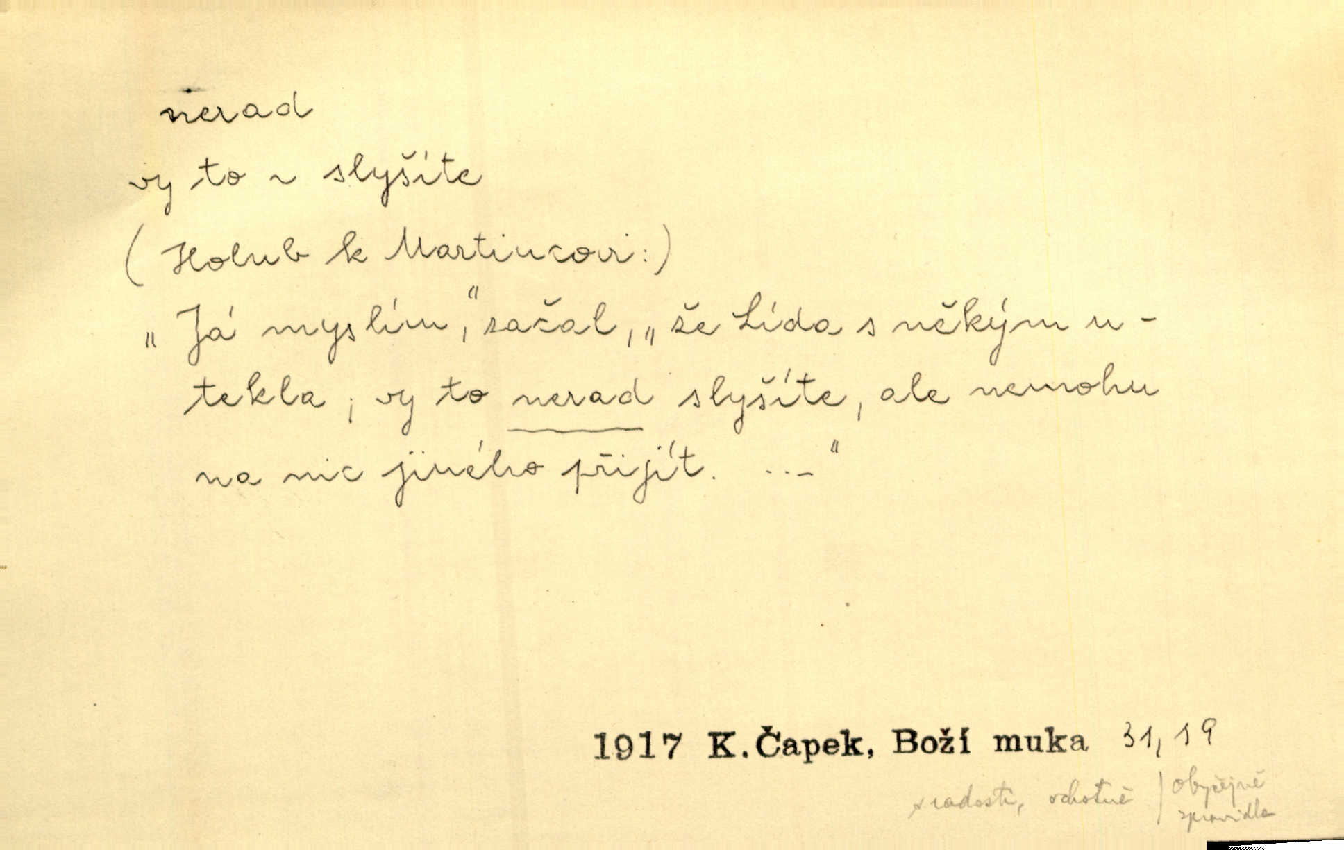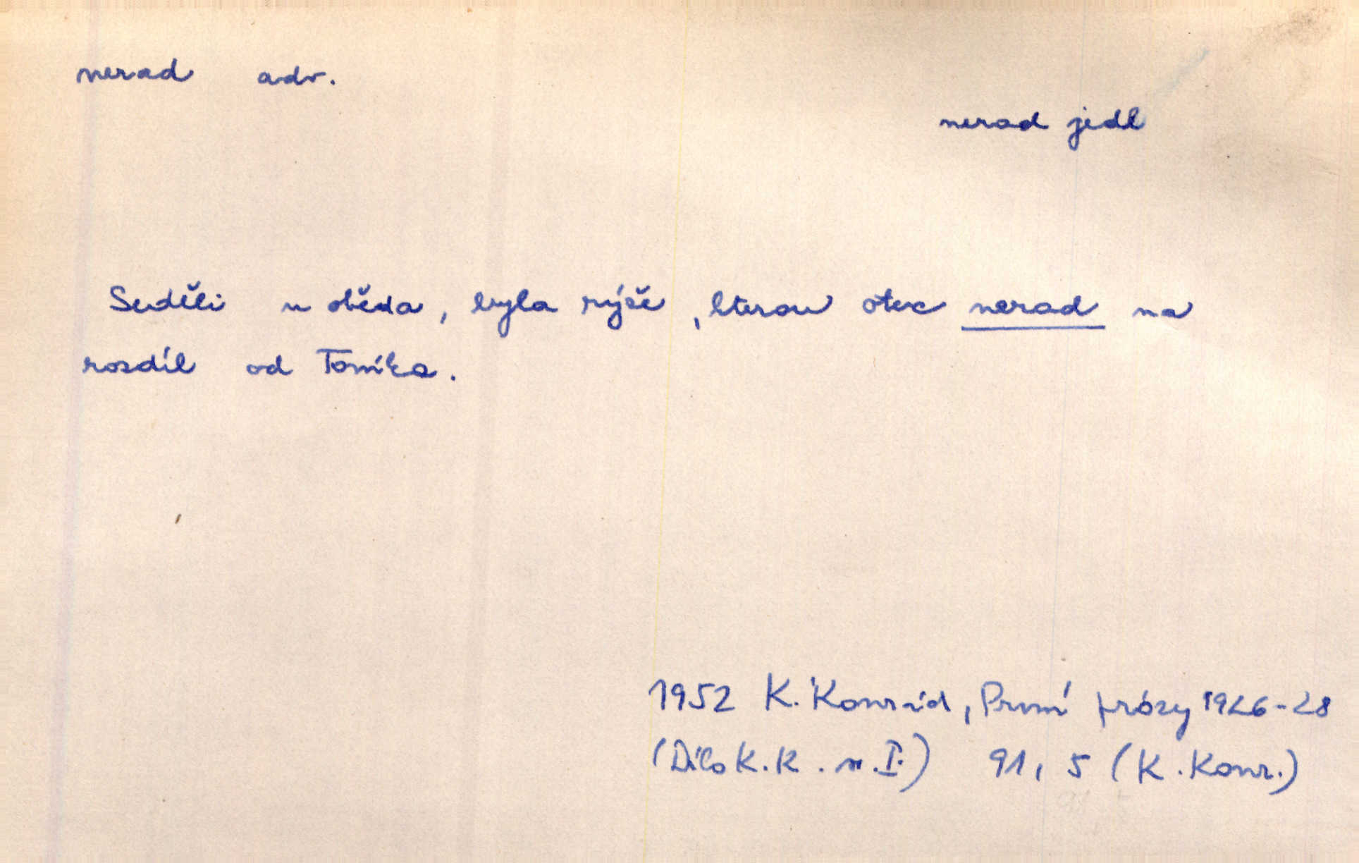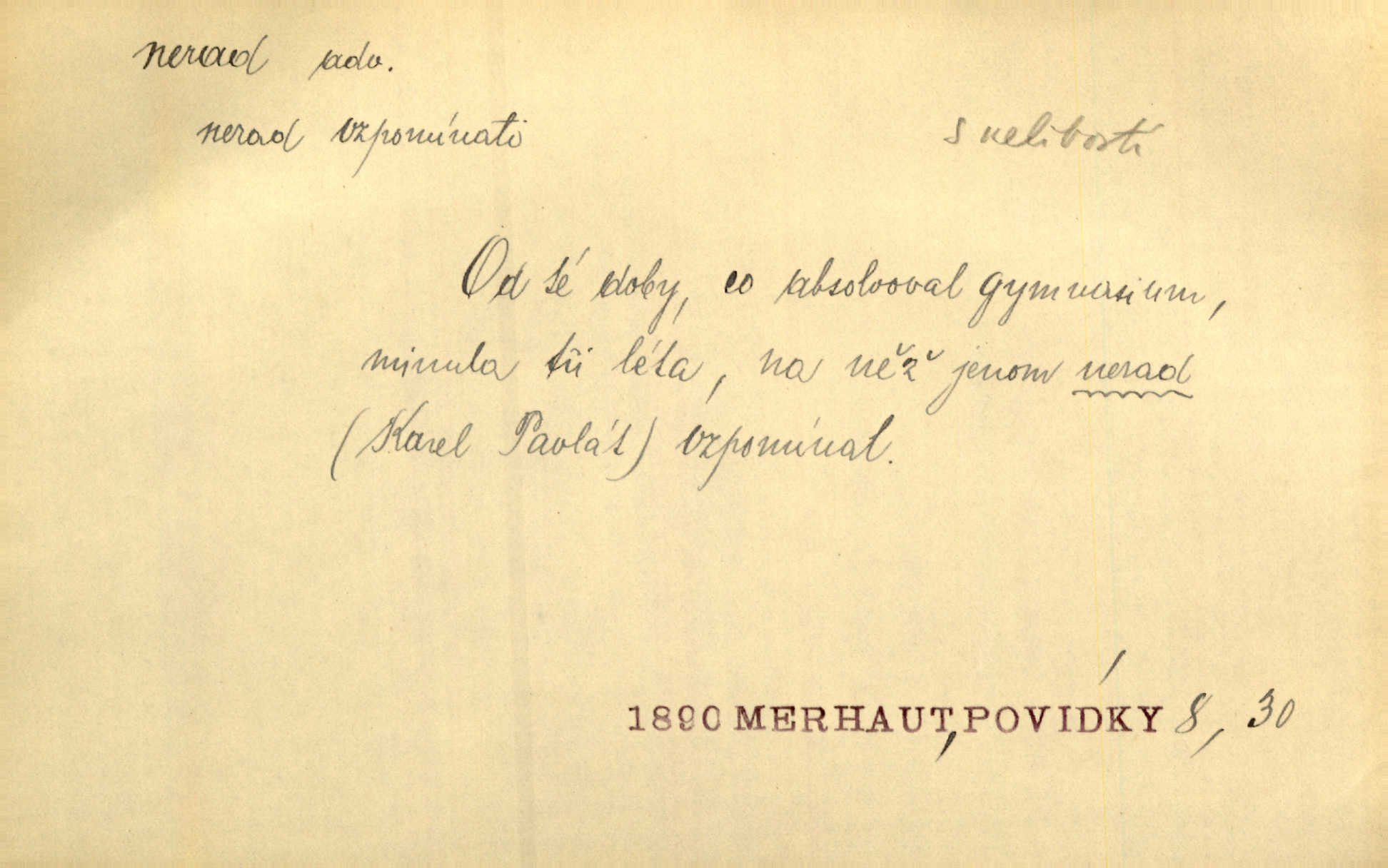 - nerad (arch. nerád) adj. (jen v nom. sg. a pl. všech tři rodů v tvaru neurčitém, zř. komp. adv. neraději) s nelibostí, s nechutí, s neochotou. Pozoroval již dávno, že si [princezna] ženicha nerada bere. Něm. Vy se mnou pořád tak nerad mluvíte! Rais. Matku svoji milovala paní Prošková velmi a nerada byla by ji od sebe pustila. Něm. Já myslím, že Lída s někým utekla; vy to nerad slyšíte, ale nemohu na nic jiného přijit. K. Čap. Neráda přijímám do své knihovny každou knihu. Schulz. Kněz biskup hrách asi nerad nechutná mu. Jir. [Hošík] líbal všeckny, nevšímaje si nic, je-li tomu host rád nebo nerad je-li mu vhod nebo nevhod. Havl. Nerad bych, aby vzalo za své, co více než sto let v rodině mé se udrželo bylo by mi nemilé. Svět. Královic byl rád, že získal zlatovlasou pannu, ale zas nerad, že ji má králi stříbrného zámku dát za koně Zlatohřiváka. Erb. Mládenci s ní ani nežertovali, a panny ji nerády měly ve společnosti neměly v lásce. Prav. Nerado se vstávalo — věru. Preis. Závadou srdečných pacientů jest odklad a co nejneraději opouštějí lůžko, kde je jim nejlépe. Čap. Ch. Matka čím dál, tím neraději viděla Petra na dvoře. Herb. D neúmyslně, nechtíc, proti své vůli. Když se oba kočáry k sobě přiblížily, švihl Kos po koních a jako by nerad zasáhl Kahla v druhém kočáře. Paleč. Třetí [ze zatčených] se přiznal, že on to byl, kdo mladého pána ťukl hákem, ale nerad. Čap. Ch. Naříkala nad broukem, jenž do světnice zabloudil, když nerada ho přimačkla knihou. Herb. Domnívala se, že muž nebo syn nejspíše neradi někomu ublížili, a lidé se jim mstí opovrhováním. Herb. D stěží, sotva, nesnadno. Který kůň jest slabého těla, tak že mu nazad odvisne, ten nerád tlustne. Lék. koň. Co jsme vssáli s mateřským mlékem, to nás po pětatřidceti letech nerádo opouští. Tyl. To už tak bývá, že to, na co nejvíce se těšíváme, nejneraději se vyplnívá. Svět.