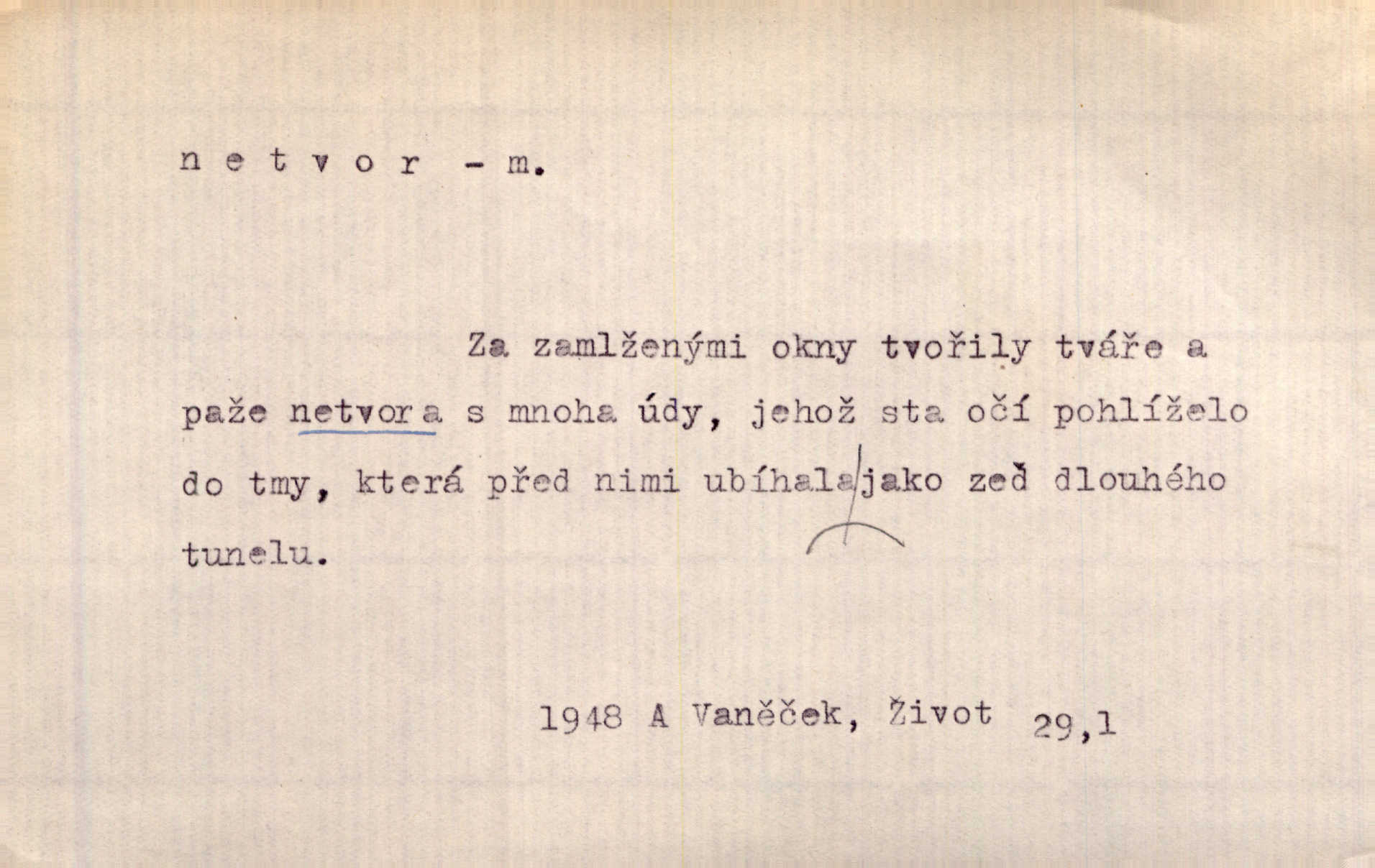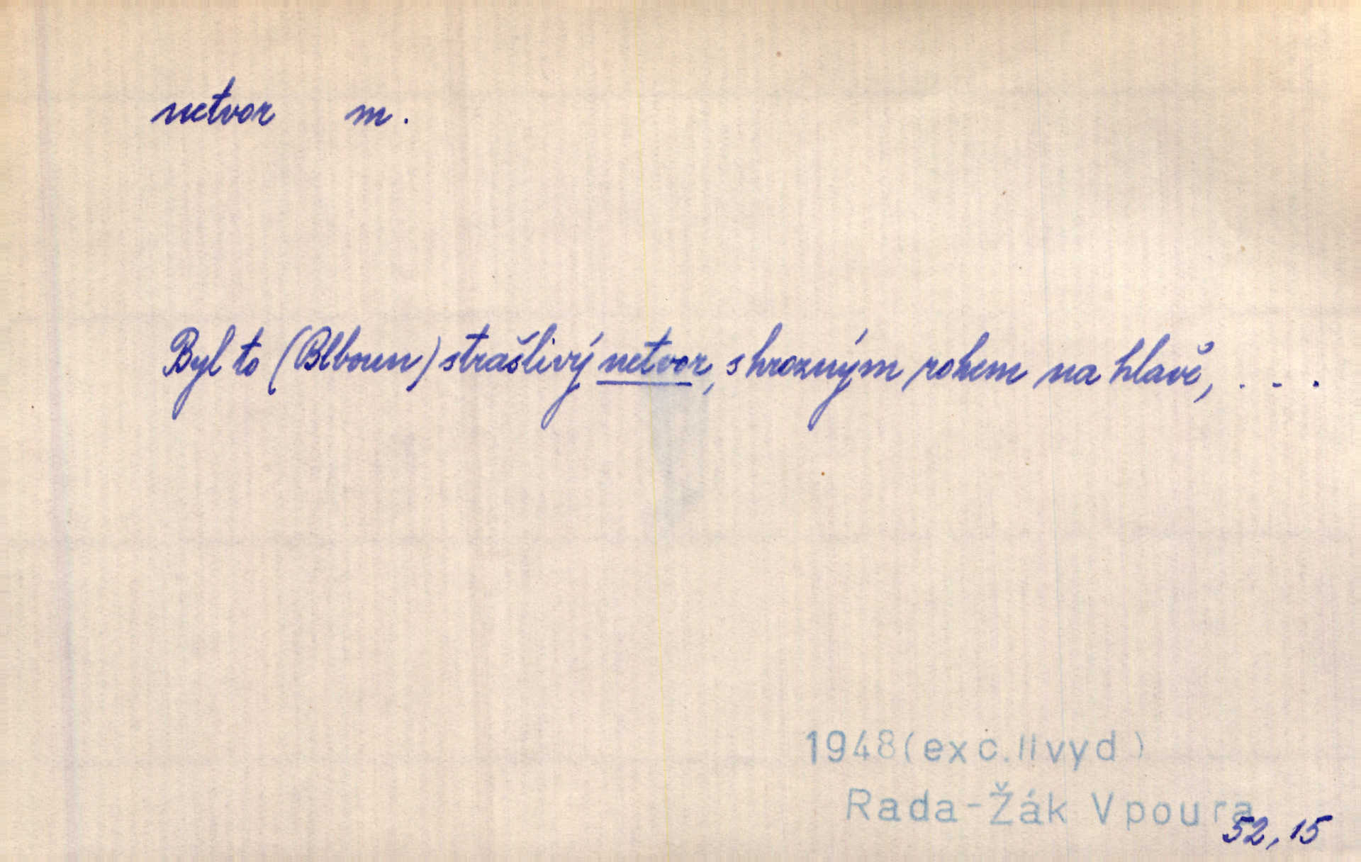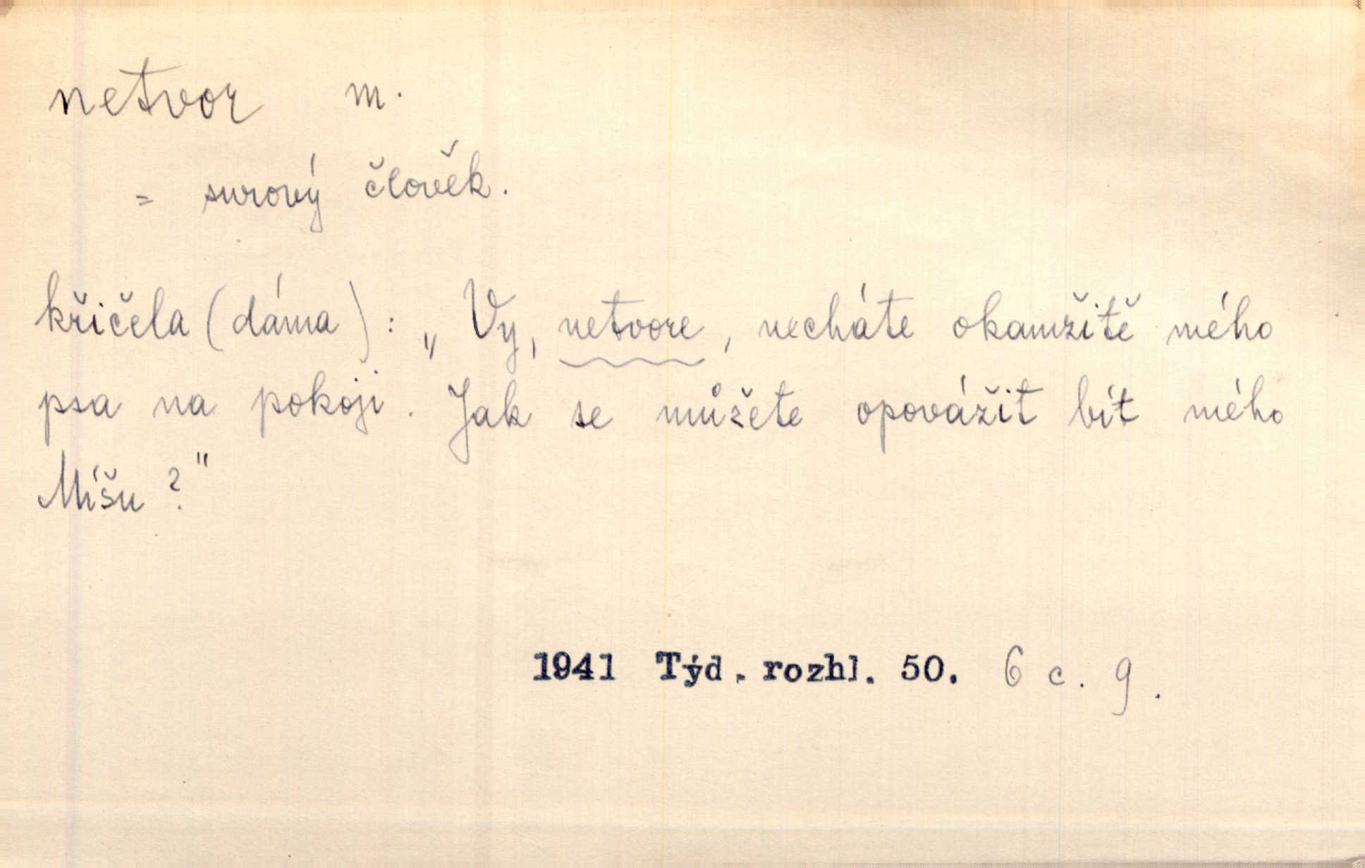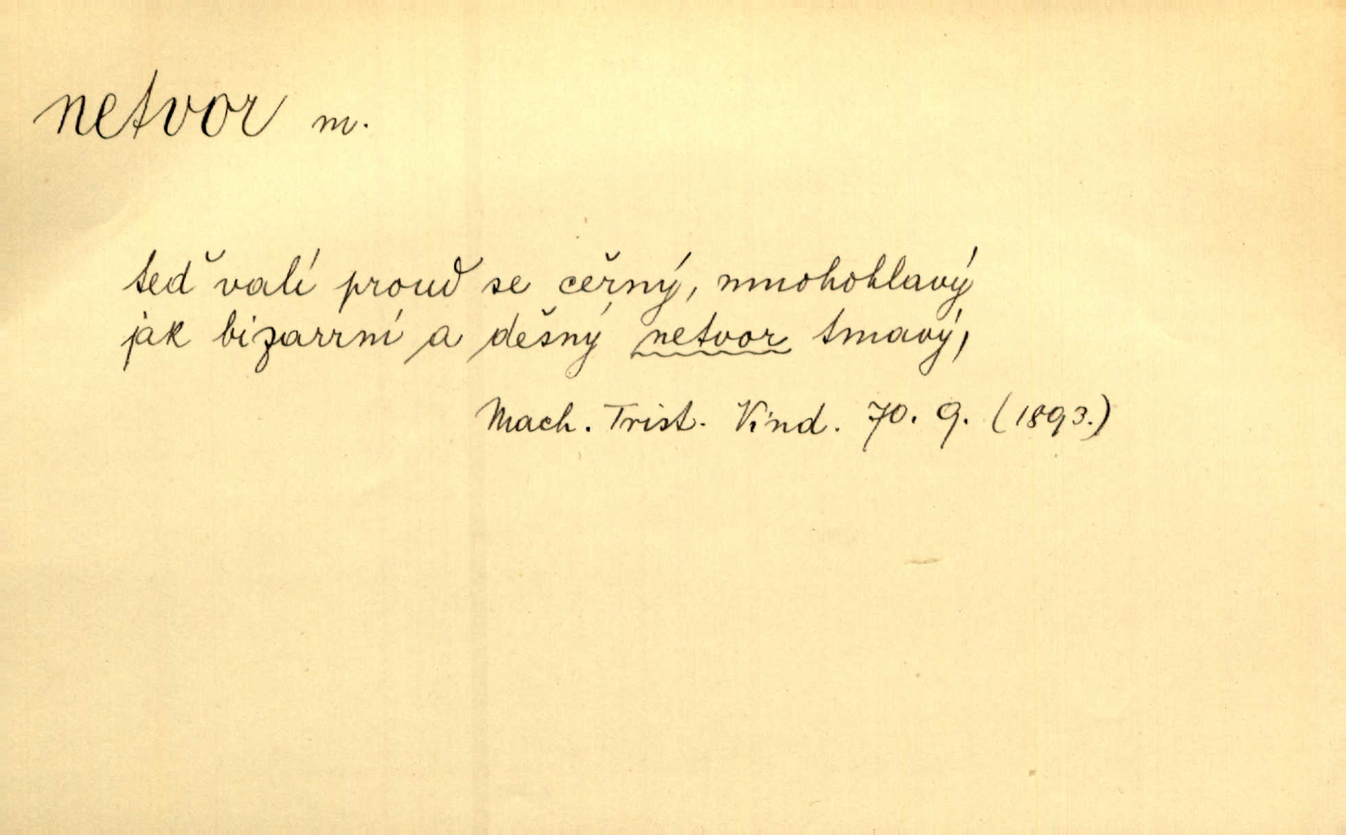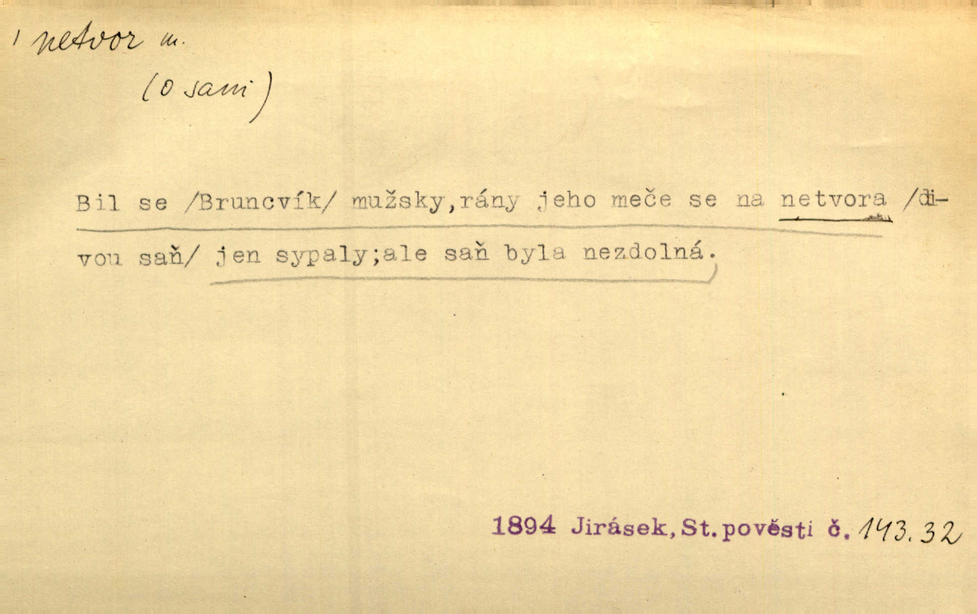 - netvor, -a m. (arch. netvora, -y f.) ošklivý, ohyzdný tvor, obluda, nestvůra. Bil se mužsky, rány jeho meče se na netvora [divou saň] jen sypaly. Jir. Podobal jsem se rytíři hledajícímu zakletou princeznu v zakletém, netvory střeženém zámku. Podl. V jeho [středověkého člověka] duši bylo tomu bezmála tak jako na jeho katedrálách: andělé a světci vedle netvorů a pekelníků. Šal. Indigový most, střežený porculánovým netvorem šesti hlav, vedl ke dveřím. Zey. Měsíc v obzoru vylézá z mračen netvorů. B. Jel. Fokas byl centuriem vojenským, netvor zakrnělé postavy. Mach. Ty — takové strašidlo, taková ohyzda, netvor — ty se opovažuješ o mne se ucházeti, mne si namlouvati. Kapp. [Mrak] vznášel se jako temný netvor. Rais. Vaše [pekelné] plameny a krvavá jezera, v nichž děsné netvory se hemží, zdají se mi rozkoší. Zey. Jeník nemohl pochopiti, kterak se jeho růžová sestra mohla v takovou netvoru přeměniti. Něm. Přen. Dvouhlavý netvor schismatu vystupuje hrozivěji a hrozivěji. Třeb. Černý netvor — bída — stála těsně před ním. Baar. D člověk zlý, nemravný, ukrutný. Jen hleď to malé neviňátko, netvore, matku mu vzíť bys chtěl? Krás. Jsou mezi nimi [opatrovníky] neurvalí surovci, brutální netvorové, kteří jednají s bezvědomým šílencem jako bezohlední žalářníci se vzdorovitým vězněm. Kronb. [Kníže k bratrovrahu:] Zde v poli nezbývá nám času, abychom s netvorem, jako jsi ty, činili dlouhé obřady. Hol. Pryč, hnusný netvore! Zey. D nadávka. [Dělník, nakládaje dubový kmen:] „Že pak tě, netvore! sojka nepolkla, dokavad jsi ještě žaludem byl!“ Obr. živ. Což se nemůžeš vyhnout, netvoro? Erb.