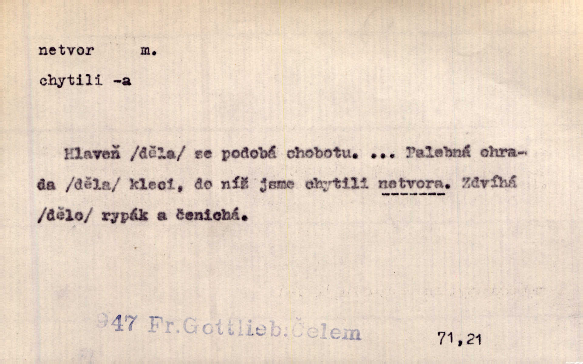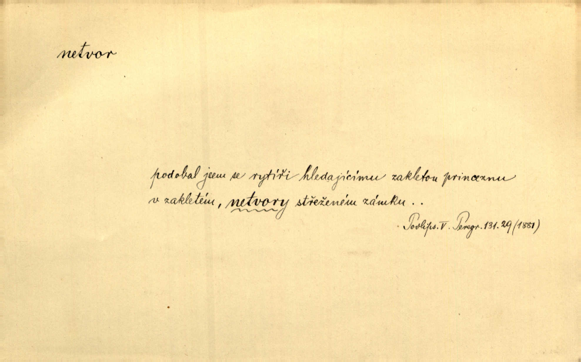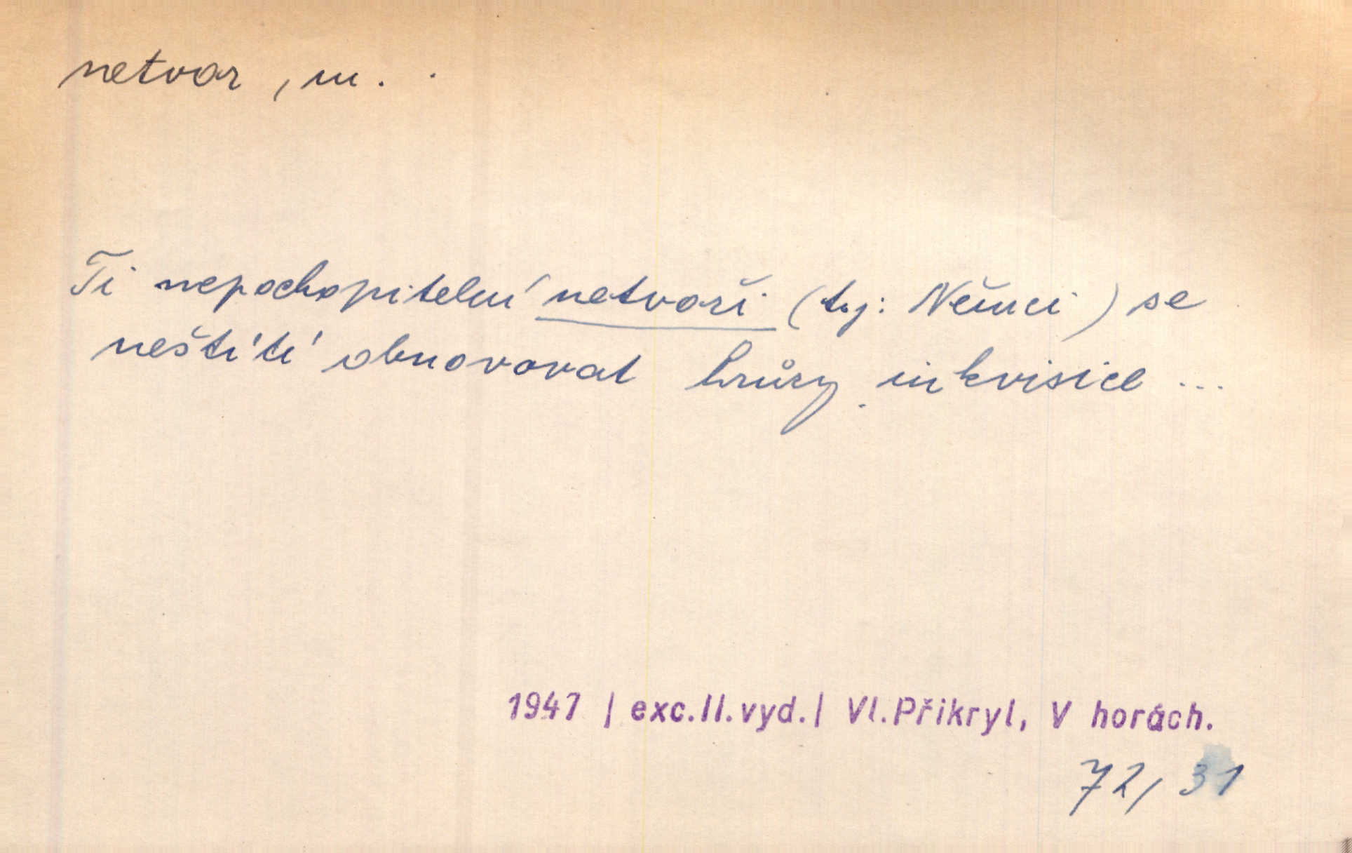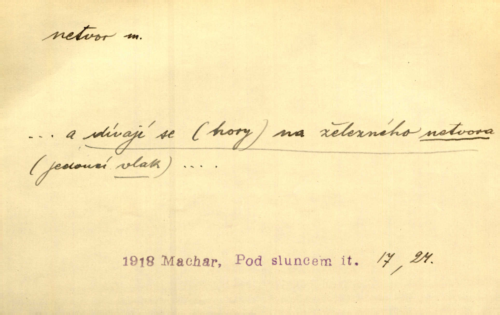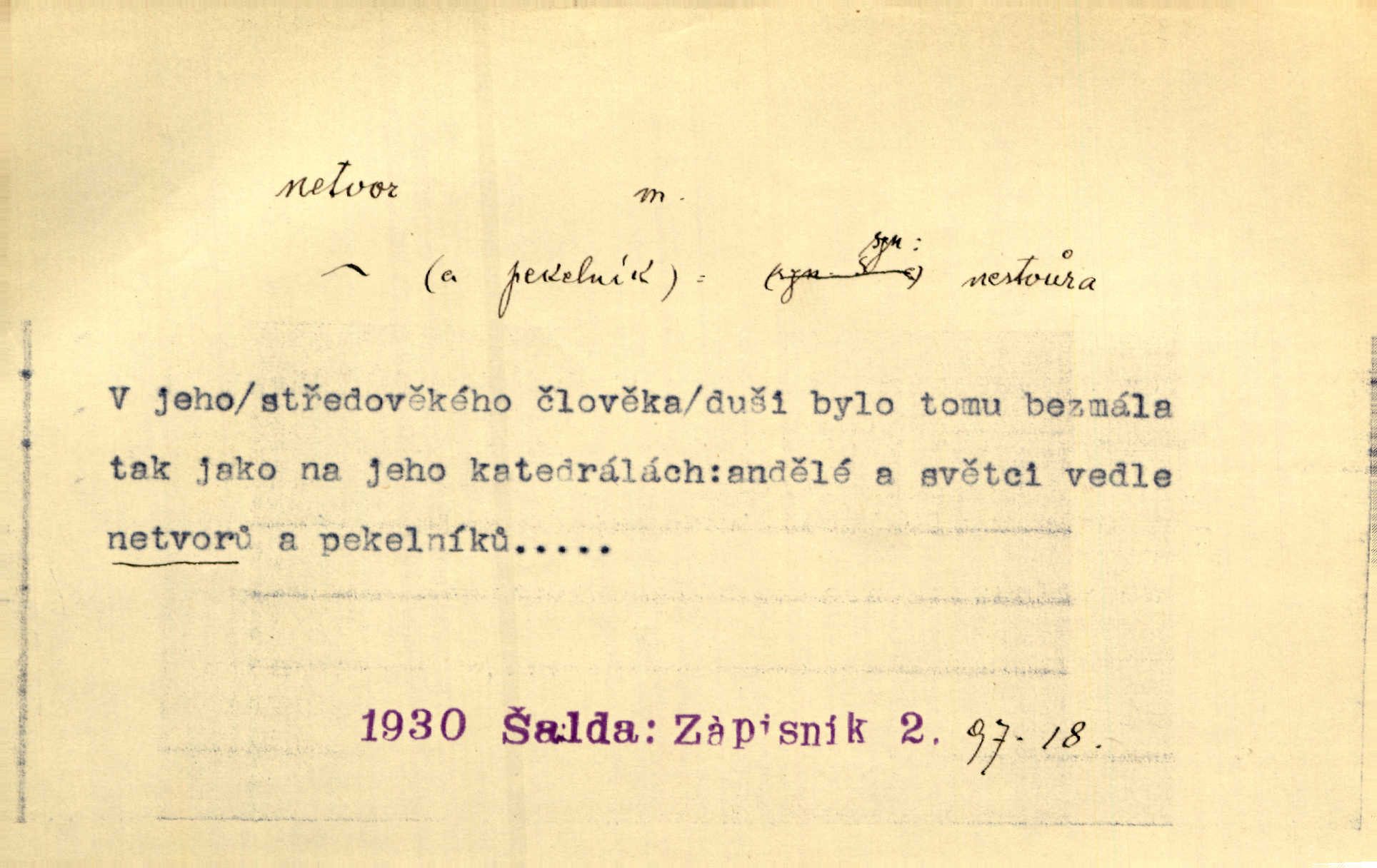 - netvor, -a m. (arch. netvora, -y f.) ošklivý, ohyzdný tvor, obluda, nestvůra. Bil se mužsky, rány jeho meče se na netvora [divou saň] jen sypaly. Jir. Podobal jsem se rytíři hledajícímu zakletou princeznu v zakletém, netvory střeženém zámku. Podl. V jeho [středověkého člověka] duši bylo tomu bezmála tak jako na jeho katedrálách: andělé a světci vedle netvorů a pekelníků. Šal. Indigový most, střežený porculánovým netvorem šesti hlav, vedl ke dveřím. Zey. Měsíc v obzoru vylézá z mračen netvorů. B. Jel. Fokas byl centuriem vojenským, netvor zakrnělé postavy. Mach. Ty — takové strašidlo, taková ohyzda, netvor — ty se opovažuješ o mne se ucházeti, mne si namlouvati. Kapp. [Mrak] vznášel se jako temný netvor. Rais. Vaše [pekelné] plameny a krvavá jezera, v nichž děsné netvory se hemží, zdají se mi rozkoší. Zey. Jeník nemohl pochopiti, kterak se jeho růžová sestra mohla v takovou netvoru přeměniti. Něm. Přen. Dvouhlavý netvor schismatu vystupuje hrozivěji a hrozivěji. Třeb. Černý netvor — bída — stála těsně před ním. Baar. D člověk zlý, nemravný, ukrutný. Jen hleď to malé neviňátko, netvore, matku mu vzíť bys chtěl? Krás. Jsou mezi nimi [opatrovníky] neurvalí surovci, brutální netvorové, kteří jednají s bezvědomým šílencem jako bezohlední žalářníci se vzdorovitým vězněm. Kronb. [Kníže k bratrovrahu:] Zde v poli nezbývá nám času, abychom s netvorem, jako jsi ty, činili dlouhé obřady. Hol. Pryč, hnusný netvore! Zey. D nadávka. [Dělník, nakládaje dubový kmen:] „Že pak tě, netvore! sojka nepolkla, dokavad jsi ještě žaludem byl!“ Obr. živ. Což se nemůžeš vyhnout, netvoro? Erb.