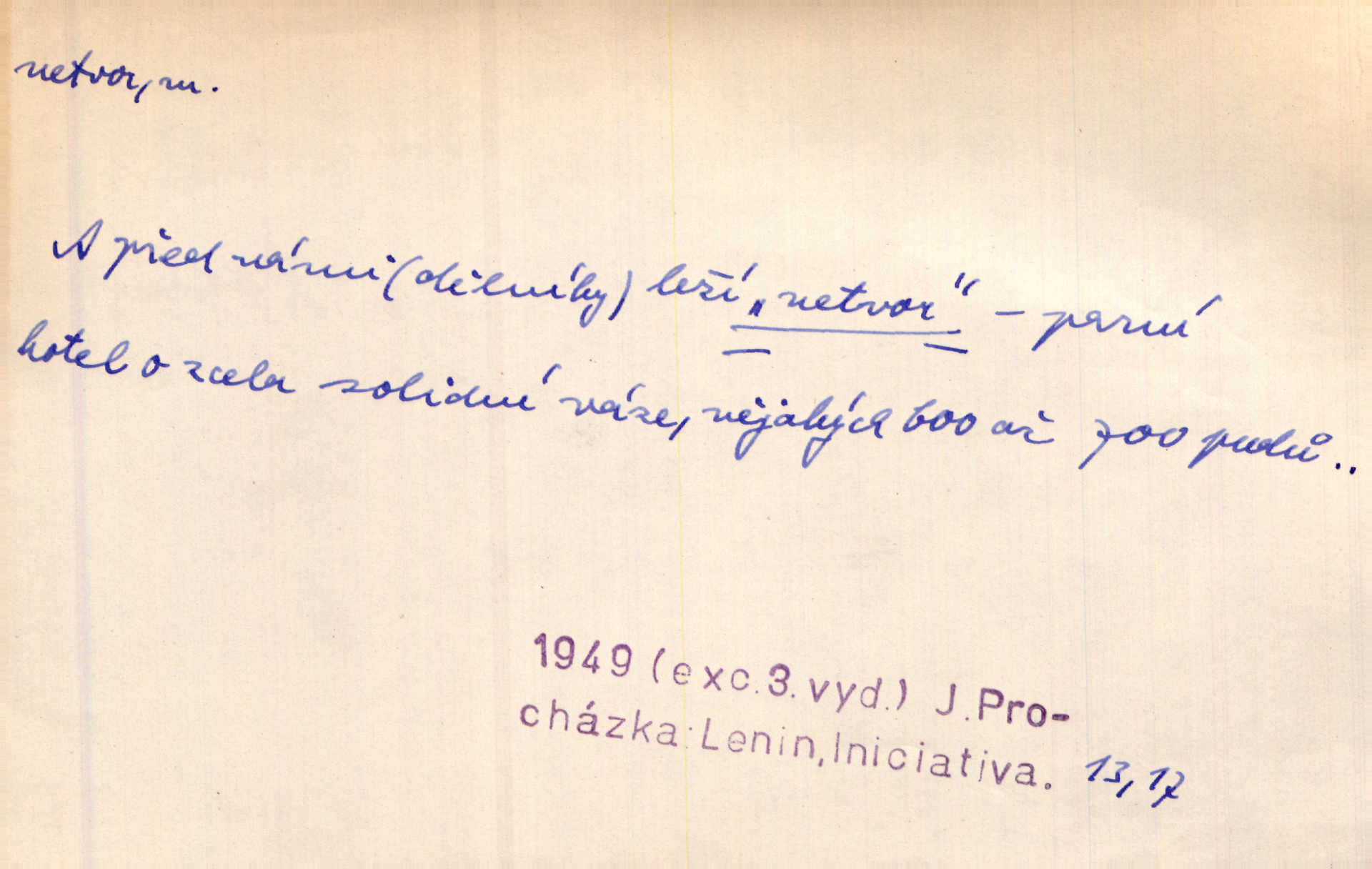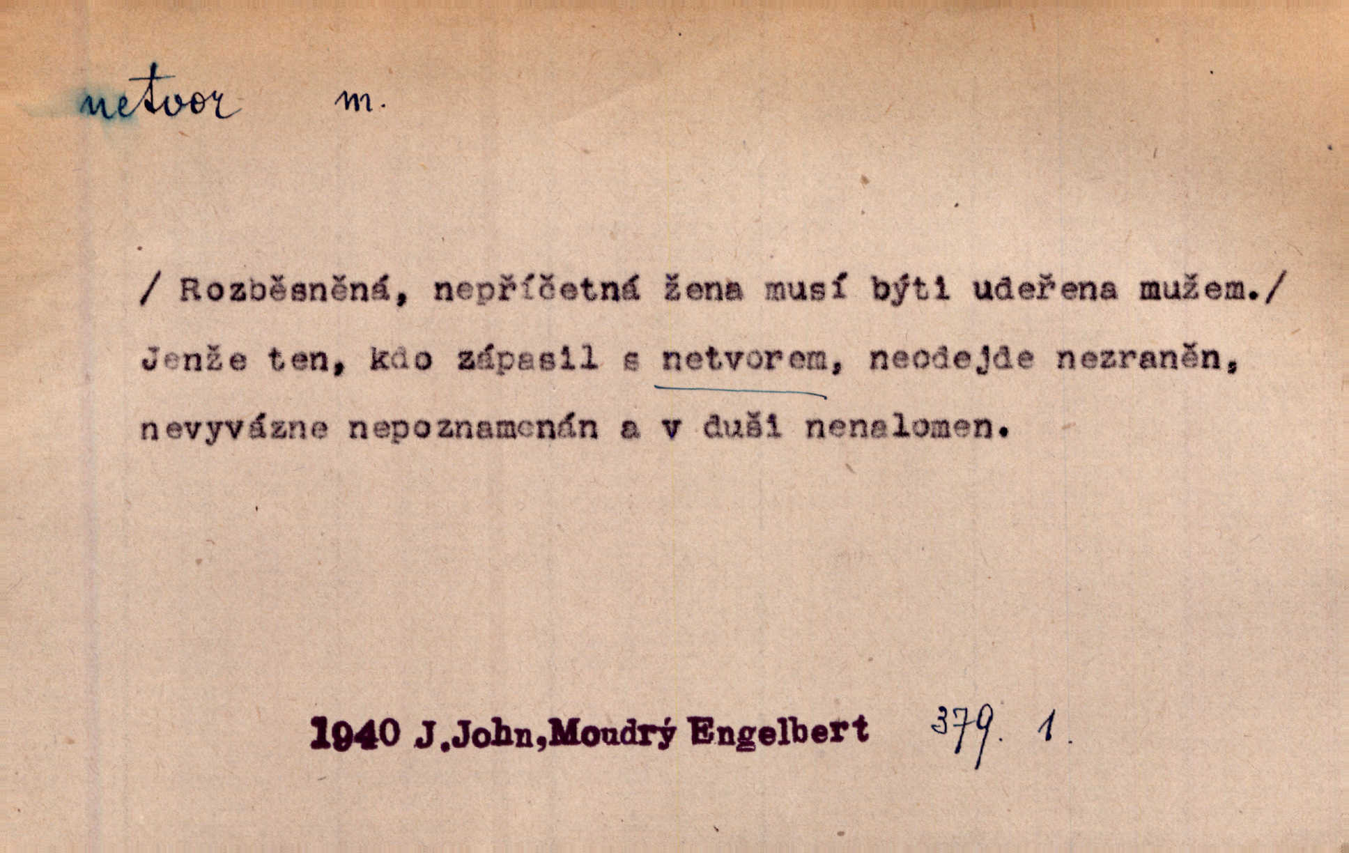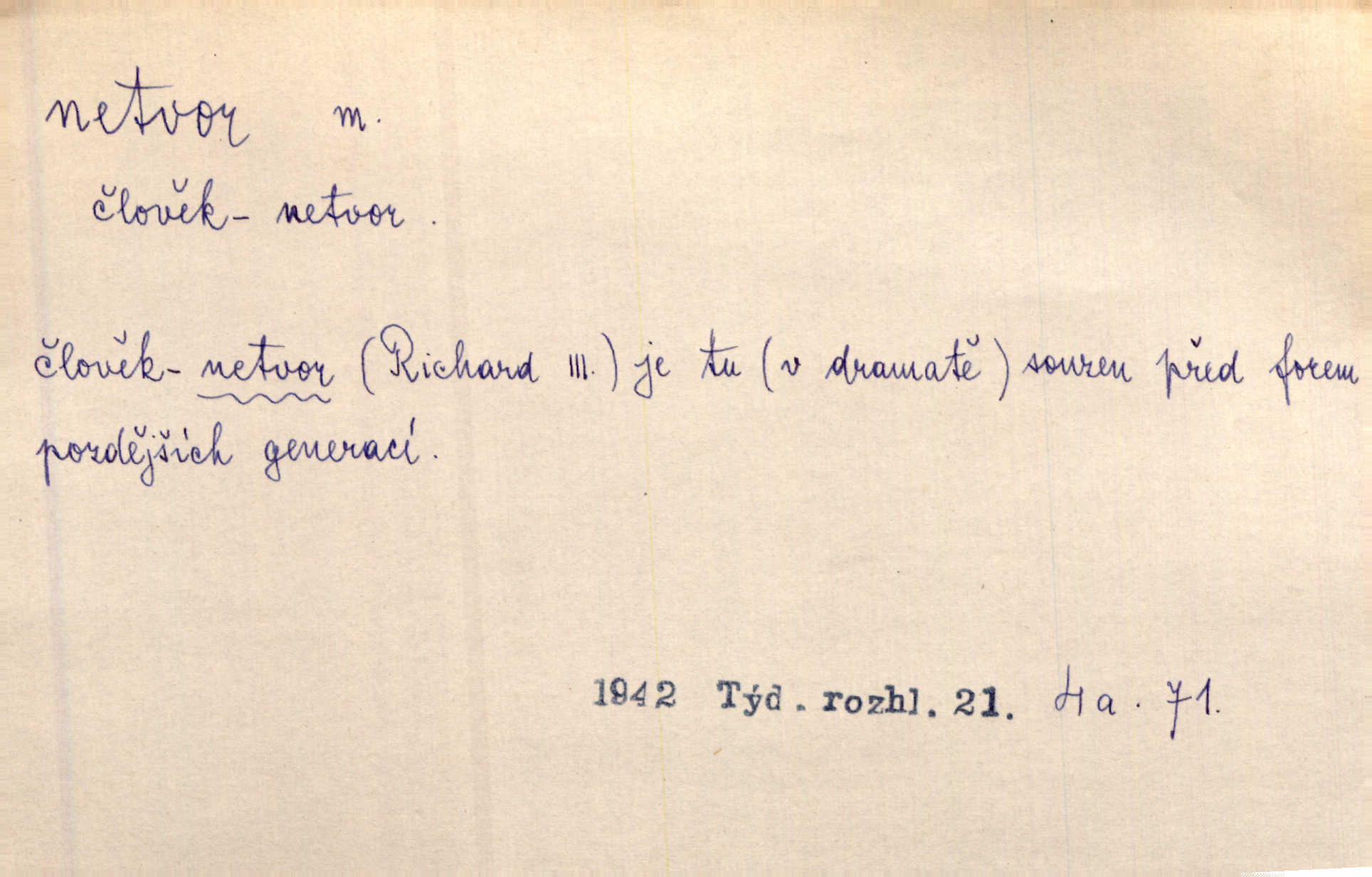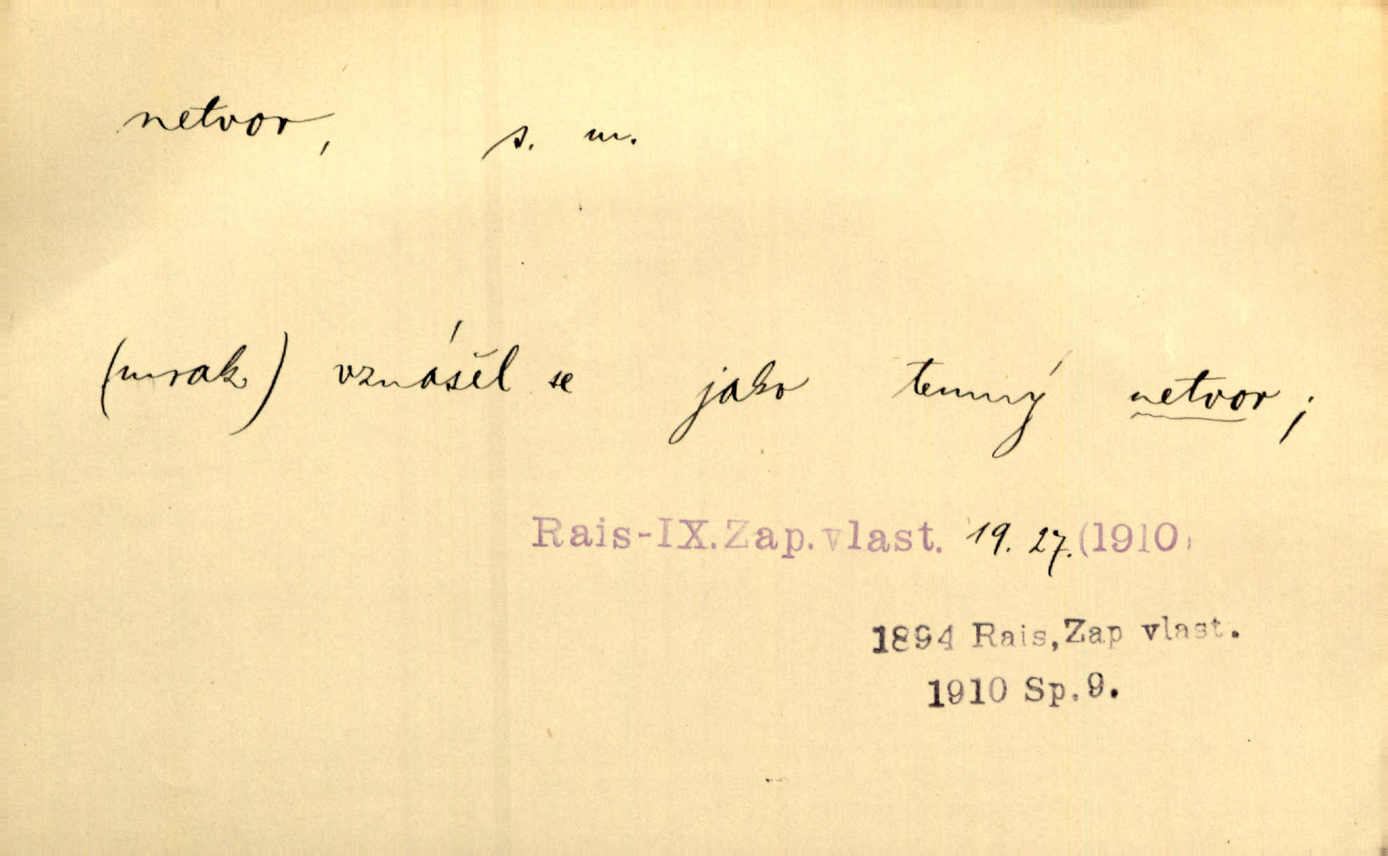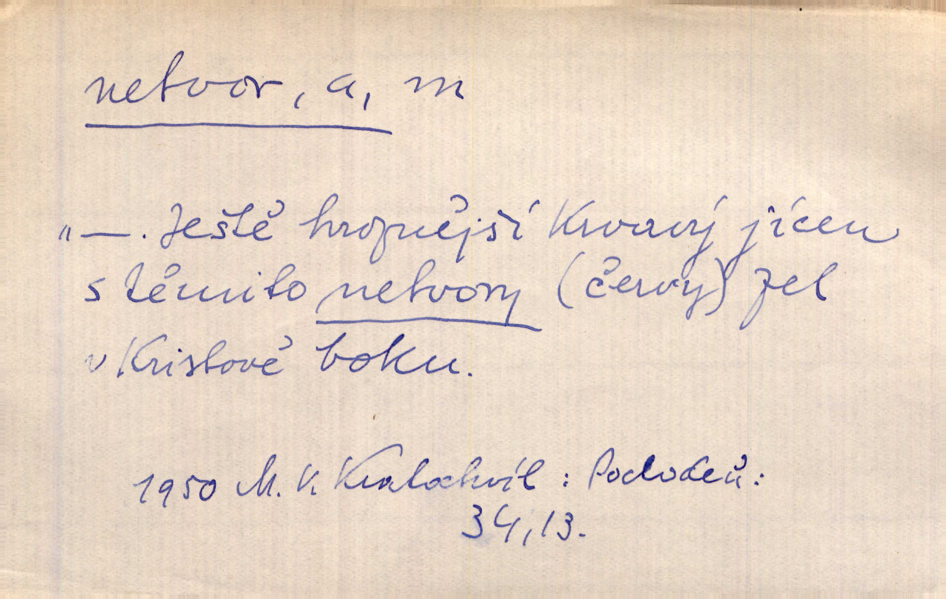 - netvor, -a m. (arch. netvora, -y f.) ošklivý, ohyzdný tvor, obluda, nestvůra. Bil se mužsky, rány jeho meče se na netvora [divou saň] jen sypaly. Jir. Podobal jsem se rytíři hledajícímu zakletou princeznu v zakletém, netvory střeženém zámku. Podl. V jeho [středověkého člověka] duši bylo tomu bezmála tak jako na jeho katedrálách: andělé a světci vedle netvorů a pekelníků. Šal. Indigový most, střežený porculánovým netvorem šesti hlav, vedl ke dveřím. Zey. Měsíc v obzoru vylézá z mračen netvorů. B. Jel. Fokas byl centuriem vojenským, netvor zakrnělé postavy. Mach. Ty — takové strašidlo, taková ohyzda, netvor — ty se opovažuješ o mne se ucházeti, mne si namlouvati. Kapp. [Mrak] vznášel se jako temný netvor. Rais. Vaše [pekelné] plameny a krvavá jezera, v nichž děsné netvory se hemží, zdají se mi rozkoší. Zey. Jeník nemohl pochopiti, kterak se jeho růžová sestra mohla v takovou netvoru přeměniti. Něm. Přen. Dvouhlavý netvor schismatu vystupuje hrozivěji a hrozivěji. Třeb. Černý netvor — bída — stála těsně před ním. Baar. D člověk zlý, nemravný, ukrutný. Jen hleď to malé neviňátko, netvore, matku mu vzíť bys chtěl? Krás. Jsou mezi nimi [opatrovníky] neurvalí surovci, brutální netvorové, kteří jednají s bezvědomým šílencem jako bezohlední žalářníci se vzdorovitým vězněm. Kronb. [Kníže k bratrovrahu:] Zde v poli nezbývá nám času, abychom s netvorem, jako jsi ty, činili dlouhé obřady. Hol. Pryč, hnusný netvore! Zey. D nadávka. [Dělník, nakládaje dubový kmen:] „Že pak tě, netvore! sojka nepolkla, dokavad jsi ještě žaludem byl!“ Obr. živ. Což se nemůžeš vyhnout, netvoro? Erb.