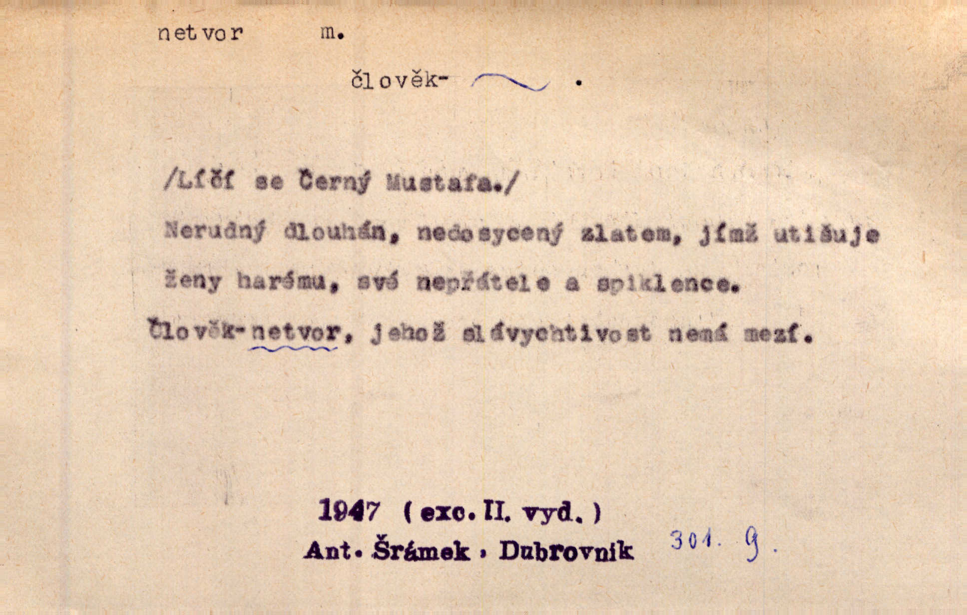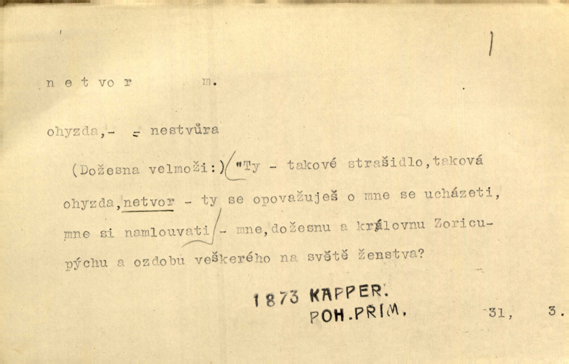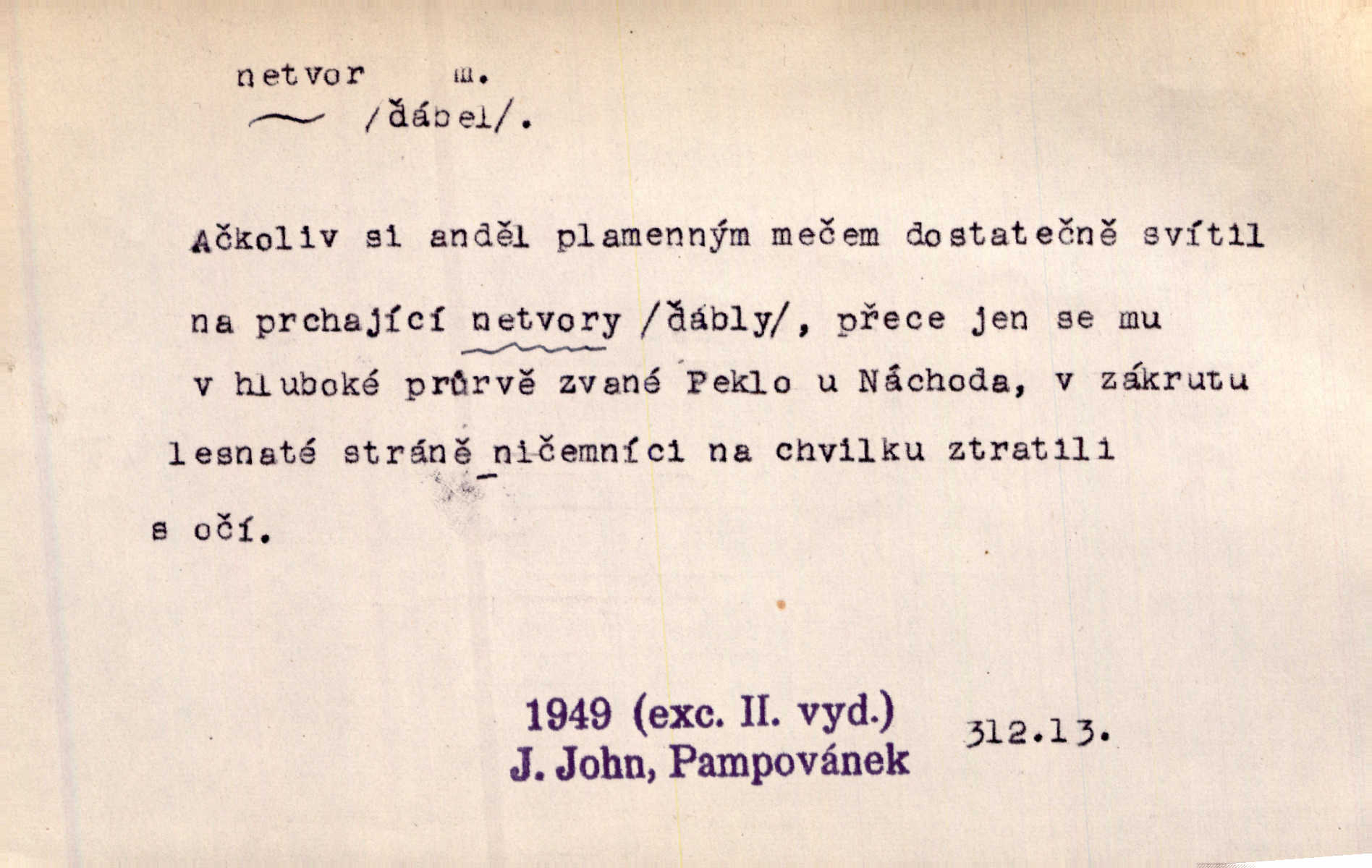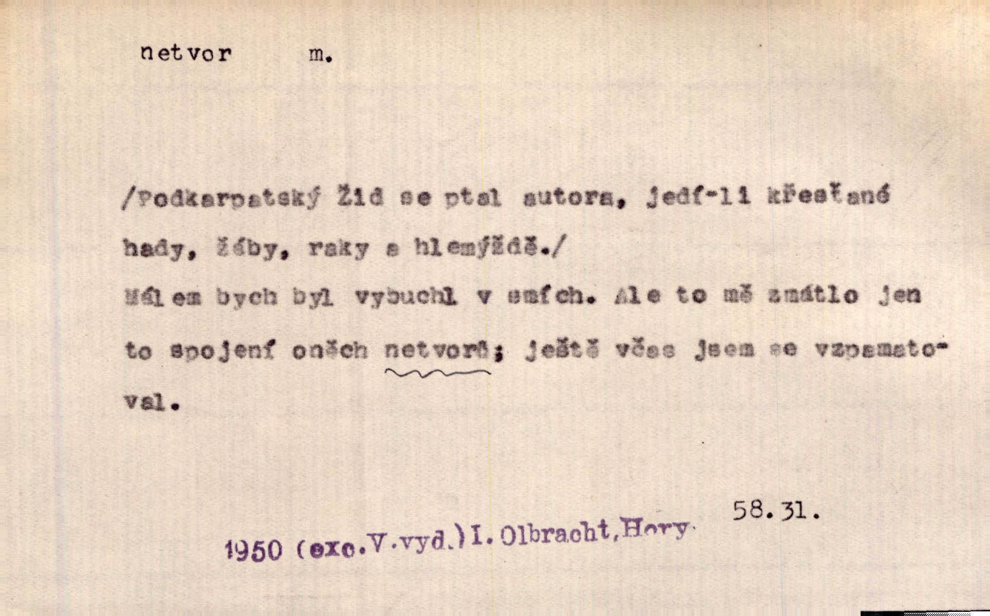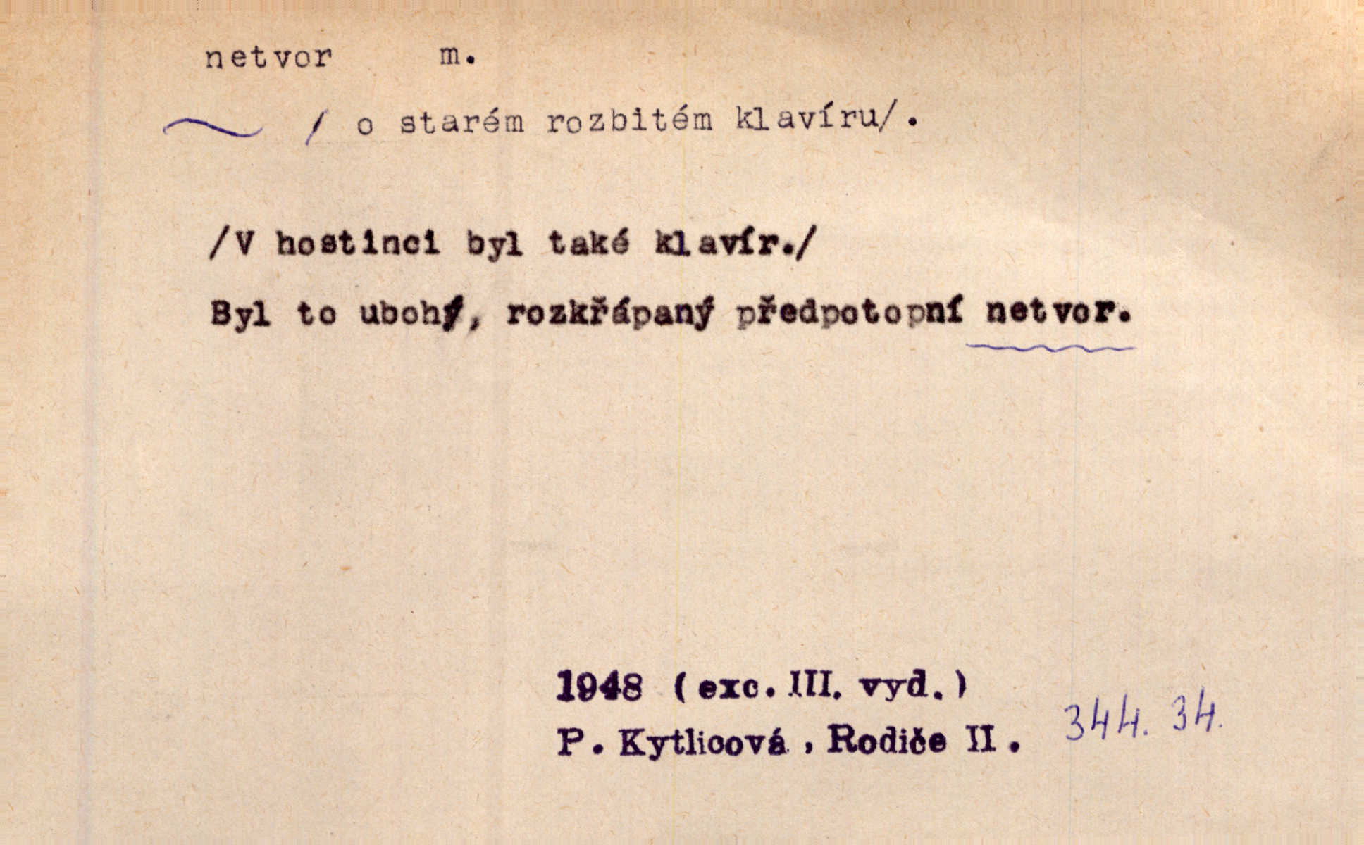 - netvor, -a m. (arch. netvora, -y f.) ošklivý, ohyzdný tvor, obluda, nestvůra. Bil se mužsky, rány jeho meče se na netvora [divou saň] jen sypaly. Jir. Podobal jsem se rytíři hledajícímu zakletou princeznu v zakletém, netvory střeženém zámku. Podl. V jeho [středověkého člověka] duši bylo tomu bezmála tak jako na jeho katedrálách: andělé a světci vedle netvorů a pekelníků. Šal. Indigový most, střežený porculánovým netvorem šesti hlav, vedl ke dveřím. Zey. Měsíc v obzoru vylézá z mračen netvorů. B. Jel. Fokas byl centuriem vojenským, netvor zakrnělé postavy. Mach. Ty — takové strašidlo, taková ohyzda, netvor — ty se opovažuješ o mne se ucházeti, mne si namlouvati. Kapp. [Mrak] vznášel se jako temný netvor. Rais. Vaše [pekelné] plameny a krvavá jezera, v nichž děsné netvory se hemží, zdají se mi rozkoší. Zey. Jeník nemohl pochopiti, kterak se jeho růžová sestra mohla v takovou netvoru přeměniti. Něm. Přen. Dvouhlavý netvor schismatu vystupuje hrozivěji a hrozivěji. Třeb. Černý netvor — bída — stála těsně před ním. Baar. D člověk zlý, nemravný, ukrutný. Jen hleď to malé neviňátko, netvore, matku mu vzíť bys chtěl? Krás. Jsou mezi nimi [opatrovníky] neurvalí surovci, brutální netvorové, kteří jednají s bezvědomým šílencem jako bezohlední žalářníci se vzdorovitým vězněm. Kronb. [Kníže k bratrovrahu:] Zde v poli nezbývá nám času, abychom s netvorem, jako jsi ty, činili dlouhé obřady. Hol. Pryč, hnusný netvore! Zey. D nadávka. [Dělník, nakládaje dubový kmen:] „Že pak tě, netvore! sojka nepolkla, dokavad jsi ještě žaludem byl!“ Obr. živ. Což se nemůžeš vyhnout, netvoro? Erb.