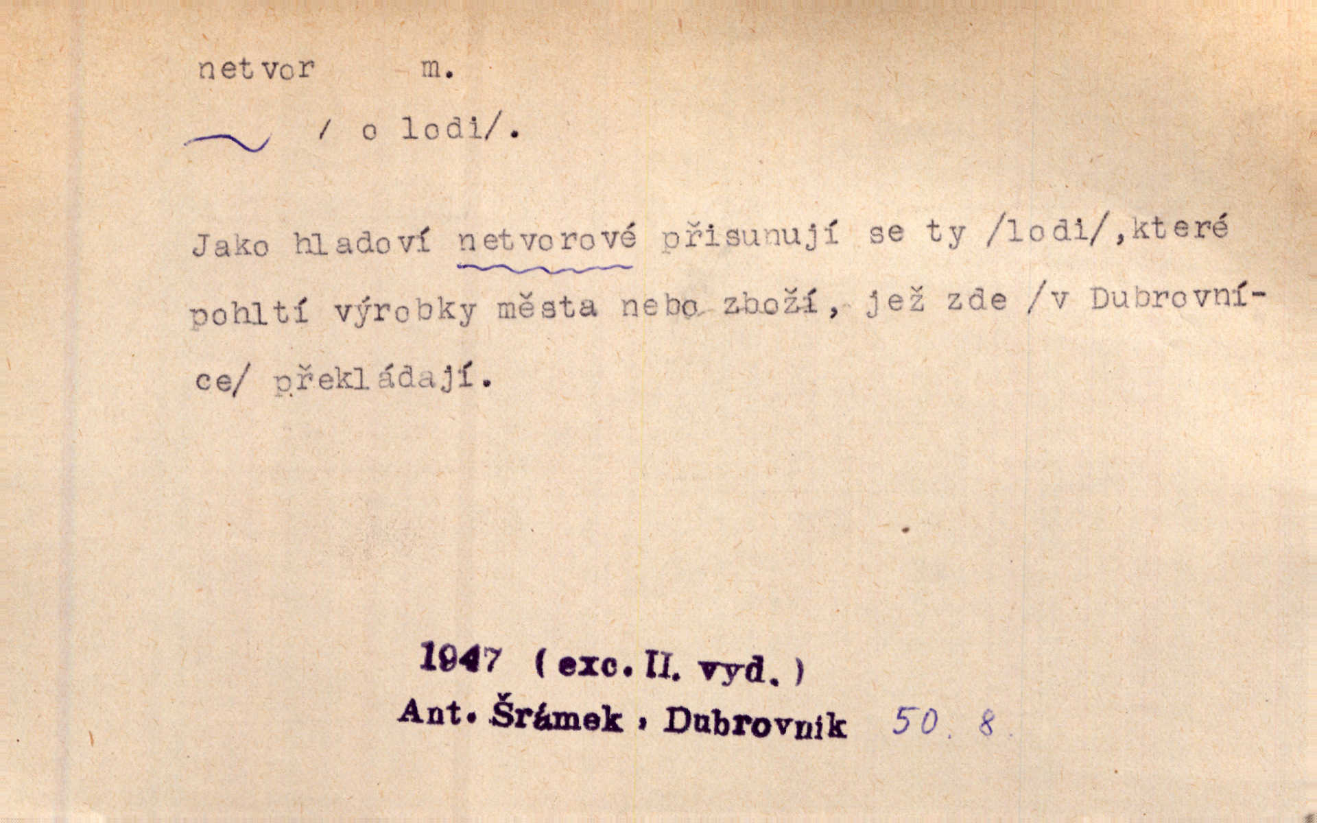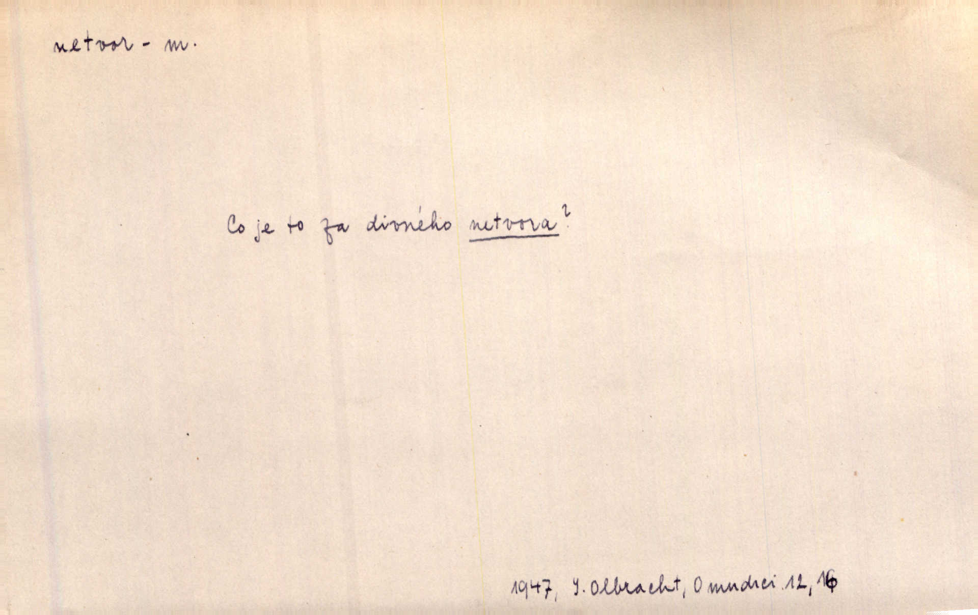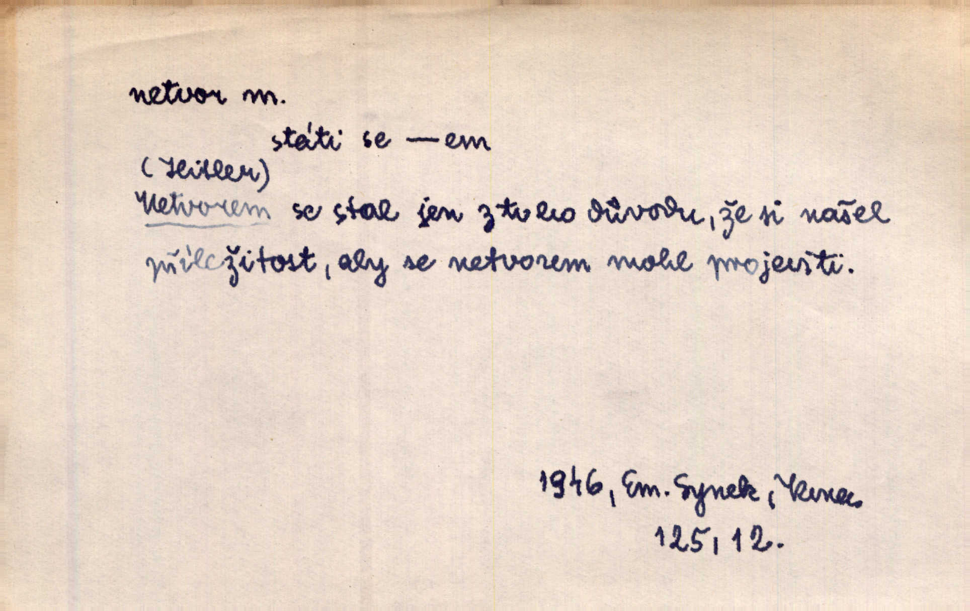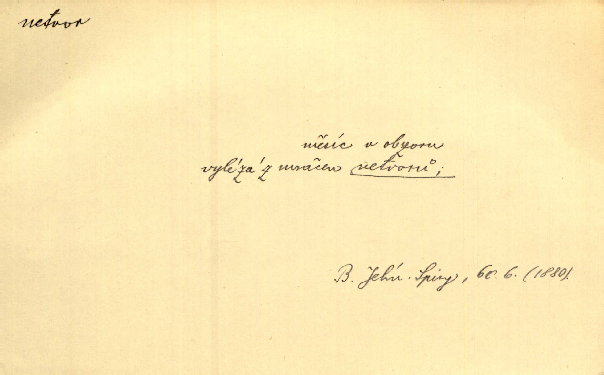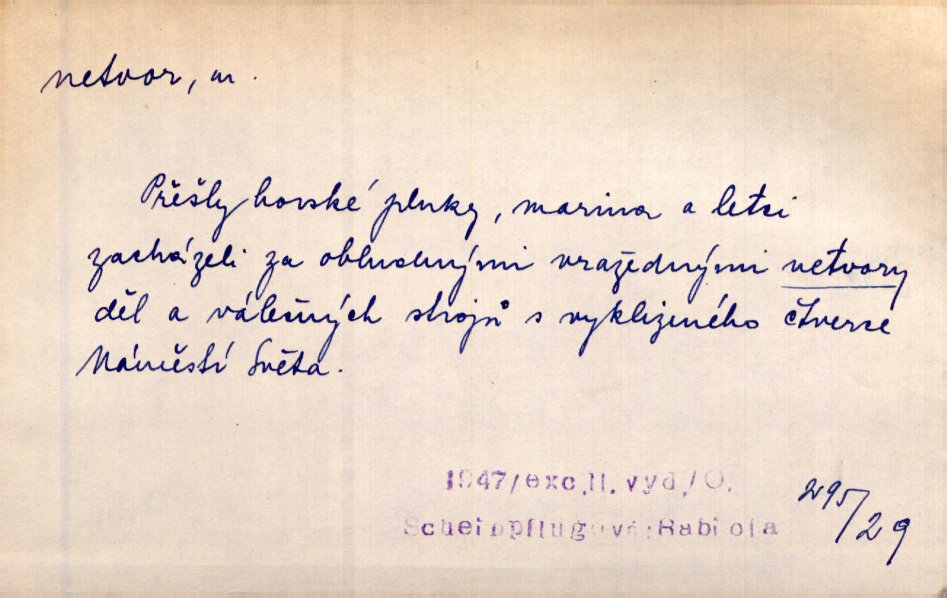 - netvor, -a m. (arch. netvora, -y f.) ošklivý, ohyzdný tvor, obluda, nestvůra. Bil se mužsky, rány jeho meče se na netvora [divou saň] jen sypaly. Jir. Podobal jsem se rytíři hledajícímu zakletou princeznu v zakletém, netvory střeženém zámku. Podl. V jeho [středověkého člověka] duši bylo tomu bezmála tak jako na jeho katedrálách: andělé a světci vedle netvorů a pekelníků. Šal. Indigový most, střežený porculánovým netvorem šesti hlav, vedl ke dveřím. Zey. Měsíc v obzoru vylézá z mračen netvorů. B. Jel. Fokas byl centuriem vojenským, netvor zakrnělé postavy. Mach. Ty — takové strašidlo, taková ohyzda, netvor — ty se opovažuješ o mne se ucházeti, mne si namlouvati. Kapp. [Mrak] vznášel se jako temný netvor. Rais. Vaše [pekelné] plameny a krvavá jezera, v nichž děsné netvory se hemží, zdají se mi rozkoší. Zey. Jeník nemohl pochopiti, kterak se jeho růžová sestra mohla v takovou netvoru přeměniti. Něm. Přen. Dvouhlavý netvor schismatu vystupuje hrozivěji a hrozivěji. Třeb. Černý netvor — bída — stála těsně před ním. Baar. D člověk zlý, nemravný, ukrutný. Jen hleď to malé neviňátko, netvore, matku mu vzíť bys chtěl? Krás. Jsou mezi nimi [opatrovníky] neurvalí surovci, brutální netvorové, kteří jednají s bezvědomým šílencem jako bezohlední žalářníci se vzdorovitým vězněm. Kronb. [Kníže k bratrovrahu:] Zde v poli nezbývá nám času, abychom s netvorem, jako jsi ty, činili dlouhé obřady. Hol. Pryč, hnusný netvore! Zey. D nadávka. [Dělník, nakládaje dubový kmen:] „Že pak tě, netvore! sojka nepolkla, dokavad jsi ještě žaludem byl!“ Obr. živ. Což se nemůžeš vyhnout, netvoro? Erb.