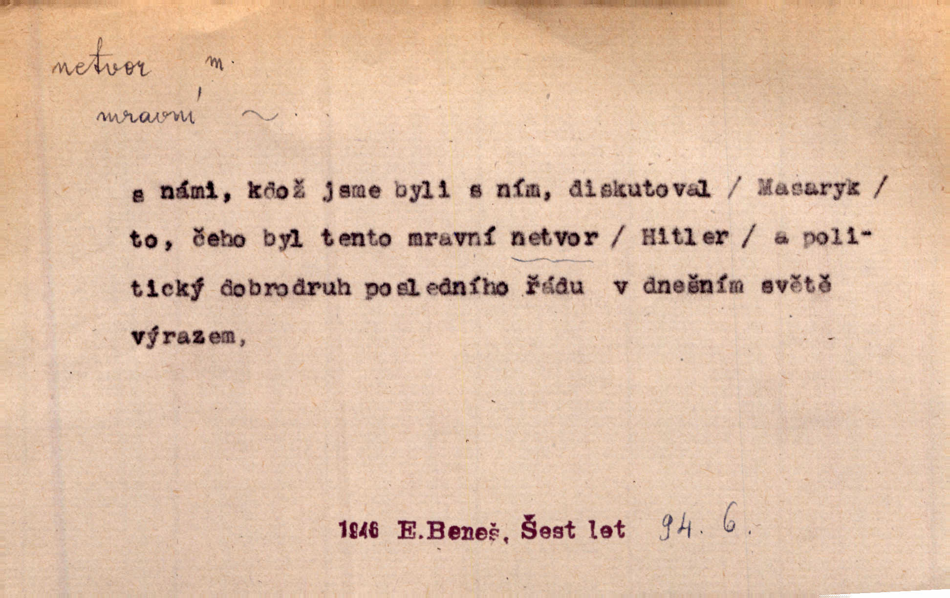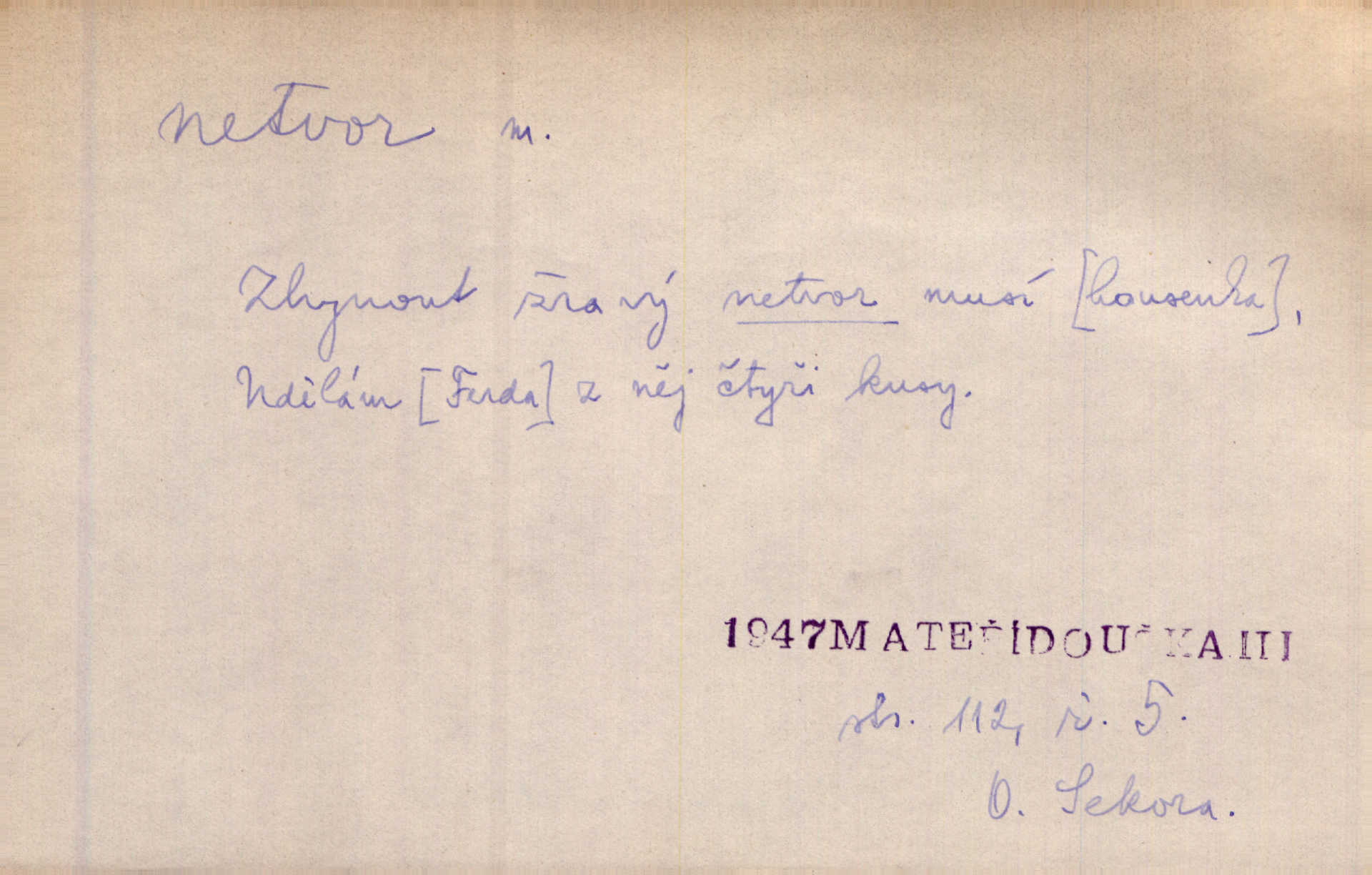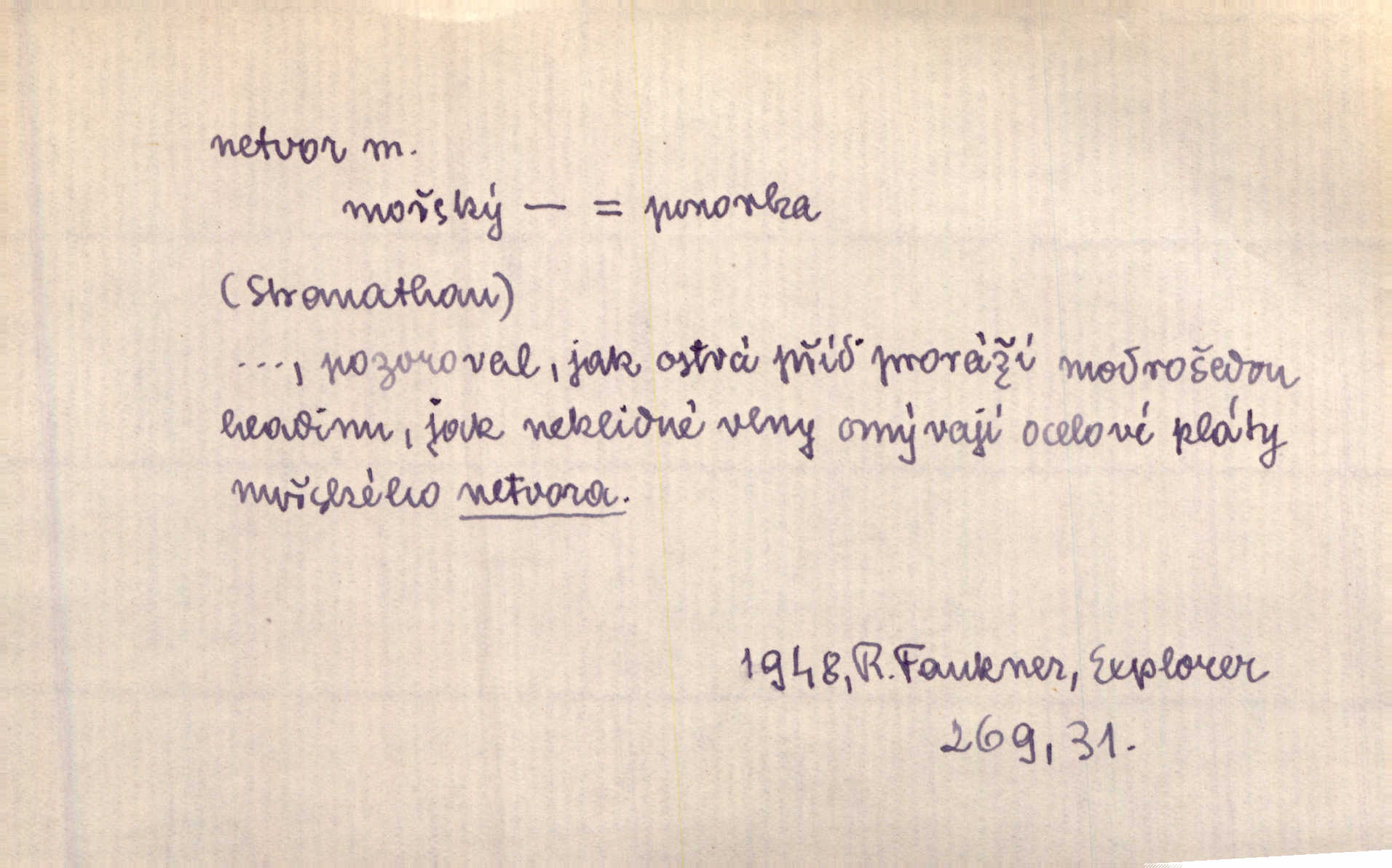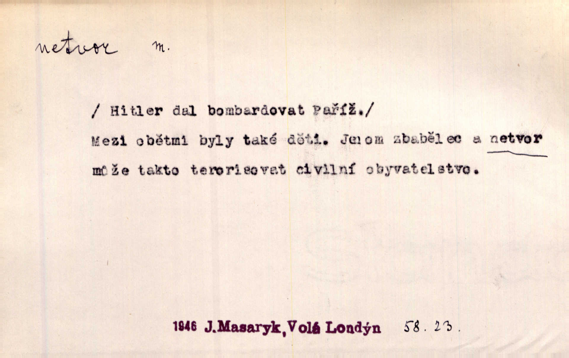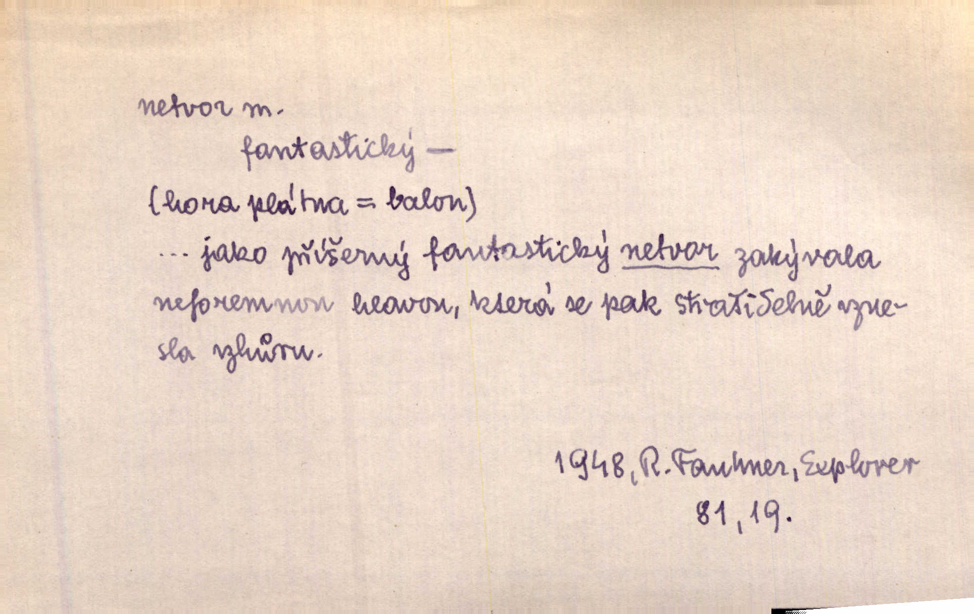 - netvor, -a m. (arch. netvora, -y f.) ošklivý, ohyzdný tvor, obluda, nestvůra. Bil se mužsky, rány jeho meče se na netvora [divou saň] jen sypaly. Jir. Podobal jsem se rytíři hledajícímu zakletou princeznu v zakletém, netvory střeženém zámku. Podl. V jeho [středověkého člověka] duši bylo tomu bezmála tak jako na jeho katedrálách: andělé a světci vedle netvorů a pekelníků. Šal. Indigový most, střežený porculánovým netvorem šesti hlav, vedl ke dveřím. Zey. Měsíc v obzoru vylézá z mračen netvorů. B. Jel. Fokas byl centuriem vojenským, netvor zakrnělé postavy. Mach. Ty — takové strašidlo, taková ohyzda, netvor — ty se opovažuješ o mne se ucházeti, mne si namlouvati. Kapp. [Mrak] vznášel se jako temný netvor. Rais. Vaše [pekelné] plameny a krvavá jezera, v nichž děsné netvory se hemží, zdají se mi rozkoší. Zey. Jeník nemohl pochopiti, kterak se jeho růžová sestra mohla v takovou netvoru přeměniti. Něm. Přen. Dvouhlavý netvor schismatu vystupuje hrozivěji a hrozivěji. Třeb. Černý netvor — bída — stála těsně před ním. Baar. D člověk zlý, nemravný, ukrutný. Jen hleď to malé neviňátko, netvore, matku mu vzíť bys chtěl? Krás. Jsou mezi nimi [opatrovníky] neurvalí surovci, brutální netvorové, kteří jednají s bezvědomým šílencem jako bezohlední žalářníci se vzdorovitým vězněm. Kronb. [Kníže k bratrovrahu:] Zde v poli nezbývá nám času, abychom s netvorem, jako jsi ty, činili dlouhé obřady. Hol. Pryč, hnusný netvore! Zey. D nadávka. [Dělník, nakládaje dubový kmen:] „Že pak tě, netvore! sojka nepolkla, dokavad jsi ještě žaludem byl!“ Obr. živ. Což se nemůžeš vyhnout, netvoro? Erb.