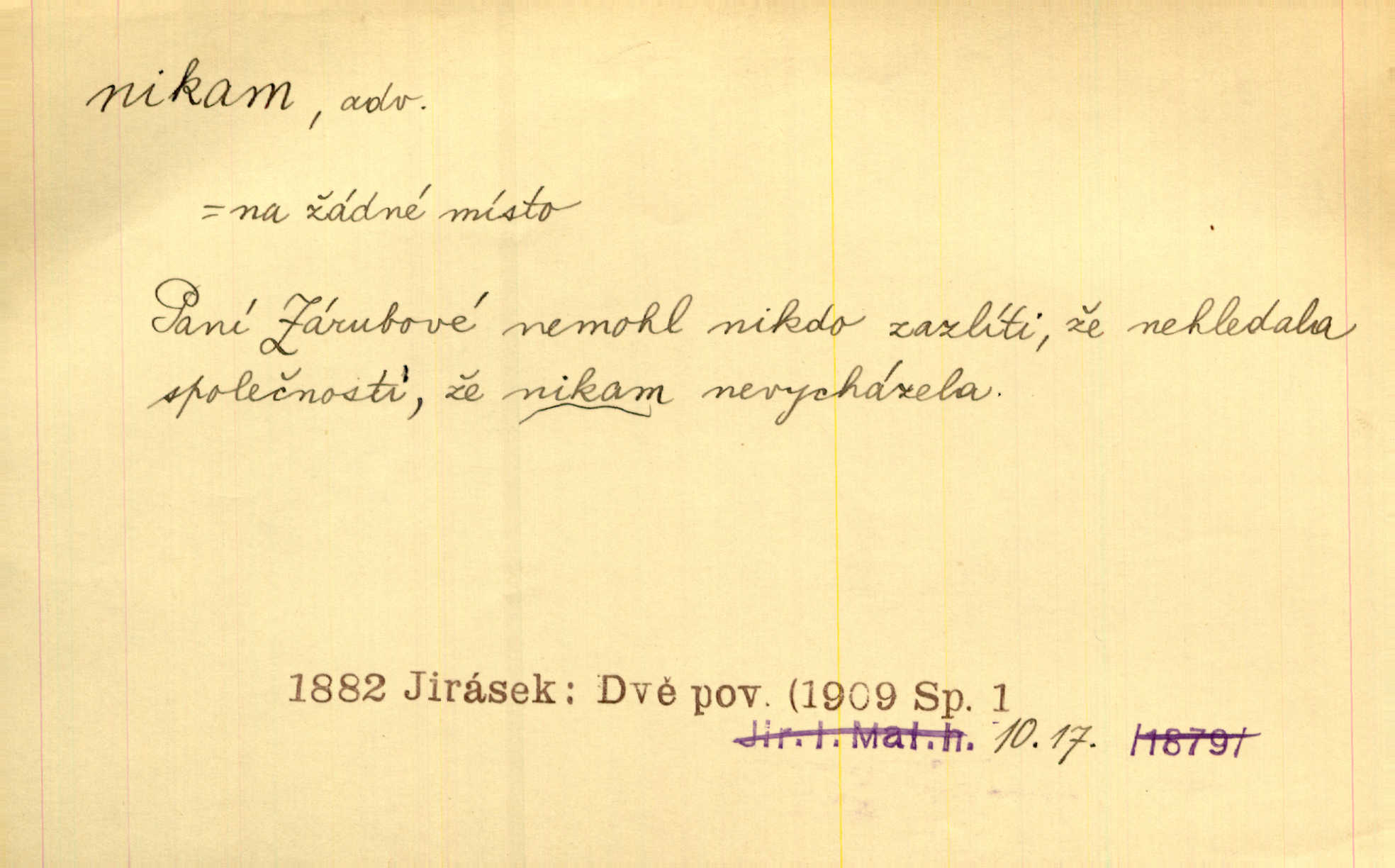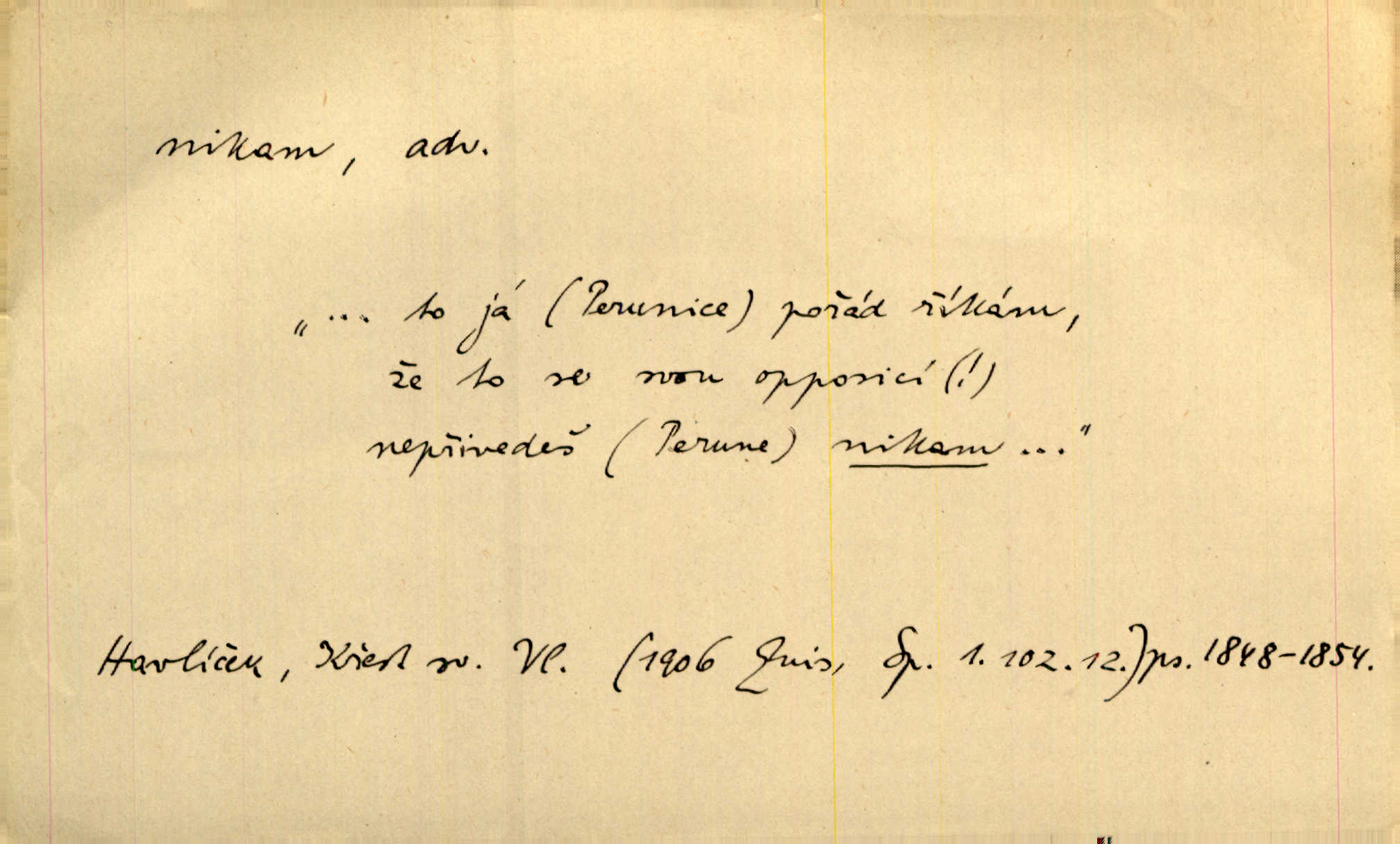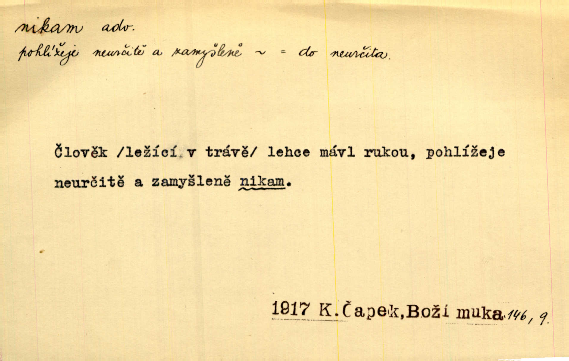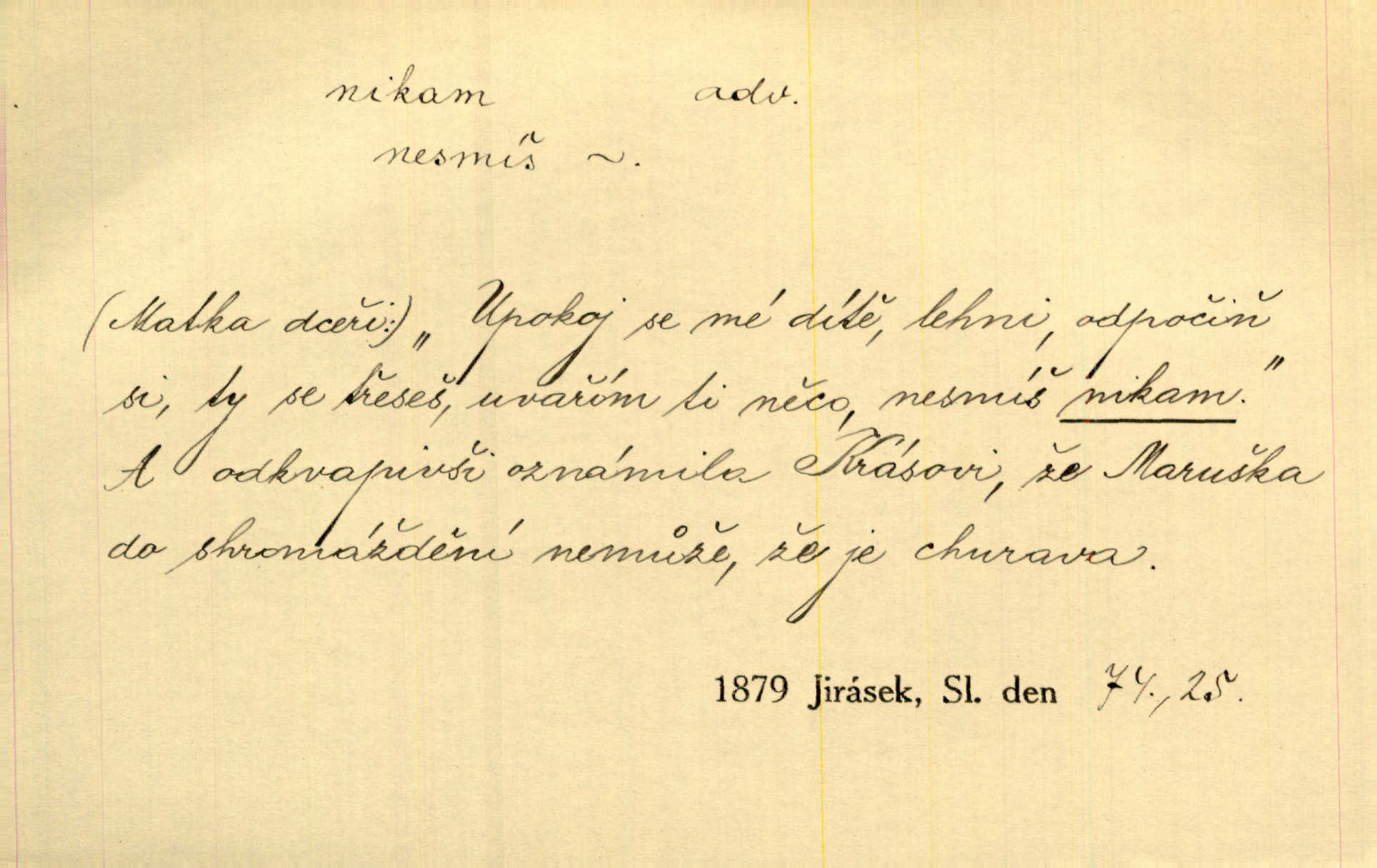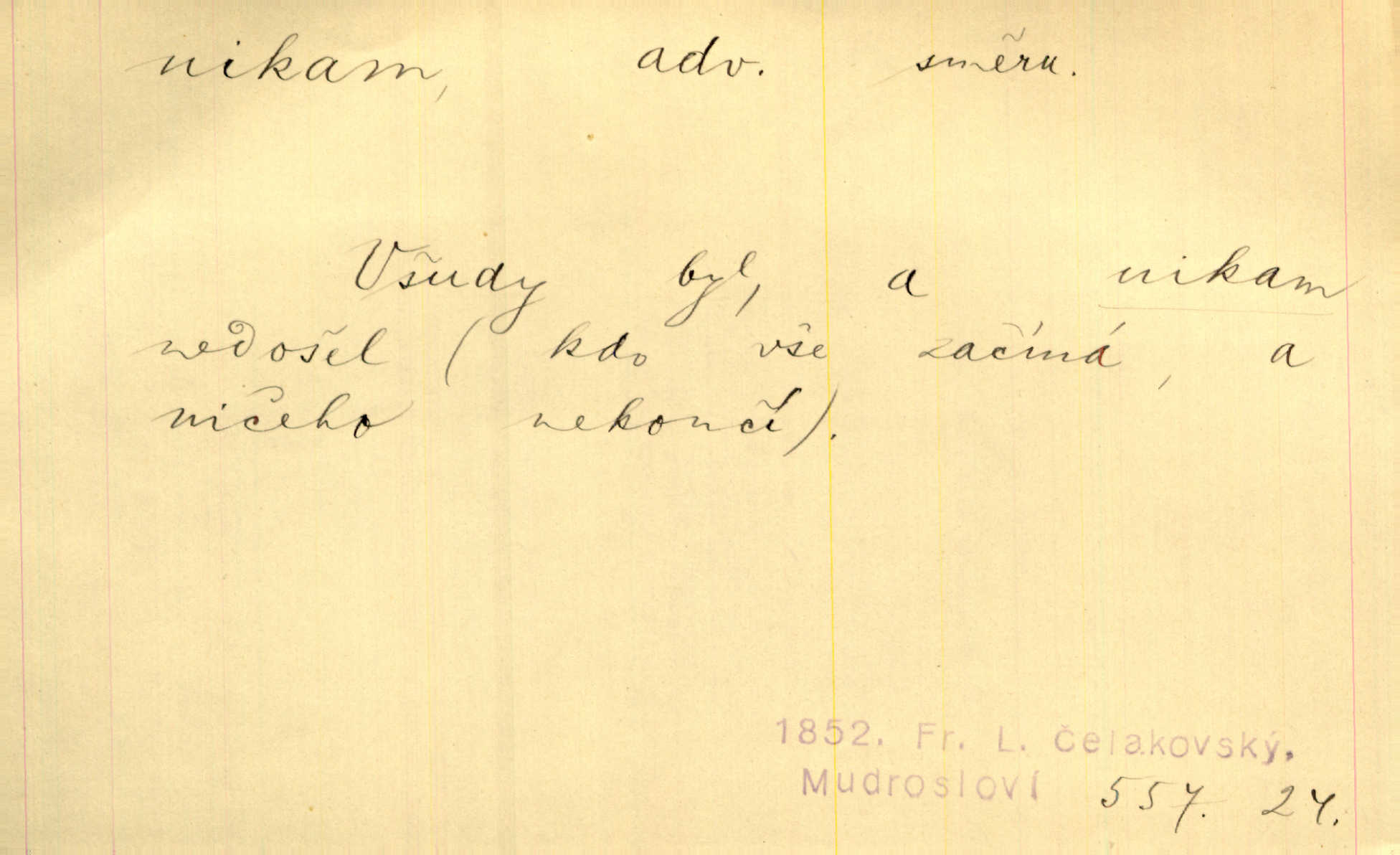 - nikam (poněk. zast. také nikamž) adv. na žádné místo. Nikam nechoď, dcero moje! Erb. Nechodila nikam do společnosti. Ner. Jaktěživ jsem nešel nikdy nikam tak rád, jako dneska do Jiřic. Třeb. Člověk lehce mávl rukou, pohlížeje neurčitě a zamyšleně nikam. K. Čap. V zemi nepřátelské nehýbej se nikdo nikamž, leč na rozkaz hejtmanův svých. Pal. D k žádnému zdárnému cíli, k žádnému výsledku, úspěchu a pod. To já pořád říkám, že to se svou opposicí nepřivedeš nikam. Havl. Žitných učinili pro ně co mohli, aby ulevili dceři v neštěstí, ale nikam to nevedlo. Šmil. Pláčem už nikam nemohla nemohla nic pracovati. A. Mrš.