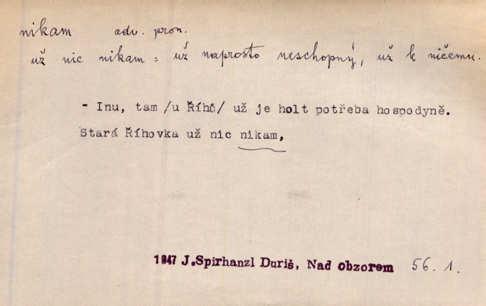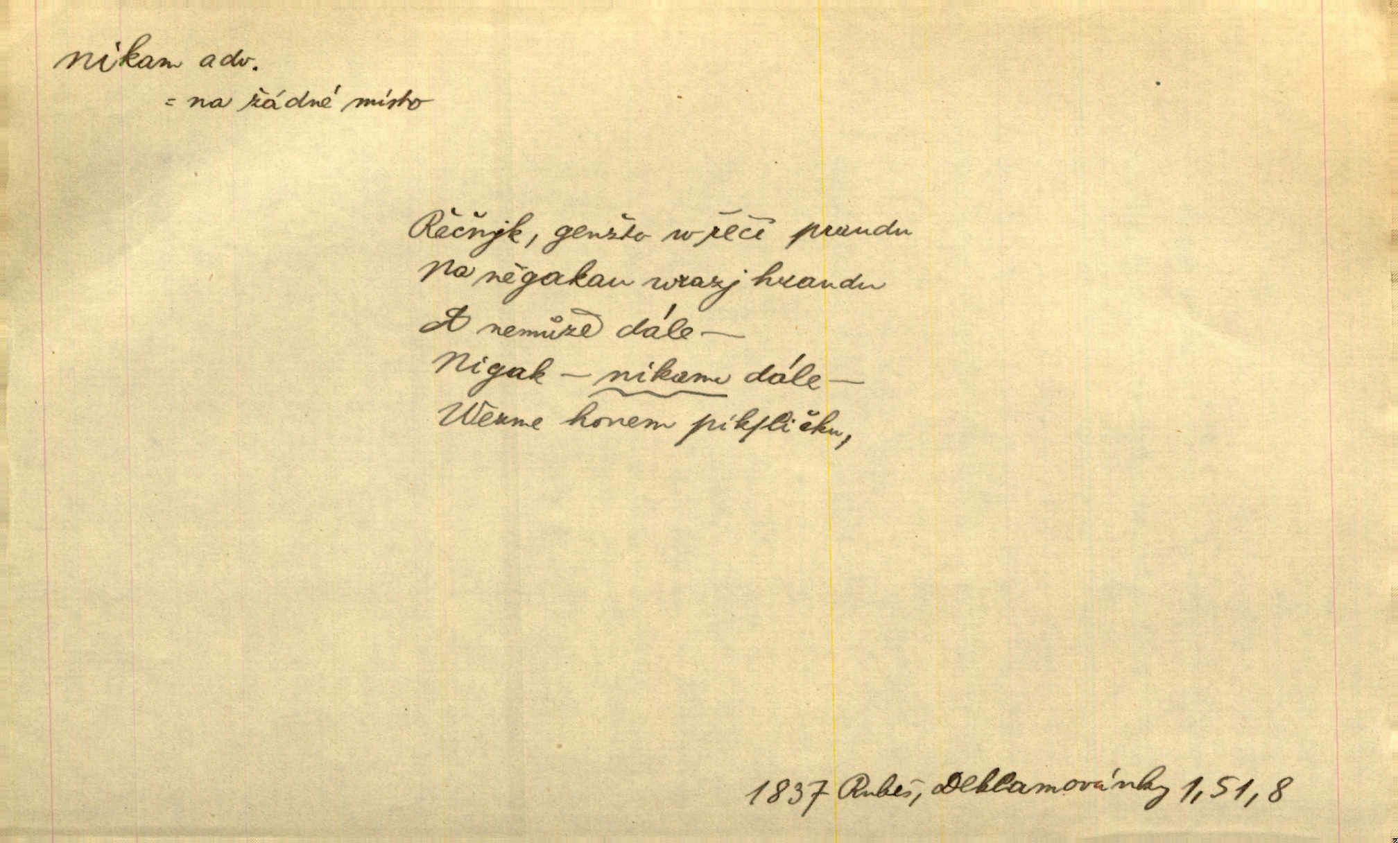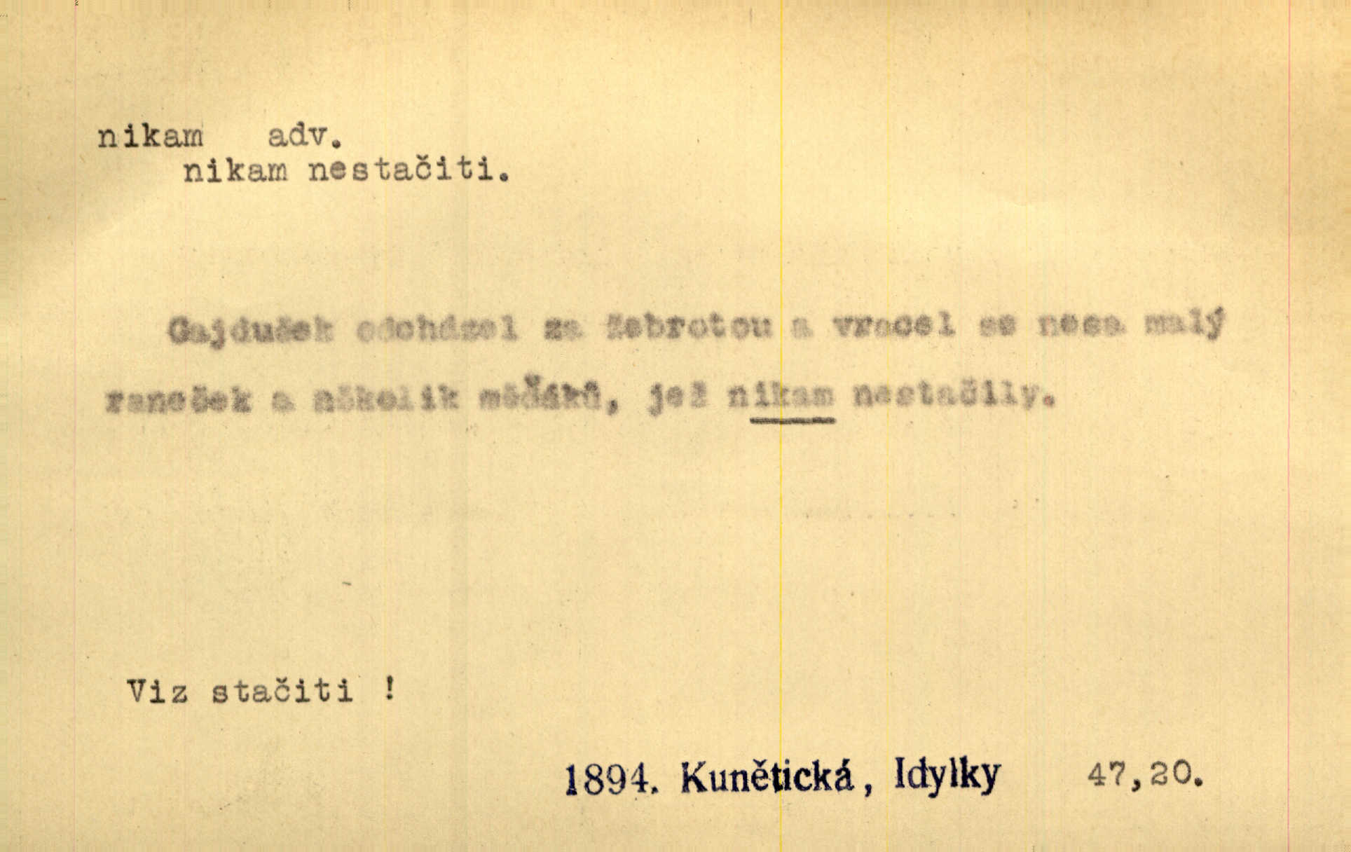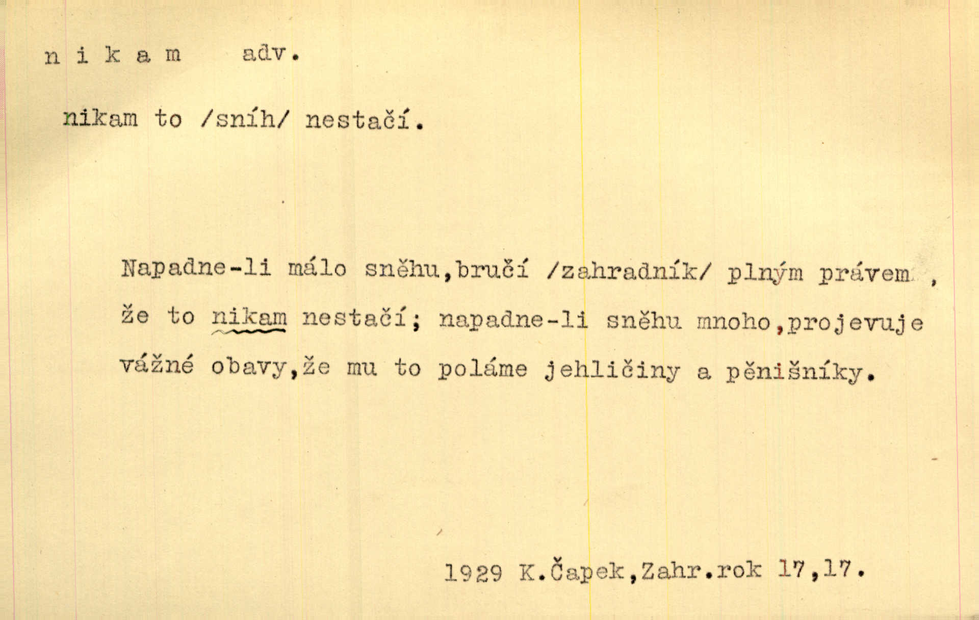 - nikam (poněk. zast. také nikamž) adv. na žádné místo. Nikam nechoď, dcero moje! Erb. Nechodila nikam do společnosti. Ner. Jaktěživ jsem nešel nikdy nikam tak rád, jako dneska do Jiřic. Třeb. Člověk lehce mávl rukou, pohlížeje neurčitě a zamyšleně nikam. K. Čap. V zemi nepřátelské nehýbej se nikdo nikamž, leč na rozkaz hejtmanův svých. Pal. D k žádnému zdárnému cíli, k žádnému výsledku, úspěchu a pod. To já pořád říkám, že to se svou opposicí nepřivedeš nikam. Havl. Žitných učinili pro ně co mohli, aby ulevili dceři v neštěstí, ale nikam to nevedlo. Šmil. Pláčem už nikam nemohla nemohla nic pracovati. A. Mrš.