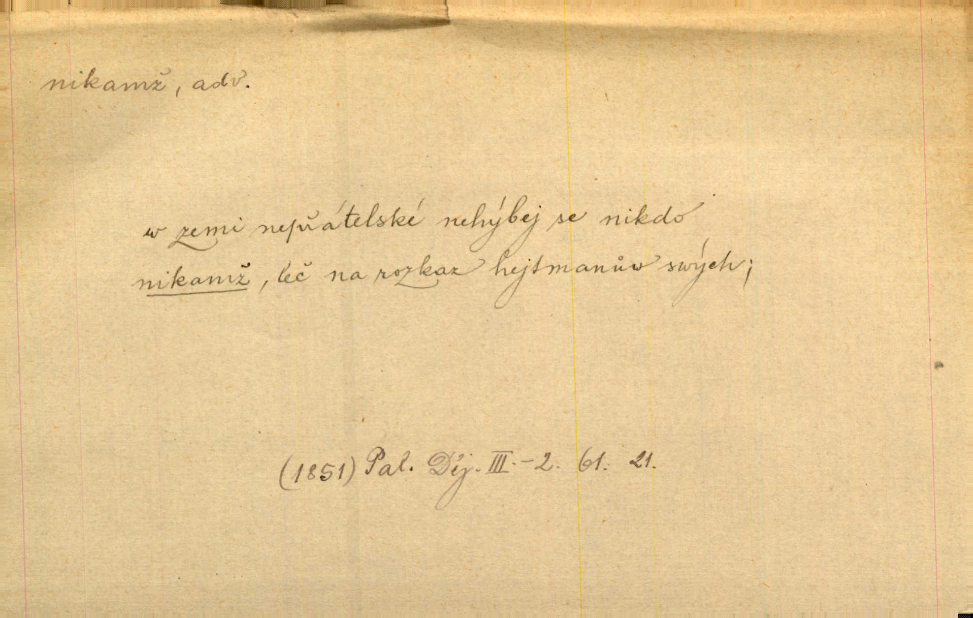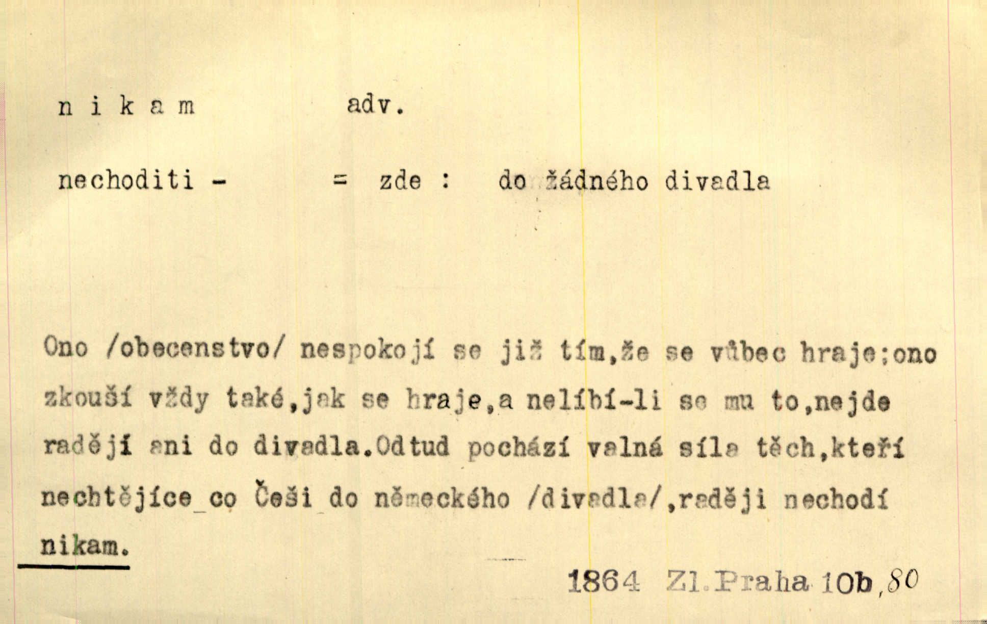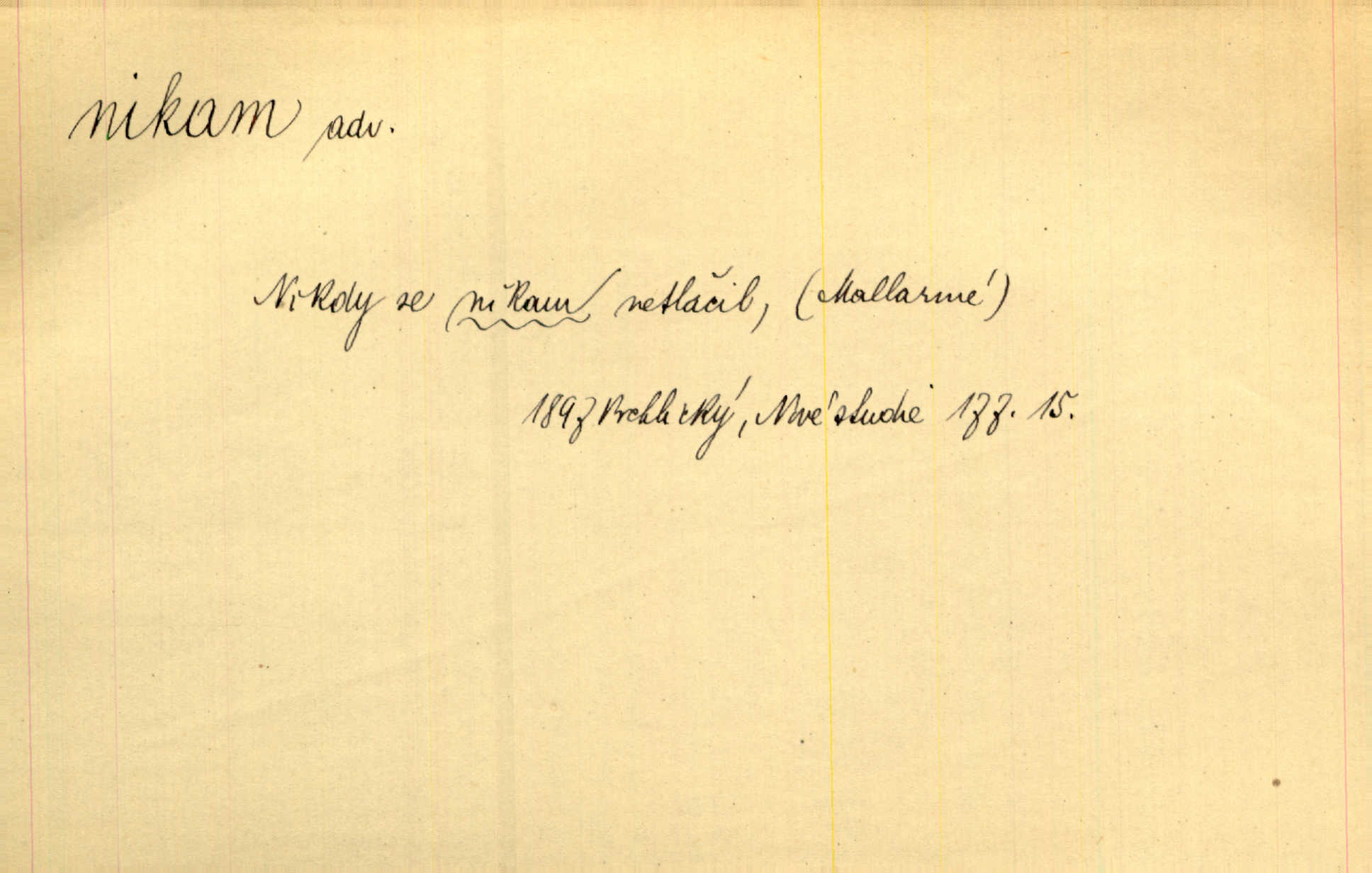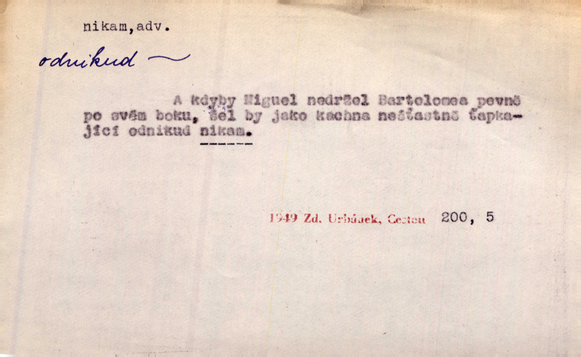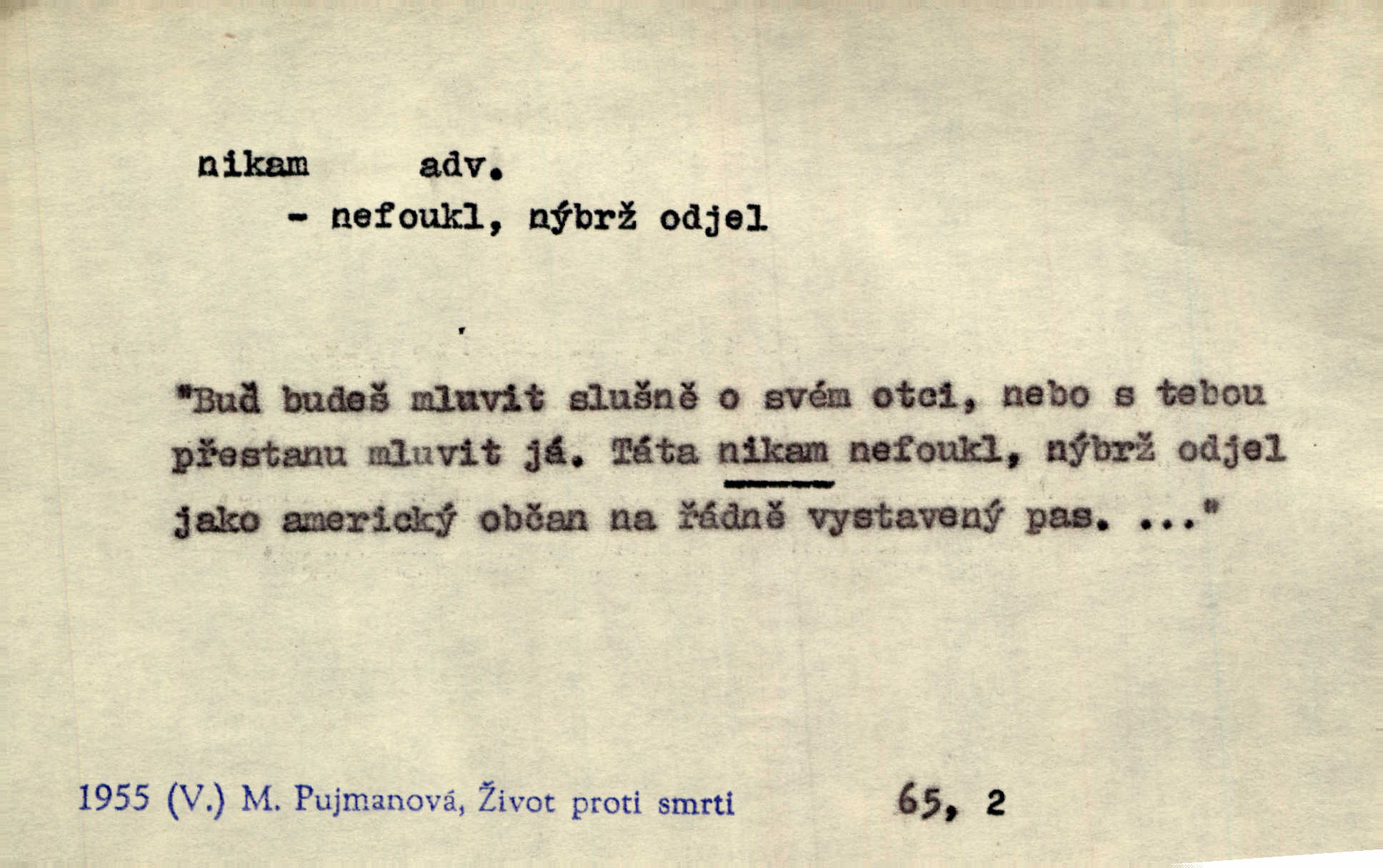 - nikam (poněk. zast. také nikamž) adv. na žádné místo. Nikam nechoď, dcero moje! Erb. Nechodila nikam do společnosti. Ner. Jaktěživ jsem nešel nikdy nikam tak rád, jako dneska do Jiřic. Třeb. Člověk lehce mávl rukou, pohlížeje neurčitě a zamyšleně nikam. K. Čap. V zemi nepřátelské nehýbej se nikdo nikamž, leč na rozkaz hejtmanův svých. Pal. D k žádnému zdárnému cíli, k žádnému výsledku, úspěchu a pod. To já pořád říkám, že to se svou opposicí nepřivedeš nikam. Havl. Žitných učinili pro ně co mohli, aby ulevili dceři v neštěstí, ale nikam to nevedlo. Šmil. Pláčem už nikam nemohla nemohla nic pracovati. A. Mrš.