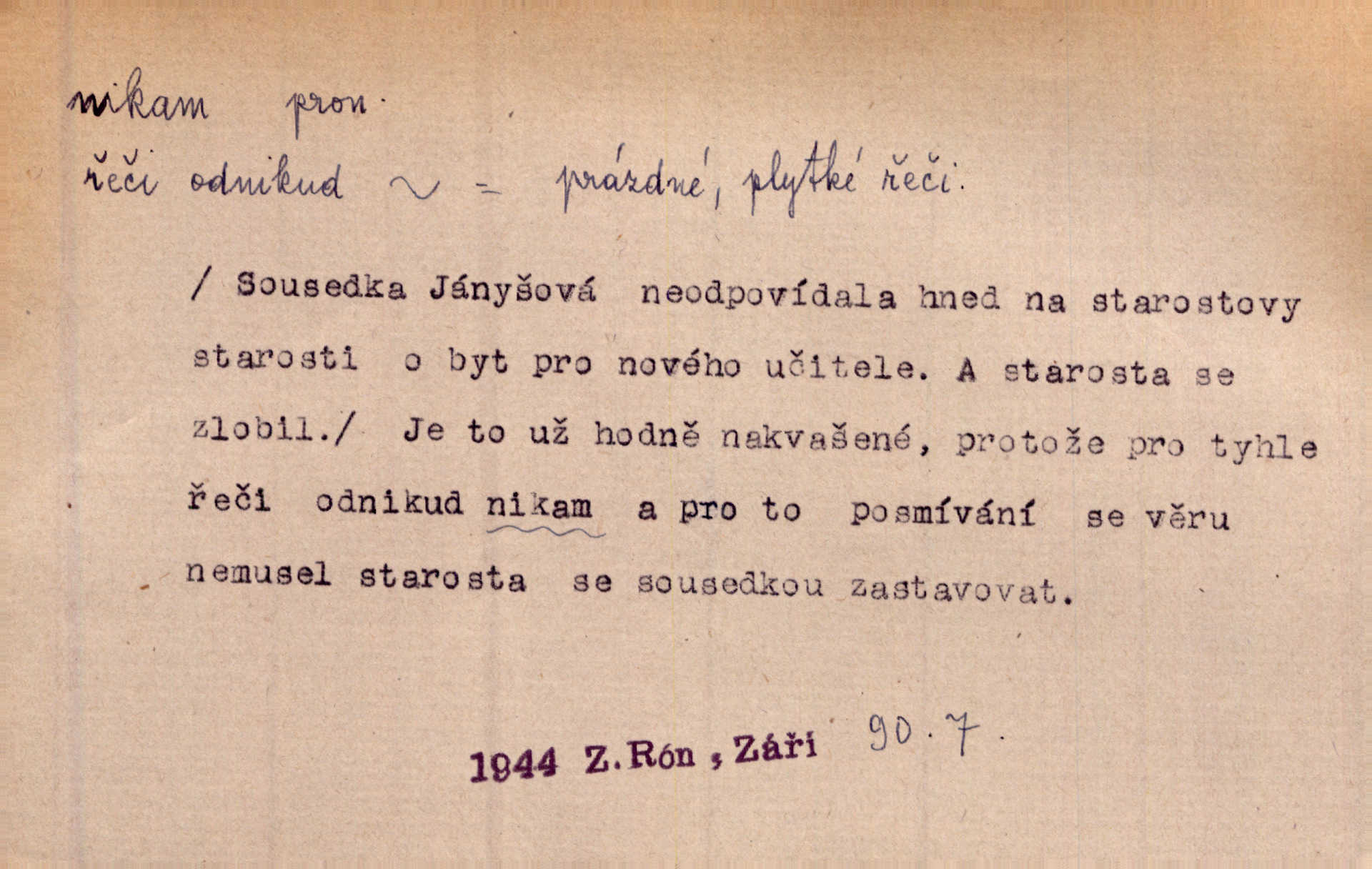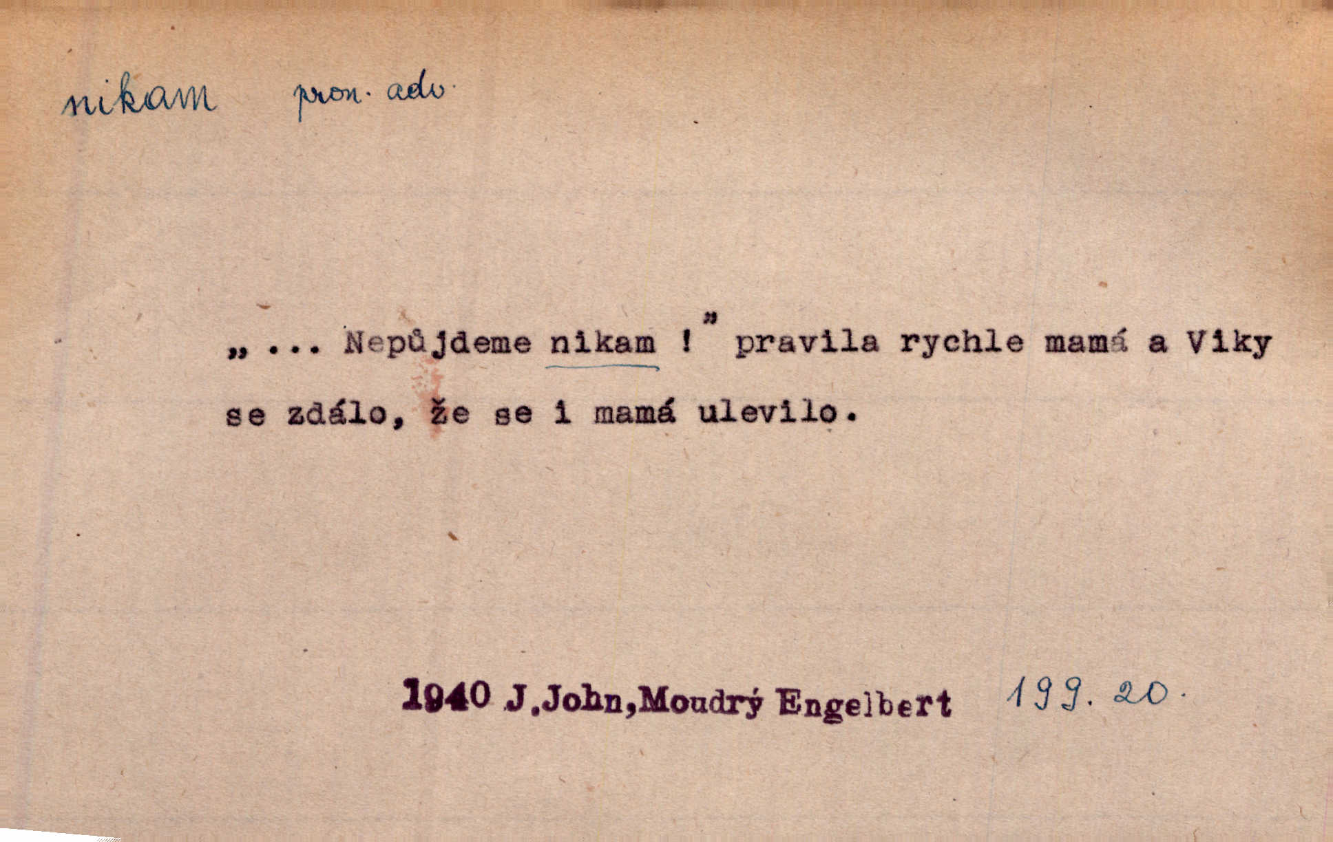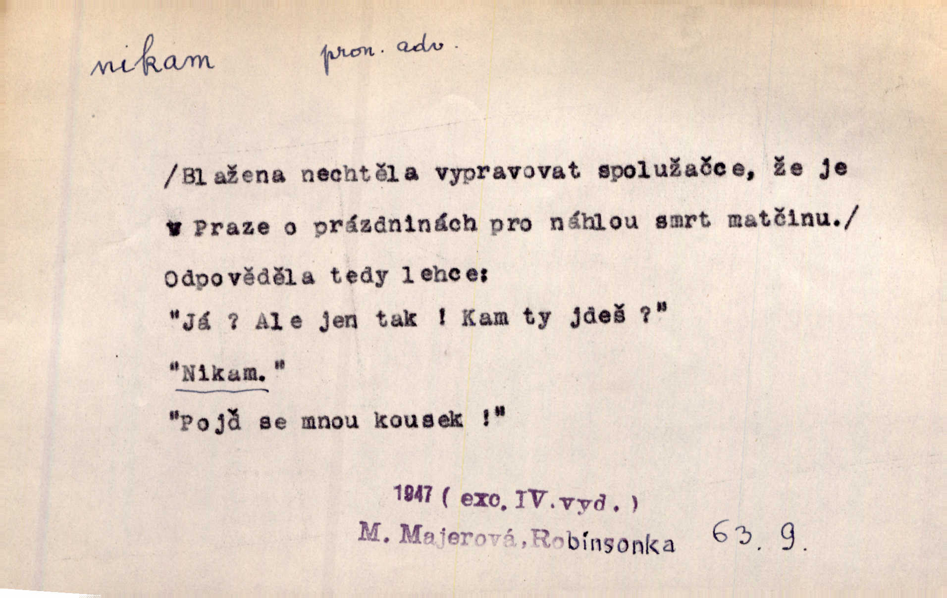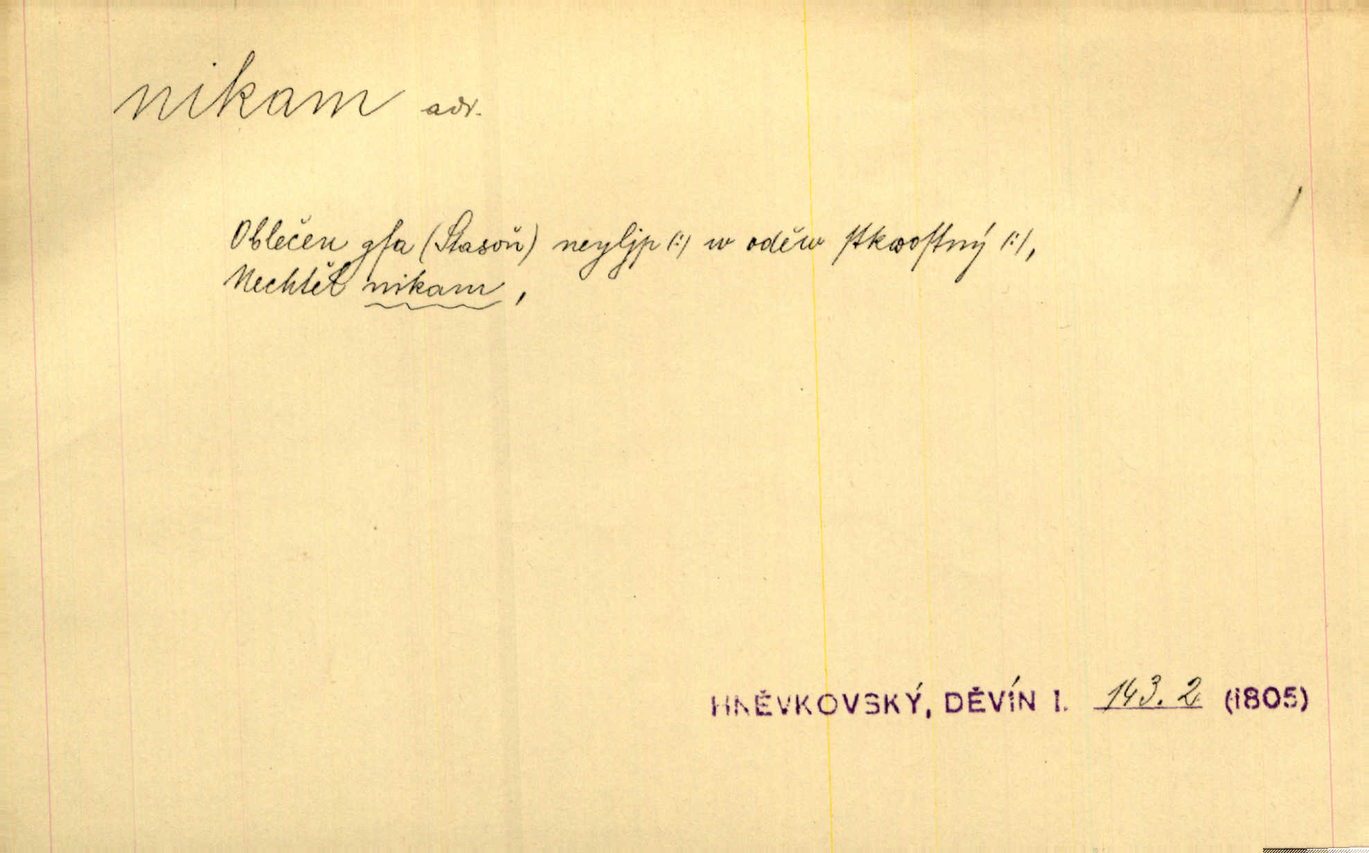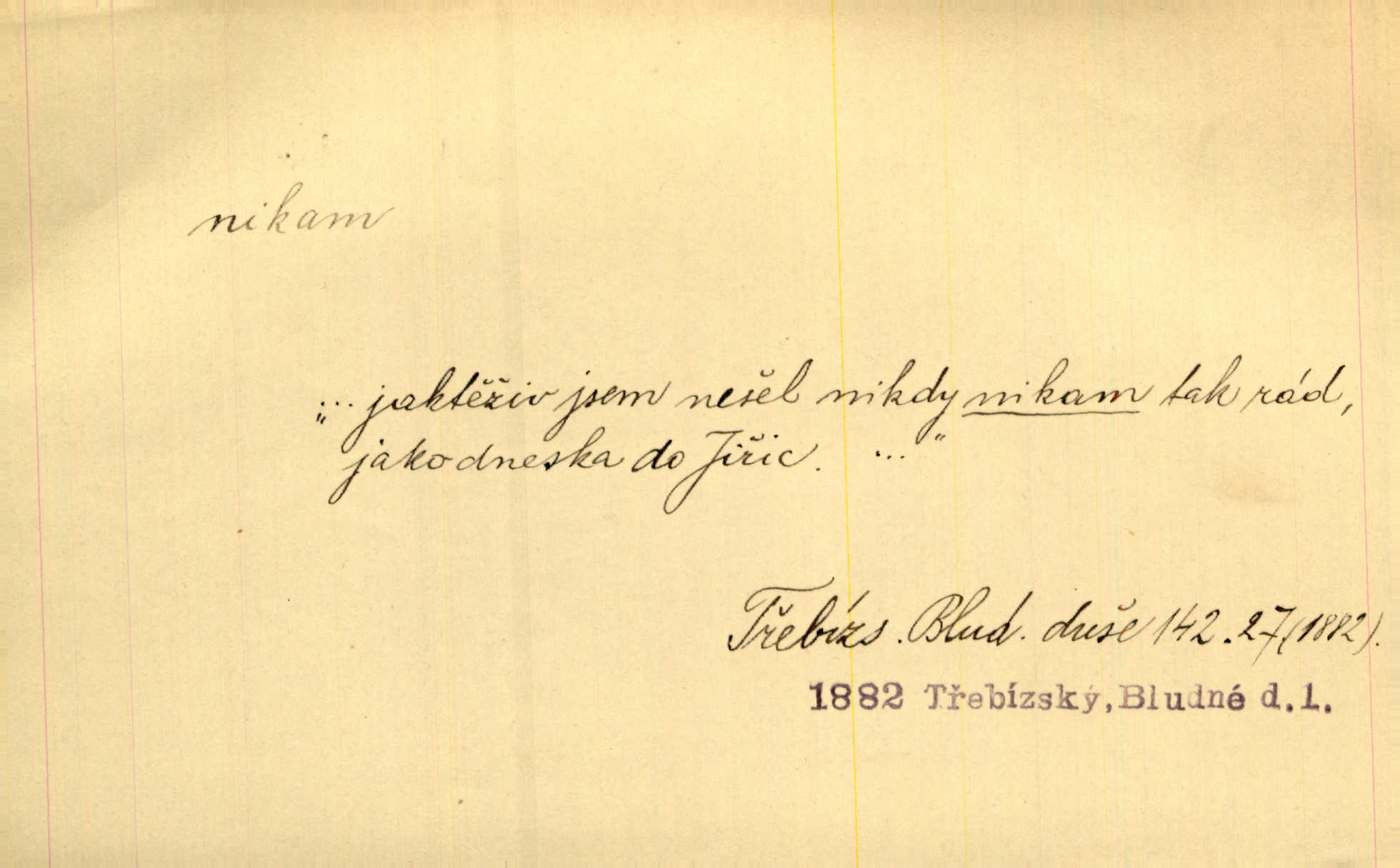 - nikam (poněk. zast. také nikamž) adv. na žádné místo. Nikam nechoď, dcero moje! Erb. Nechodila nikam do společnosti. Ner. Jaktěživ jsem nešel nikdy nikam tak rád, jako dneska do Jiřic. Třeb. Člověk lehce mávl rukou, pohlížeje neurčitě a zamyšleně nikam. K. Čap. V zemi nepřátelské nehýbej se nikdo nikamž, leč na rozkaz hejtmanův svých. Pal. D k žádnému zdárnému cíli, k žádnému výsledku, úspěchu a pod. To já pořád říkám, že to se svou opposicí nepřivedeš nikam. Havl. Žitných učinili pro ně co mohli, aby ulevili dceři v neštěstí, ale nikam to nevedlo. Šmil. Pláčem už nikam nemohla nemohla nic pracovati. A. Mrš.