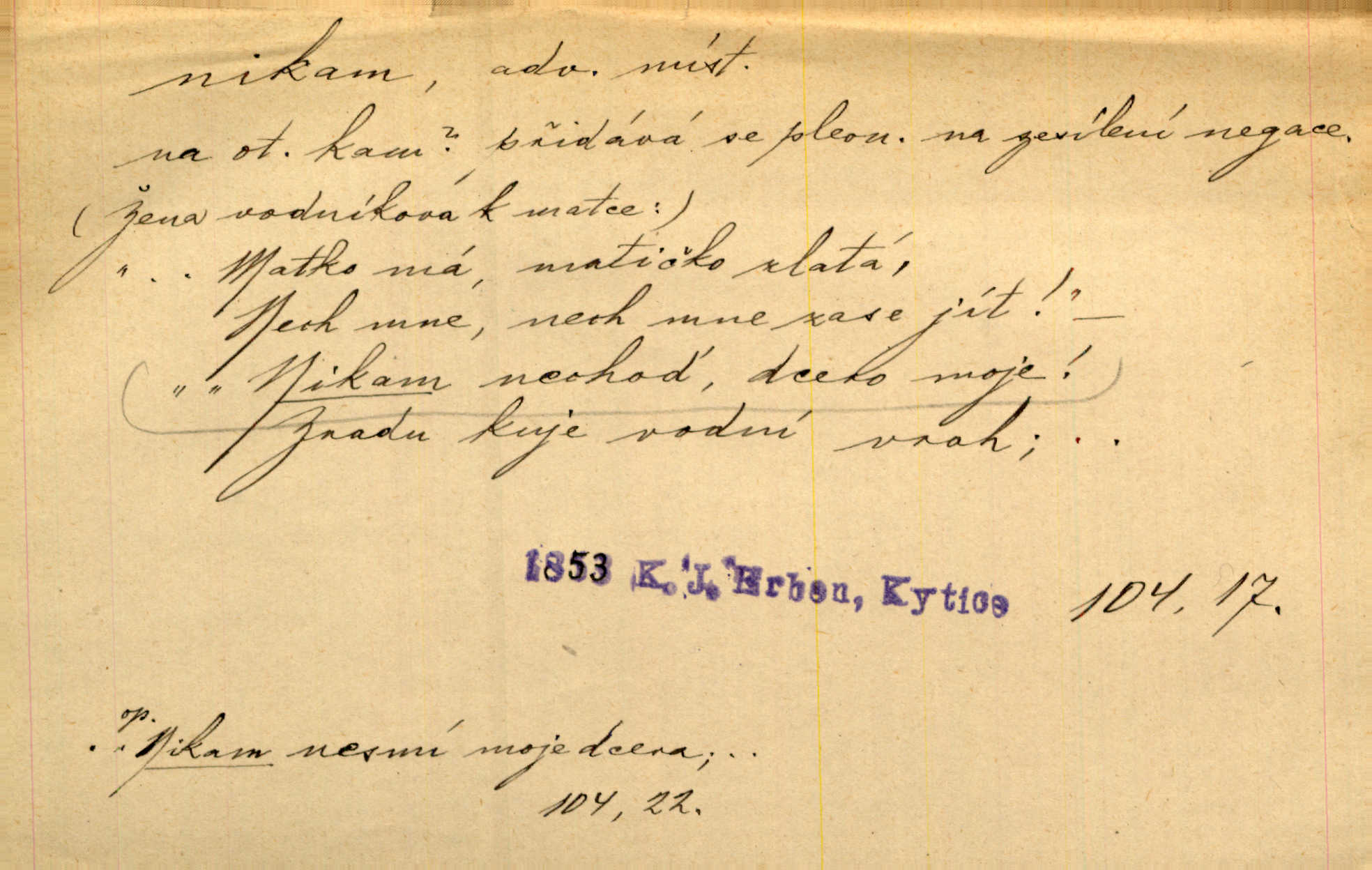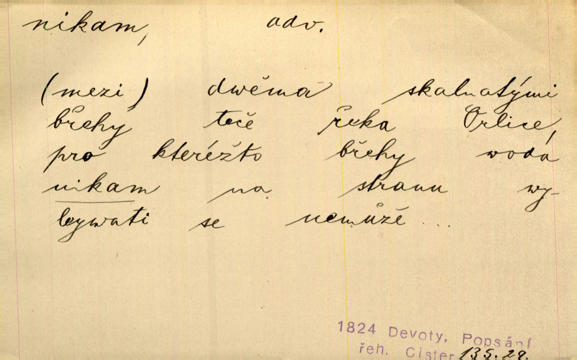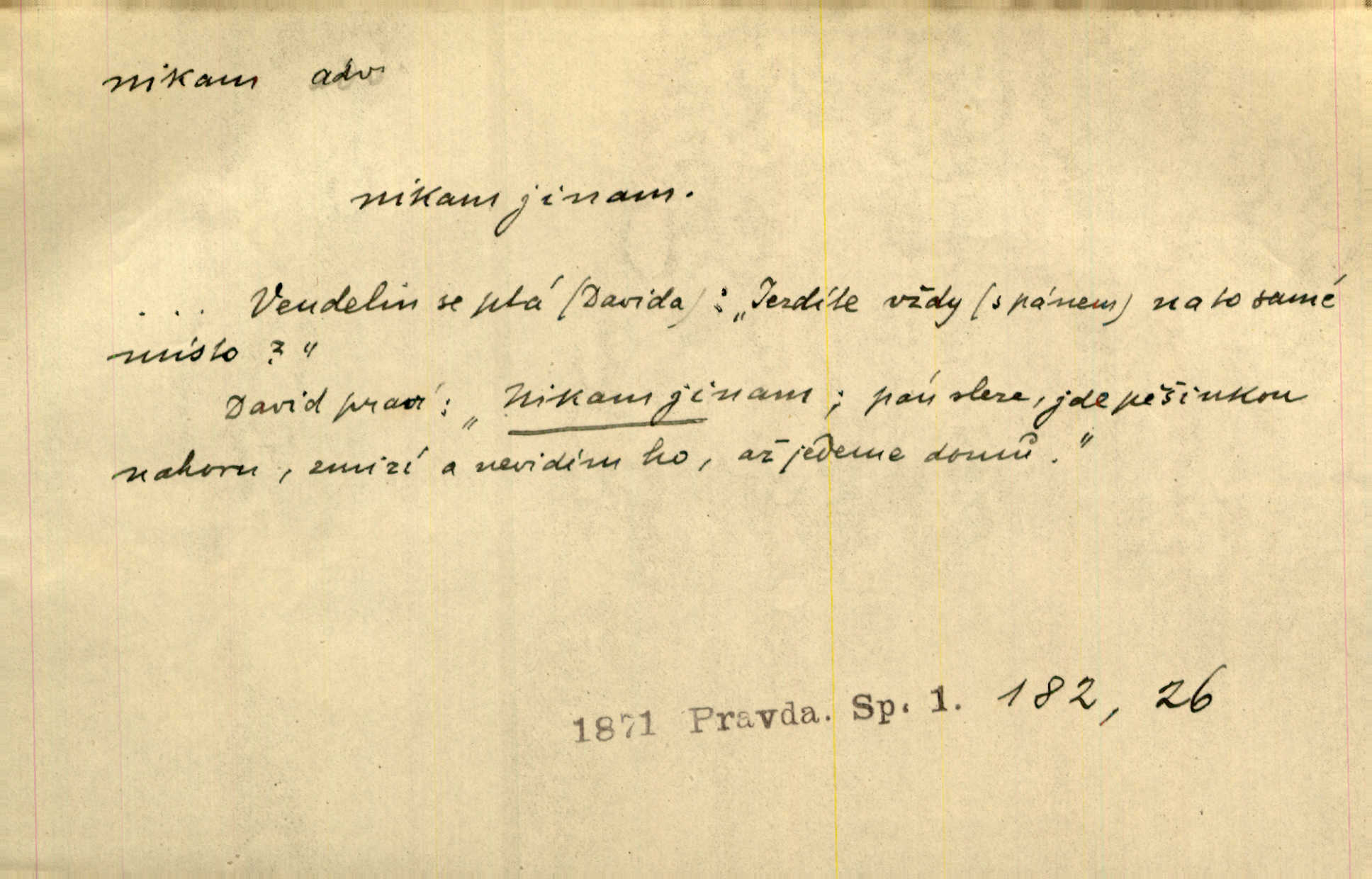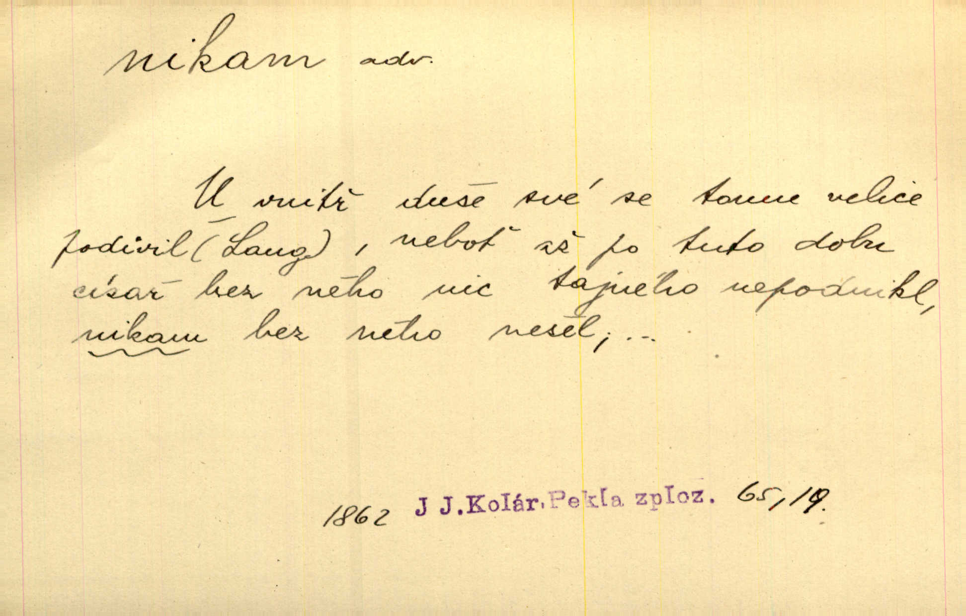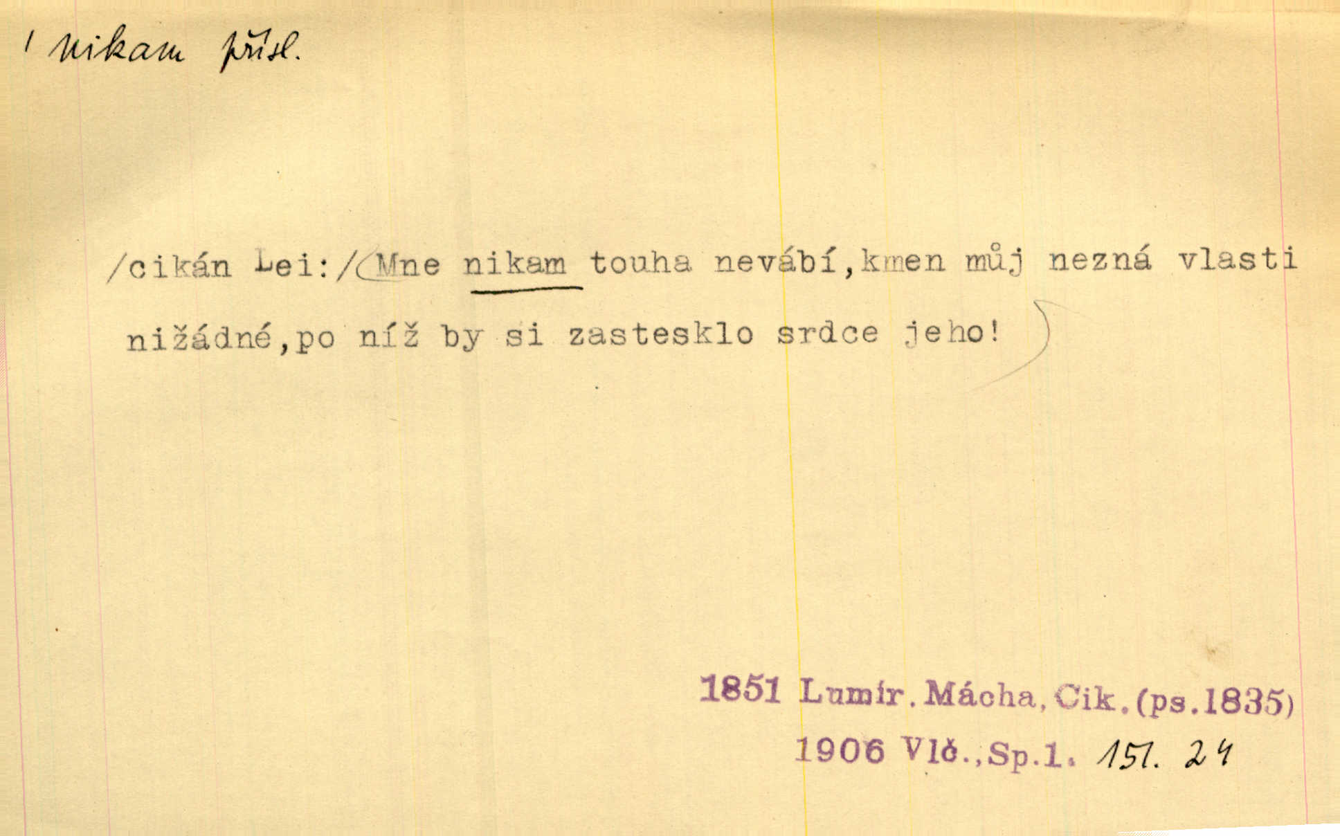 - nikam (poněk. zast. také nikamž) adv. na žádné místo. Nikam nechoď, dcero moje! Erb. Nechodila nikam do společnosti. Ner. Jaktěživ jsem nešel nikdy nikam tak rád, jako dneska do Jiřic. Třeb. Člověk lehce mávl rukou, pohlížeje neurčitě a zamyšleně nikam. K. Čap. V zemi nepřátelské nehýbej se nikdo nikamž, leč na rozkaz hejtmanův svých. Pal. D k žádnému zdárnému cíli, k žádnému výsledku, úspěchu a pod. To já pořád říkám, že to se svou opposicí nepřivedeš nikam. Havl. Žitných učinili pro ně co mohli, aby ulevili dceři v neštěstí, ale nikam to nevedlo. Šmil. Pláčem už nikam nemohla nemohla nic pracovati. A. Mrš.