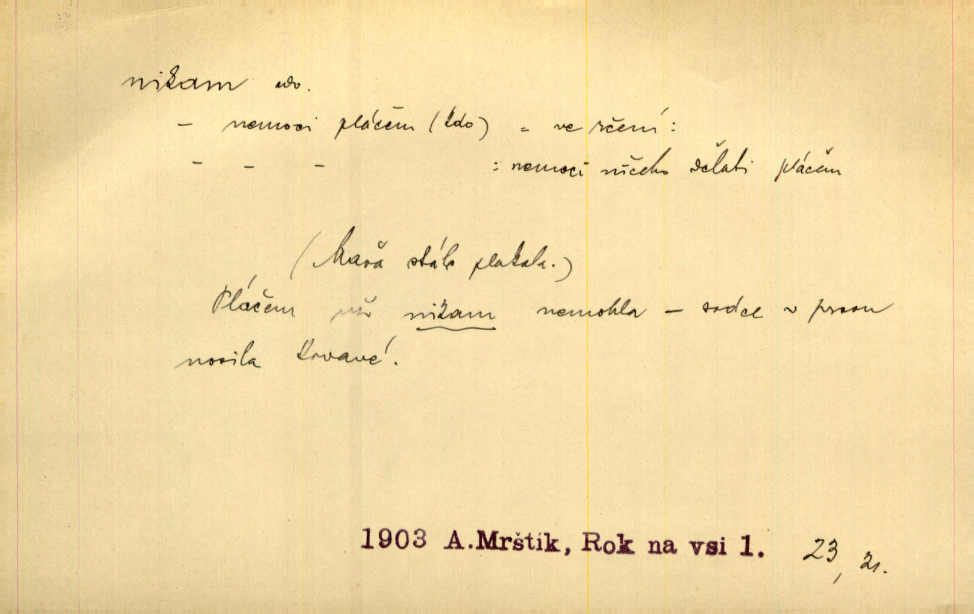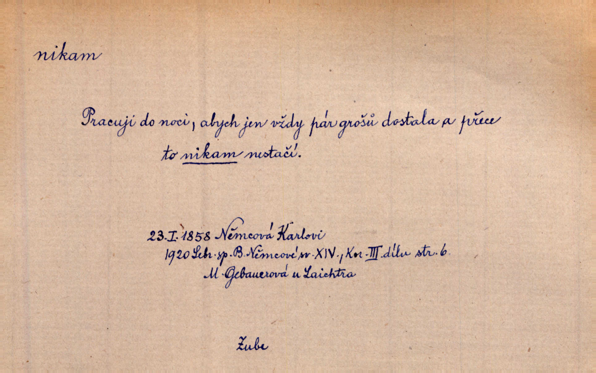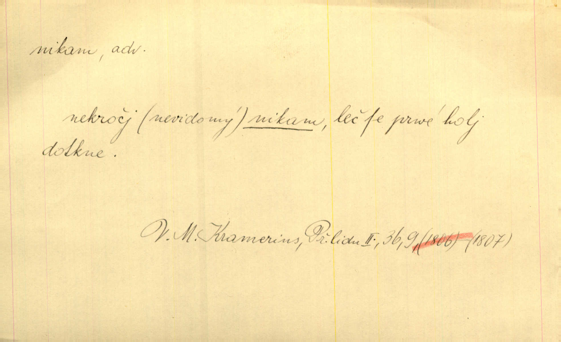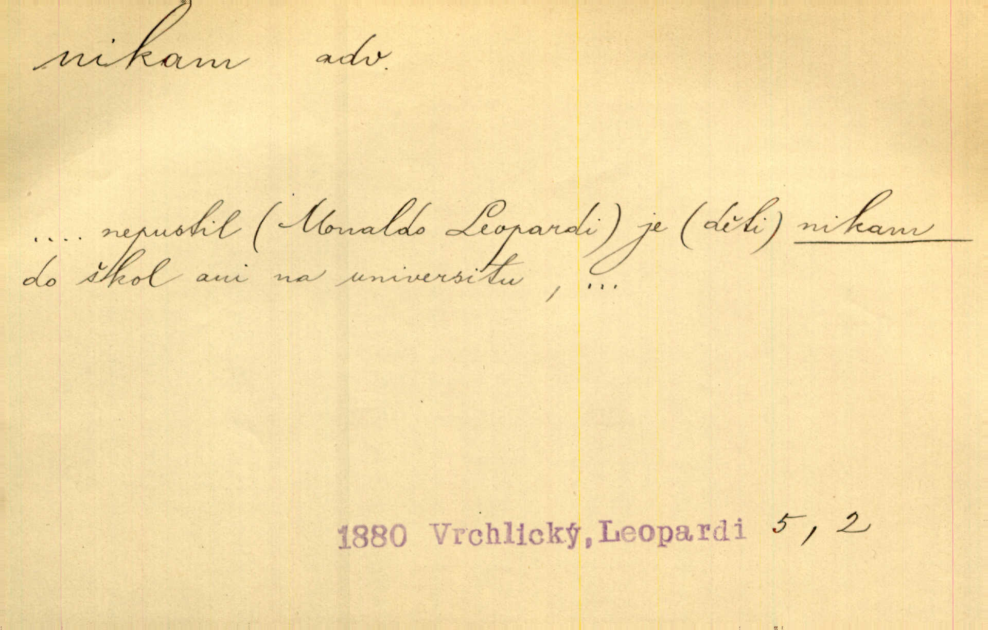 - nikam (poněk. zast. také nikamž) adv. na žádné místo. Nikam nechoď, dcero moje! Erb. Nechodila nikam do společnosti. Ner. Jaktěživ jsem nešel nikdy nikam tak rád, jako dneska do Jiřic. Třeb. Člověk lehce mávl rukou, pohlížeje neurčitě a zamyšleně nikam. K. Čap. V zemi nepřátelské nehýbej se nikdo nikamž, leč na rozkaz hejtmanův svých. Pal. D k žádnému zdárnému cíli, k žádnému výsledku, úspěchu a pod. To já pořád říkám, že to se svou opposicí nepřivedeš nikam. Havl. Žitných učinili pro ně co mohli, aby ulevili dceři v neštěstí, ale nikam to nevedlo. Šmil. Pláčem už nikam nemohla nemohla nic pracovati. A. Mrš.
