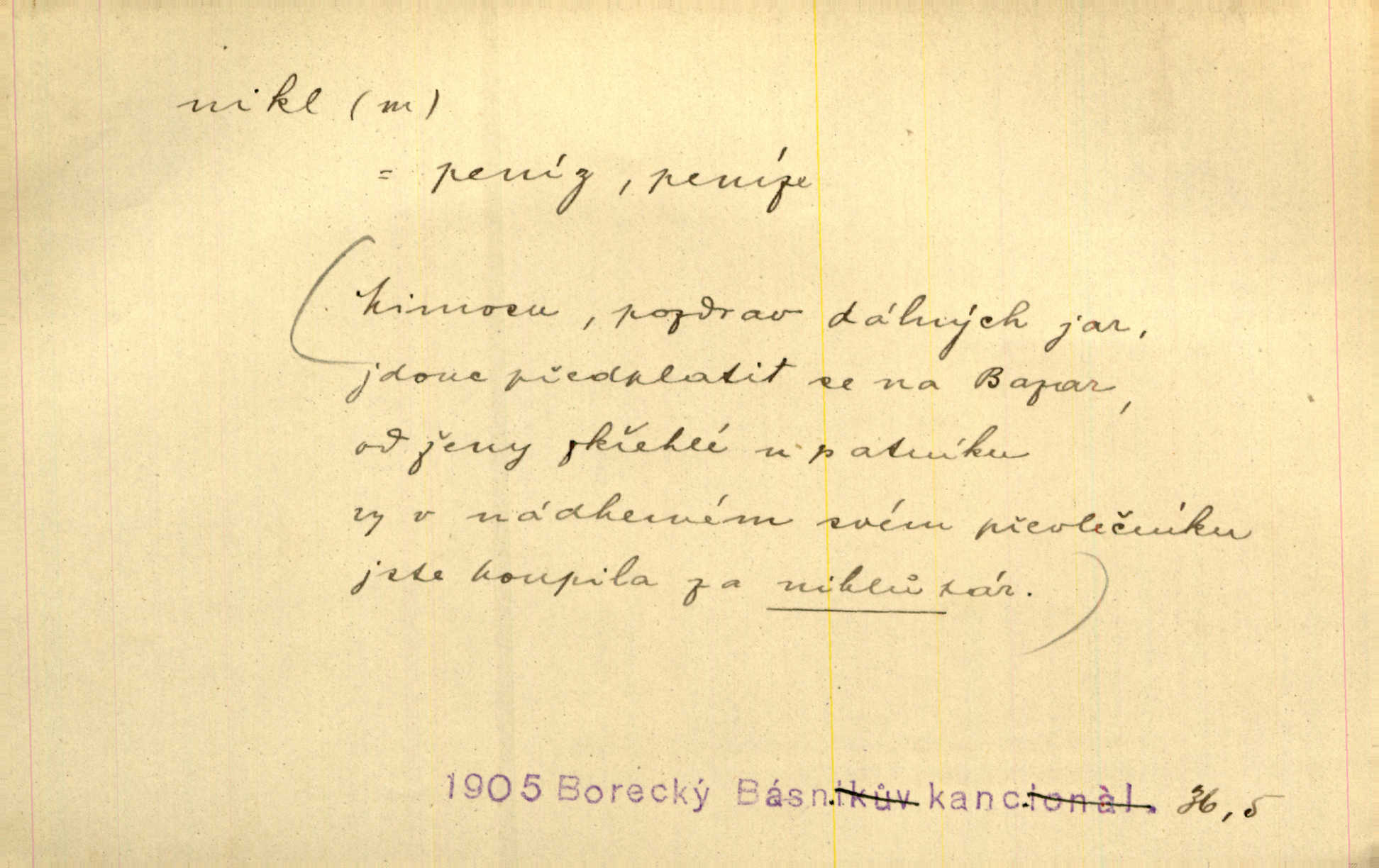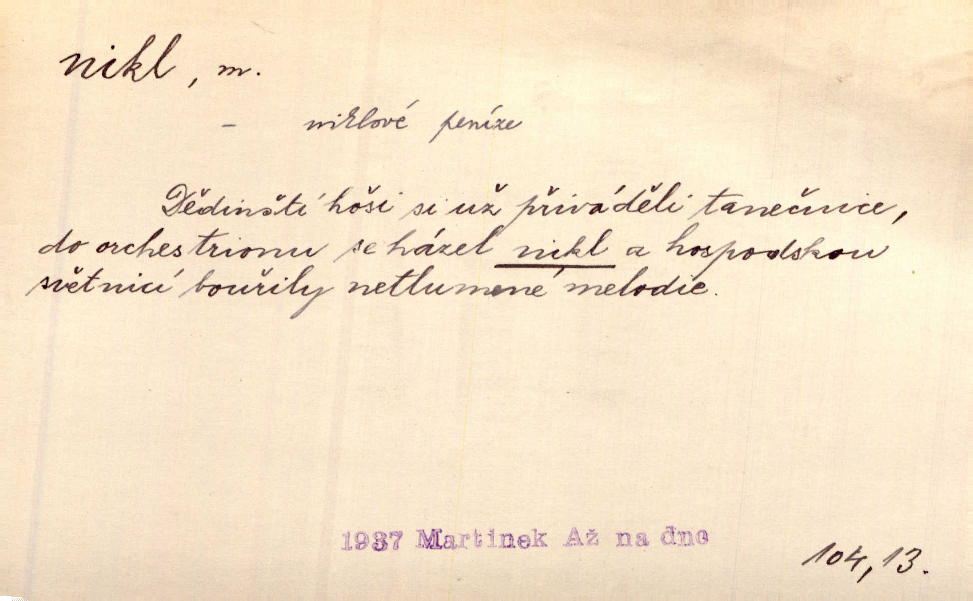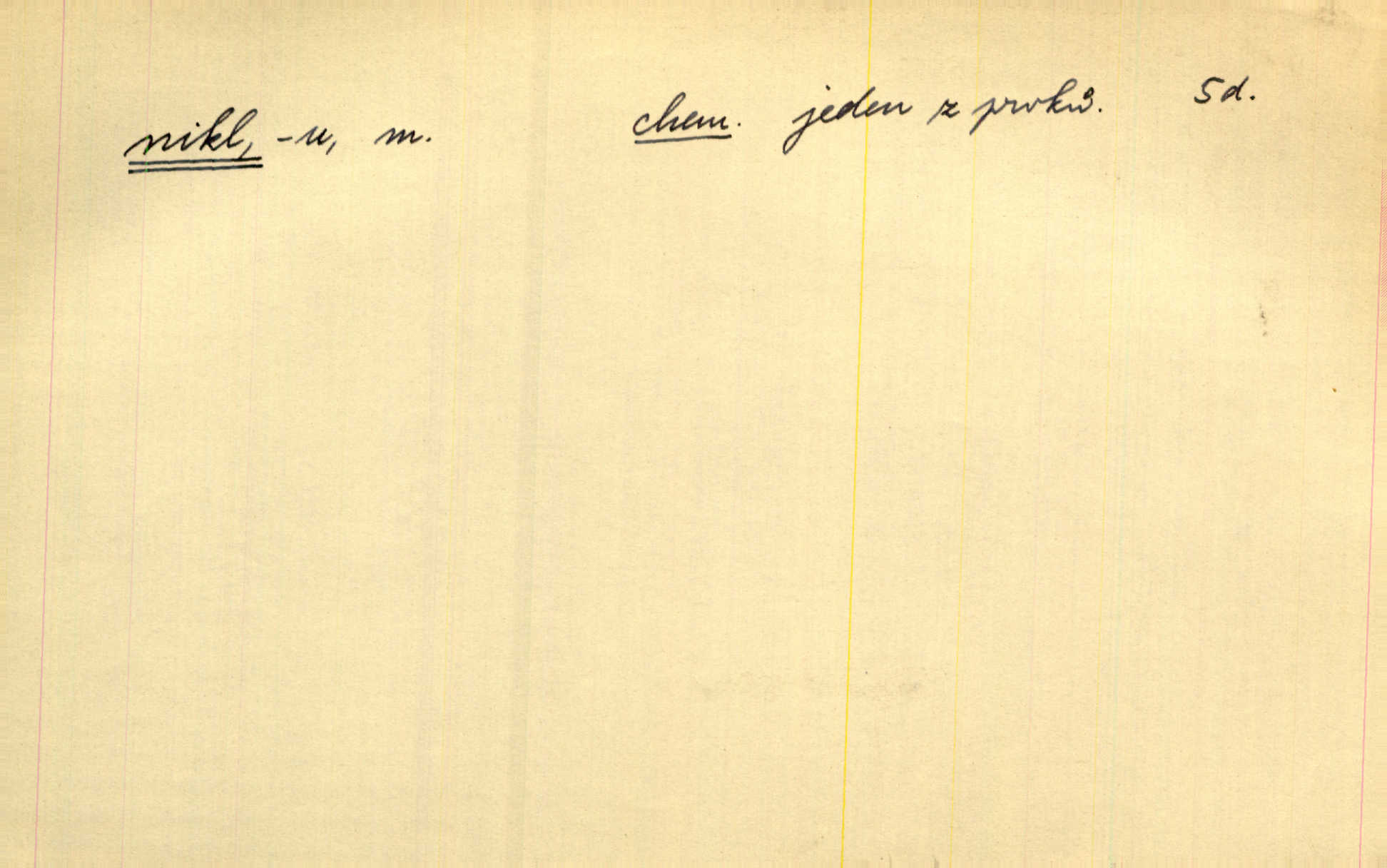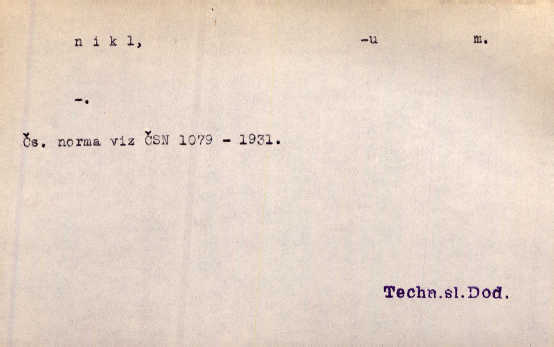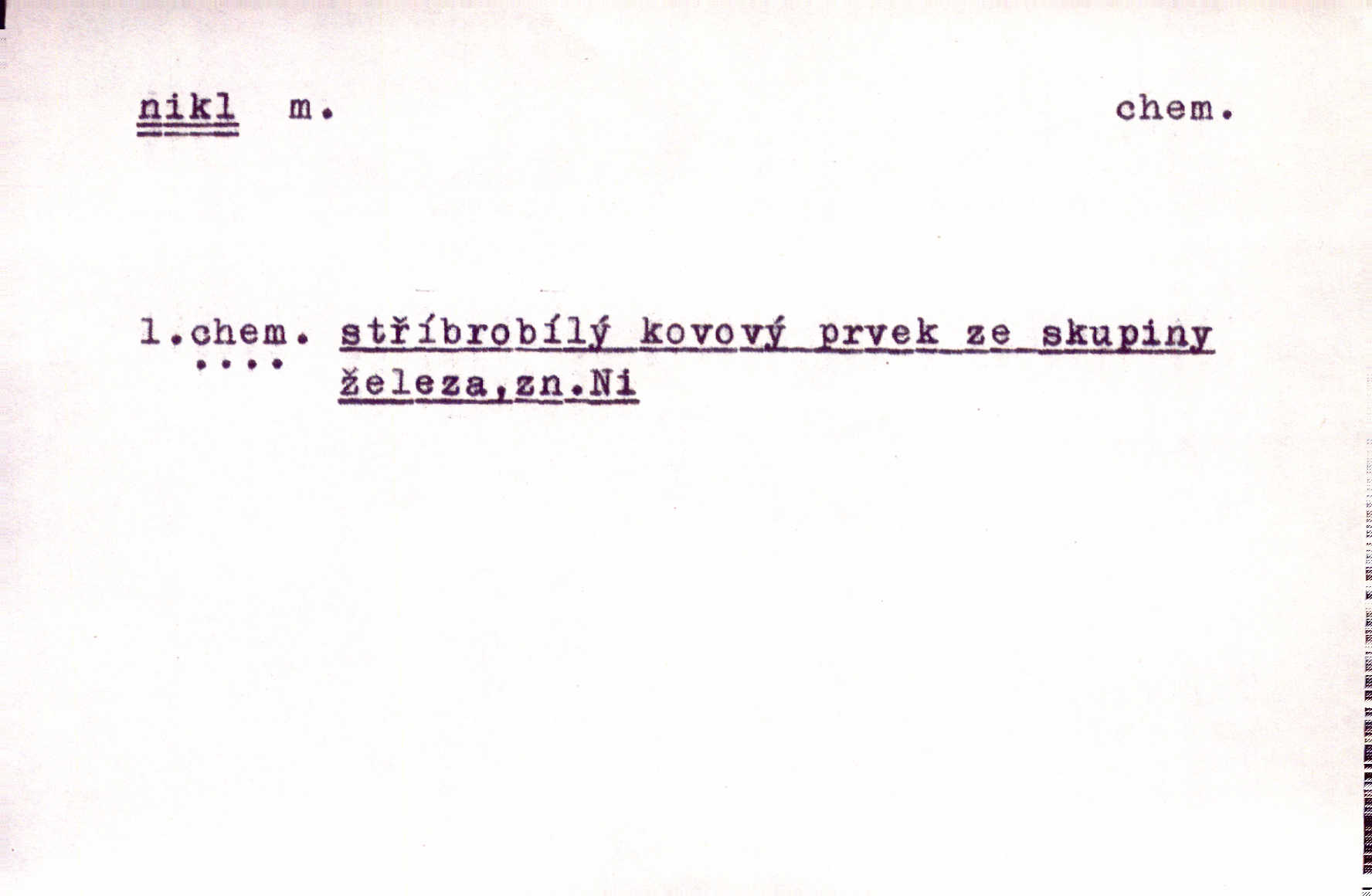 - nikl (vysl. ny-), -u m. stříbrobílý lesklý tažný kov ze skupiny železa. Užívalo se mincí, obsahujících nikl. MSN. D niklový peníz, niklové peníze. Mimosu od ženy zkřehlé u patníku vy v nádherném svém převlečníku jste koupila za niklů pár. Bor. Přichází [chudý] třebas pro petrolej či pro čtvrtku chleba a platí někdy niklem, jindy stříbrem. Dur.