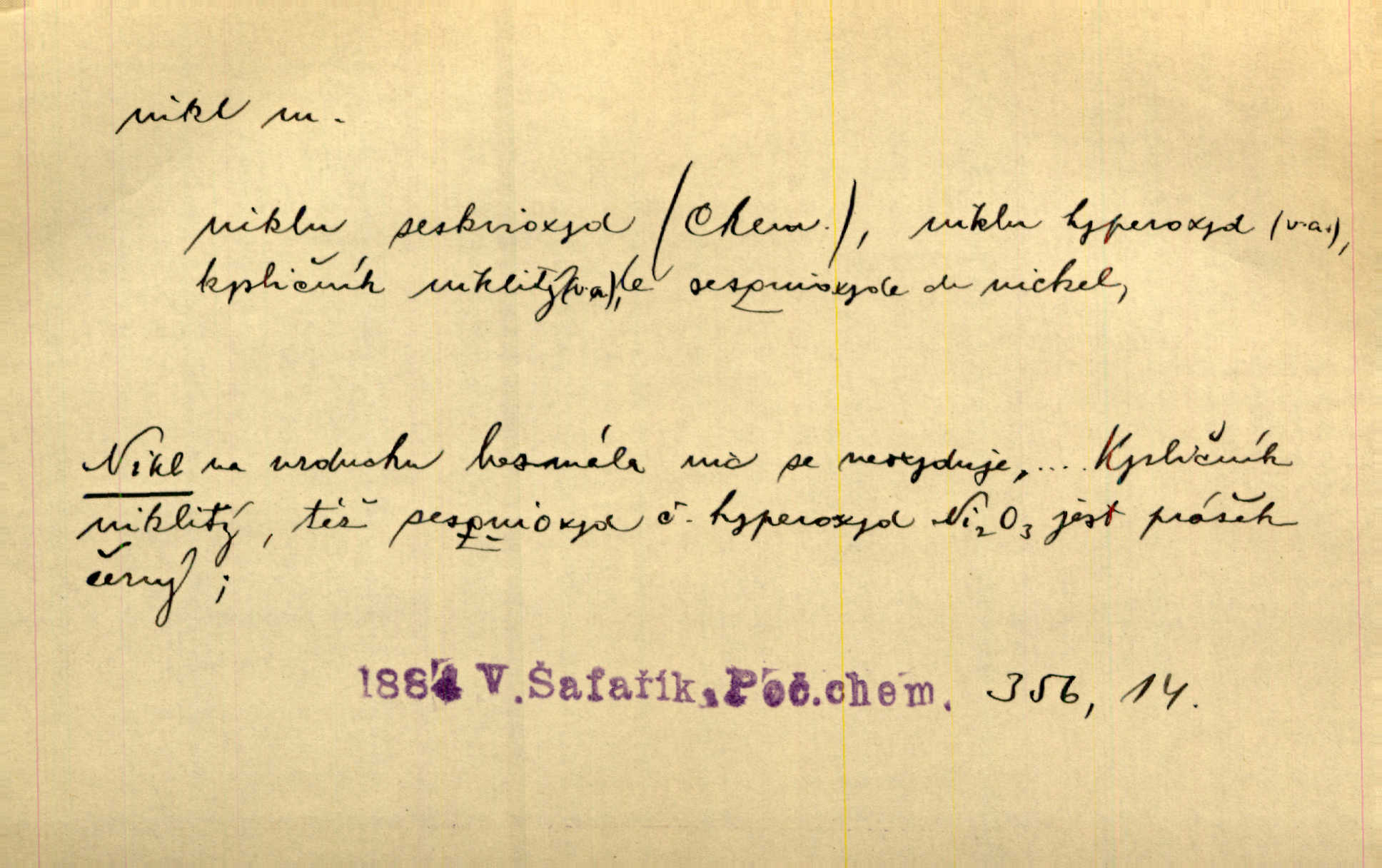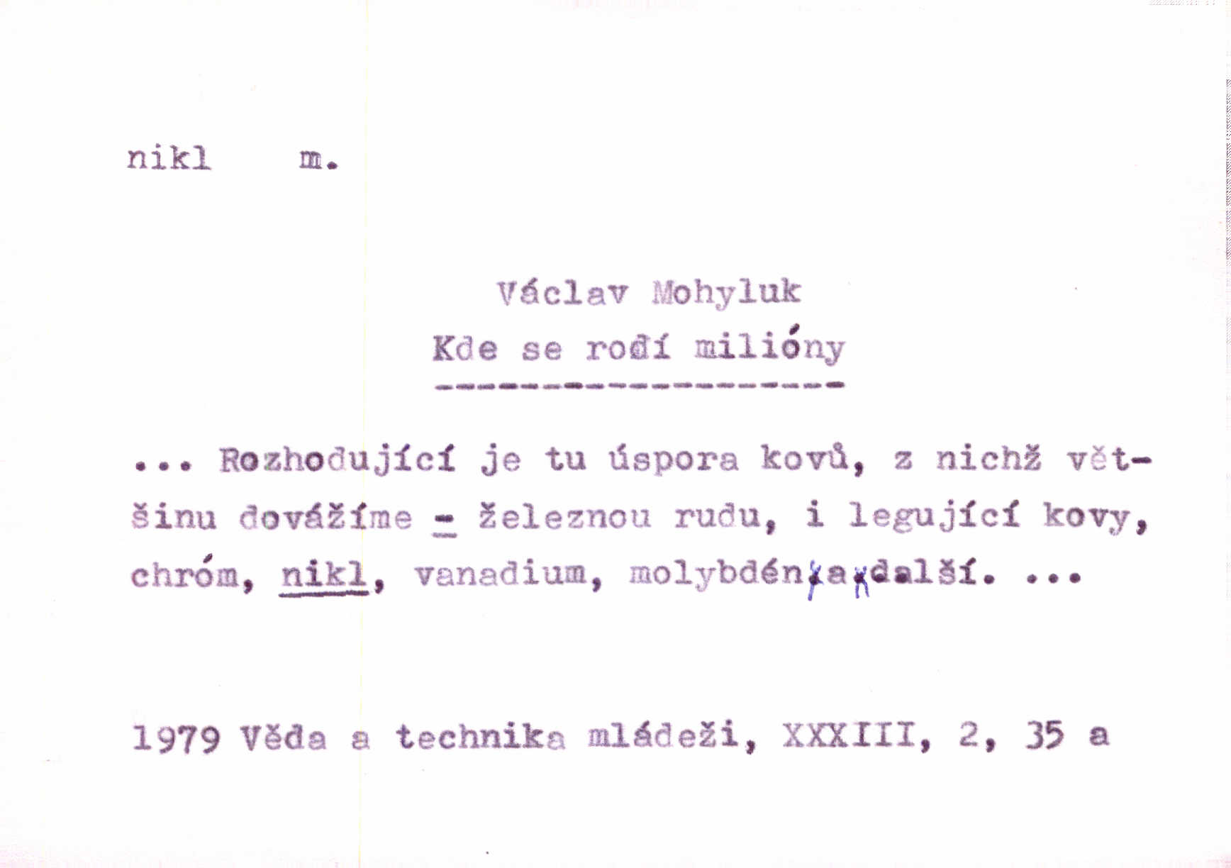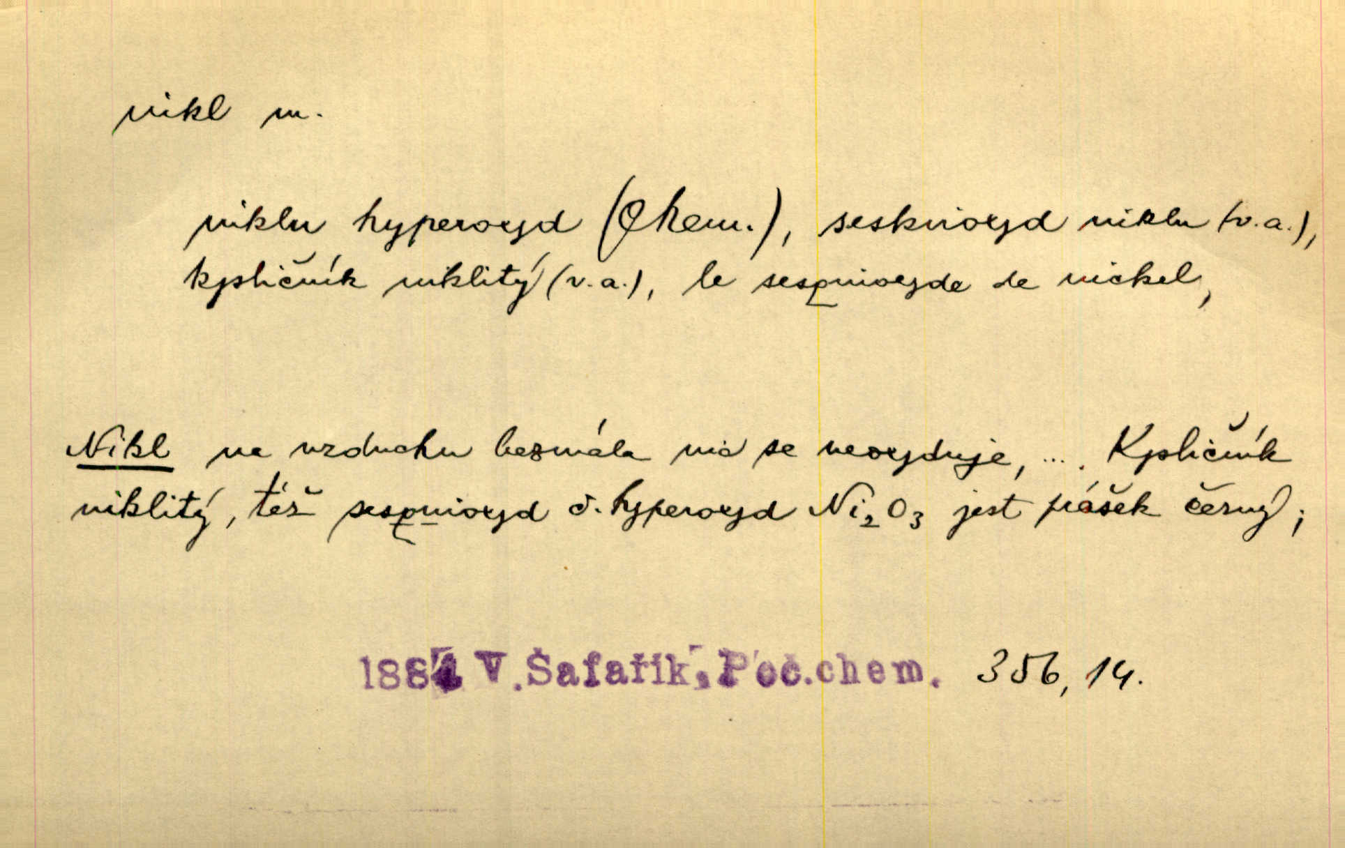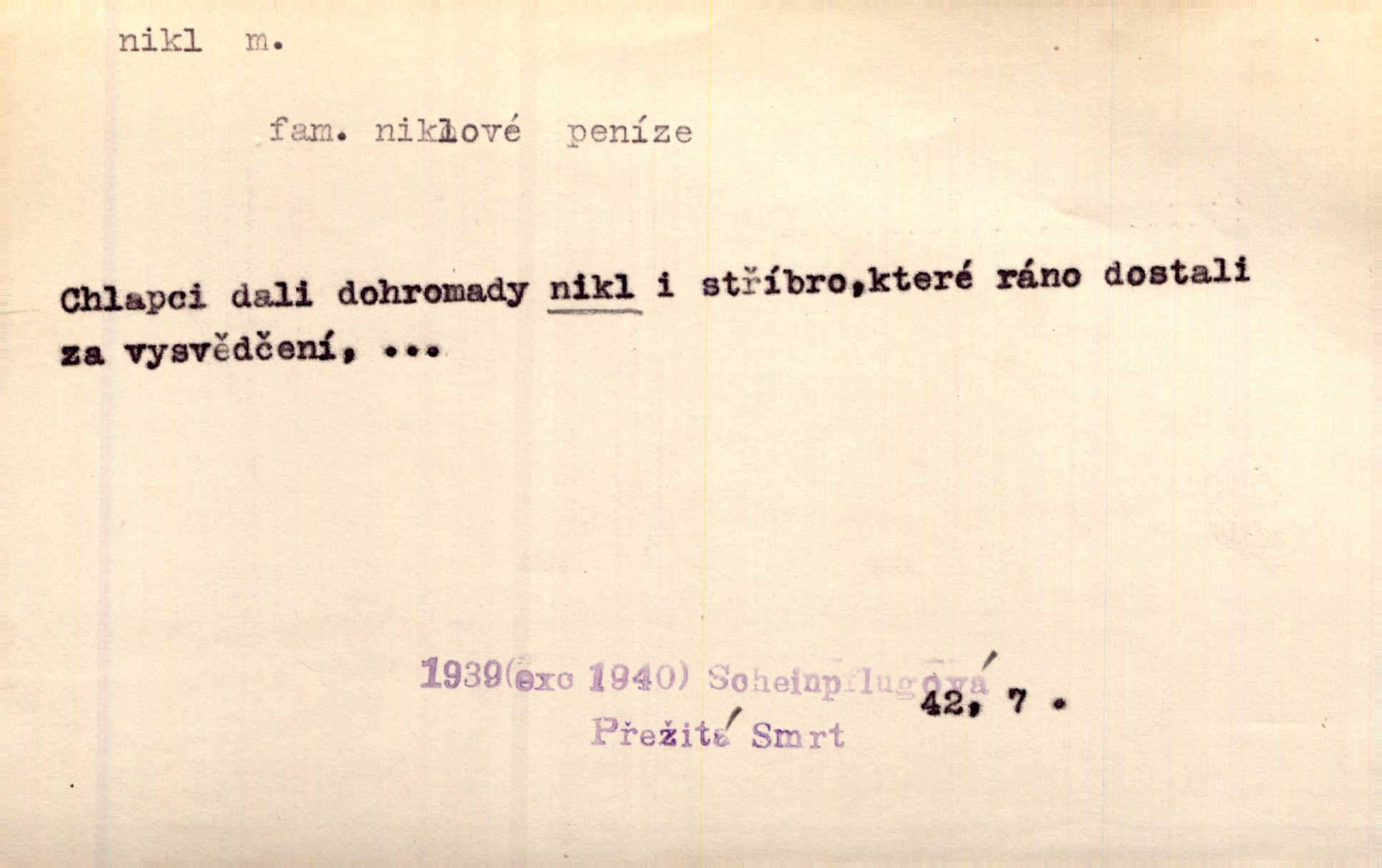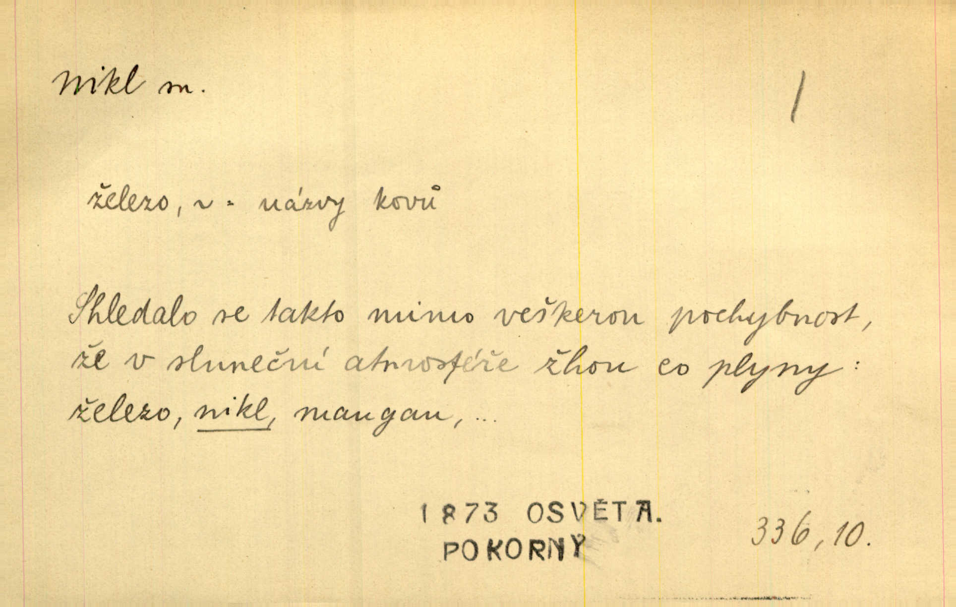 - nikl (vysl. ny-), -u m. stříbrobílý lesklý tažný kov ze skupiny železa. Užívalo se mincí, obsahujících nikl. MSN. D niklový peníz, niklové peníze. Mimosu od ženy zkřehlé u patníku vy v nádherném svém převlečníku jste koupila za niklů pár. Bor. Přichází [chudý] třebas pro petrolej či pro čtvrtku chleba a platí někdy niklem, jindy stříbrem. Dur.