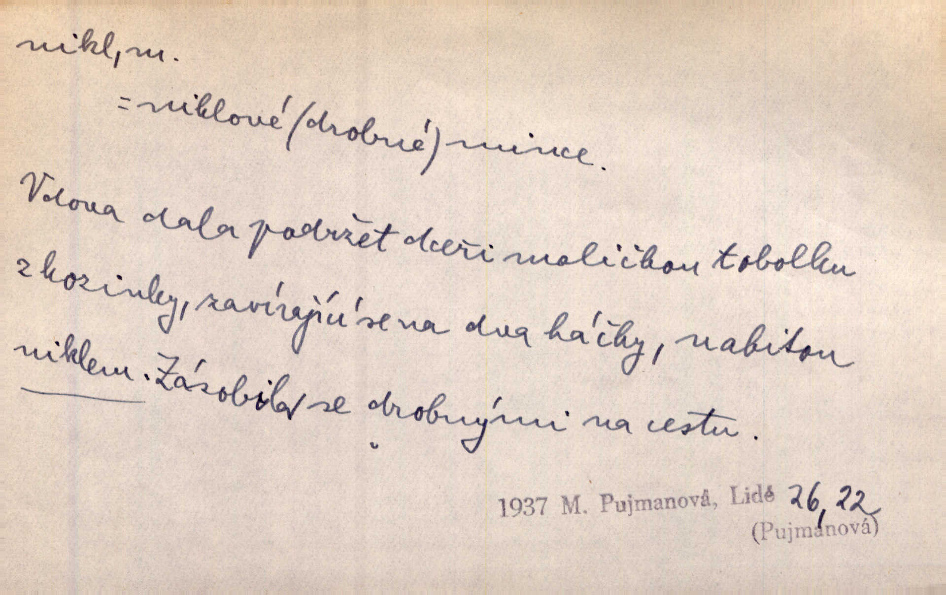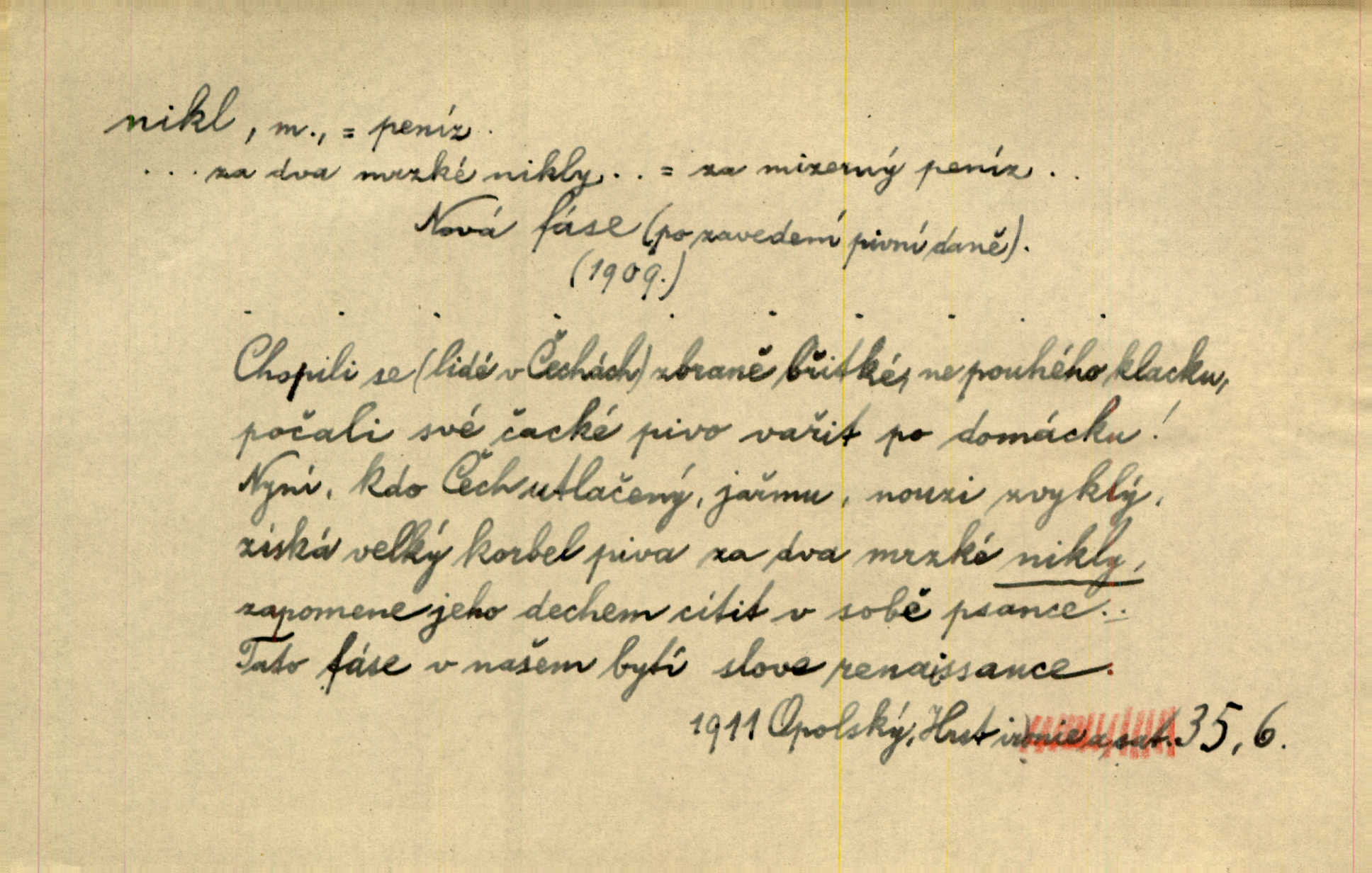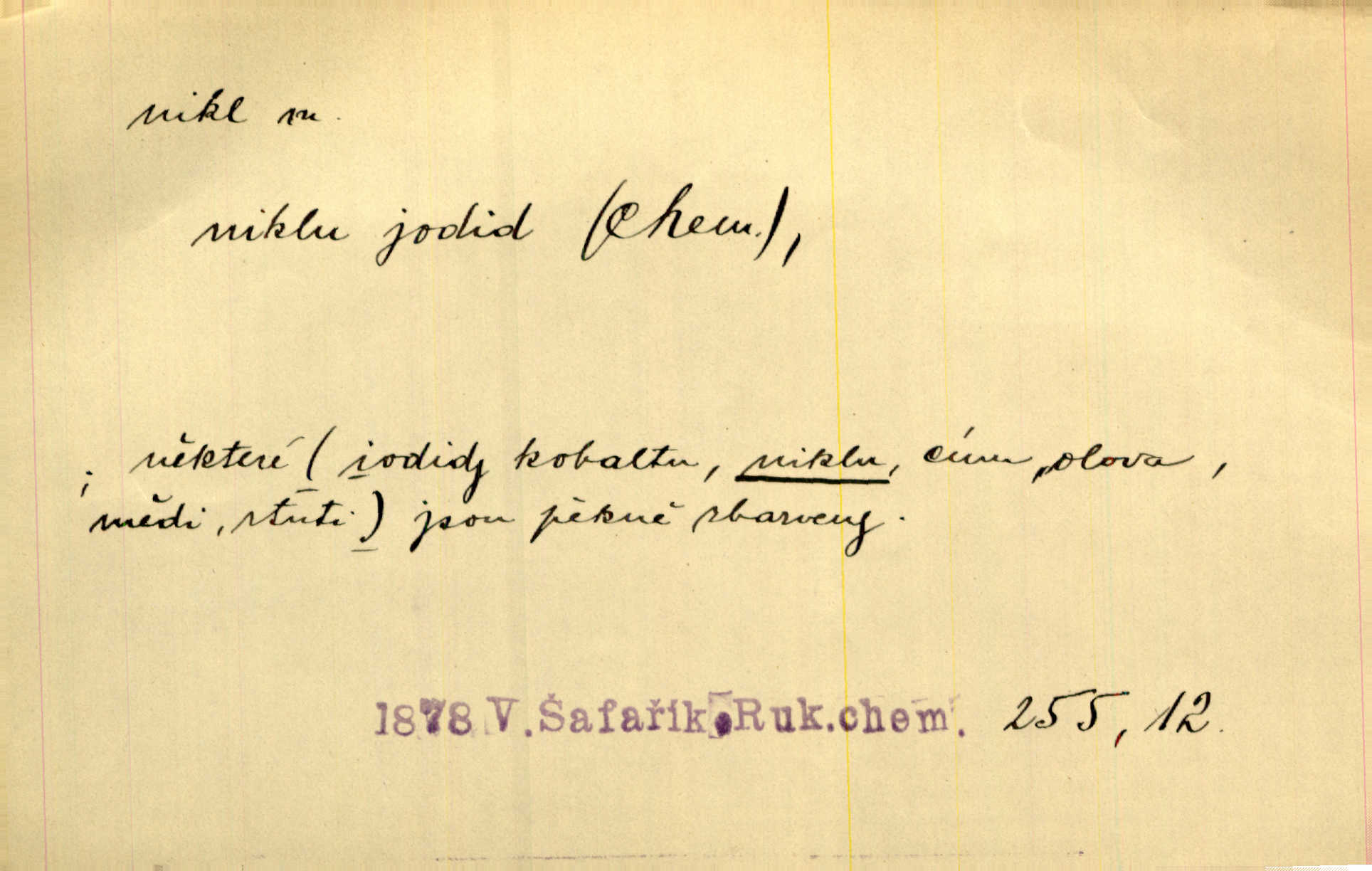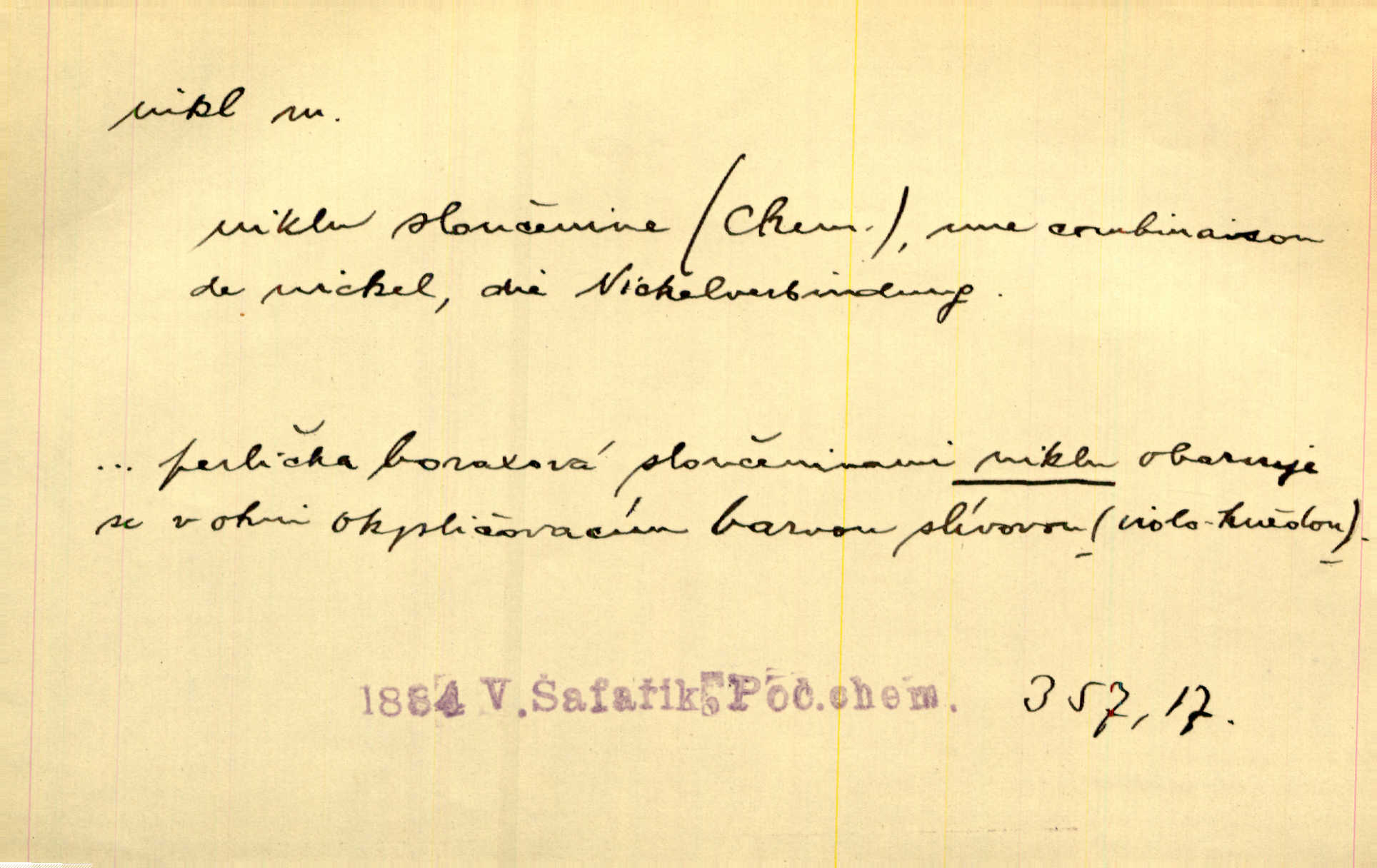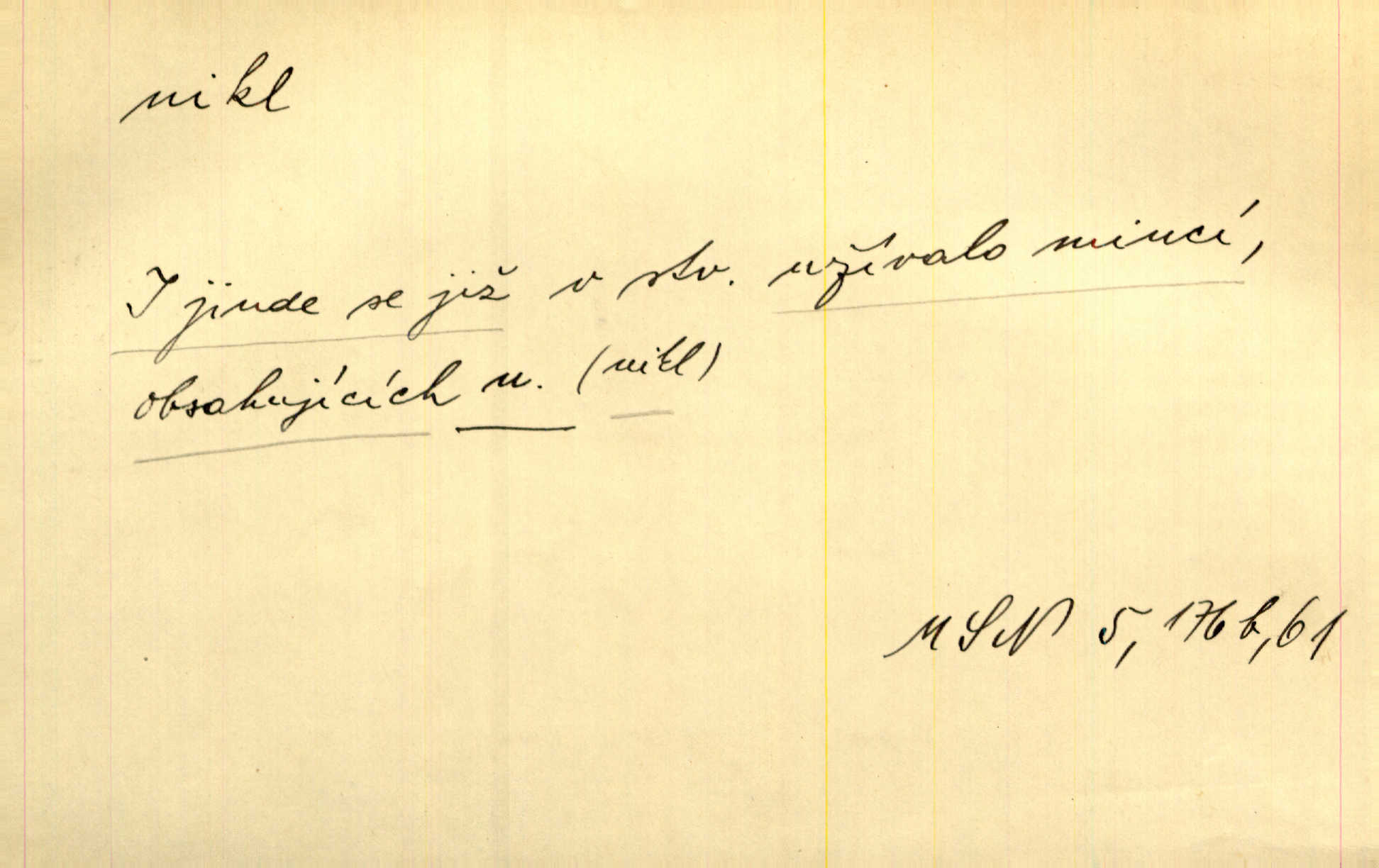 - nikl (vysl. ny-), -u m. stříbrobílý lesklý tažný kov ze skupiny železa. Užívalo se mincí, obsahujících nikl. MSN. D niklový peníz, niklové peníze. Mimosu od ženy zkřehlé u patníku vy v nádherném svém převlečníku jste koupila za niklů pár. Bor. Přichází [chudý] třebas pro petrolej či pro čtvrtku chleba a platí někdy niklem, jindy stříbrem. Dur.