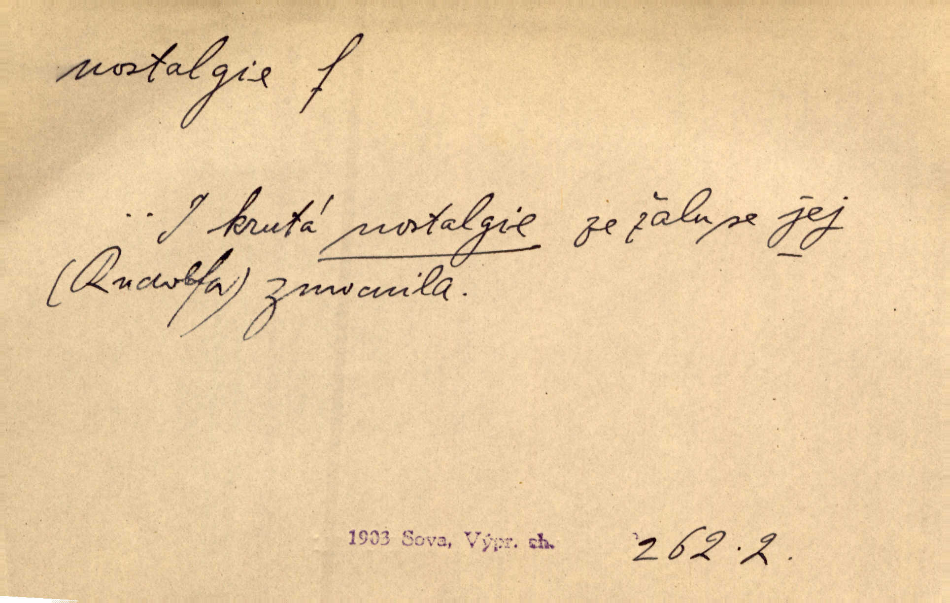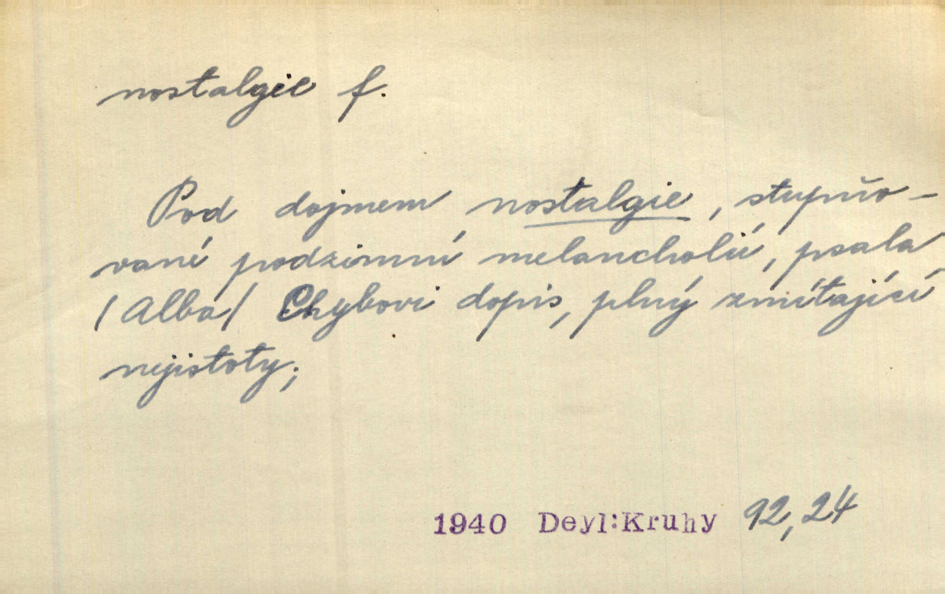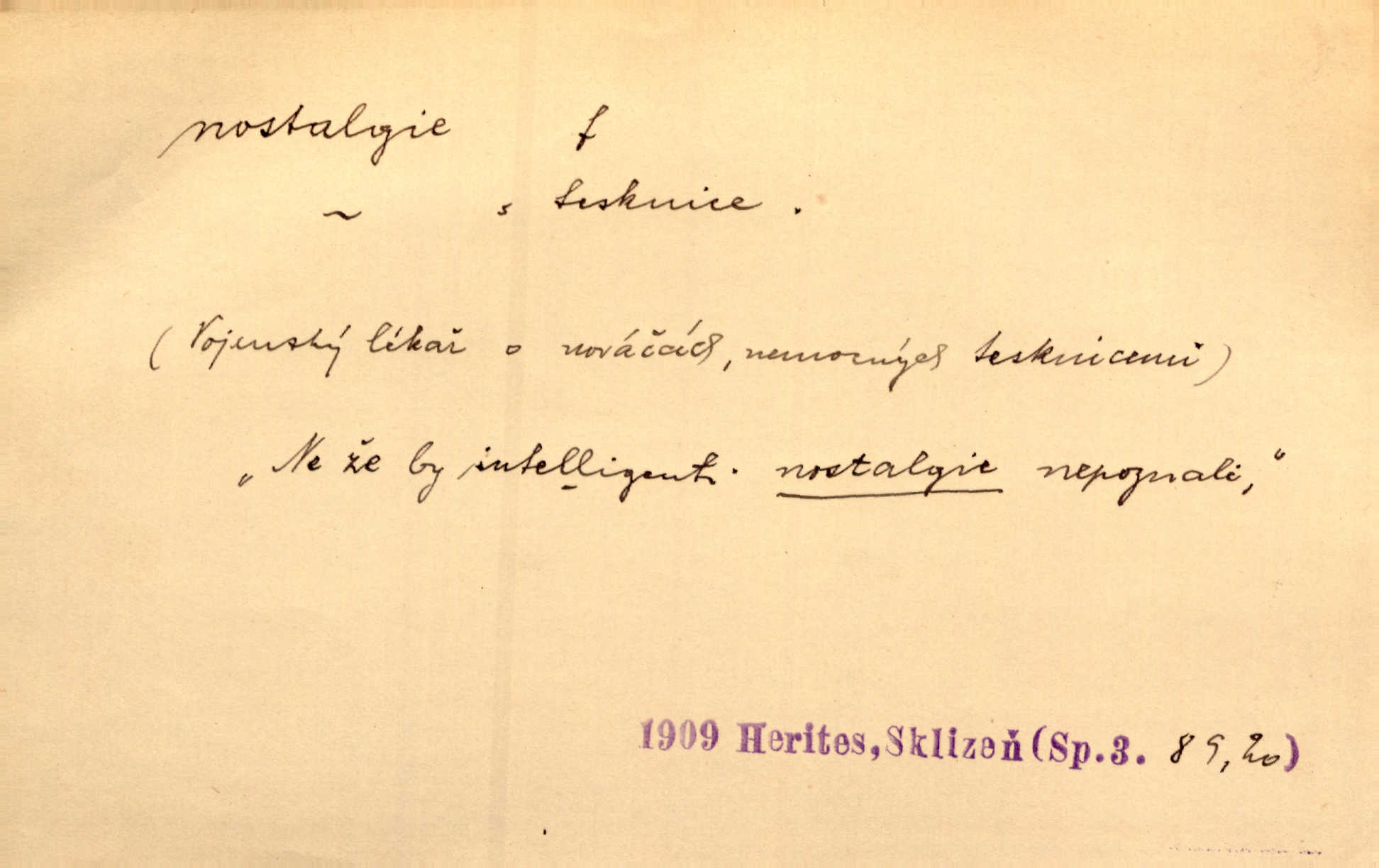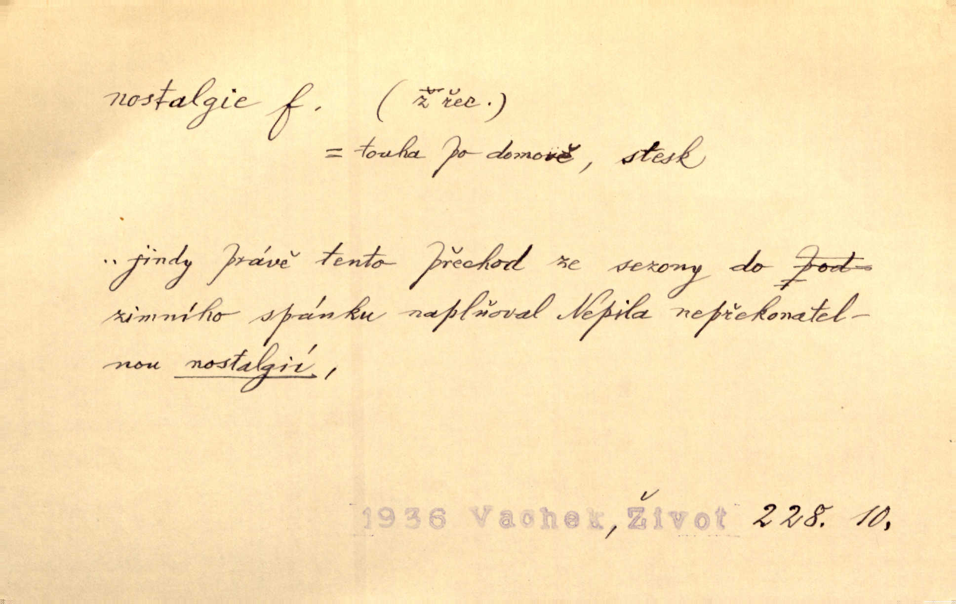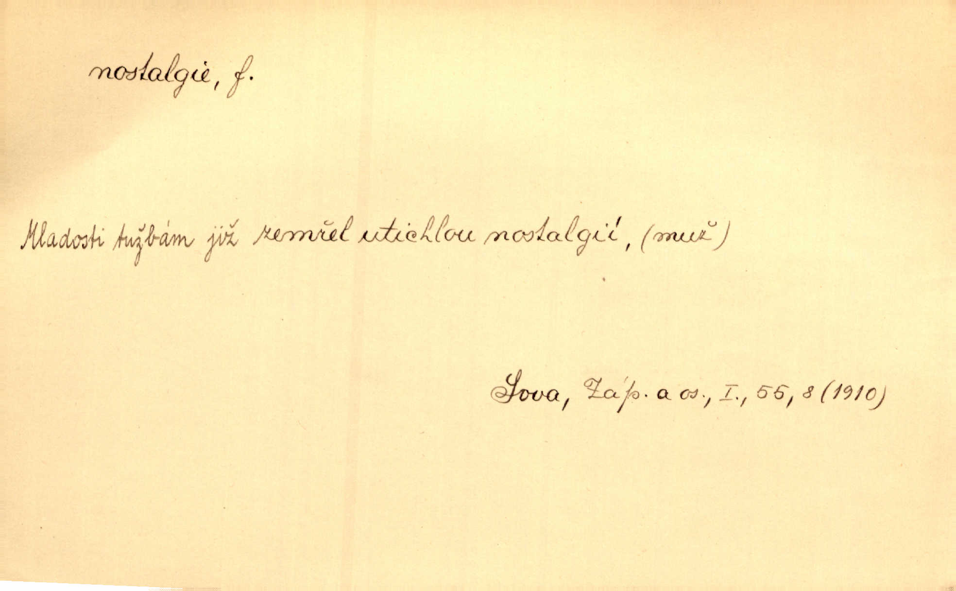 - nostalgie, -e f. stesk po domově; teskná touha po něčem. Divná, divná je ta nostalgie duše lidské v cizině. A. Mrš. Zastesklo se jí čas od času nostalgií venkovského děcka, kterému jest ve velkém městě úzko. Dur. Dnes poprvé jsem pocítil [suplent na venkově] nostalgii po velkém městě. Vrch. Přes tu chvíli bývá slyšeti po národech: „Zpět k veliké minulosti! Vraťme se k otcům!“… Tato nostalgie je typická pro chvíle slabosti. K. Čap.