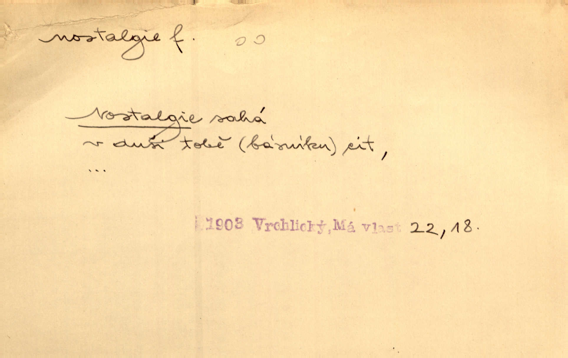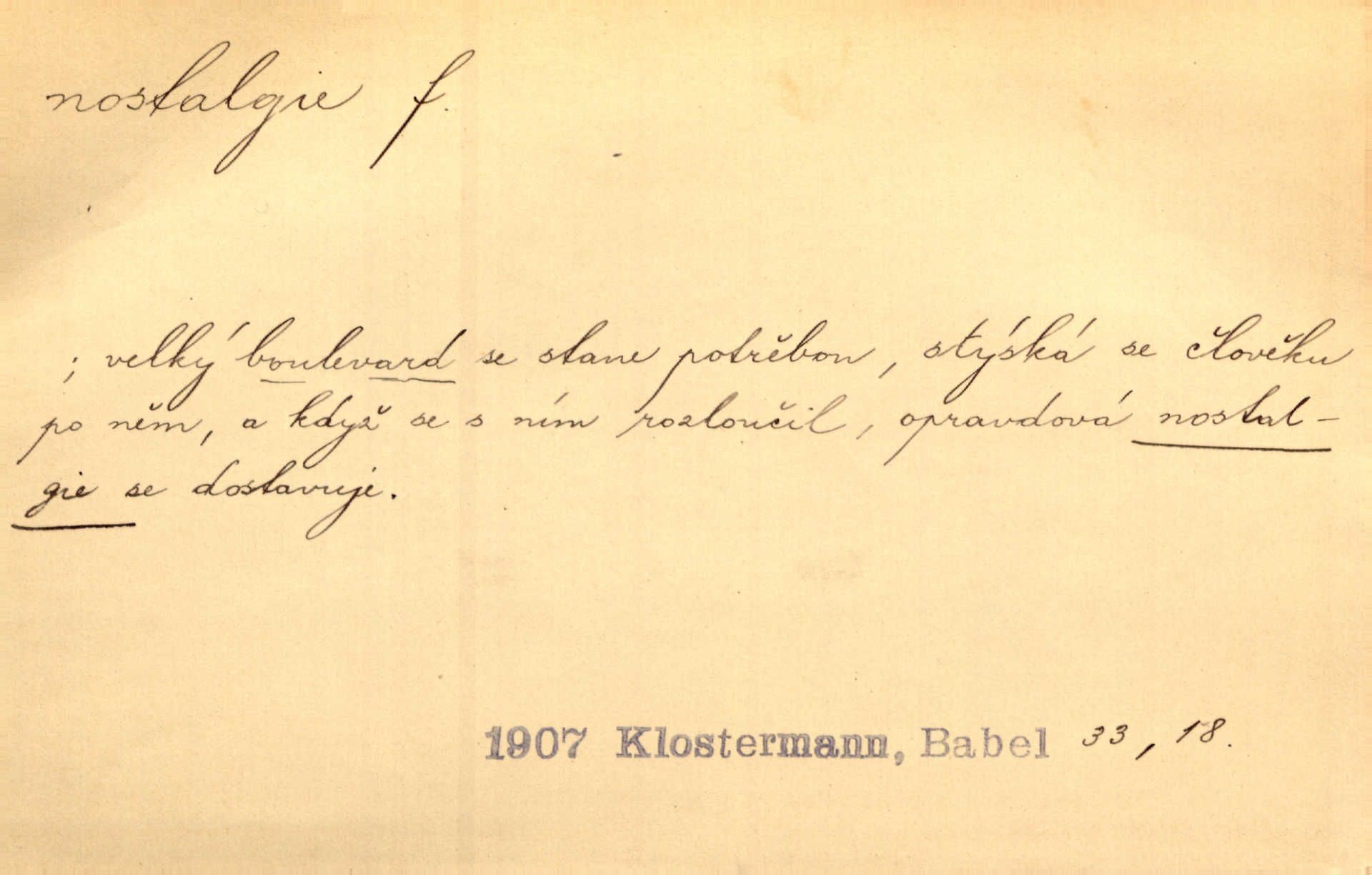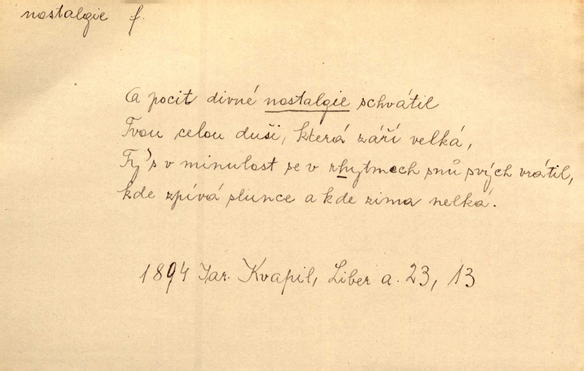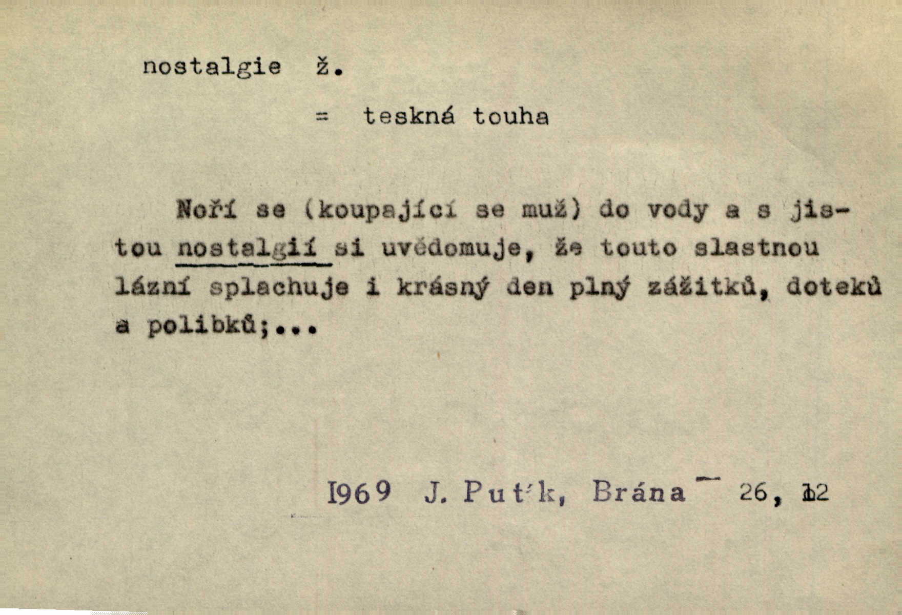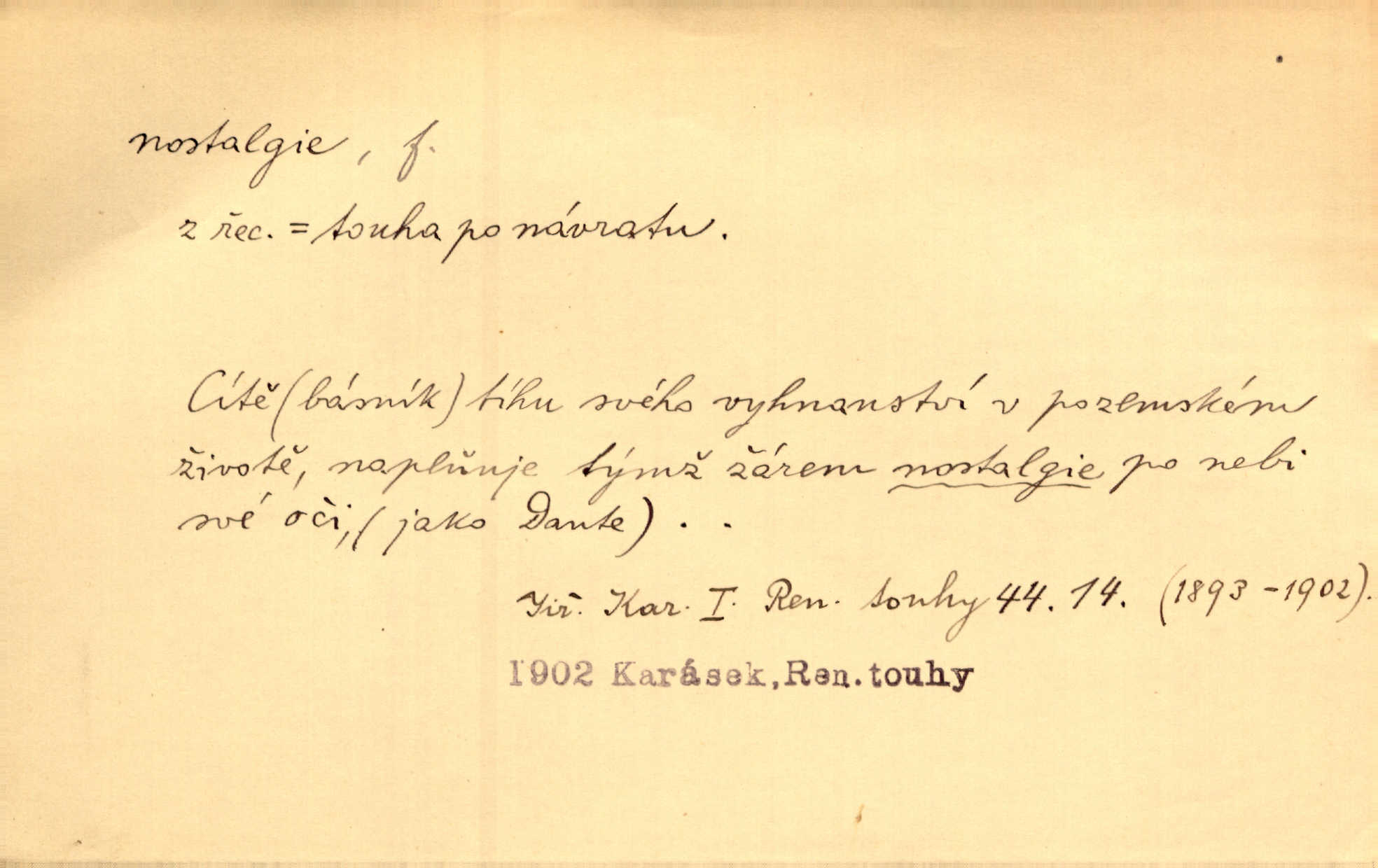 - nostalgie, -e f. stesk po domově; teskná touha po něčem. Divná, divná je ta nostalgie duše lidské v cizině. A. Mrš. Zastesklo se jí čas od času nostalgií venkovského děcka, kterému jest ve velkém městě úzko. Dur. Dnes poprvé jsem pocítil [suplent na venkově] nostalgii po velkém městě. Vrch. Přes tu chvíli bývá slyšeti po národech: „Zpět k veliké minulosti! Vraťme se k otcům!“… Tato nostalgie je typická pro chvíle slabosti. K. Čap.