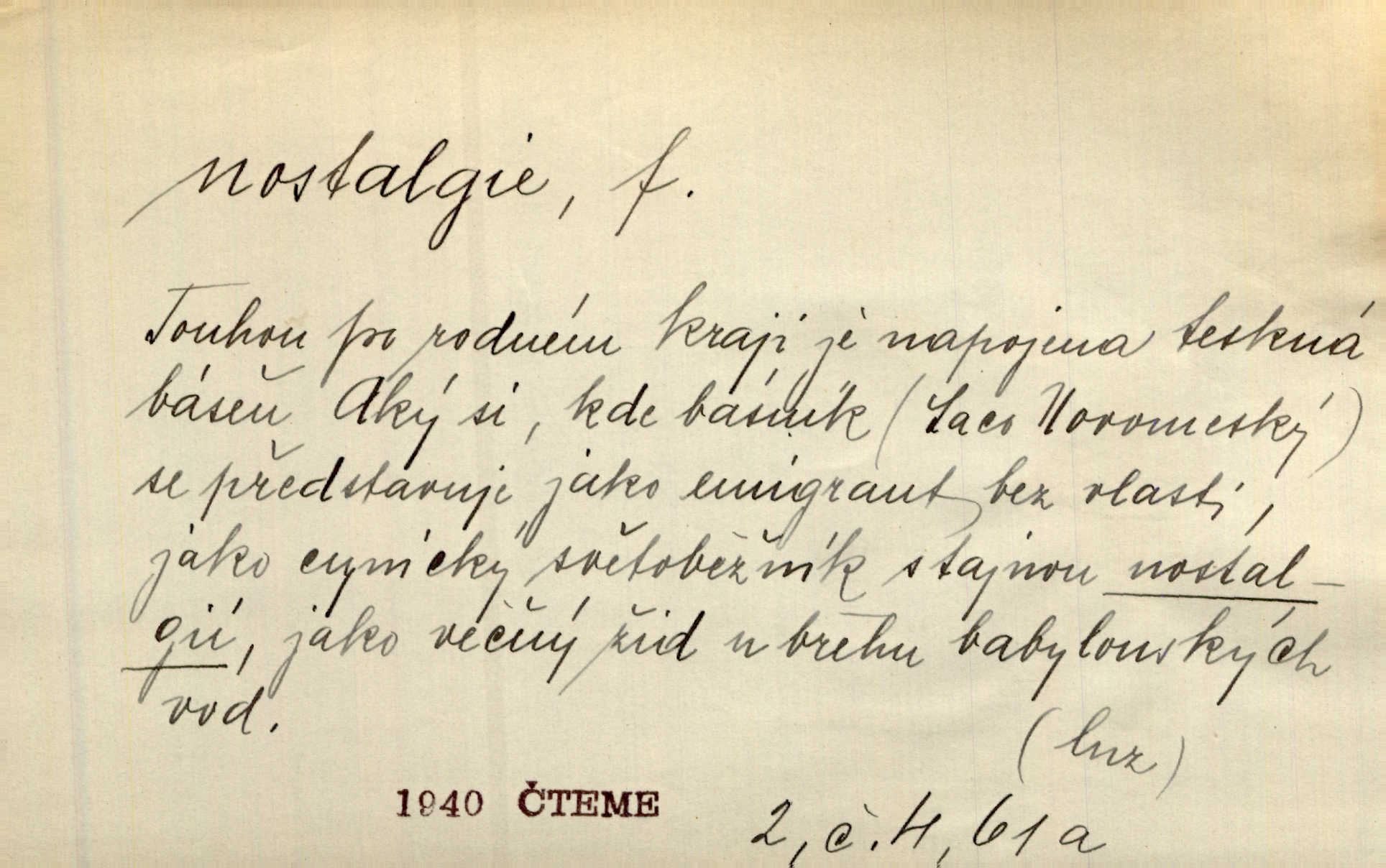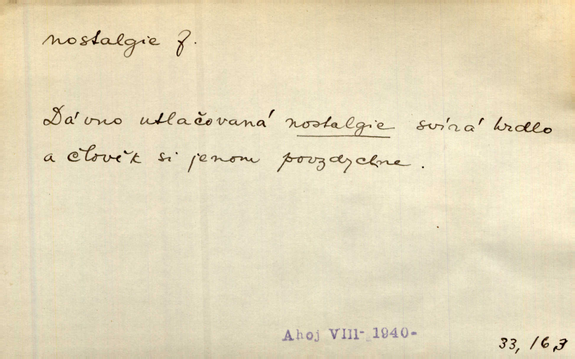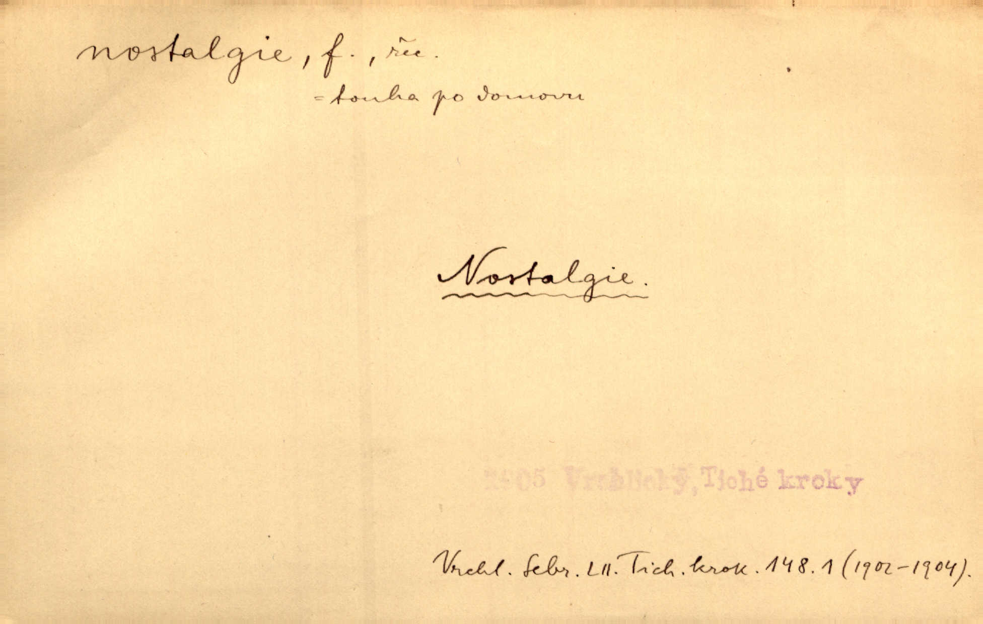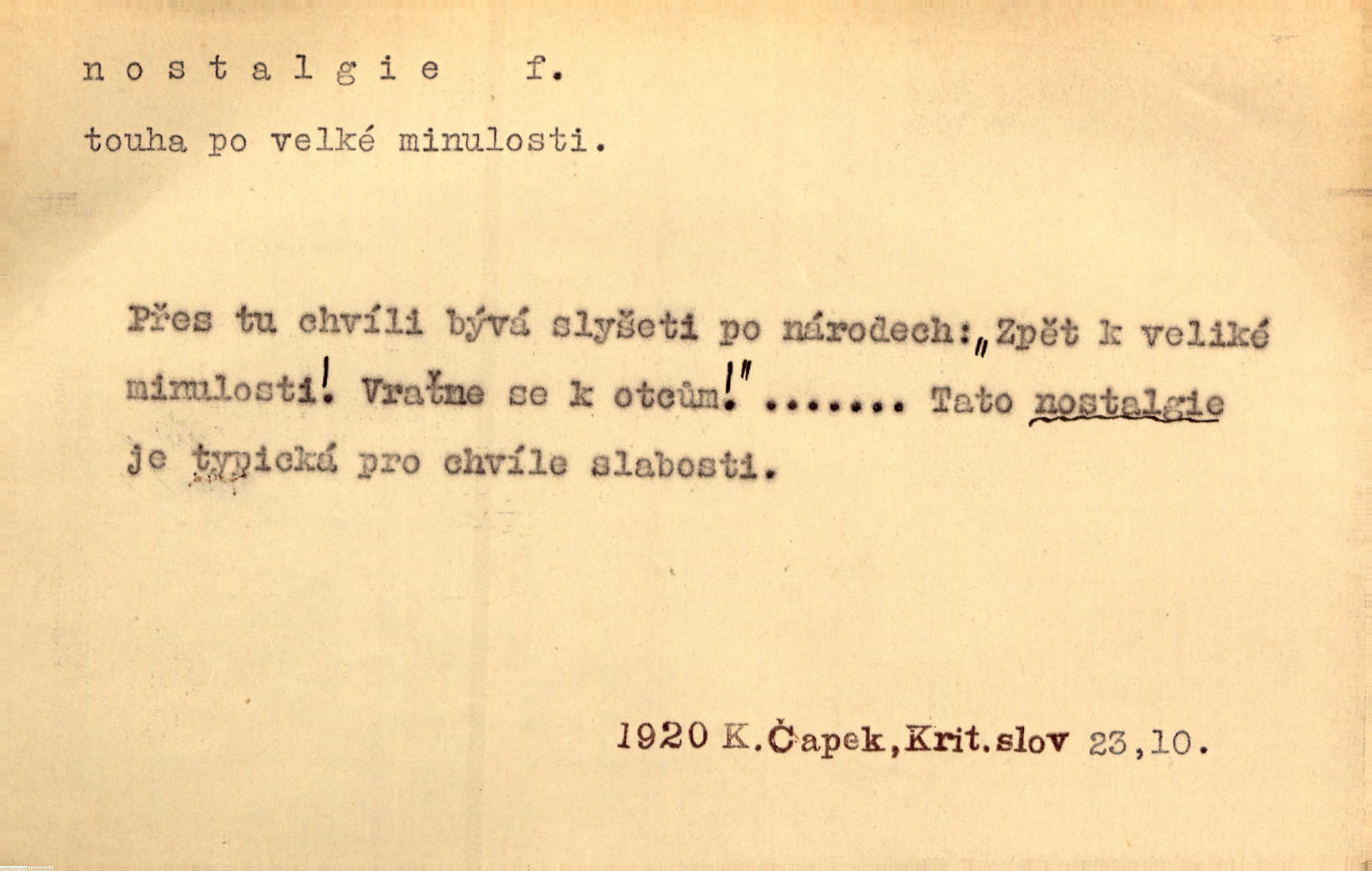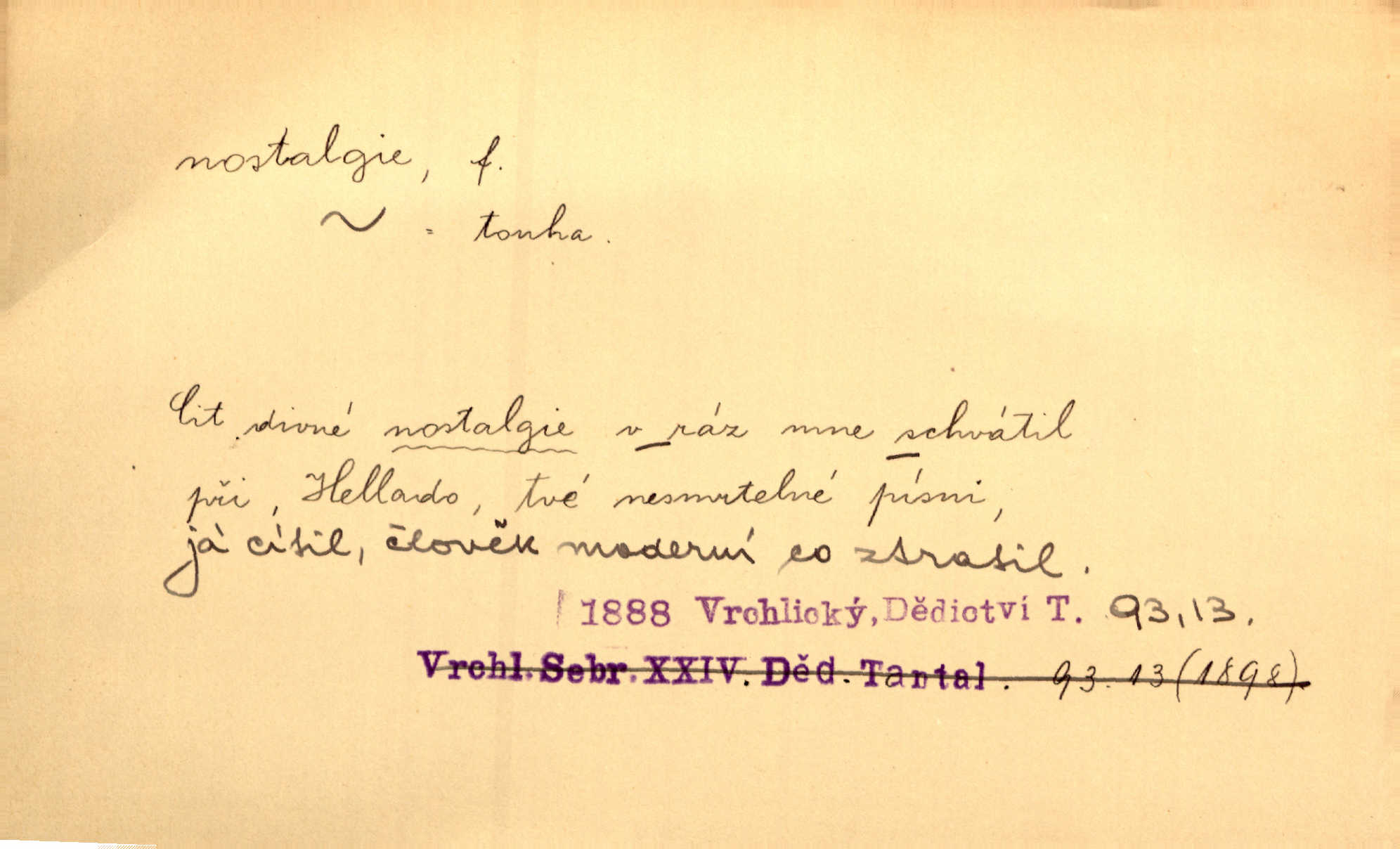 - nostalgie, -e f. stesk po domově; teskná touha po něčem. Divná, divná je ta nostalgie duše lidské v cizině. A. Mrš. Zastesklo se jí čas od času nostalgií venkovského děcka, kterému jest ve velkém městě úzko. Dur. Dnes poprvé jsem pocítil [suplent na venkově] nostalgii po velkém městě. Vrch. Přes tu chvíli bývá slyšeti po národech: „Zpět k veliké minulosti! Vraťme se k otcům!“… Tato nostalgie je typická pro chvíle slabosti. K. Čap.