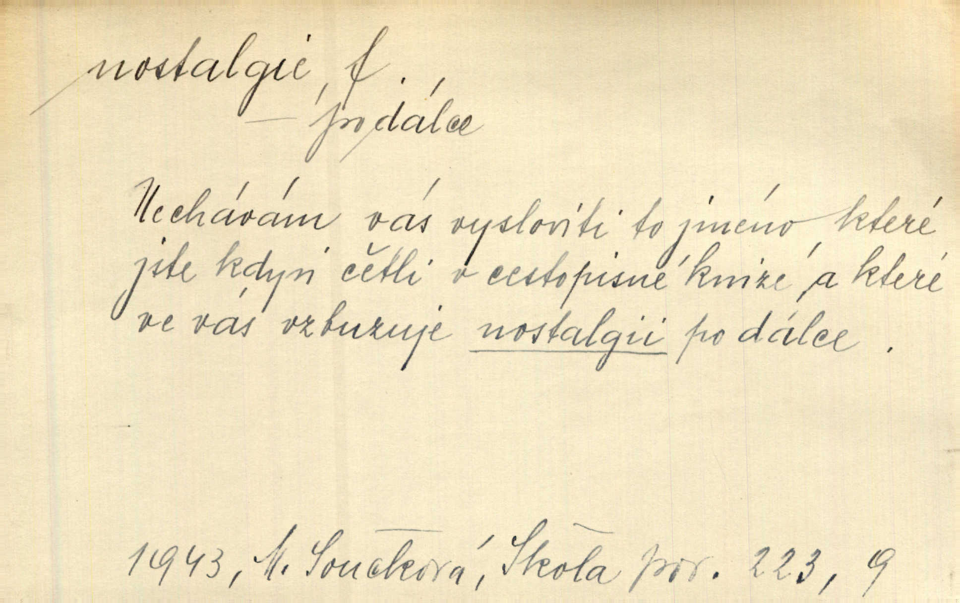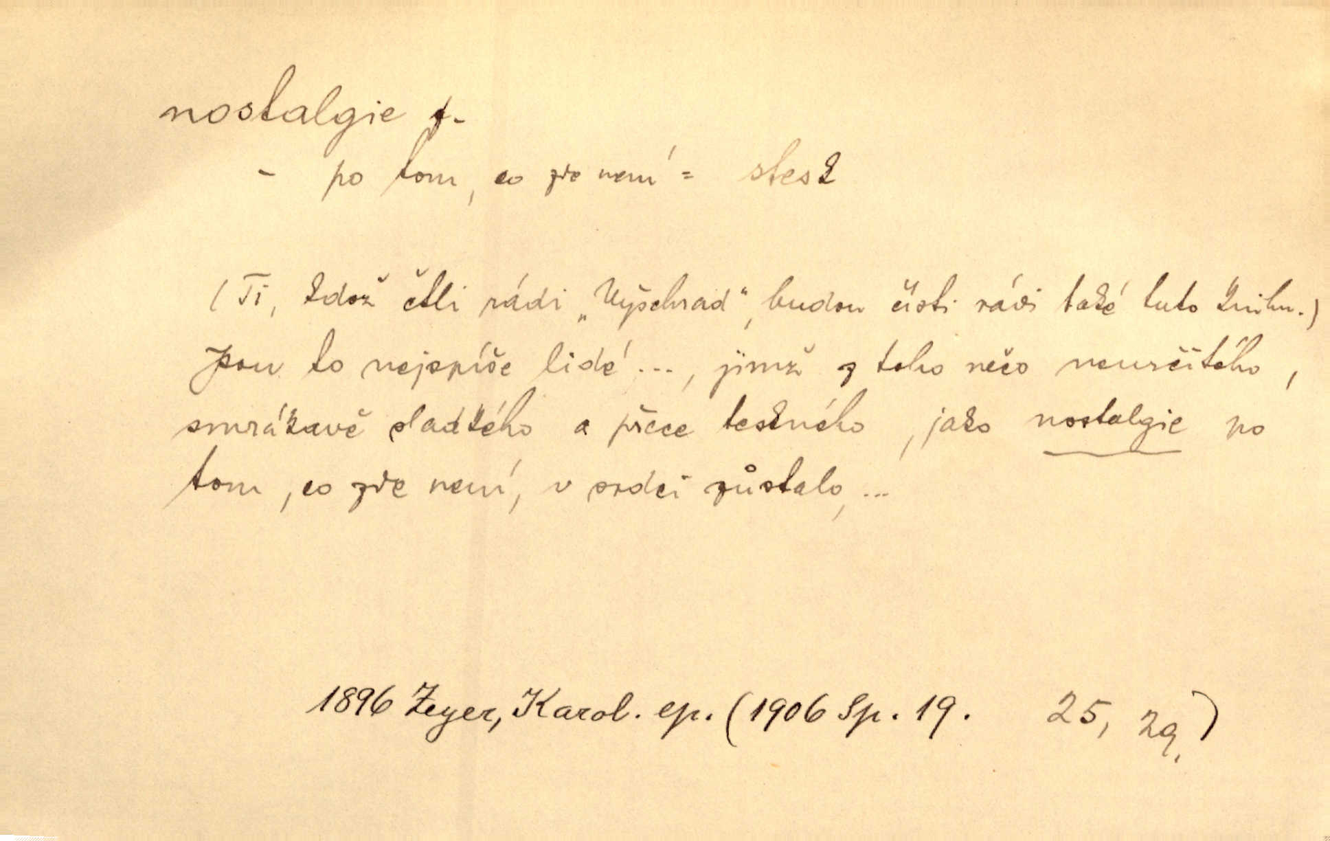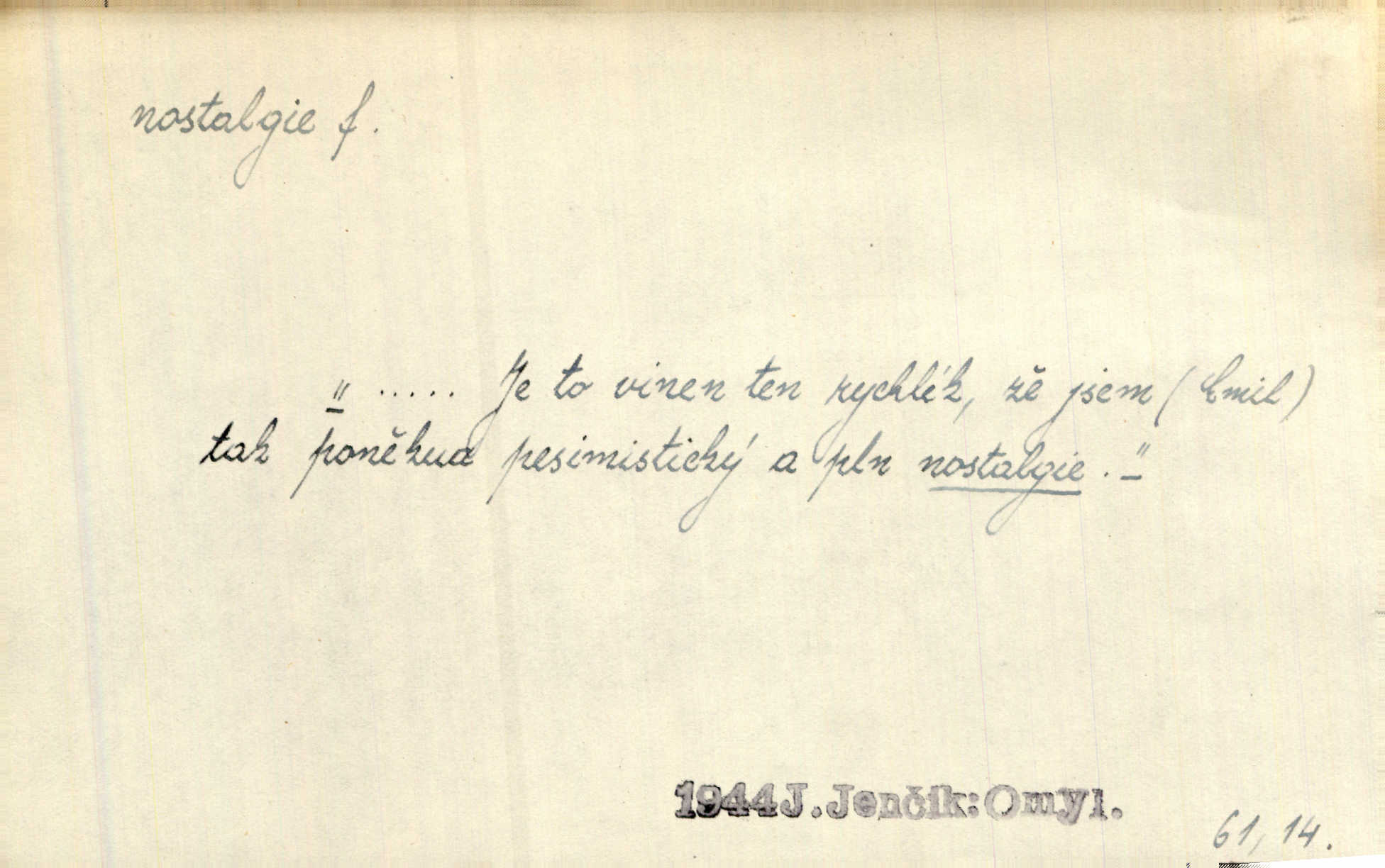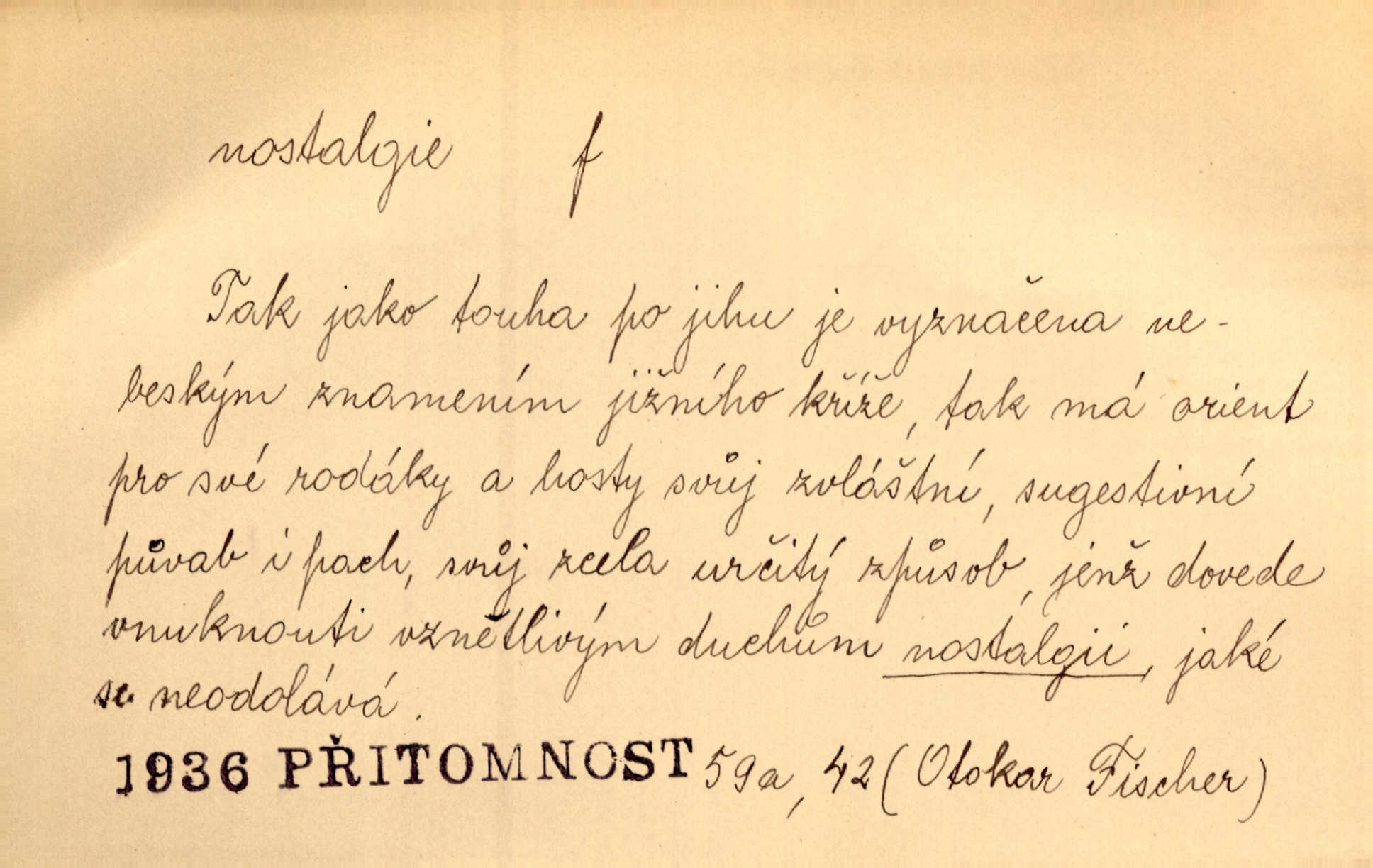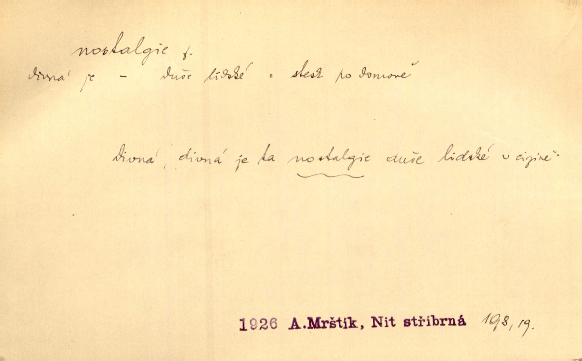 - nostalgie, -e f. stesk po domově; teskná touha po něčem. Divná, divná je ta nostalgie duše lidské v cizině. A. Mrš. Zastesklo se jí čas od času nostalgií venkovského děcka, kterému jest ve velkém městě úzko. Dur. Dnes poprvé jsem pocítil [suplent na venkově] nostalgii po velkém městě. Vrch. Přes tu chvíli bývá slyšeti po národech: „Zpět k veliké minulosti! Vraťme se k otcům!“… Tato nostalgie je typická pro chvíle slabosti. K. Čap.