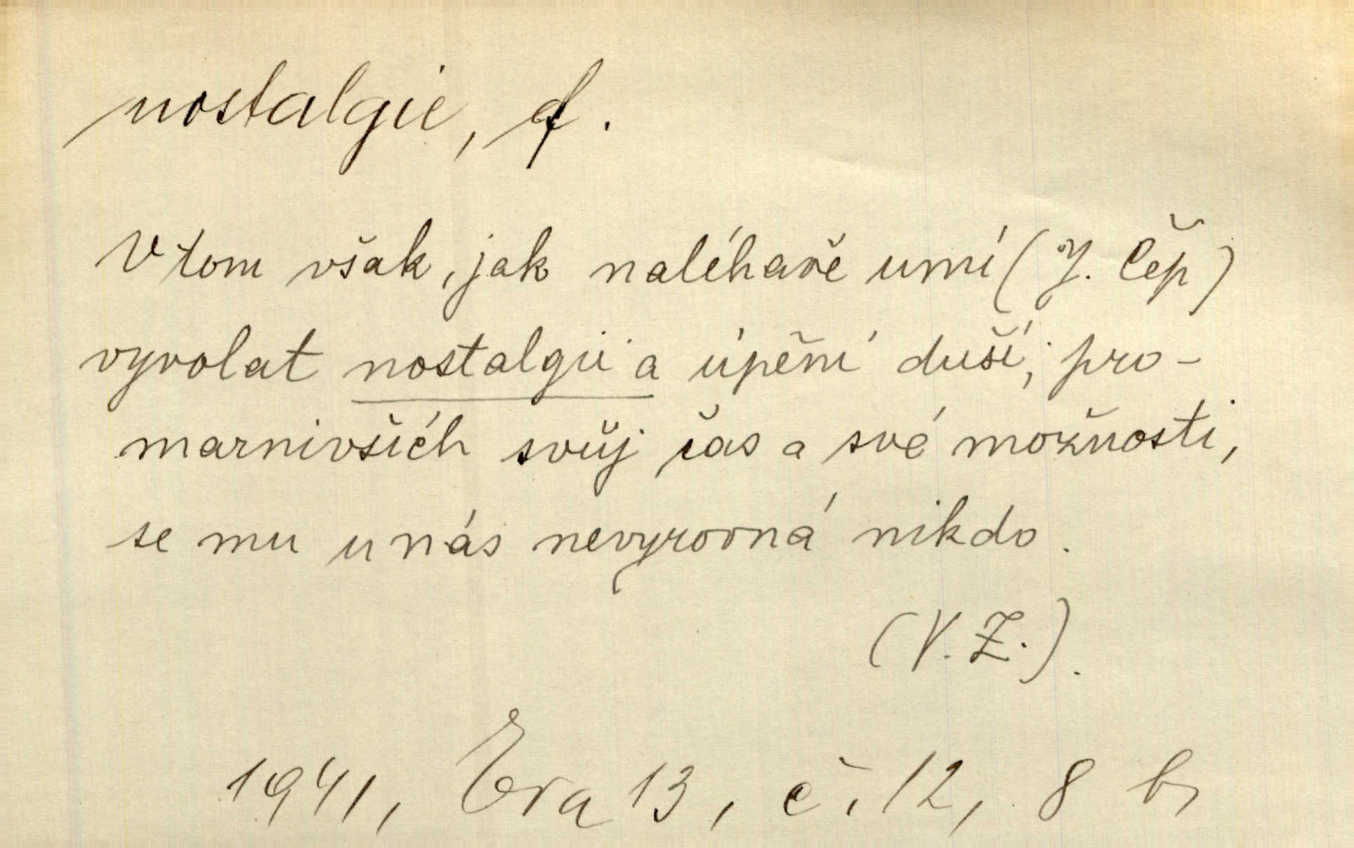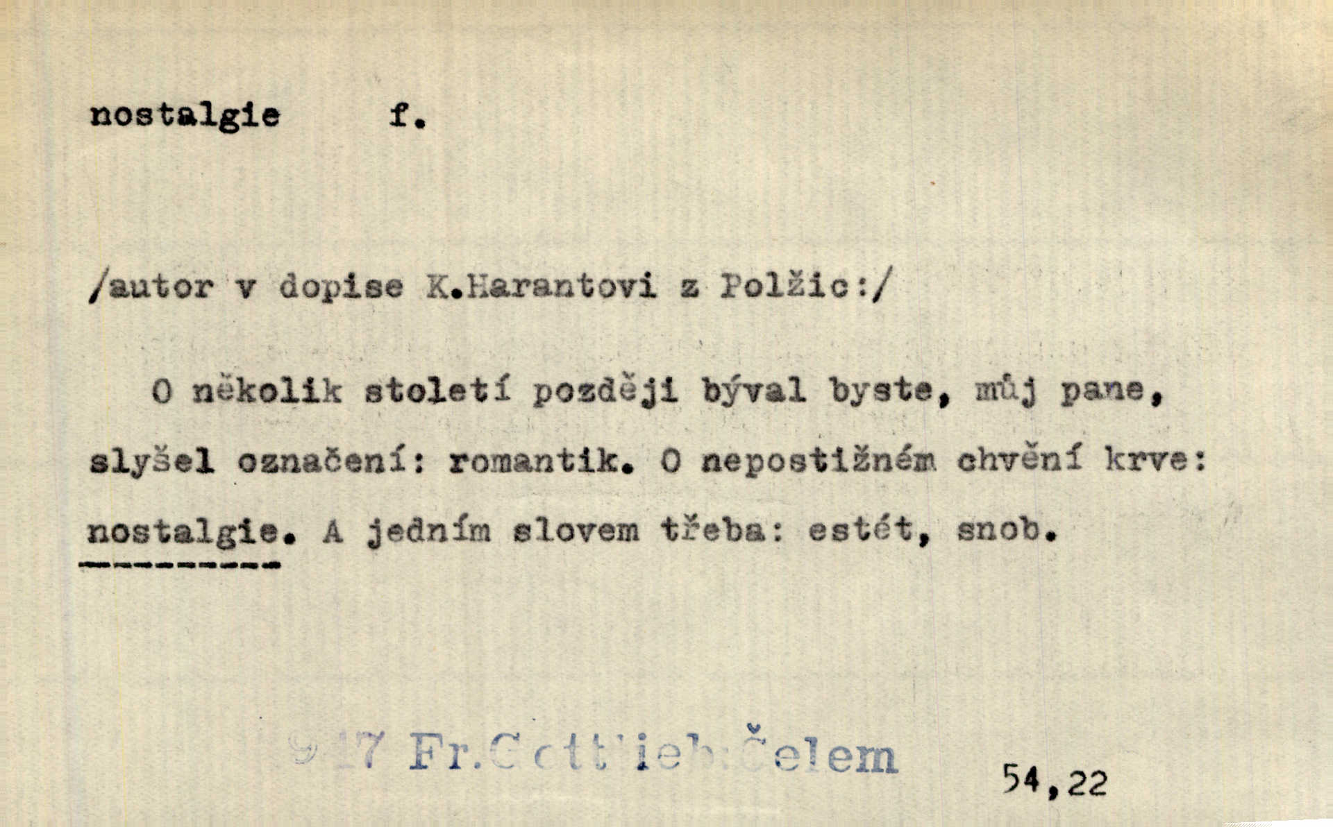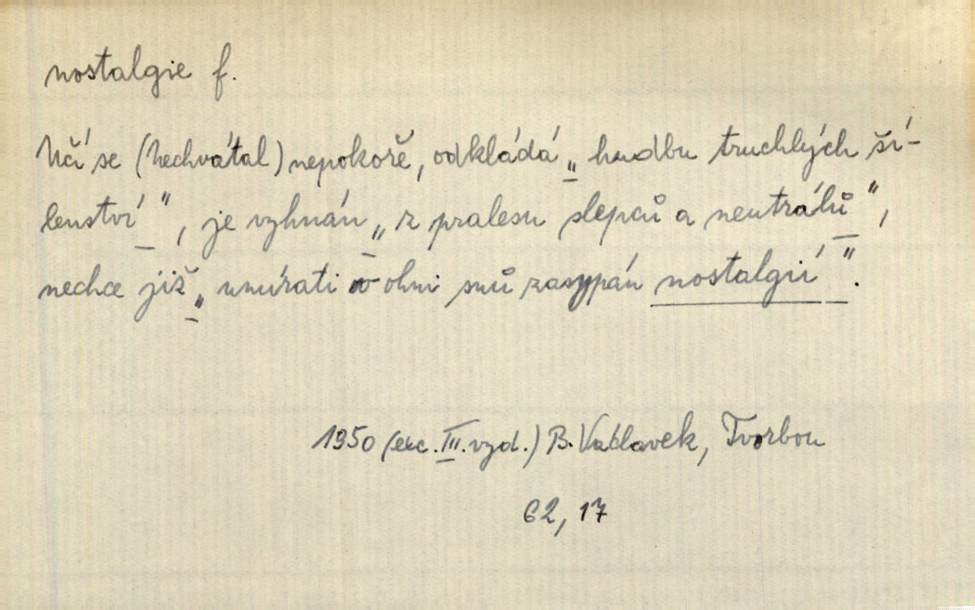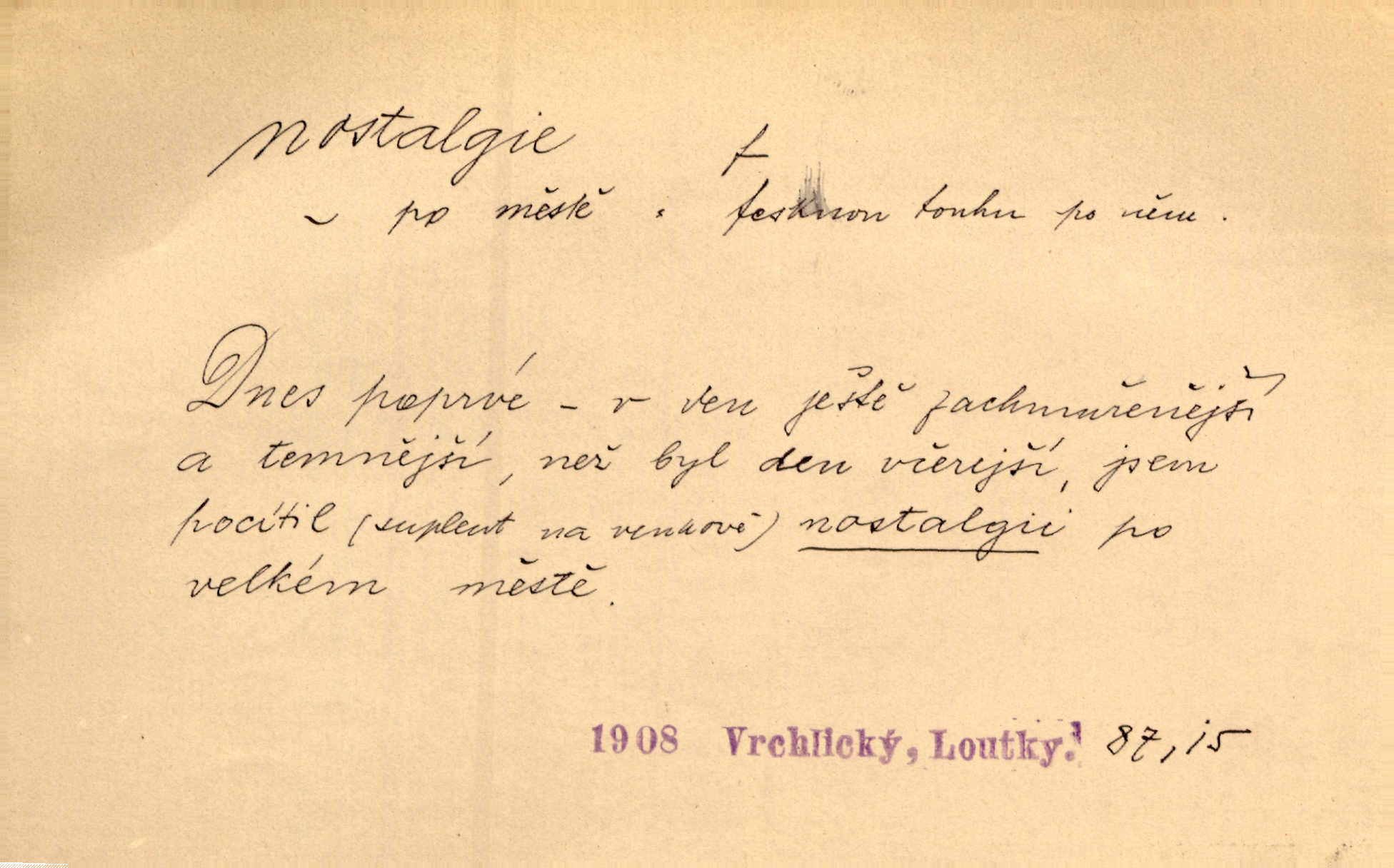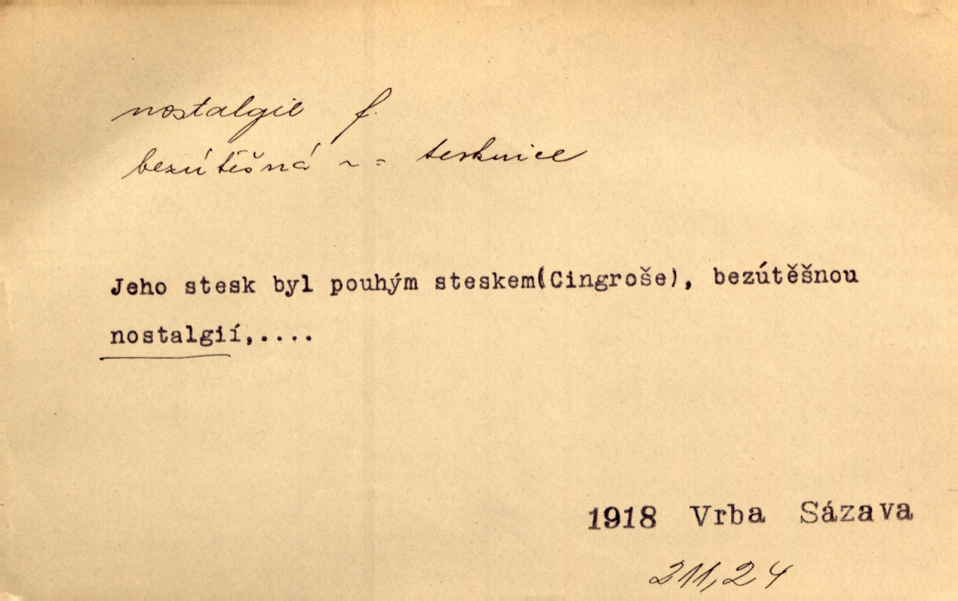 - nostalgie, -e f. stesk po domově; teskná touha po něčem. Divná, divná je ta nostalgie duše lidské v cizině. A. Mrš. Zastesklo se jí čas od času nostalgií venkovského děcka, kterému jest ve velkém městě úzko. Dur. Dnes poprvé jsem pocítil [suplent na venkově] nostalgii po velkém městě. Vrch. Přes tu chvíli bývá slyšeti po národech: „Zpět k veliké minulosti! Vraťme se k otcům!“… Tato nostalgie je typická pro chvíle slabosti. K. Čap.