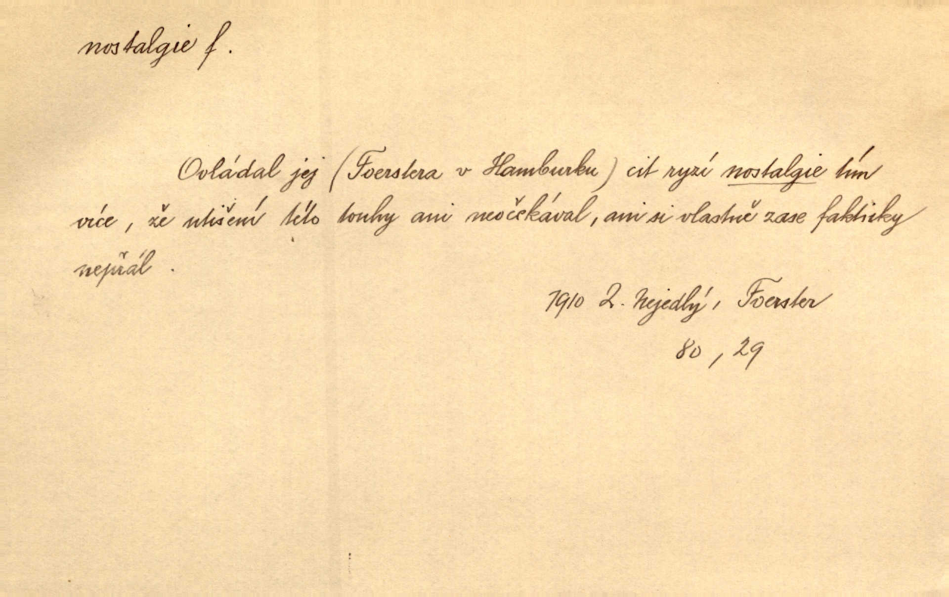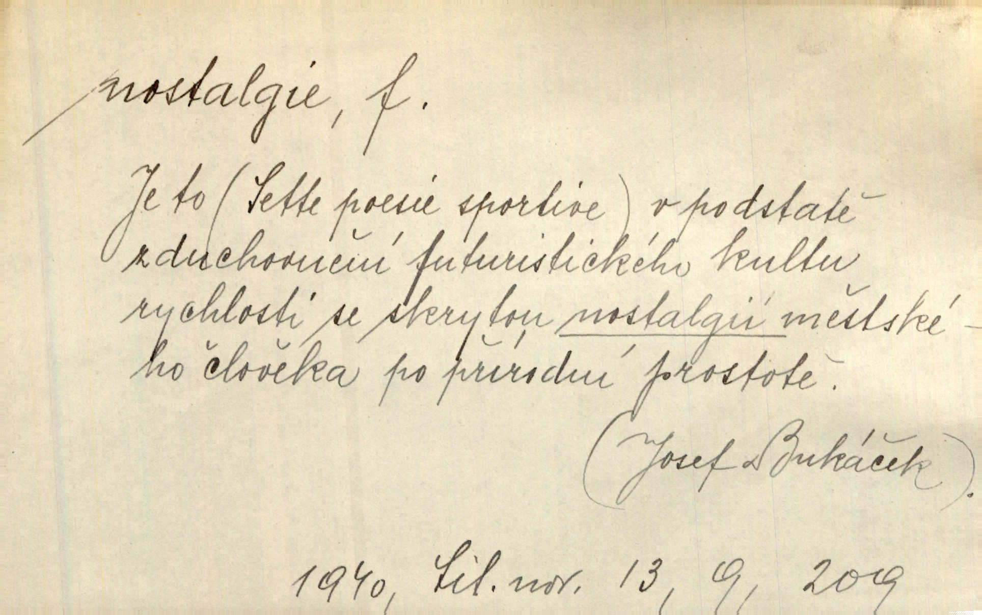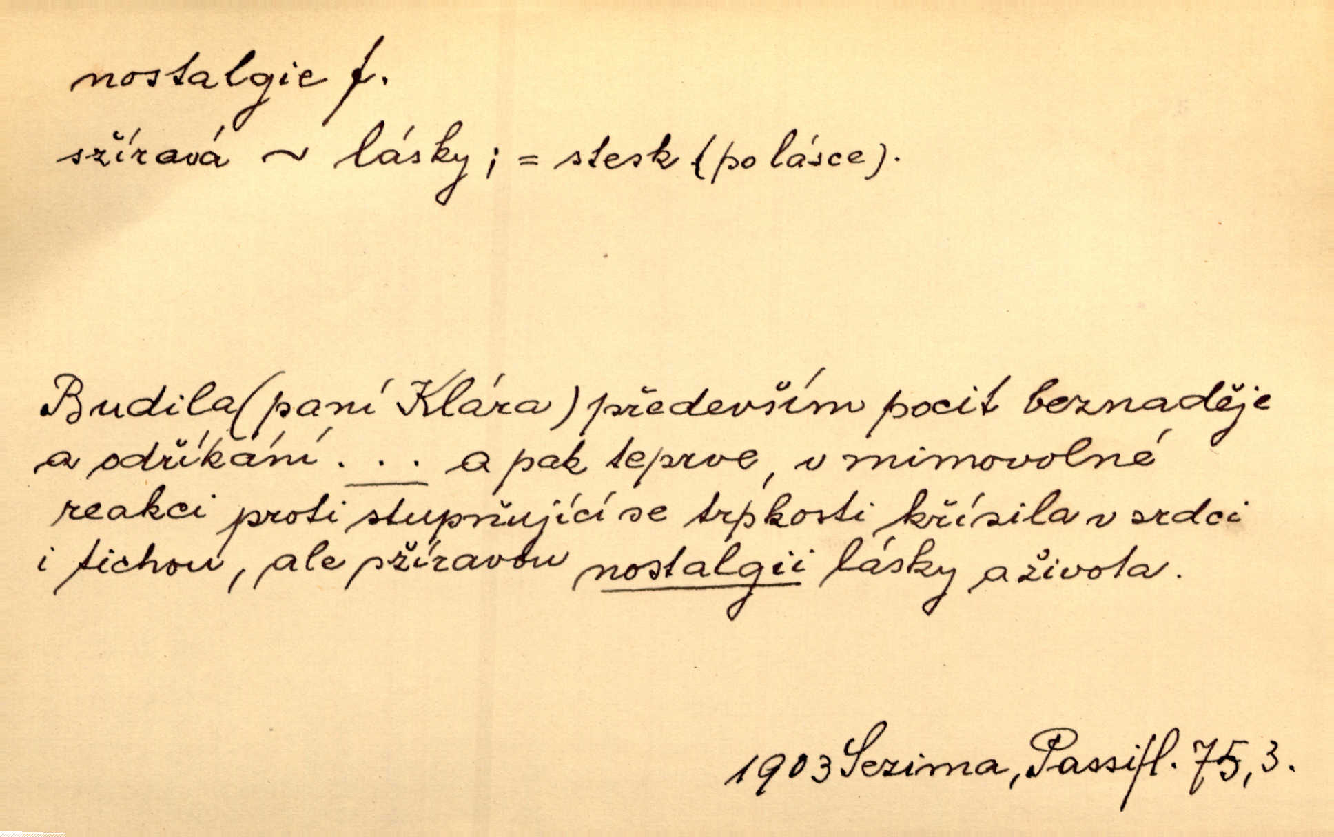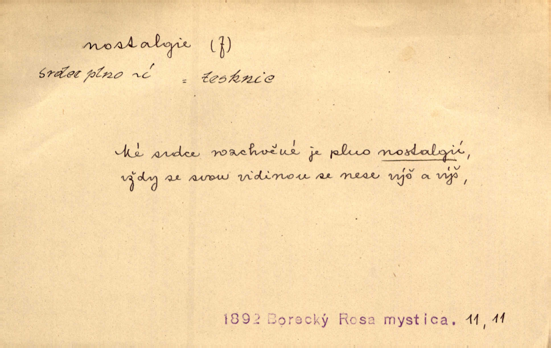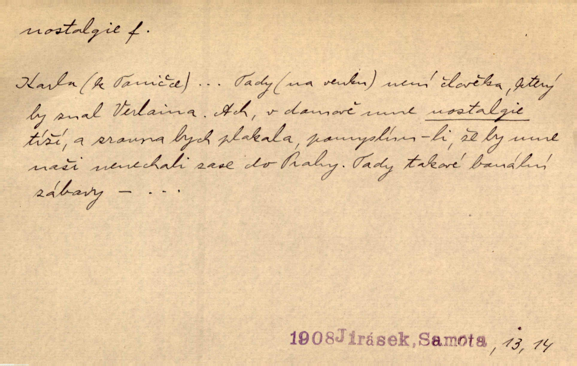 - nostalgie, -e f. stesk po domově; teskná touha po něčem. Divná, divná je ta nostalgie duše lidské v cizině. A. Mrš. Zastesklo se jí čas od času nostalgií venkovského děcka, kterému jest ve velkém městě úzko. Dur. Dnes poprvé jsem pocítil [suplent na venkově] nostalgii po velkém městě. Vrch. Přes tu chvíli bývá slyšeti po národech: „Zpět k veliké minulosti! Vraťme se k otcům!“… Tato nostalgie je typická pro chvíle slabosti. K. Čap.