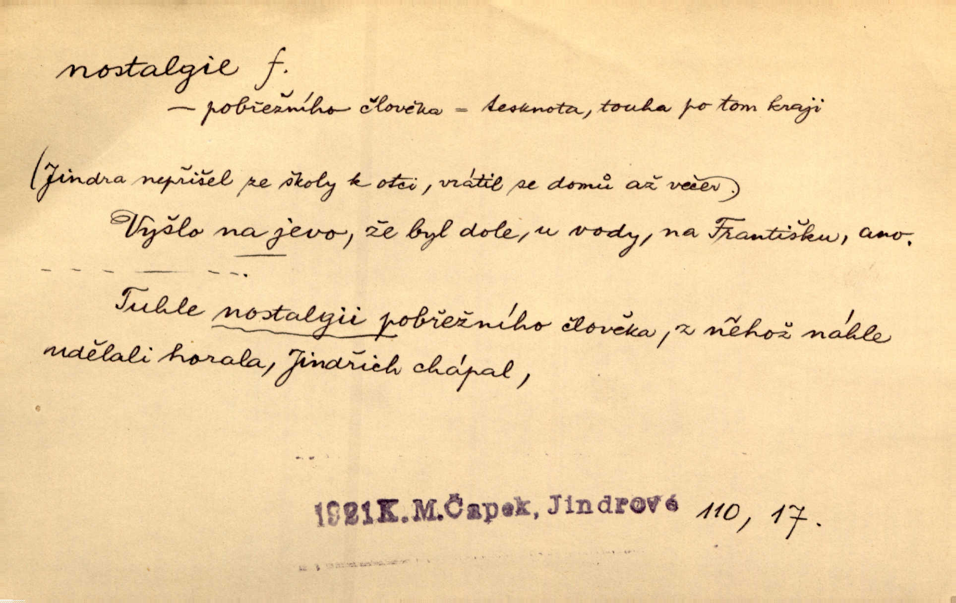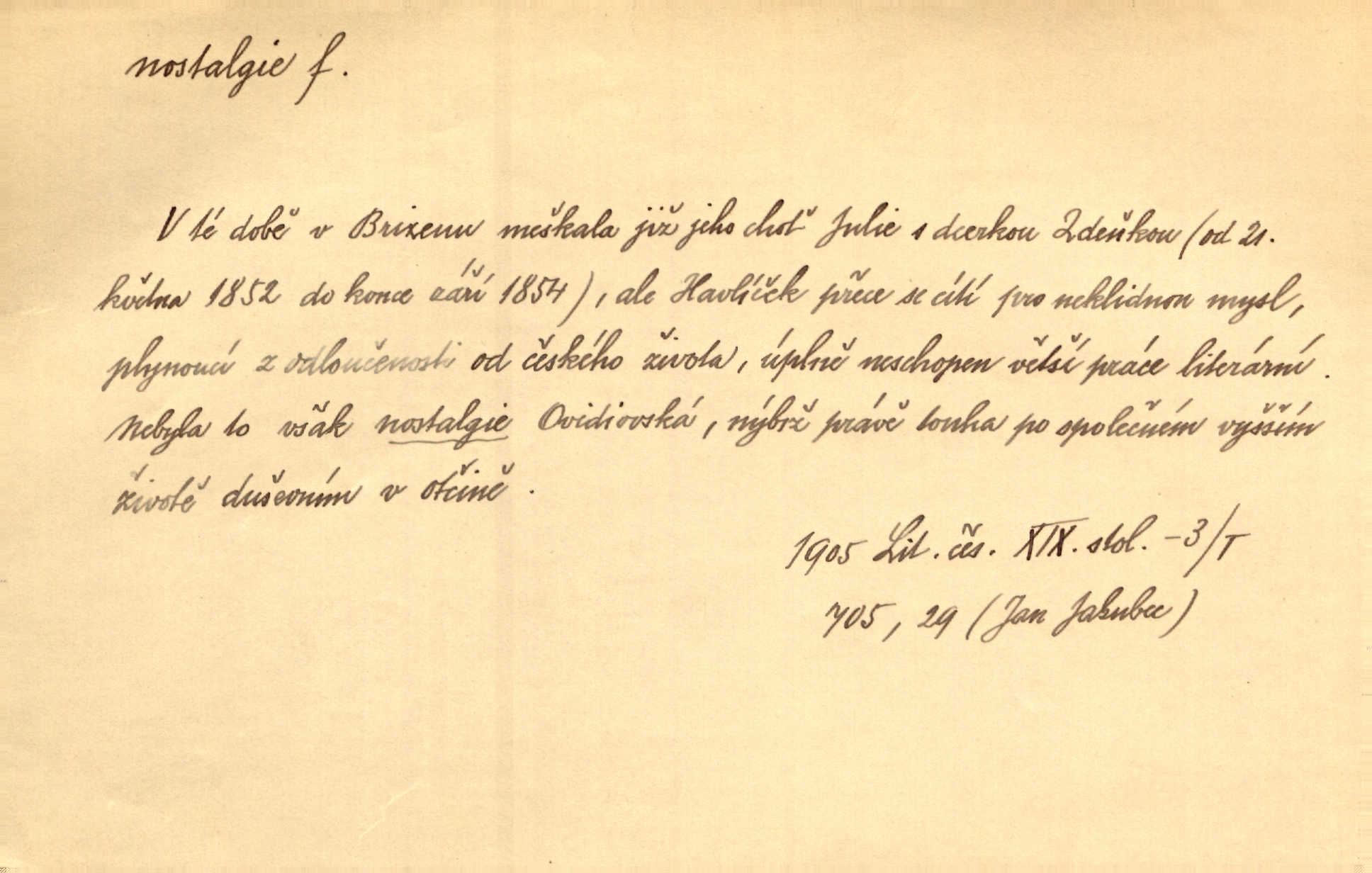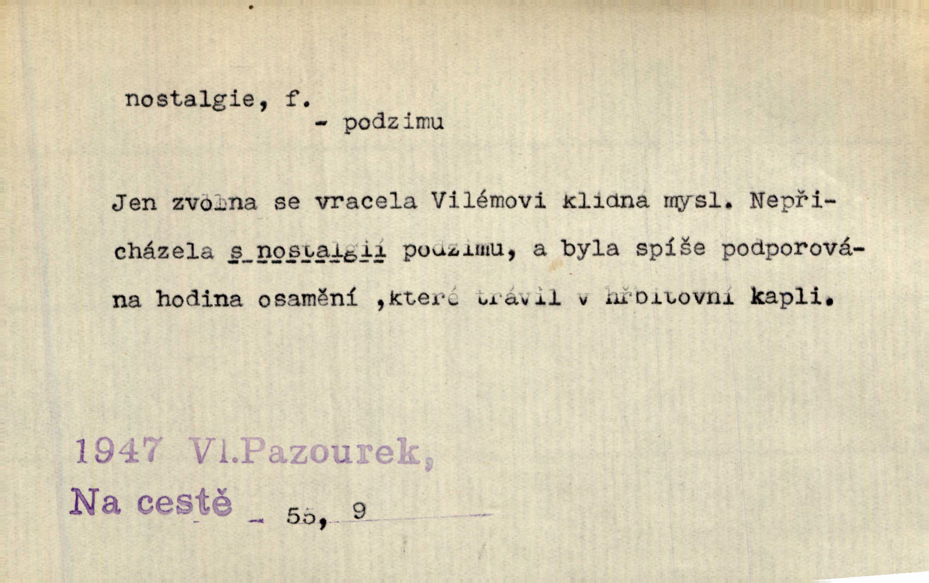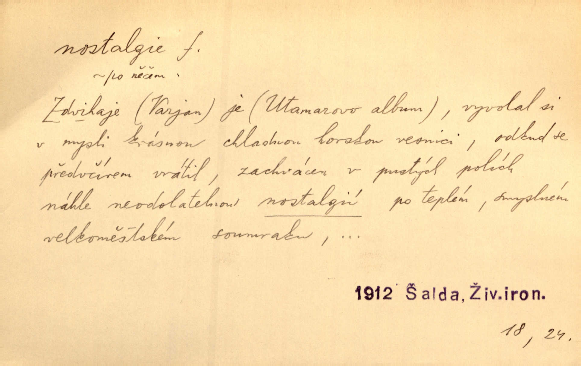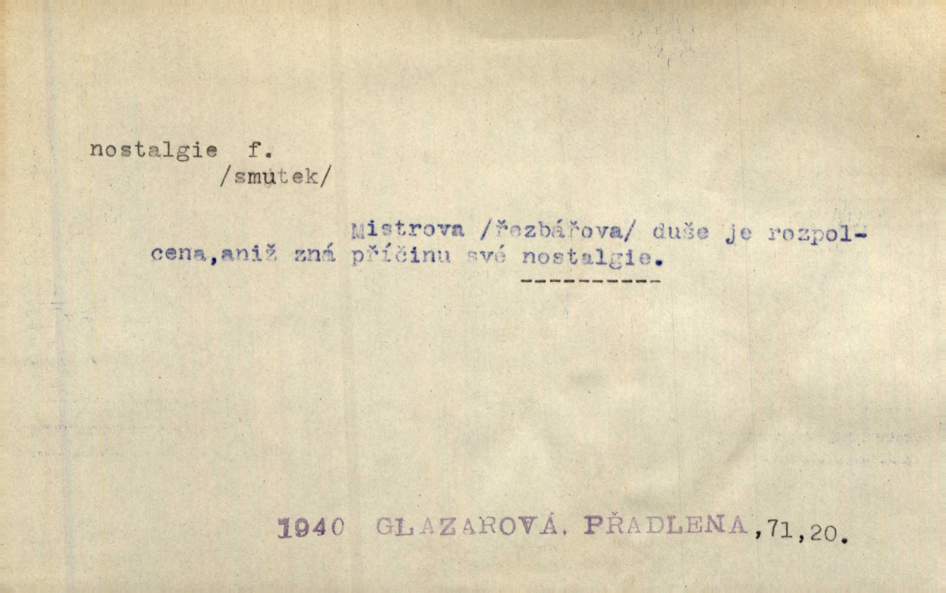 - nostalgie, -e f. stesk po domově; teskná touha po něčem. Divná, divná je ta nostalgie duše lidské v cizině. A. Mrš. Zastesklo se jí čas od času nostalgií venkovského děcka, kterému jest ve velkém městě úzko. Dur. Dnes poprvé jsem pocítil [suplent na venkově] nostalgii po velkém městě. Vrch. Přes tu chvíli bývá slyšeti po národech: „Zpět k veliké minulosti! Vraťme se k otcům!“… Tato nostalgie je typická pro chvíle slabosti. K. Čap.