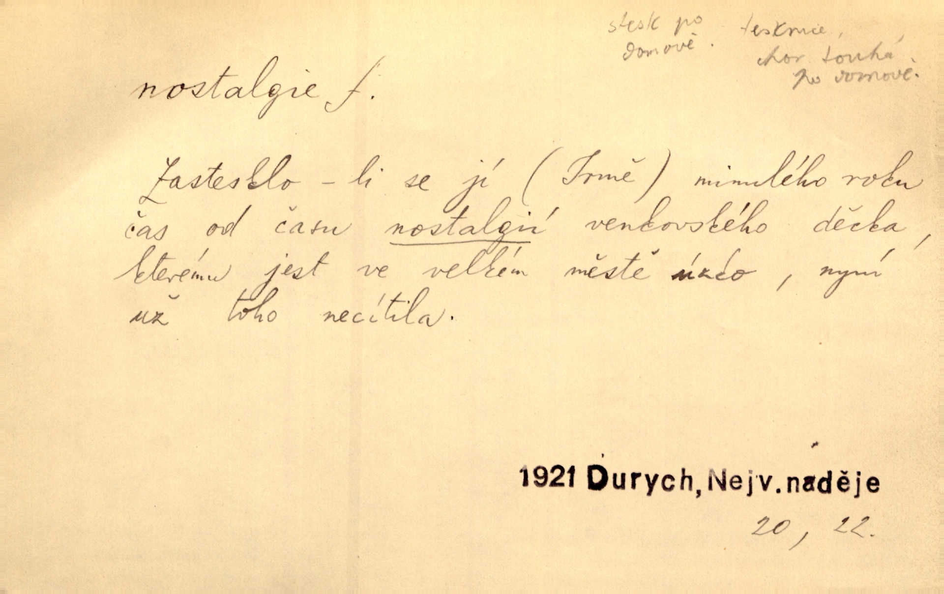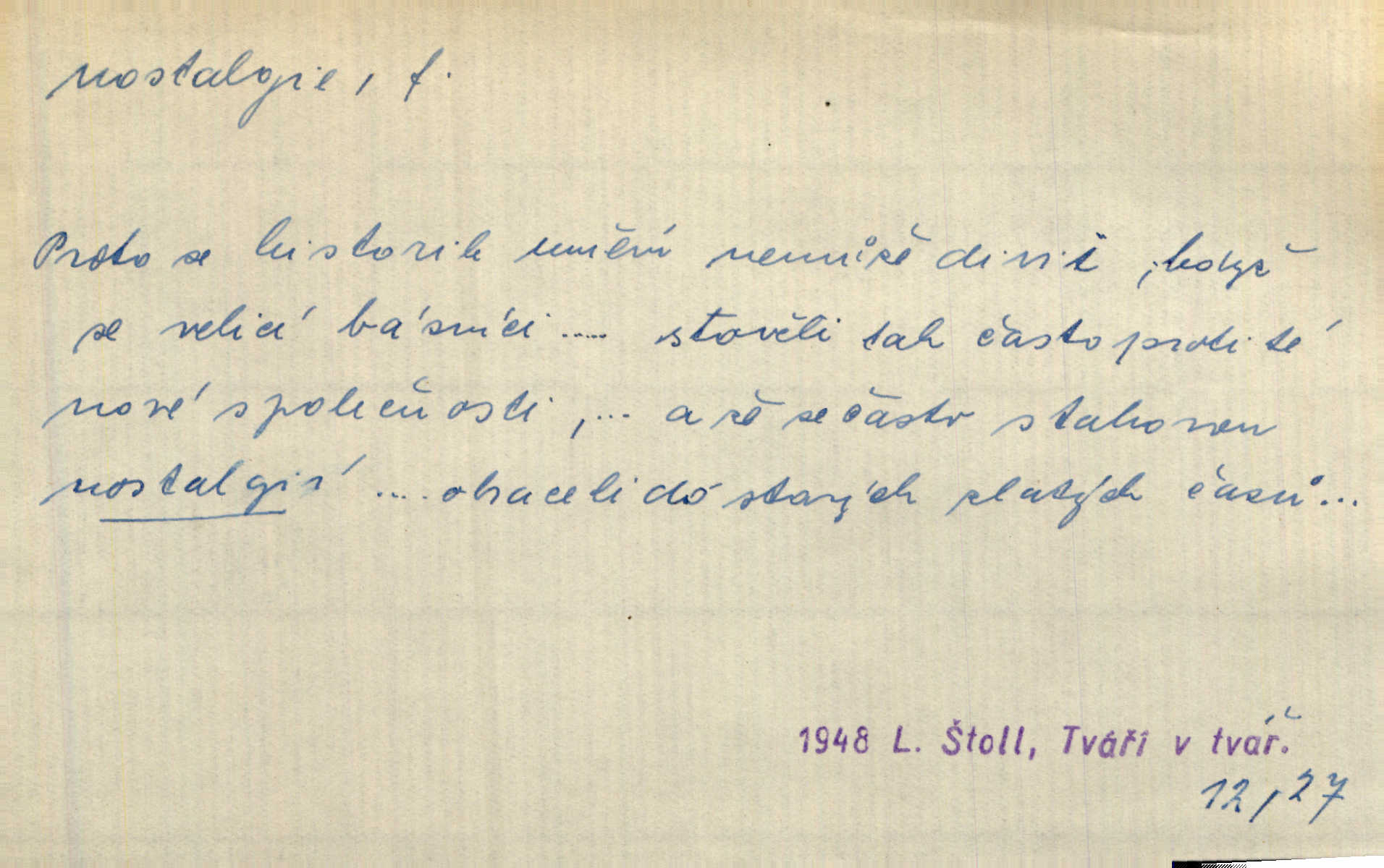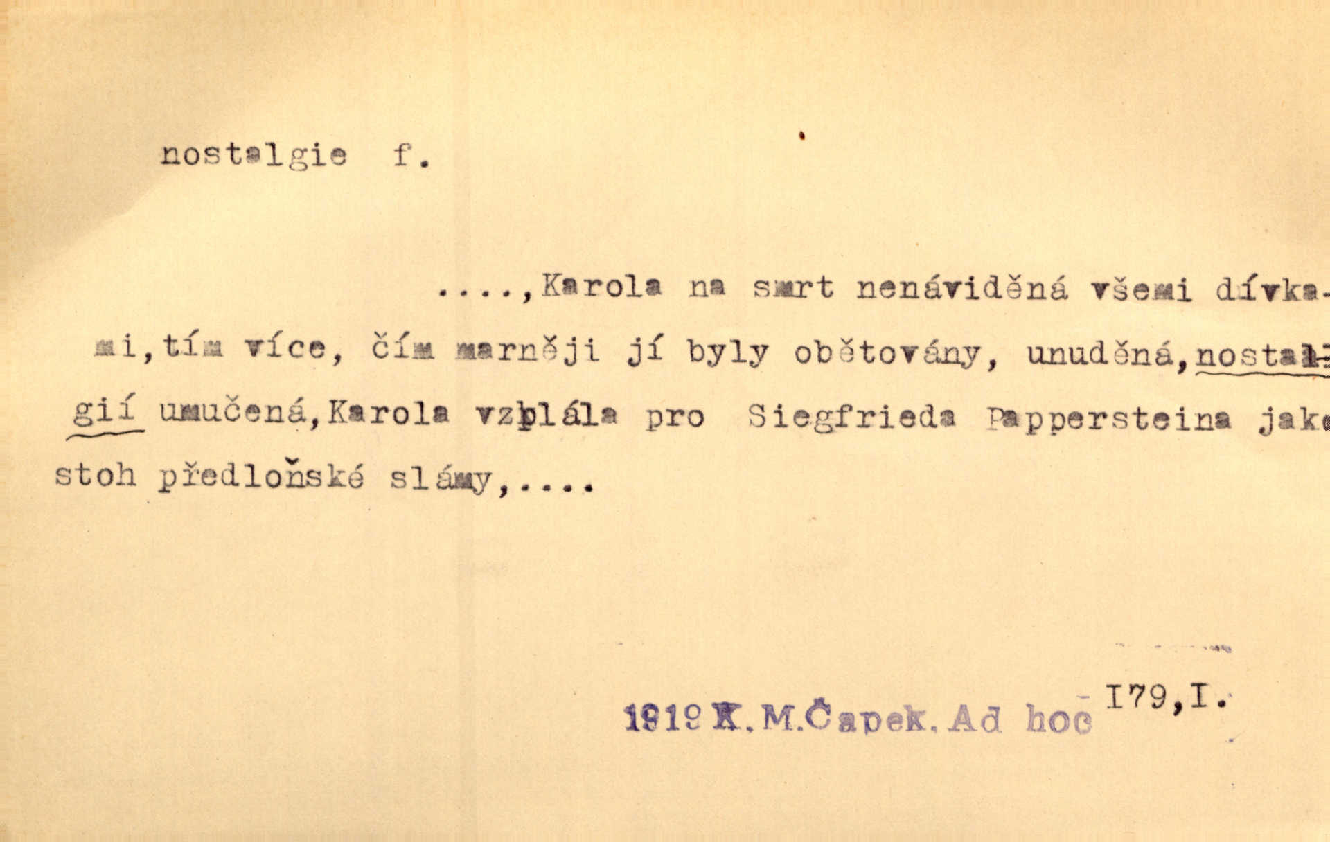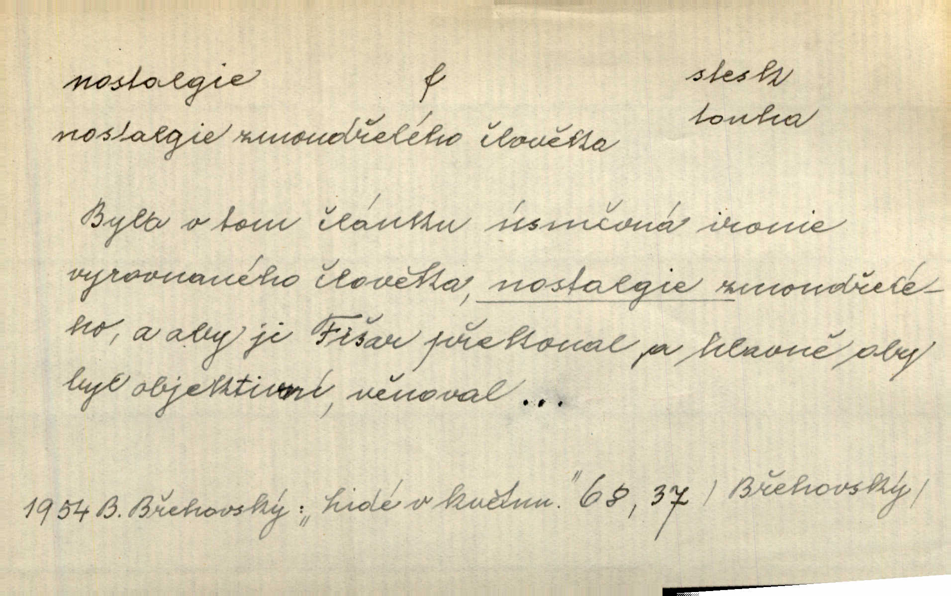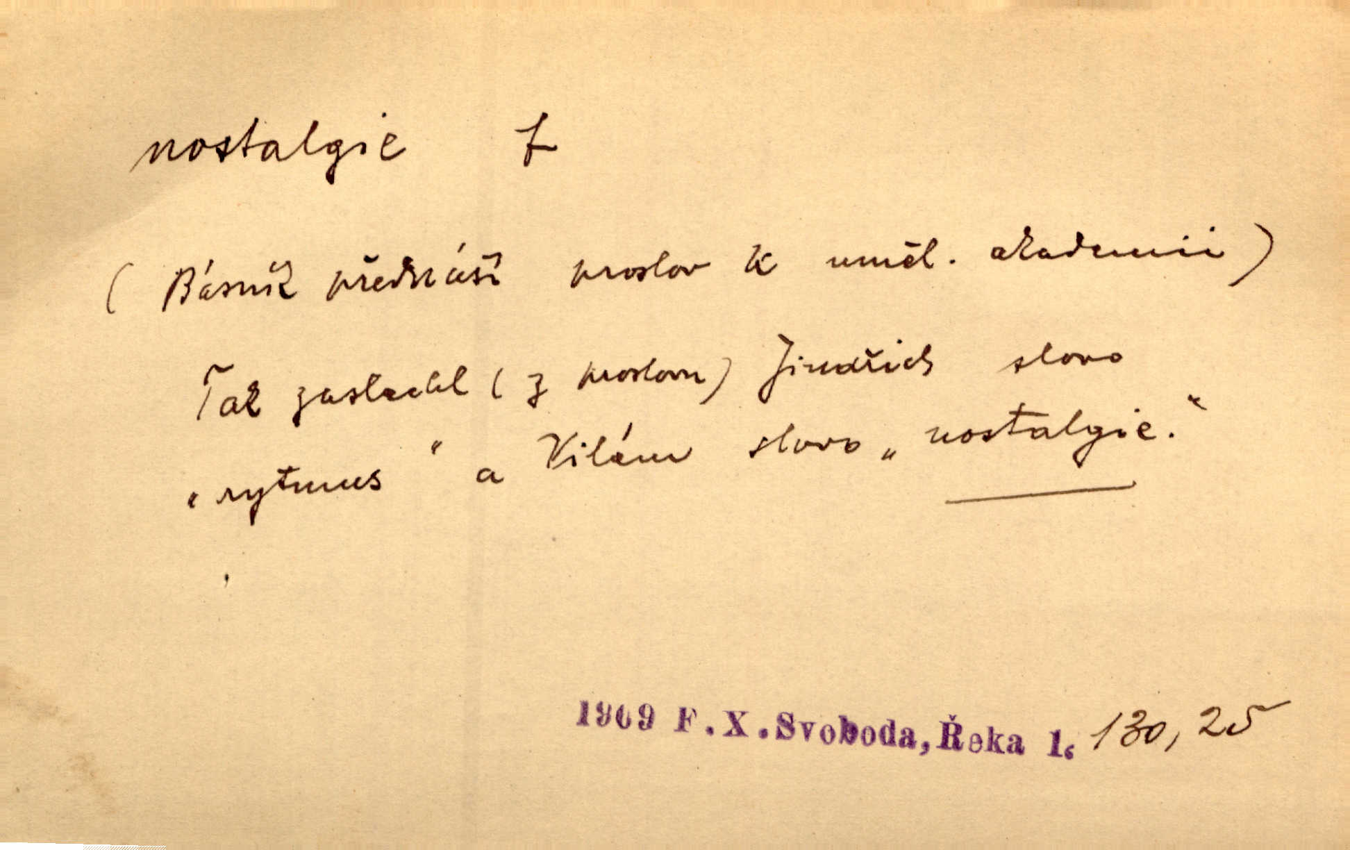 - nostalgie, -e f. stesk po domově; teskná touha po něčem. Divná, divná je ta nostalgie duše lidské v cizině. A. Mrš. Zastesklo se jí čas od času nostalgií venkovského děcka, kterému jest ve velkém městě úzko. Dur. Dnes poprvé jsem pocítil [suplent na venkově] nostalgii po velkém městě. Vrch. Přes tu chvíli bývá slyšeti po národech: „Zpět k veliké minulosti! Vraťme se k otcům!“… Tato nostalgie je typická pro chvíle slabosti. K. Čap.