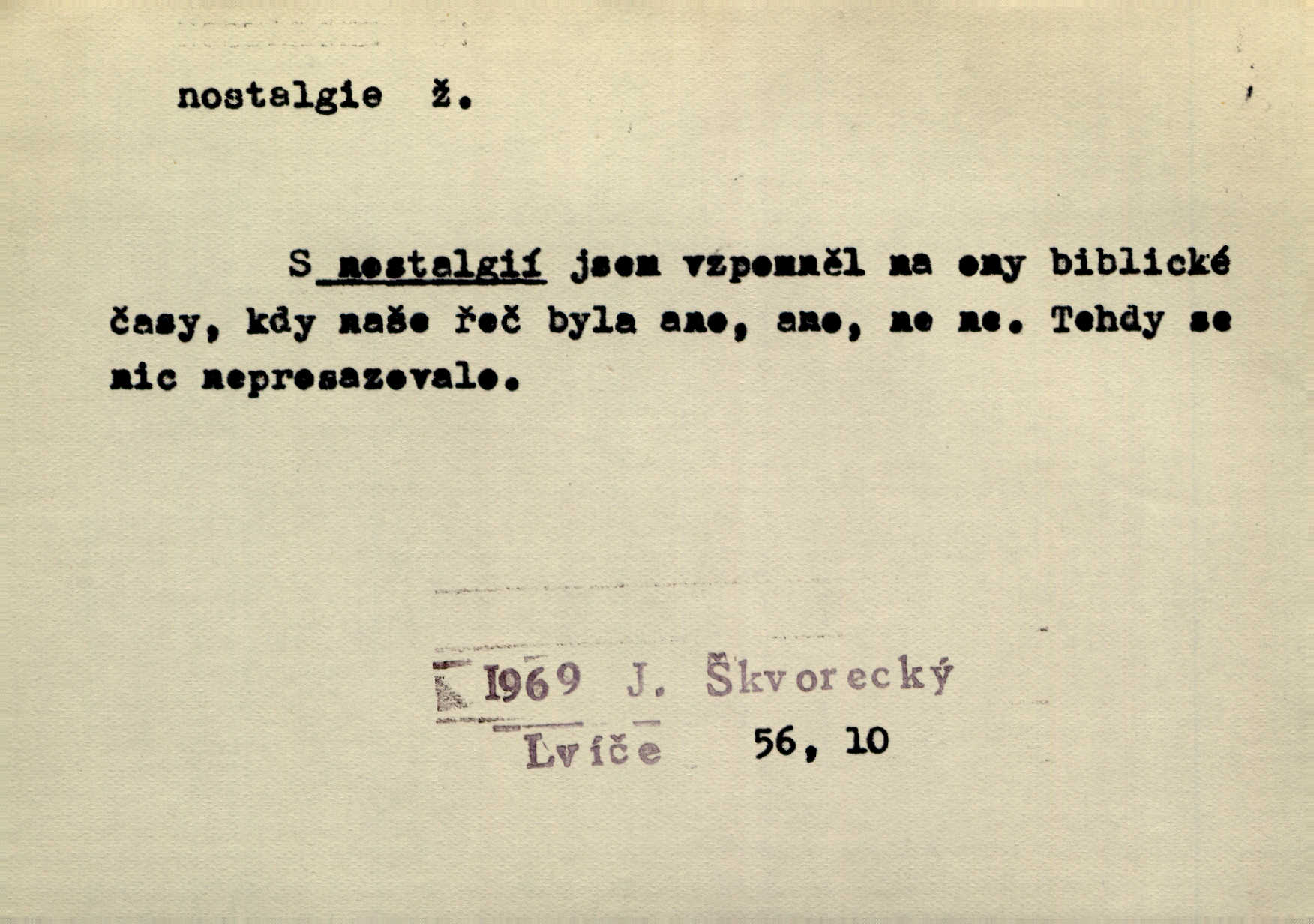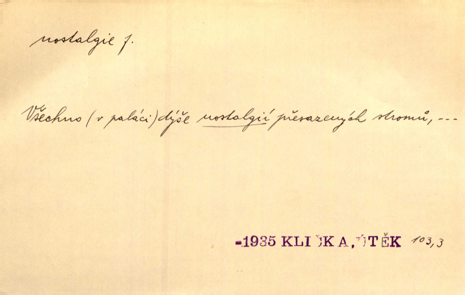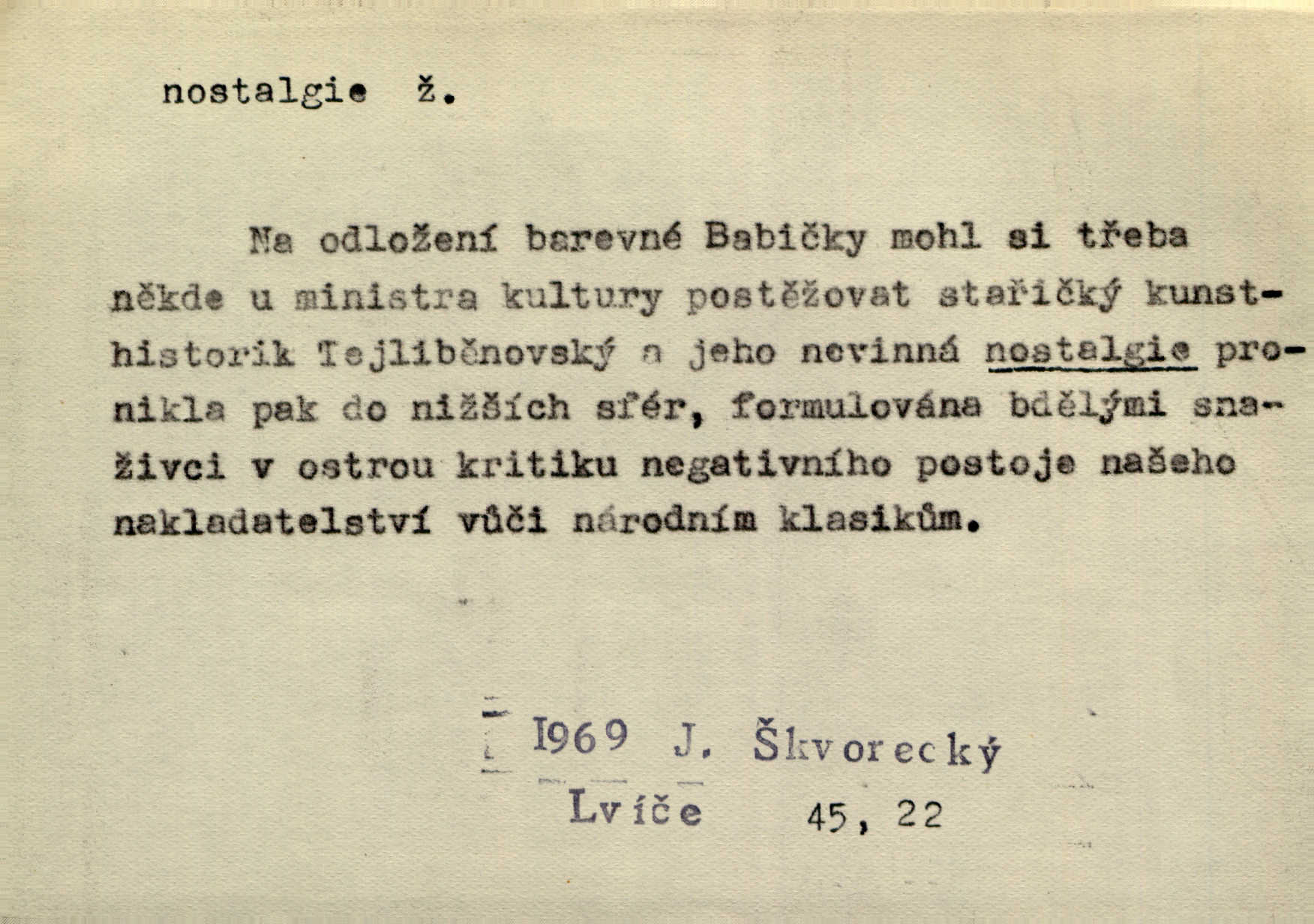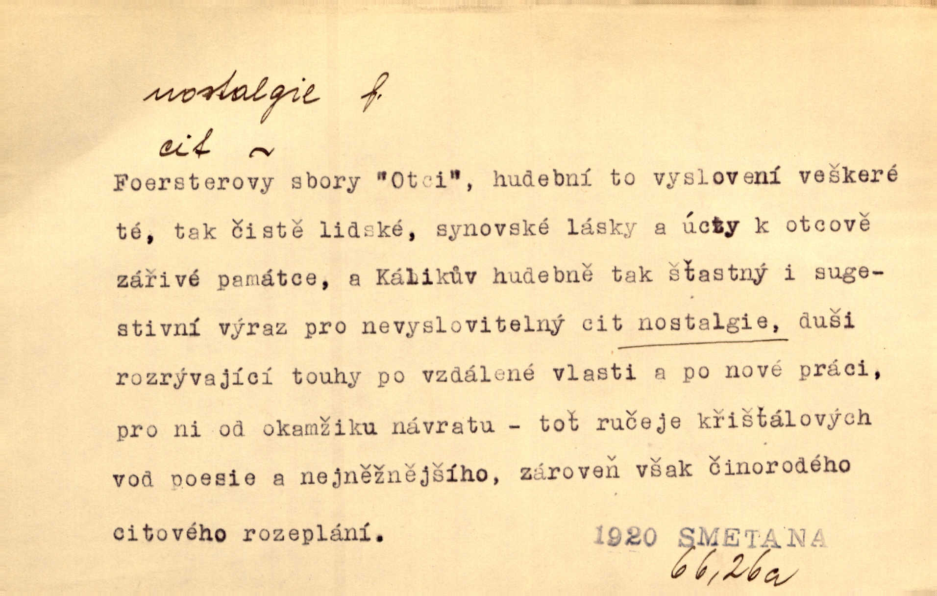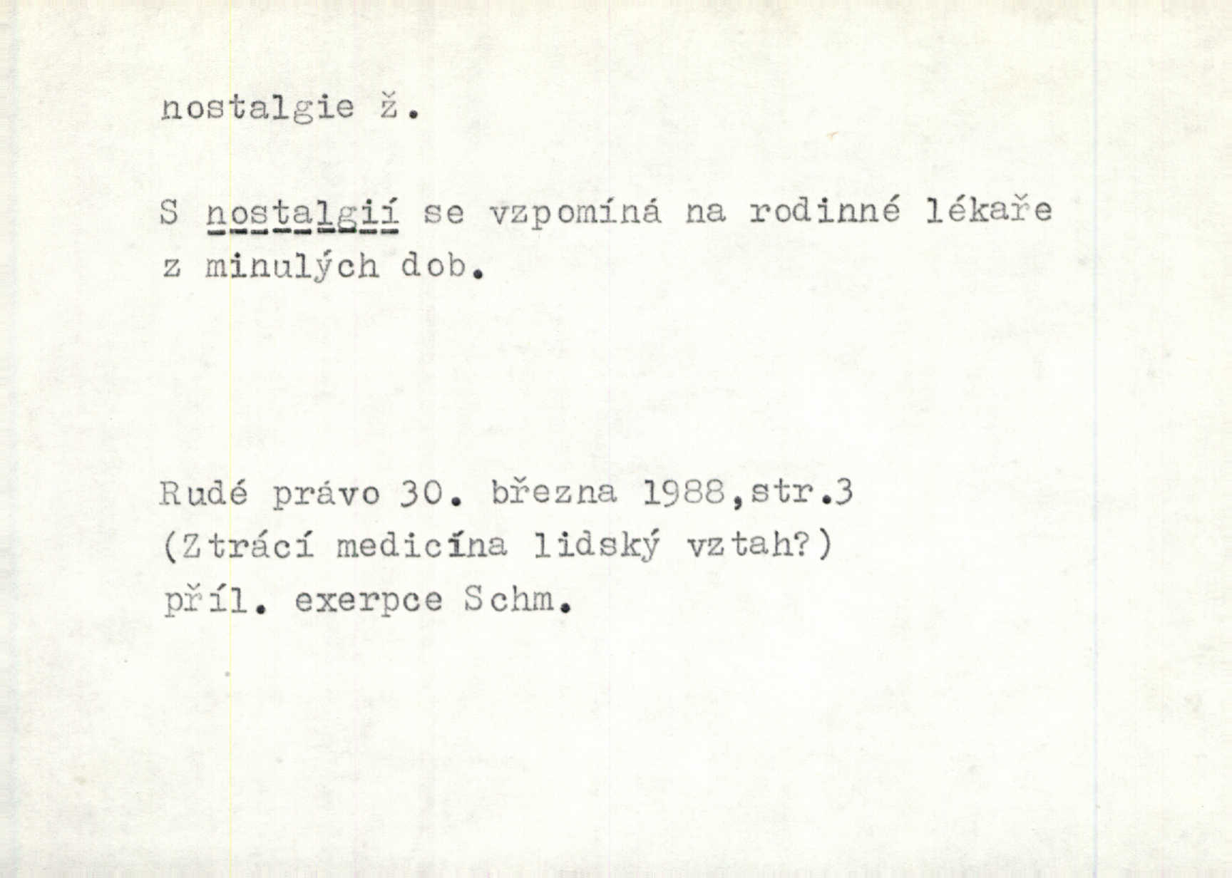 - nostalgie, -e f. stesk po domově; teskná touha po něčem. Divná, divná je ta nostalgie duše lidské v cizině. A. Mrš. Zastesklo se jí čas od času nostalgií venkovského děcka, kterému jest ve velkém městě úzko. Dur. Dnes poprvé jsem pocítil [suplent na venkově] nostalgii po velkém městě. Vrch. Přes tu chvíli bývá slyšeti po národech: „Zpět k veliké minulosti! Vraťme se k otcům!“… Tato nostalgie je typická pro chvíle slabosti. K. Čap.
