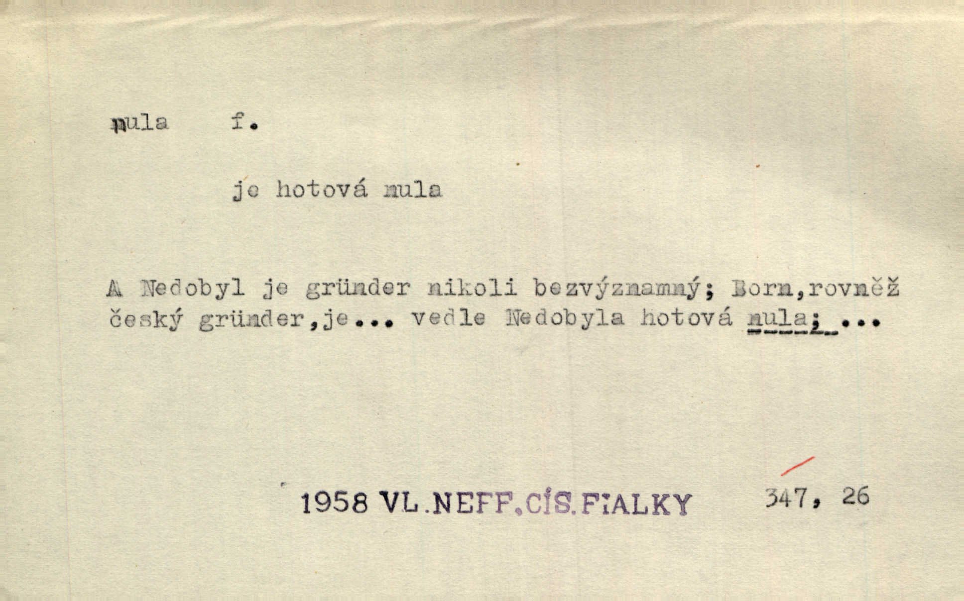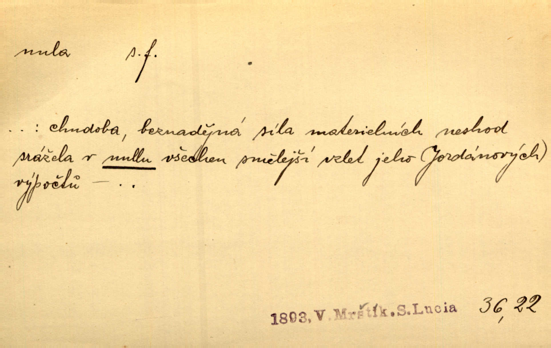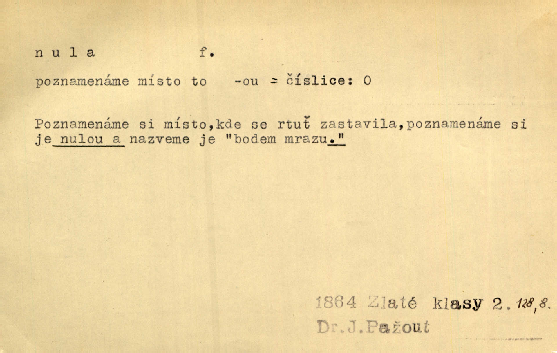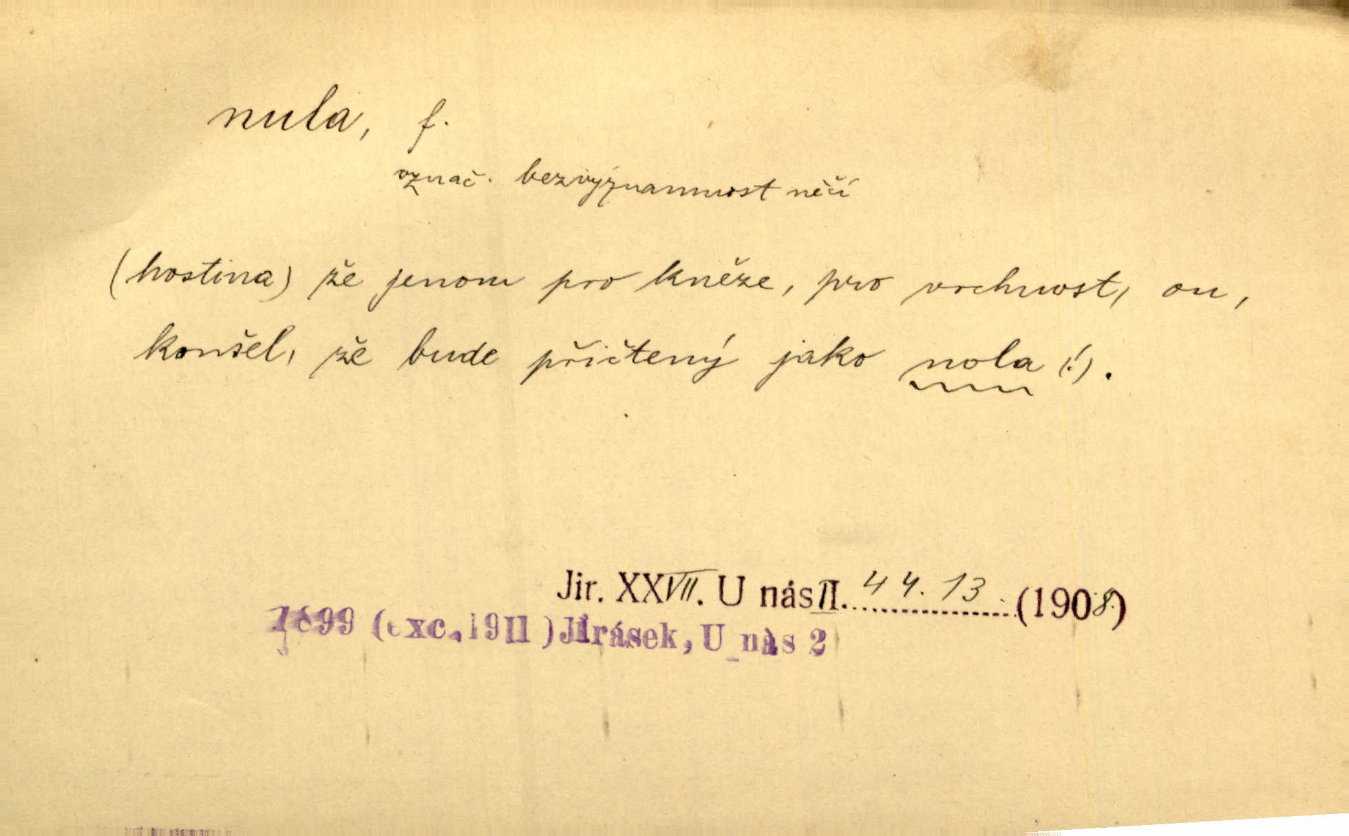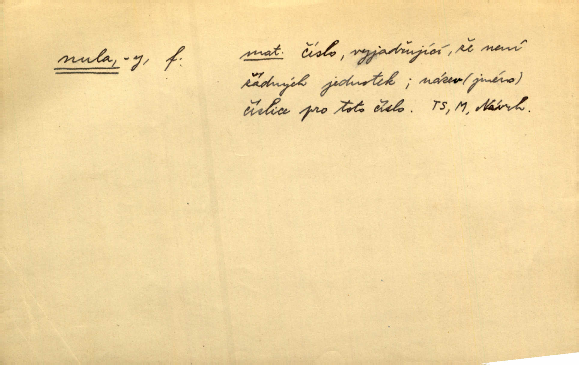 - nula, -y f. značka pro žádnou jednotku, pro nic. Poznamenáme si místo, kde se rtuť zastavila, nulou. Zl. kl. Nakreslil kouřem a cigaretou do vzduchu jakousi nulu. K. Čap. V „půlčase“ oba kluby psaly nulu, přes to, že po celých 30 minut „Patricia“ obléhala „Rapida“. Čap. Ch. Teploměr ukazoval 22° pod nulou pod bodem mrazu. Kun. Jeho námaha klesla pod nulu velmi, velice. Vrch. Její kurs u vojska klesl, možno-li pod nulu. Dur. Ve všech našich městech upadly řemesla a průmysl až pod nullu. Havl. Mat. jméno číslice pro číslo vyjadřující, že není žádných jednotek (desítek atd.). D nic. „Pivo a chléb“, počítal hostinský, „dělá 14 kr. Za nocleh nechci nic. Dali jste mi 4 košťata. Dám vám za ně těch 14 kr. A 14 od 14ti zbude nulla.“ Prav. Můj plat činí tolik a tolik. Odečti od toho byt, vydržování domácnosti, a shledáš, že nula od nuly pojde. Vach. Martin hospodařil od pěti k čtyřem a naposled přišel až na nulu. Prav. Přijde jen ještě porota a řekne tak a tak, dvanácti ano kontra nula. Ner. Chudoba srážela v nullu všechen smělejší vzlet jeho výpočtů. V. Mrš. Mat. číslo vyjadřující, že není žádných jednotek (desítek atd.). D někdo bezvýznamný, něco bezvýznamného, nicotného. Rychtář a konšelé jsou nula. Jir. Pan Šaroch zůstal nullou v domě. Podl. Vpředu stála stará paní a v stínu jejího sebevědomí se ztrácely tři ženské nuly. Til. Nesprostíš mne hrůzy před politickými nullami. Sova. Pan vrchní byl jen titulárním pánem, jeho vplyv a moc byly nulou. Svět. Tedy, chaso! mažte a uvidíte, jak to potom pojede! Tramvaj bude nula! Kosm. D Zř. druh lepší mouky, nulka. Hospodyně nabrala si z truhly litr nuly. Zákr.