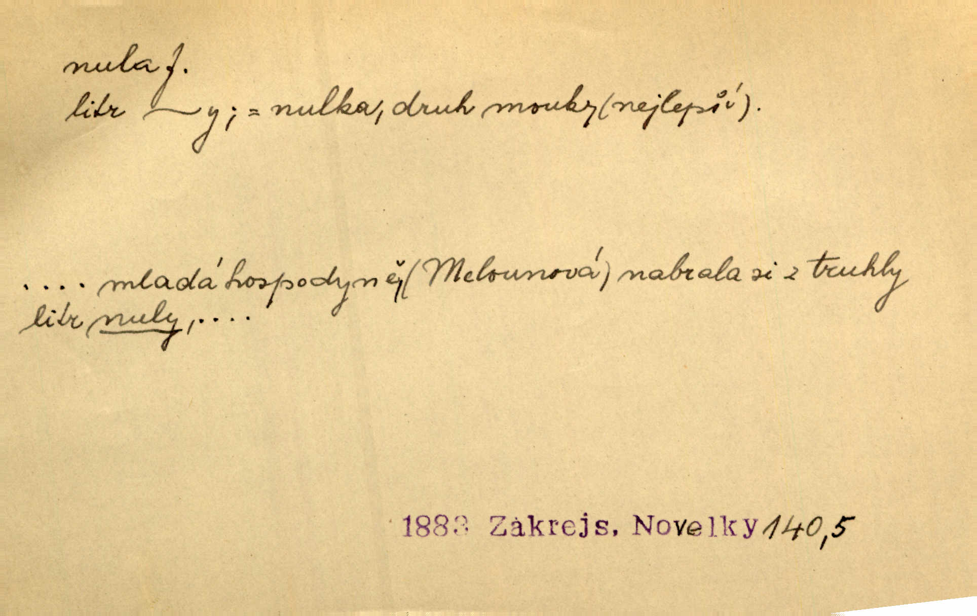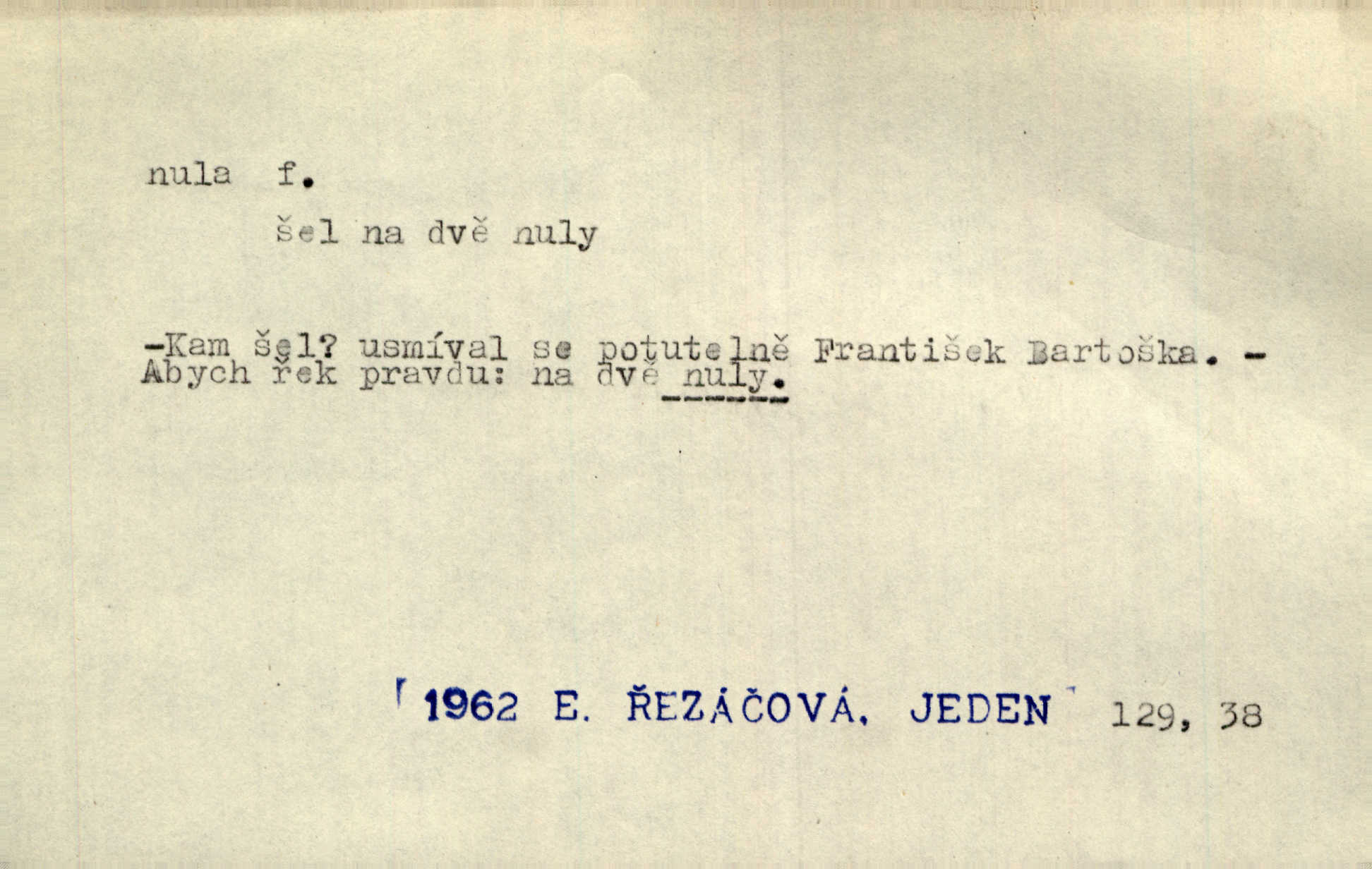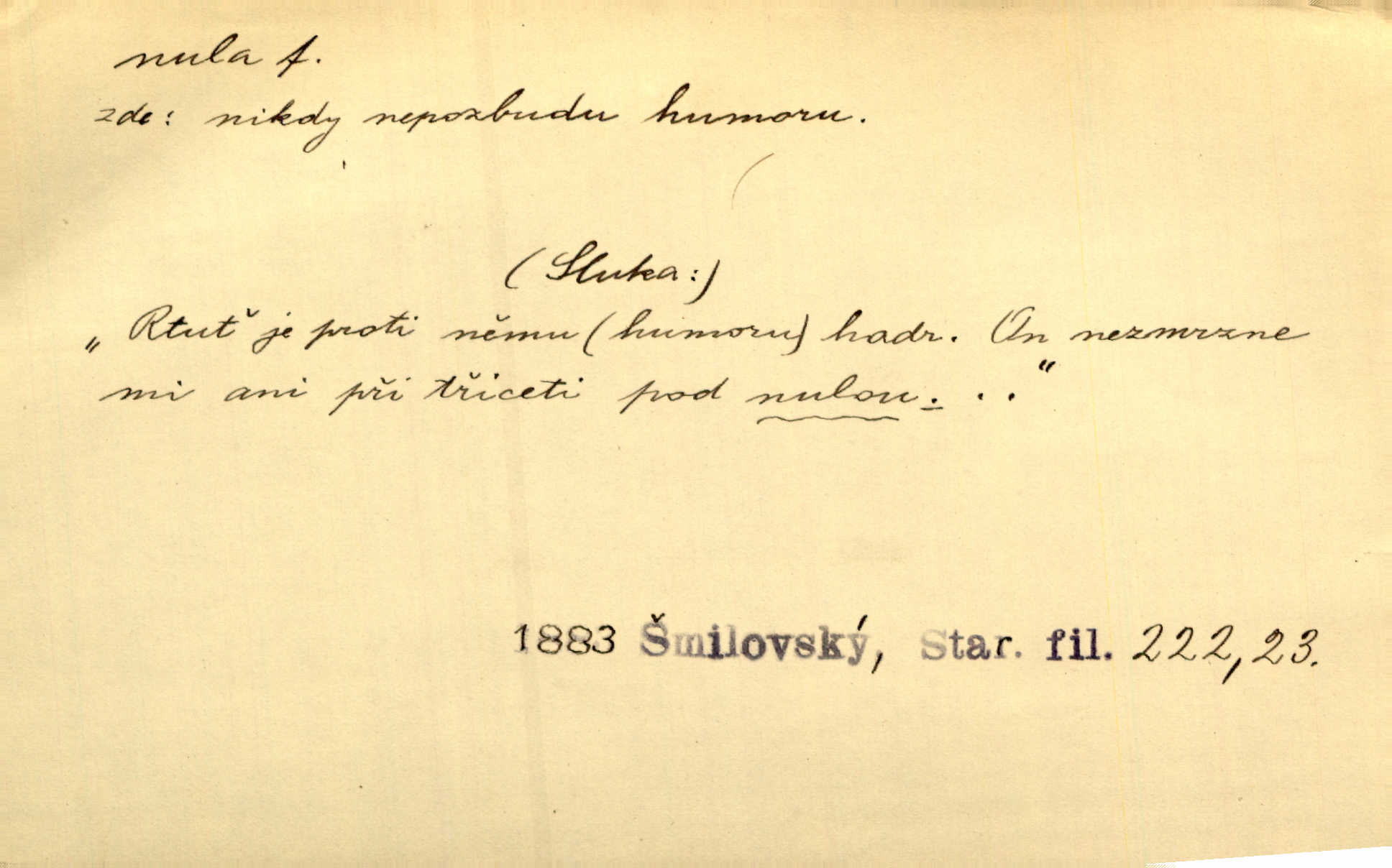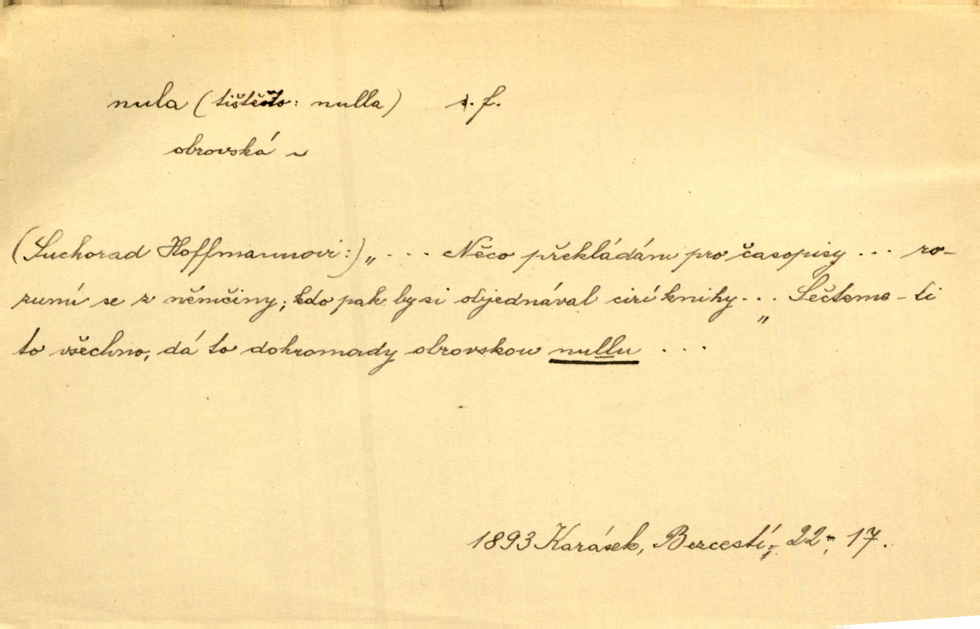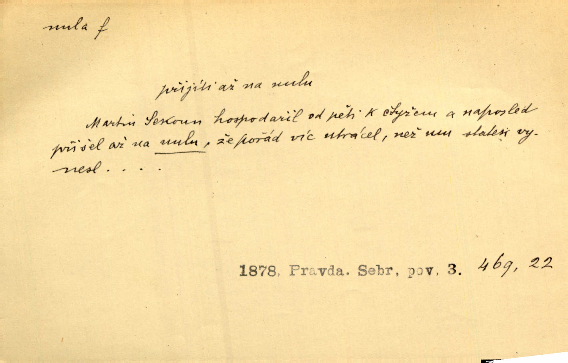 - nula, -y f. značka pro žádnou jednotku, pro nic. Poznamenáme si místo, kde se rtuť zastavila, nulou. Zl. kl. Nakreslil kouřem a cigaretou do vzduchu jakousi nulu. K. Čap. V „půlčase“ oba kluby psaly nulu, přes to, že po celých 30 minut „Patricia“ obléhala „Rapida“. Čap. Ch. Teploměr ukazoval 22° pod nulou pod bodem mrazu. Kun. Jeho námaha klesla pod nulu velmi, velice. Vrch. Její kurs u vojska klesl, možno-li pod nulu. Dur. Ve všech našich městech upadly řemesla a průmysl až pod nullu. Havl. Mat. jméno číslice pro číslo vyjadřující, že není žádných jednotek (desítek atd.). D nic. „Pivo a chléb“, počítal hostinský, „dělá 14 kr. Za nocleh nechci nic. Dali jste mi 4 košťata. Dám vám za ně těch 14 kr. A 14 od 14ti zbude nulla.“ Prav. Můj plat činí tolik a tolik. Odečti od toho byt, vydržování domácnosti, a shledáš, že nula od nuly pojde. Vach. Martin hospodařil od pěti k čtyřem a naposled přišel až na nulu. Prav. Přijde jen ještě porota a řekne tak a tak, dvanácti ano kontra nula. Ner. Chudoba srážela v nullu všechen smělejší vzlet jeho výpočtů. V. Mrš. Mat. číslo vyjadřující, že není žádných jednotek (desítek atd.). D někdo bezvýznamný, něco bezvýznamného, nicotného. Rychtář a konšelé jsou nula. Jir. Pan Šaroch zůstal nullou v domě. Podl. Vpředu stála stará paní a v stínu jejího sebevědomí se ztrácely tři ženské nuly. Til. Nesprostíš mne hrůzy před politickými nullami. Sova. Pan vrchní byl jen titulárním pánem, jeho vplyv a moc byly nulou. Svět. Tedy, chaso! mažte a uvidíte, jak to potom pojede! Tramvaj bude nula! Kosm. D Zř. druh lepší mouky, nulka. Hospodyně nabrala si z truhly litr nuly. Zákr.