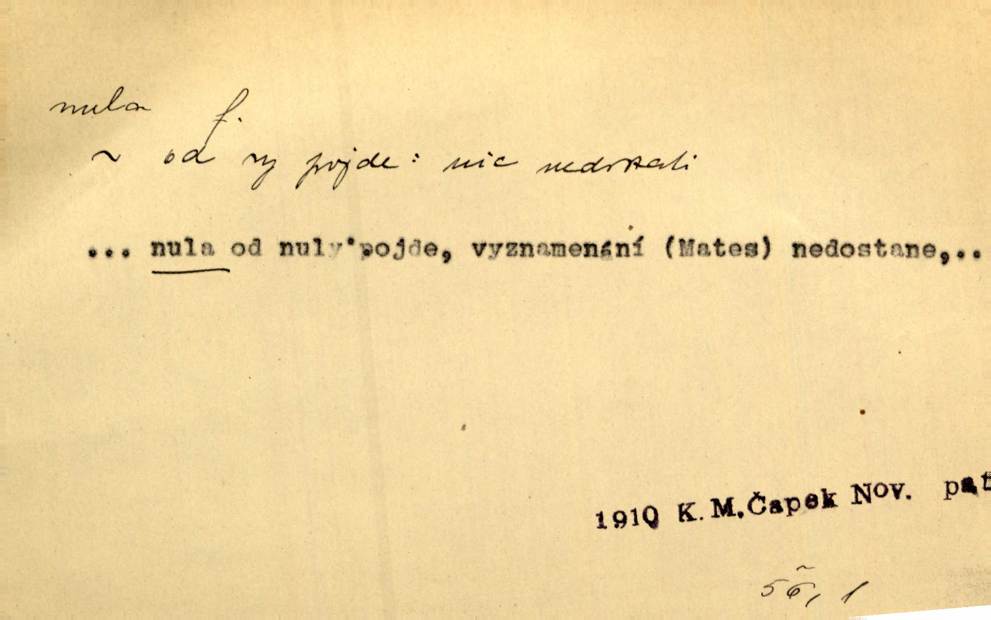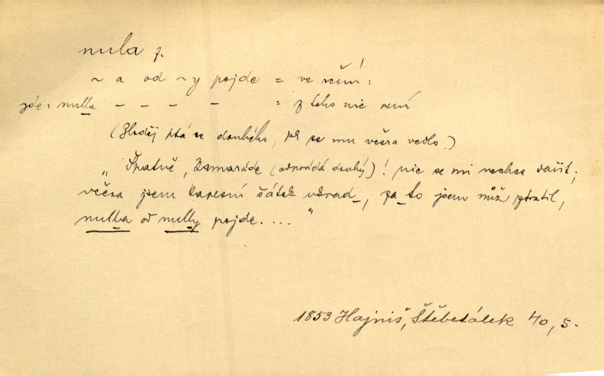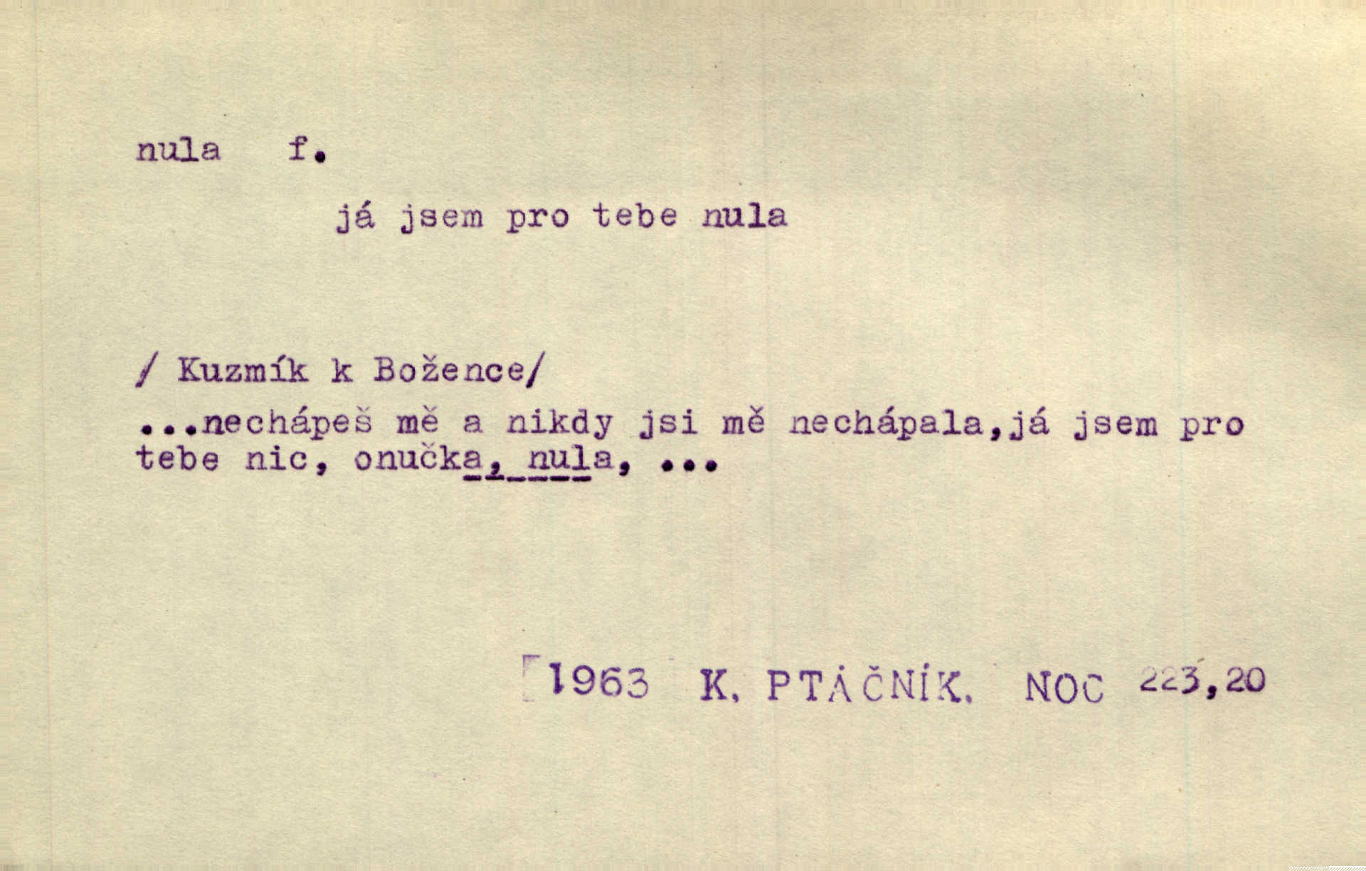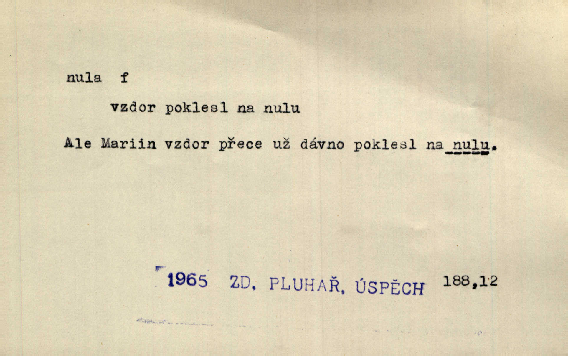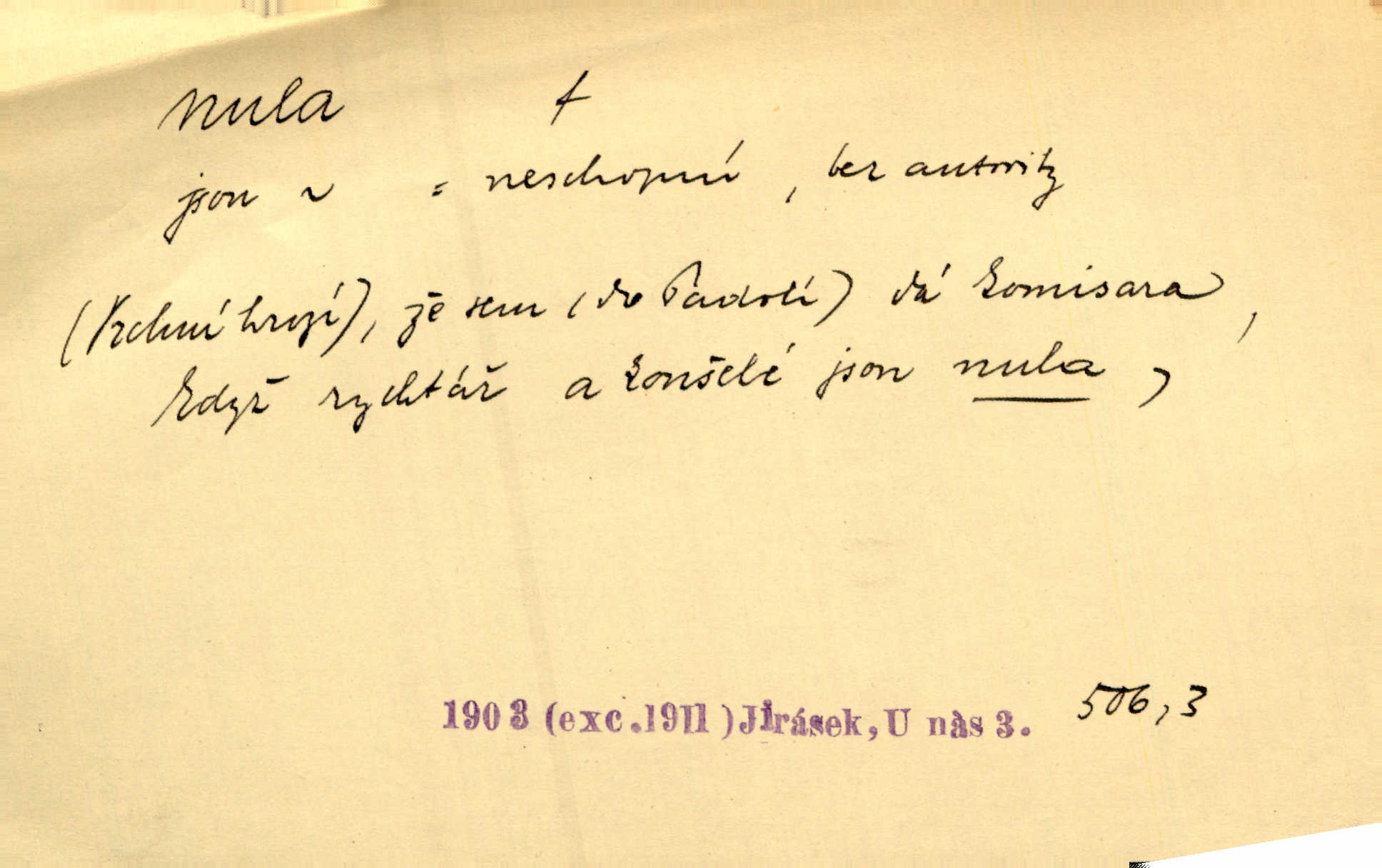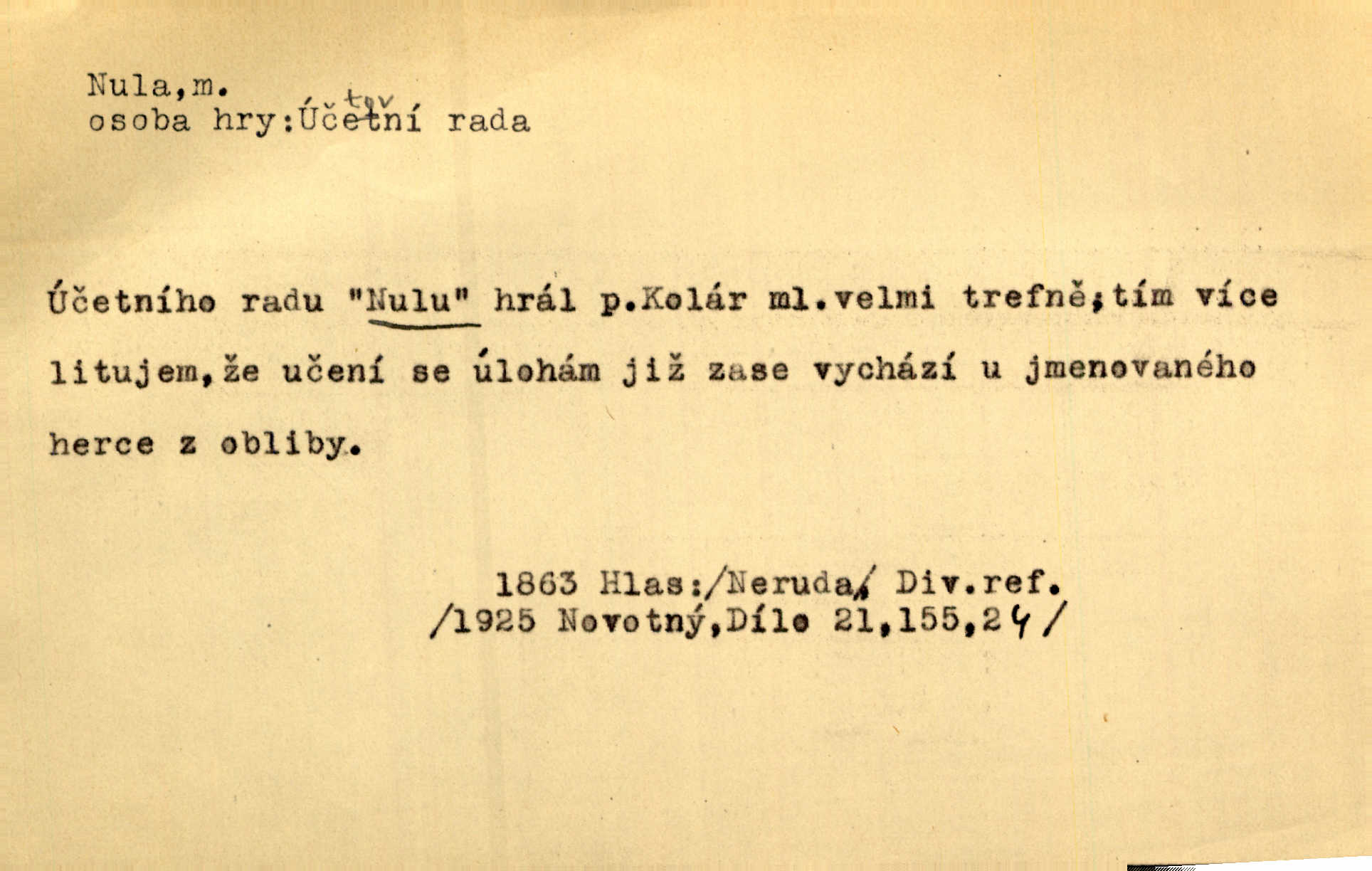 - nula, -y f. značka pro žádnou jednotku, pro nic. Poznamenáme si místo, kde se rtuť zastavila, nulou. Zl. kl. Nakreslil kouřem a cigaretou do vzduchu jakousi nulu. K. Čap. V „půlčase“ oba kluby psaly nulu, přes to, že po celých 30 minut „Patricia“ obléhala „Rapida“. Čap. Ch. Teploměr ukazoval 22° pod nulou pod bodem mrazu. Kun. Jeho námaha klesla pod nulu velmi, velice. Vrch. Její kurs u vojska klesl, možno-li pod nulu. Dur. Ve všech našich městech upadly řemesla a průmysl až pod nullu. Havl. Mat. jméno číslice pro číslo vyjadřující, že není žádných jednotek (desítek atd.). D nic. „Pivo a chléb“, počítal hostinský, „dělá 14 kr. Za nocleh nechci nic. Dali jste mi 4 košťata. Dám vám za ně těch 14 kr. A 14 od 14ti zbude nulla.“ Prav. Můj plat činí tolik a tolik. Odečti od toho byt, vydržování domácnosti, a shledáš, že nula od nuly pojde. Vach. Martin hospodařil od pěti k čtyřem a naposled přišel až na nulu. Prav. Přijde jen ještě porota a řekne tak a tak, dvanácti ano kontra nula. Ner. Chudoba srážela v nullu všechen smělejší vzlet jeho výpočtů. V. Mrš. Mat. číslo vyjadřující, že není žádných jednotek (desítek atd.). D někdo bezvýznamný, něco bezvýznamného, nicotného. Rychtář a konšelé jsou nula. Jir. Pan Šaroch zůstal nullou v domě. Podl. Vpředu stála stará paní a v stínu jejího sebevědomí se ztrácely tři ženské nuly. Til. Nesprostíš mne hrůzy před politickými nullami. Sova. Pan vrchní byl jen titulárním pánem, jeho vplyv a moc byly nulou. Svět. Tedy, chaso! mažte a uvidíte, jak to potom pojede! Tramvaj bude nula! Kosm. D Zř. druh lepší mouky, nulka. Hospodyně nabrala si z truhly litr nuly. Zákr.