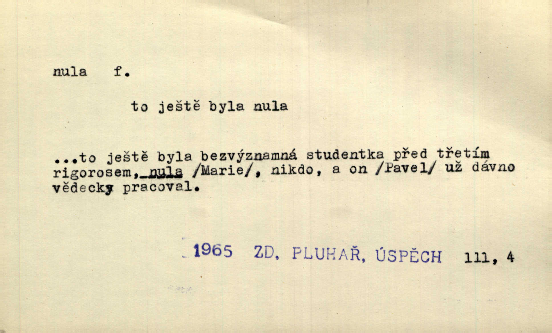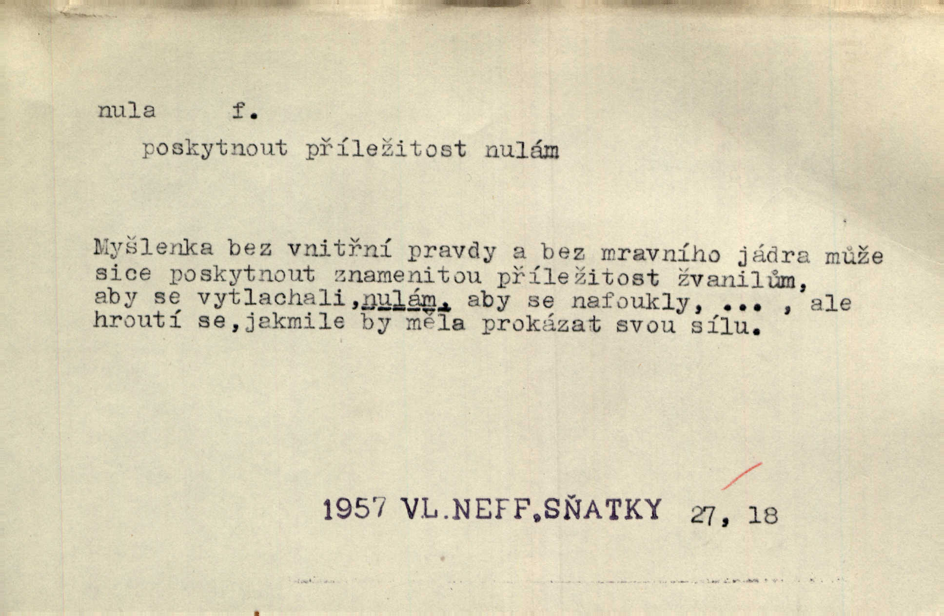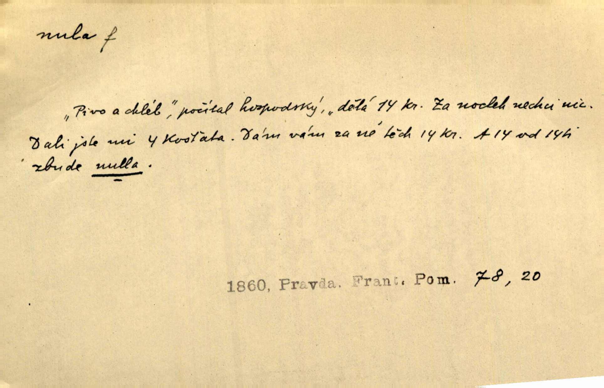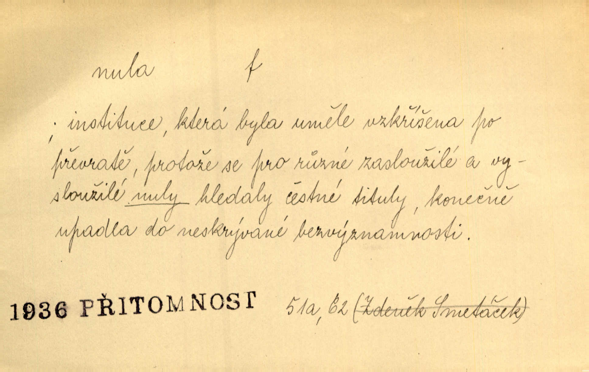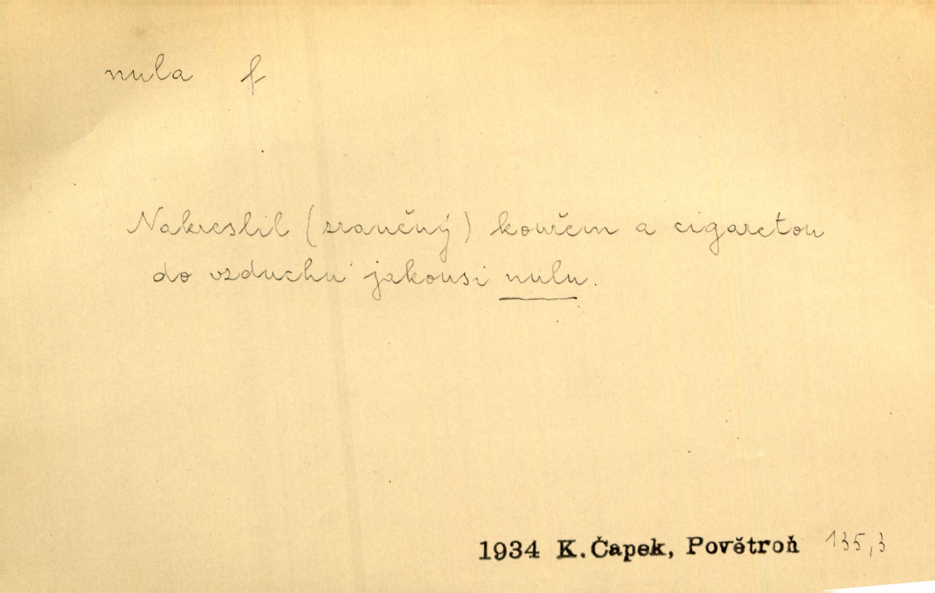 - nula, -y f. značka pro žádnou jednotku, pro nic. Poznamenáme si místo, kde se rtuť zastavila, nulou. Zl. kl. Nakreslil kouřem a cigaretou do vzduchu jakousi nulu. K. Čap. V „půlčase“ oba kluby psaly nulu, přes to, že po celých 30 minut „Patricia“ obléhala „Rapida“. Čap. Ch. Teploměr ukazoval 22° pod nulou pod bodem mrazu. Kun. Jeho námaha klesla pod nulu velmi, velice. Vrch. Její kurs u vojska klesl, možno-li pod nulu. Dur. Ve všech našich městech upadly řemesla a průmysl až pod nullu. Havl. Mat. jméno číslice pro číslo vyjadřující, že není žádných jednotek (desítek atd.). D nic. „Pivo a chléb“, počítal hostinský, „dělá 14 kr. Za nocleh nechci nic. Dali jste mi 4 košťata. Dám vám za ně těch 14 kr. A 14 od 14ti zbude nulla.“ Prav. Můj plat činí tolik a tolik. Odečti od toho byt, vydržování domácnosti, a shledáš, že nula od nuly pojde. Vach. Martin hospodařil od pěti k čtyřem a naposled přišel až na nulu. Prav. Přijde jen ještě porota a řekne tak a tak, dvanácti ano kontra nula. Ner. Chudoba srážela v nullu všechen smělejší vzlet jeho výpočtů. V. Mrš. Mat. číslo vyjadřující, že není žádných jednotek (desítek atd.). D někdo bezvýznamný, něco bezvýznamného, nicotného. Rychtář a konšelé jsou nula. Jir. Pan Šaroch zůstal nullou v domě. Podl. Vpředu stála stará paní a v stínu jejího sebevědomí se ztrácely tři ženské nuly. Til. Nesprostíš mne hrůzy před politickými nullami. Sova. Pan vrchní byl jen titulárním pánem, jeho vplyv a moc byly nulou. Svět. Tedy, chaso! mažte a uvidíte, jak to potom pojede! Tramvaj bude nula! Kosm. D Zř. druh lepší mouky, nulka. Hospodyně nabrala si z truhly litr nuly. Zákr.