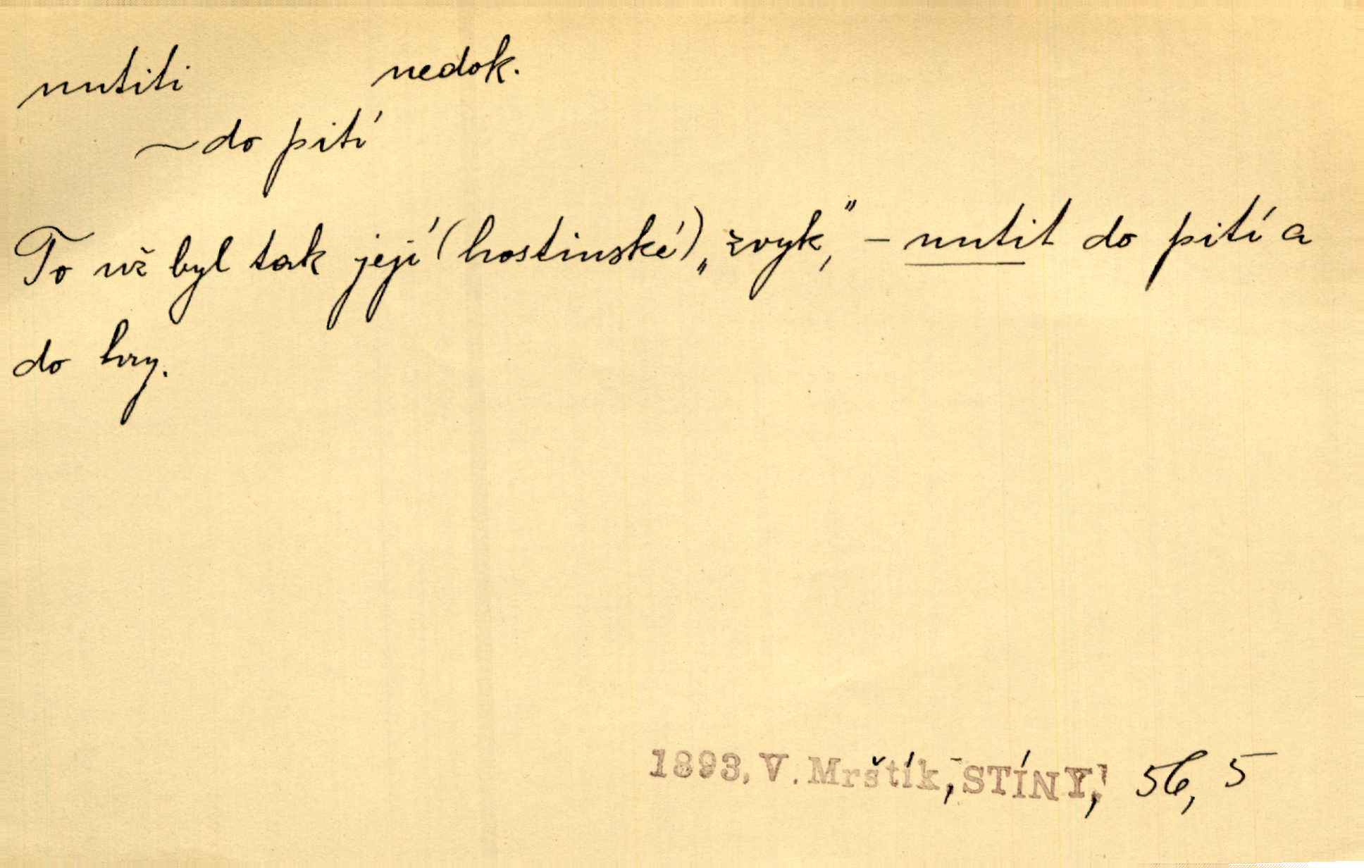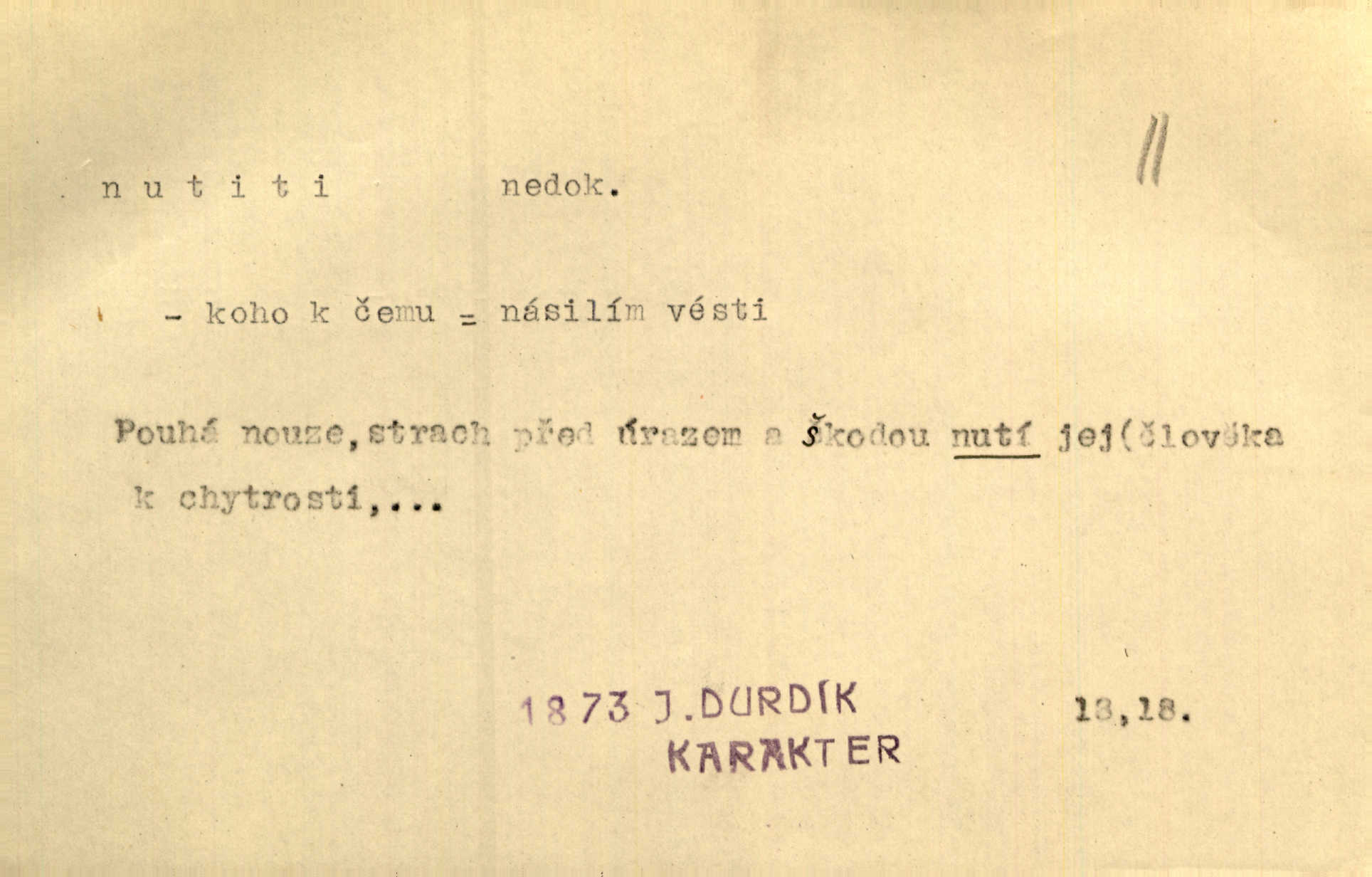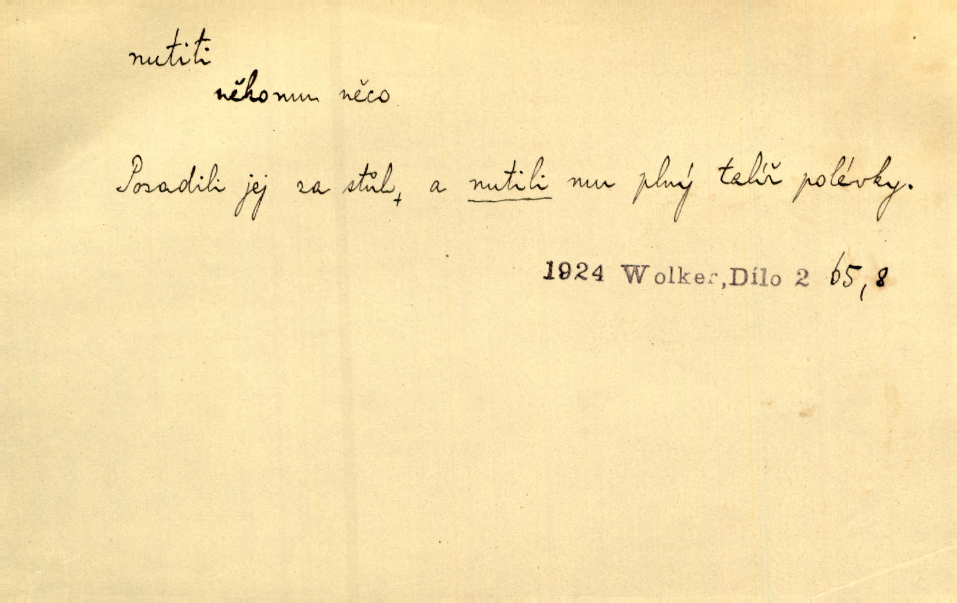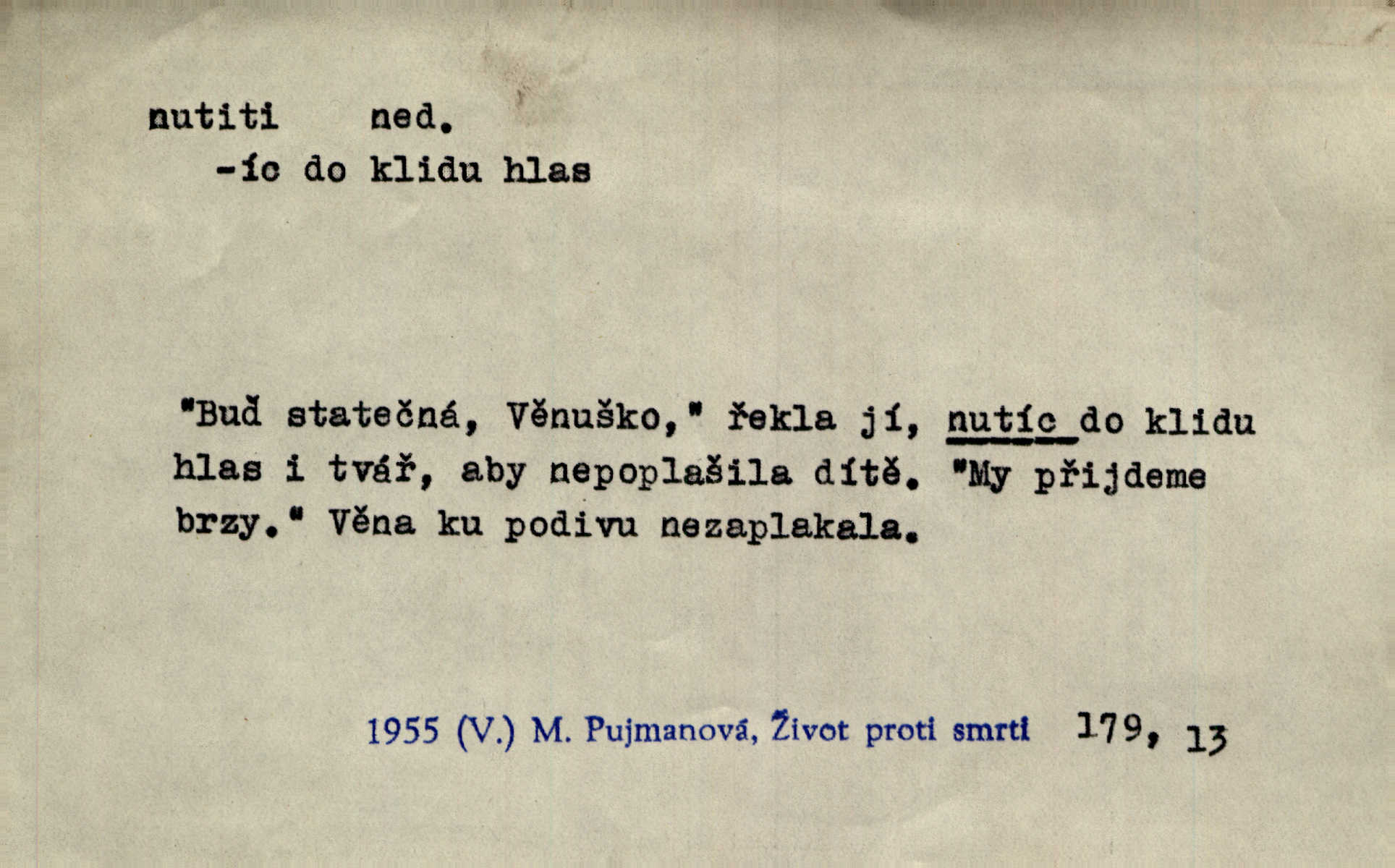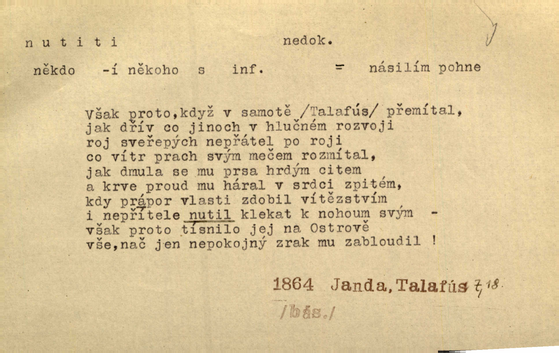 - nutiti ned. (koho k čemu, do čeho, kam a pod.) důtklivě, naléhavě, důrazně pobízeti, vybízeti, vésti. „Nechte mě, nenuťte mě,“ bránila se kamarádkám, nutícím ji k tanci. V. Mrš. Pouhá nouze, strach před škodou nutí jej [člověka] k chytrosti. Durd. Nedopustil, aby jeho dcera ke svatbě byla nucena. J. J. Kol. Škoda je Ješka; nerozuma otec, že ho k té ochechuli nutí. Jan. To už byl tak její [hostinské] „zvyk“, nutit do pití a do hry. V. Mrš. [Hospodáři] cpou do dýmek a nutí hosty do piva. Just. Později si školu sám zamiloval, a již nebylo třeba, aby ho do ní nutili. Prav. První [maminčin milenec] zmizl a do druhýho bába maminku nutila. Čap. Ch. [Caterina] nutila jej zpět na divan, konejšila jej slovy a polibky. Zey. Matku jsem neměl, a poručník na řemeslo nutil. Jir. „Sedláčkové“ aby o zadržené ouroky nebyli nuceni. Pal. Kdo u Štěpánů jen jednou pojedl, nutil ženu, aby se pozeptala, jak Helena to ono strojí. Prav. Vrchnost musila lidi nutit, aby se na opuštěných živnostech usazovali. Jir. I nepřítele nutil klekat k nohoum svým. Jan. Nucen byl, na několik okamžení se posadit na kamennou lavičku musil. Květy. Jsem nucena s tebou mluviti, jak dívka mluviti snad nemá. Zey. Nespokojenost v zemi tak velice se byla rozmohla, že císař nucena se viděl vyjednávati s ní. Pal. Doktor neodpověděl, Bohutínský byl nucen pokračovati. Arb. D (co komu) naléhavě nabízeti. Posadili jej za stůl a nutili mu plný talíř polévky. Wolk. [Pensista] doma kaktusy pěstuje a jeden exemplář mi nutí v úsměvu. Sova. D (co odkud, kam) s překonáváním obtíží, překážek, odporu, nesnází vykonávati, prováděti, dosahovati, někam n. odněkud dostávati a pod. Nutil kolem rtů rozpustilý úsměv. Svob. Voral kývaje nutil smích. Rais. Přemáhal zlost a nutil do sebe zbytek kávy. Herrm. Ret v úsměv nutí [Hus]. Špind. „To nevím — nevím!“ nutil starý ze sebe a chtěl vstáti. Tyl. „Ano, to je plátno,“ nutila domácí paní ze sebe v rozpacích. Ner. Zaťukal — zaprosil, po případě i zahromoval si náš kancelista na Fáfka i na ostatní podobné šosáčky a nutil z nich, čeho právě potřeboval: podpisy, staré obleky, cupaninu, peníze — jako čaroděj! Štech. Stál tu [před otcem]‚ jako stává obviněnec před soudem, když nutí z něho výpověď přisvědčující. Třeb. D nutiti se (do čeho, k čemu, kam a pod.) s námahou, s přemáháním obtíží o něco usilovati, snažiti se. „Dívku beze věna? — Toho za našich dob nebývá,“ nutila se hraběnka k žertu. Bozd. Já myslím, že se Olšovský k tomu velice nutil, a to mne urazilo. Pfleg. Musila se k němu ještě teď tak nutit. Svět. Králenec se nutil do úsměvu. Hol. Neměla zájmu na politice, nutila se do toho. R. Svob. V duchu se zalekl, ale nutil se, aby jeho hlas zněl přísně. Jir. Antikvář, maje knihu s tolika stran již zamluvenou, nutil se, aby ji koupil. Stroup. Děvče se nutilo, a ač její kuchyňské vědomosti nebyly příliš rozšířeny, přece dovedla všecko ku spokojenosti starého Procházky. Pfleg. „Na vyčištění svého domu budeme muset asi rukou statečně přiložiti“. „Budeme se nutiti dost a dost“. Ehrenb.