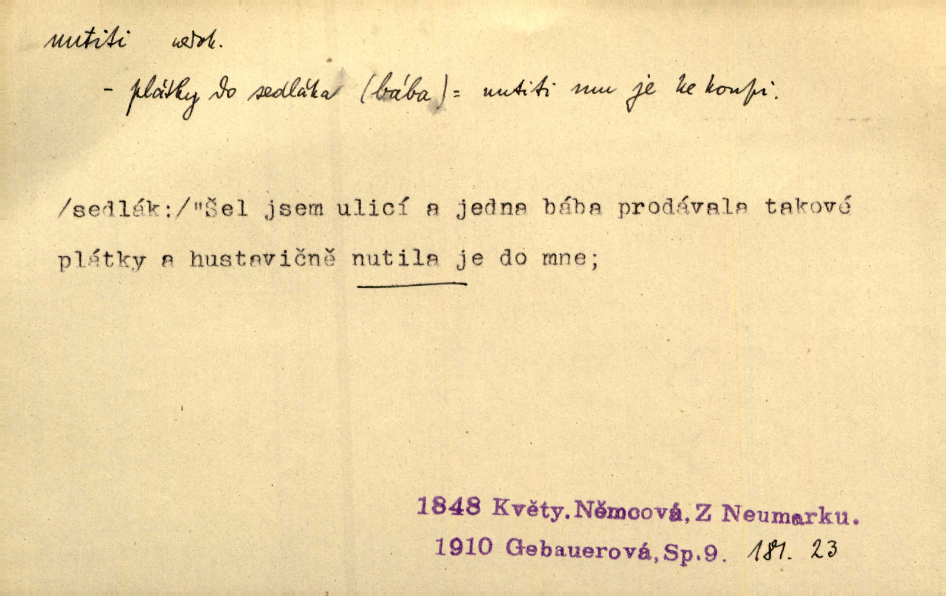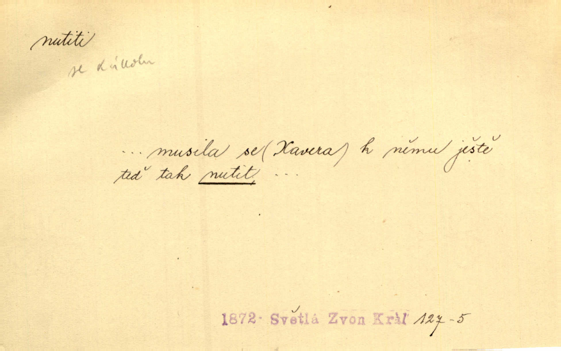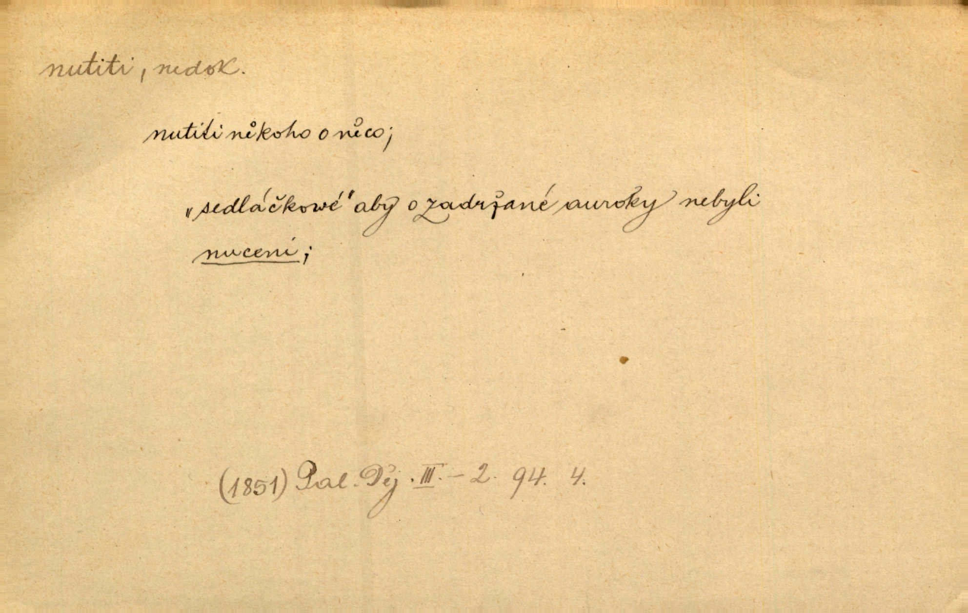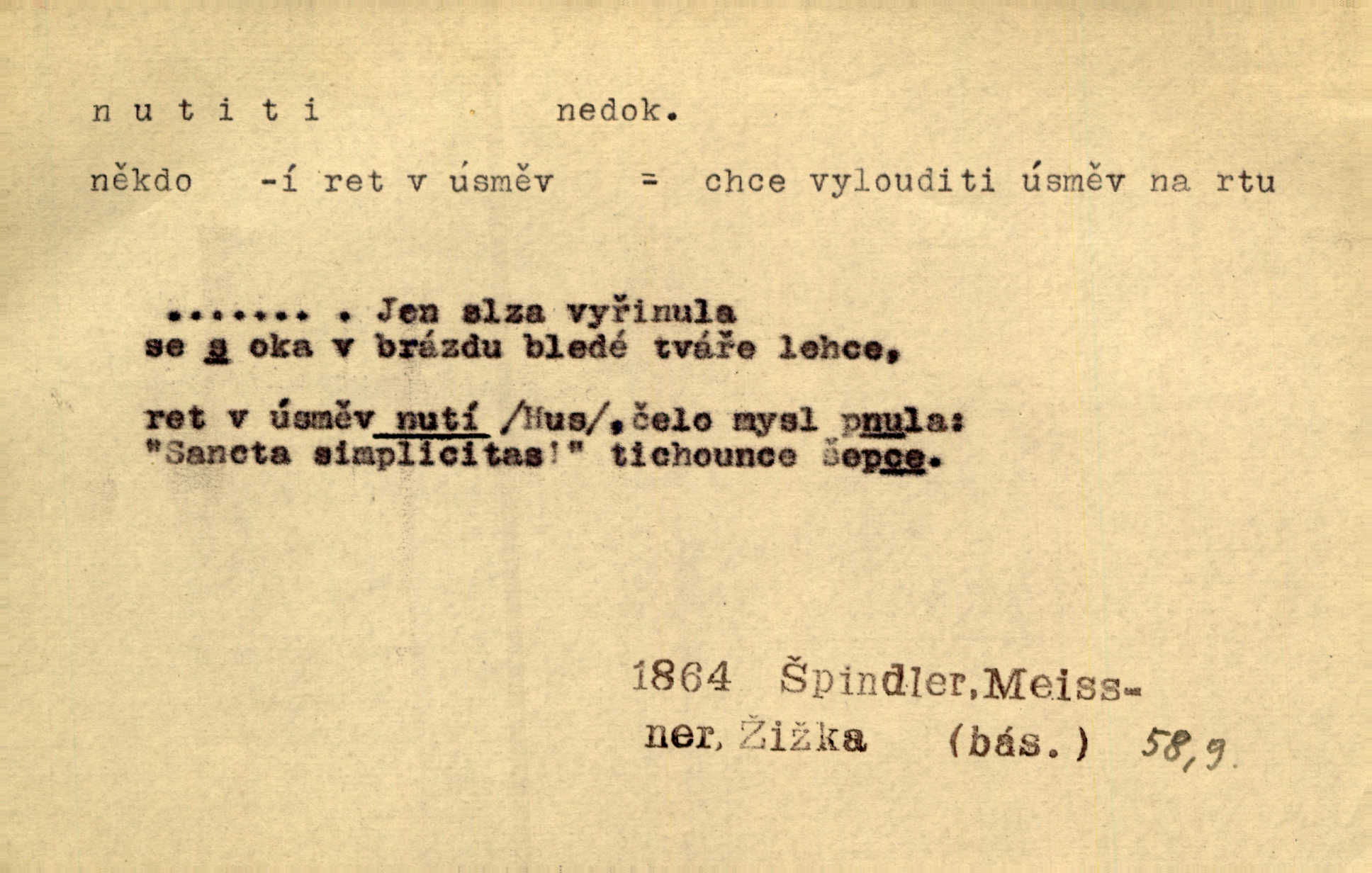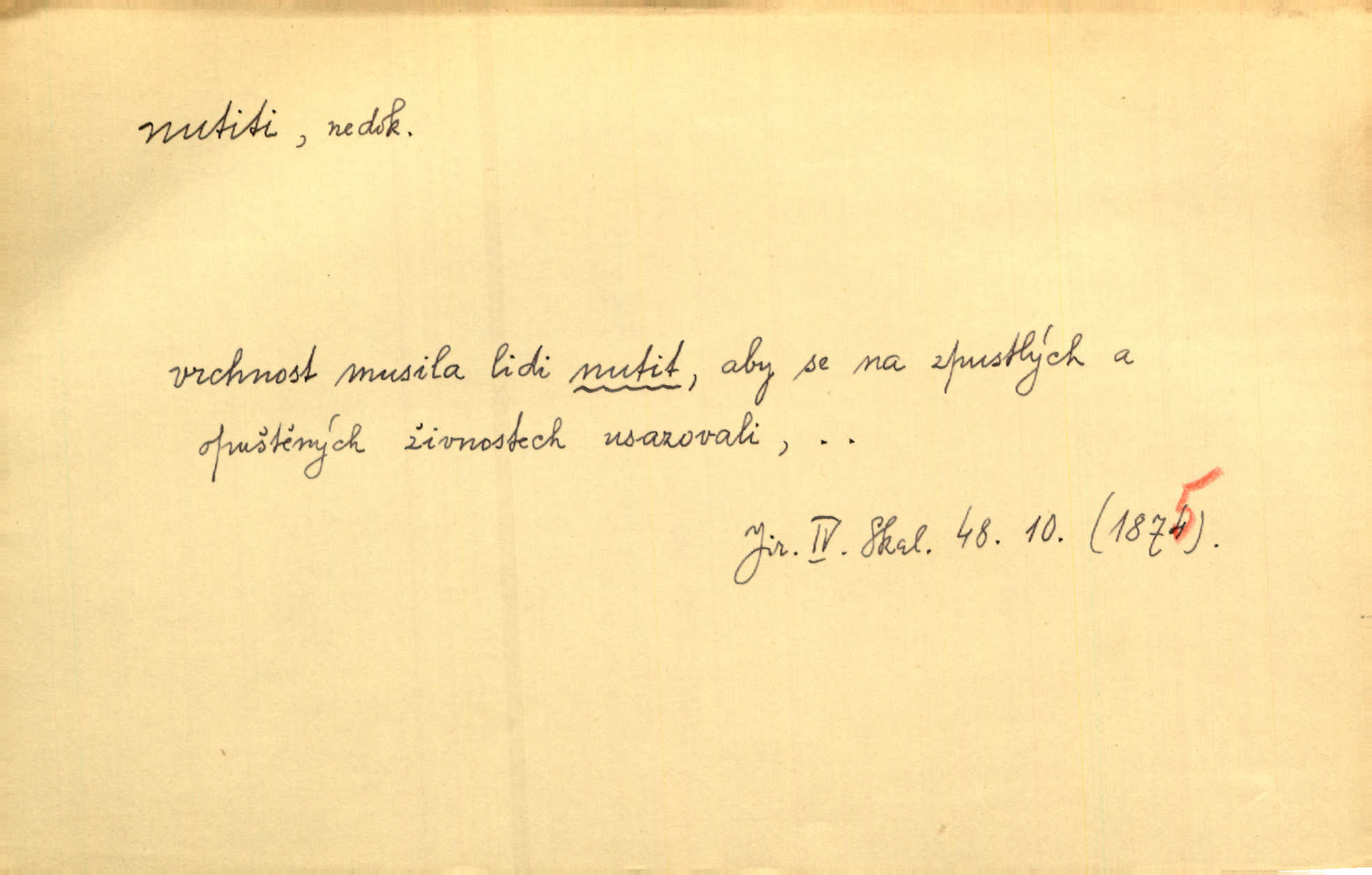 - nutiti ned. (koho k čemu, do čeho, kam a pod.) důtklivě, naléhavě, důrazně pobízeti, vybízeti, vésti. „Nechte mě, nenuťte mě,“ bránila se kamarádkám, nutícím ji k tanci. V. Mrš. Pouhá nouze, strach před škodou nutí jej [člověka] k chytrosti. Durd. Nedopustil, aby jeho dcera ke svatbě byla nucena. J. J. Kol. Škoda je Ješka; nerozuma otec, že ho k té ochechuli nutí. Jan. To už byl tak její [hostinské] „zvyk“, nutit do pití a do hry. V. Mrš. [Hospodáři] cpou do dýmek a nutí hosty do piva. Just. Později si školu sám zamiloval, a již nebylo třeba, aby ho do ní nutili. Prav. První [maminčin milenec] zmizl a do druhýho bába maminku nutila. Čap. Ch. [Caterina] nutila jej zpět na divan, konejšila jej slovy a polibky. Zey. Matku jsem neměl, a poručník na řemeslo nutil. Jir. „Sedláčkové“ aby o zadržené ouroky nebyli nuceni. Pal. Kdo u Štěpánů jen jednou pojedl, nutil ženu, aby se pozeptala, jak Helena to ono strojí. Prav. Vrchnost musila lidi nutit, aby se na opuštěných živnostech usazovali. Jir. I nepřítele nutil klekat k nohoum svým. Jan. Nucen byl, na několik okamžení se posadit na kamennou lavičku musil. Květy. Jsem nucena s tebou mluviti, jak dívka mluviti snad nemá. Zey. Nespokojenost v zemi tak velice se byla rozmohla, že císař nucena se viděl vyjednávati s ní. Pal. Doktor neodpověděl, Bohutínský byl nucen pokračovati. Arb. D (co komu) naléhavě nabízeti. Posadili jej za stůl a nutili mu plný talíř polévky. Wolk. [Pensista] doma kaktusy pěstuje a jeden exemplář mi nutí v úsměvu. Sova. D (co odkud, kam) s překonáváním obtíží, překážek, odporu, nesnází vykonávati, prováděti, dosahovati, někam n. odněkud dostávati a pod. Nutil kolem rtů rozpustilý úsměv. Svob. Voral kývaje nutil smích. Rais. Přemáhal zlost a nutil do sebe zbytek kávy. Herrm. Ret v úsměv nutí [Hus]. Špind. „To nevím — nevím!“ nutil starý ze sebe a chtěl vstáti. Tyl. „Ano, to je plátno,“ nutila domácí paní ze sebe v rozpacích. Ner. Zaťukal — zaprosil, po případě i zahromoval si náš kancelista na Fáfka i na ostatní podobné šosáčky a nutil z nich, čeho právě potřeboval: podpisy, staré obleky, cupaninu, peníze — jako čaroděj! Štech. Stál tu [před otcem]‚ jako stává obviněnec před soudem, když nutí z něho výpověď přisvědčující. Třeb. D nutiti se (do čeho, k čemu, kam a pod.) s námahou, s přemáháním obtíží o něco usilovati, snažiti se. „Dívku beze věna? — Toho za našich dob nebývá,“ nutila se hraběnka k žertu. Bozd. Já myslím, že se Olšovský k tomu velice nutil, a to mne urazilo. Pfleg. Musila se k němu ještě teď tak nutit. Svět. Králenec se nutil do úsměvu. Hol. Neměla zájmu na politice, nutila se do toho. R. Svob. V duchu se zalekl, ale nutil se, aby jeho hlas zněl přísně. Jir. Antikvář, maje knihu s tolika stran již zamluvenou, nutil se, aby ji koupil. Stroup. Děvče se nutilo, a ač její kuchyňské vědomosti nebyly příliš rozšířeny, přece dovedla všecko ku spokojenosti starého Procházky. Pfleg. „Na vyčištění svého domu budeme muset asi rukou statečně přiložiti“. „Budeme se nutiti dost a dost“. Ehrenb.